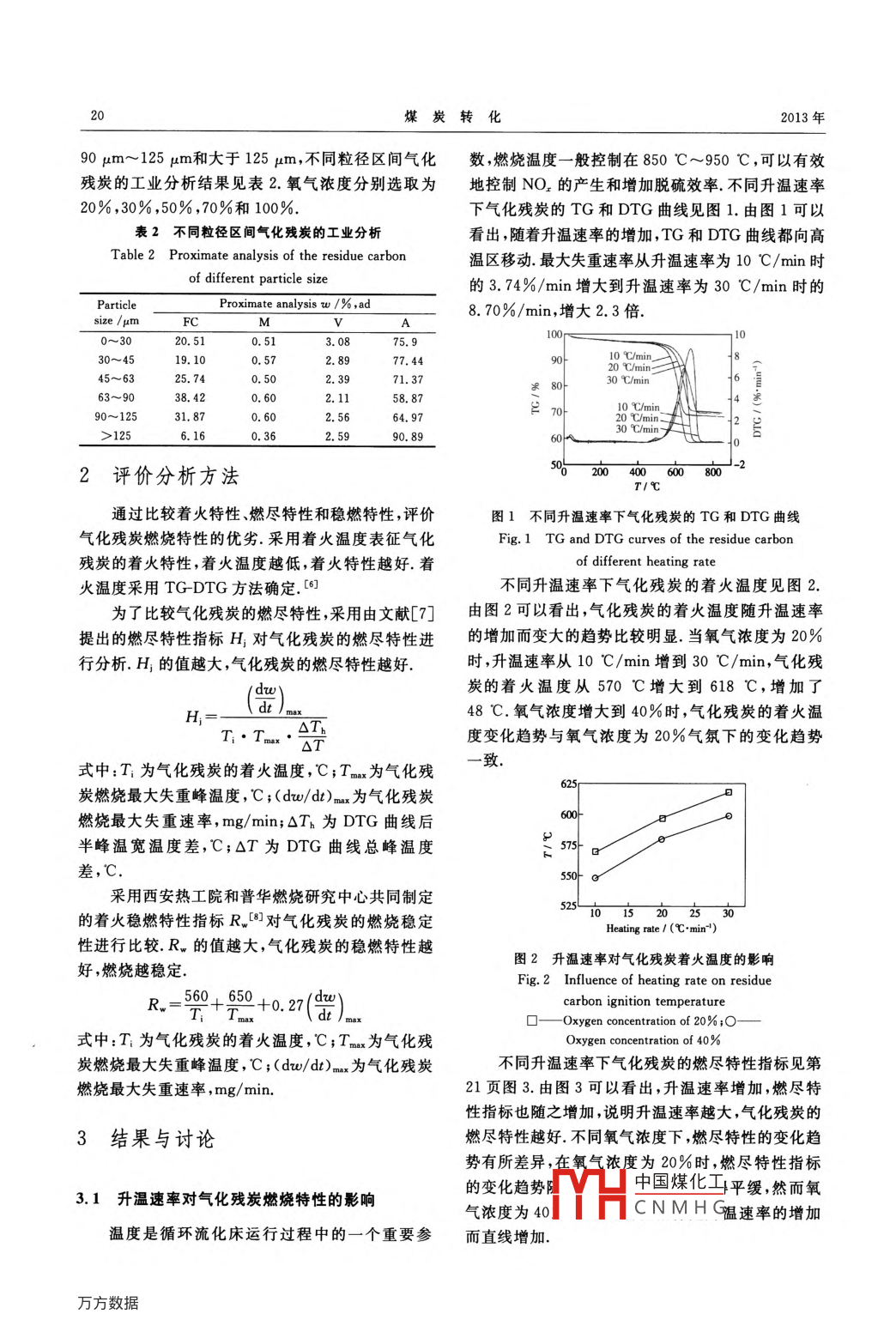 .第36卷第3期煤炭轉(zhuǎn)化Vol. 36 No. 32013年7月.COAL CONVERSIONJul. 2013寧夏石溝驛煤氣化殘?zhí)咳紵匦匝芯坷顐?李詩(shī)媛2) 任強(qiáng)強(qiáng))呂清剛)包紹麟)摘要利用TG/DTA 6300型熱分析儀研究了寧夏石溝驛謀的氣化殘?zhí)康娜紵匦?從著火特性、燃盡特性和穩(wěn)燃特性三個(gè)方面分析了升溫速率、粒徑和氧氣濃度對(duì)氣化殘?zhí)咳紵匦缘挠绊懀⒉捎谜粚?shí)驗(yàn)分析了升溫速率、粒徑和氧氣濃度三個(gè)因素對(duì)氣化殘?zhí)咳紵匦杂绊懙鸟詈献饔?實(shí)驗(yàn)結(jié)果表明,提高升溫速率可以改善氣化殘?zhí)康娜急M特性;粒徑的減小有助于氣化殘?zhí)康闹?氧氣濃度的增加對(duì)改善氣化殘?zhí)咳紵匦杂忻黠@的作用,但這種改善效果隨氧氣濃度的增加而減弱;升溫速率對(duì)氣化殘?zhí)康闹鹛匦杂绊懽畲?而氧氣濃度對(duì)氣化殘?zhí)康娜急M特性和穩(wěn)燃特性影響最大. .關(guān)鍵詞氣化殘?zhí)?,熱重分析,燃燒特性中圖分類號(hào)TQ534 ,X7841實(shí)驗(yàn)部分0引言1.1 實(shí)驗(yàn)原料煤炭氣化是一種清潔高效的煤炭利用形式.循環(huán)流化床氣化技術(shù)以其傳熱效率高、溫度分布均勻本研究采用的實(shí)驗(yàn)原料是寧夏石溝驛煤氣化殘和易于實(shí)現(xiàn)大型化等優(yōu)點(diǎn)備受重視. [1氣化殘?zhí)恐魈?取自循環(huán)流化床氣化爐旋風(fēng)分離器后的煤氣布要是指在循環(huán)流化床氣化爐氣化過(guò)程中旋風(fēng)分離器袋除塵器,實(shí)驗(yàn)前未經(jīng)任何預(yù)處理,氣化殘?zhí)康墓I(yè)未捕捉的飛灰,具有高灰分、低揮發(fā)分和粒度細(xì)等特分析和元素分析結(jié)果見(jiàn)表1. 原料屬于寬篩分,中位點(diǎn).為了實(shí)現(xiàn)煤的梯級(jí)利用,擬采用循環(huán)流化床燃燒粒徑為66. 5 μm.技術(shù)對(duì)氣化殘?zhí)窟M(jìn)行再利用,在確定適合的燃燒方表1寧夏石溝驛煤 氣化殘?zhí)康脑胤治龊凸I(yè)分析Table 1 Ultimate and Proximate.analysis of the residue carbon案之前對(duì)氣化殘?zhí)康娜紵匦赃M(jìn)行研究是必要的,Ultimate analysis w /% ,adProximate analysis w /% ,ad筆者采用熱重分析法[25]對(duì)氣化殘?zhí)康娜紵匦赃M(jìn)H行了研究.溫度是循環(huán)流化床燃燒的一個(gè)重要 參數(shù),29.61 0.121.98 28.62 3.22 1.35 67. 83熱重分析中的升溫速率雖然無(wú)法比擬實(shí)際情況,但1.2 實(shí)驗(yàn)儀器具有一定的參考價(jià)值.氣化殘?zhí)康牧郊?xì),在燃燒過(guò)程中旋風(fēng)分離器無(wú)法捕集,導(dǎo)致氣化殘?zhí)吭跔t內(nèi)的實(shí)驗(yàn)采用TG/DTA 6300型熱分析儀.停留時(shí)間短,燃燒效率低,因此粒徑也是影響氣化殘1.3實(shí)驗(yàn)條件炭燃燒特性的一一個(gè)重要因素.富氧燃燒技術(shù)被認(rèn)為實(shí)驗(yàn)過(guò)程中采用O2和N2的混合氣模擬所需是一種非常有發(fā)展?jié)摿Φ腃O2捕集技術(shù),筆者對(duì)不的反應(yīng)氣氛,氣體流量為250mL/min,測(cè)量溫度范同氧氣濃度的氣化殘?zhí)康娜紵匦赃M(jìn)行了研究,為圍為50 C~900 C,樣品質(zhì)量為7.0 mg.為了研究采用循環(huán)流化床富氧燃燒技術(shù)利用氣化殘?zhí)刻峁┗郎厮俾?、粒徑和氧氣濃度?duì)氣化殘?zhí)咳紵匦缘牡A(chǔ)的理論依托,并從著火特性、燃盡特性和穩(wěn)燃特性影響,升溫速率分別選取為10 C/min, 20 C/min三個(gè)方面分析升溫速率、粒徑和氧氣濃度對(duì)氣化細(xì)和30 C/min;粒徑區(qū)間分別選擇為0 μm~30 pμm,粉灰燃燒特性的影響.30 μm~45 μm,45 μm~63 μm,63 μm~90 μm,中國(guó)科學(xué)院戰(zhàn)略先導(dǎo)科技專項(xiàng)資助項(xiàng)目(XDA07050300).中國(guó)煤化工1)博士生,中國(guó)科學(xué)院大學(xué).中國(guó)科學(xué)院工程熱物理研究所,100190北京;2)副研究員;.MYHC N M H G科學(xué)院工程熱物理研究所,100190北京收稿8期:2012-11-09;修回日期:2013-01-14第3期李偉等寧夏石溝驛煤氣化殘?zhí)咳?燒特性研究2.0一圖5為不同粒徑的氣化殘?zhí)康闹饻囟?由圖+2.25可以看出,在粒徑為125 μm以下各粒徑區(qū)間段,2 3.0-氣化殘?zhí)康闹饻囟入S粒徑的增加而增加.原因是E 2.5粒徑減小,氣化殘?zhí)勘缺砻娣e增加,傳熱速率強(qiáng)化,有利于氣化殘?zhí)康闹? [9] 在氧氣濃度為40%氣氛15-10152025301.8下,氣化殘?zhí)康闹饻囟入S粒徑的變化趨勢(shì)與氧氣Heating rate/ (C. min*')濃度為20%的氣氛一致.圖3 氣化殘?zhí)康娜急M特性指標(biāo)H,和穩(wěn)燃特性指標(biāo)R.與升溫速率的關(guān)系Fig. 3 Relation between H,, Rw and heating rate00-H,oxygen concentration of 20%;●一 H, oxygenconcentation of 40%;口一-R. ,oxygen concentration of80F20%;O-- Rw, oxygen concentration of 40%圖3中虛線為不同升溫速率下氣化殘?zhí)糠€(wěn)燃特56040-30 30~ 4545-6363-9090-125>125性指標(biāo).由圖3可以看出,在氧氣濃度為20%時(shí),穩(wěn)燃Paricle size 1 μm特性指標(biāo)隨著升溫速率的增加而減小,穩(wěn)燃特性變差.圖5粒徑對(duì)氣化殘?zhí)恐?火溫度的影響在氧氣濃度為40%時(shí),穩(wěn)燃特性指標(biāo)先下降后上升.Fig. 5 Influence of particle size on residuecarbon ignition temperature3.2粒徑對(duì) 氣化殘?zhí)咳紵匦缘挠绊懣谝籓xygen concentration of 20%;OOxygen concentration of 40%圖4為不同粒徑的氣化殘?zhí)康腡G和DTG曲圖6為不同粒徑的氣化殘?zhí)康娜急M特性指標(biāo)和線.由圖4可以看出,不同粒徑區(qū)間的氣化殘?zhí)康淖罘€(wěn)燃特性指標(biāo).由圖6可以看出,兩個(