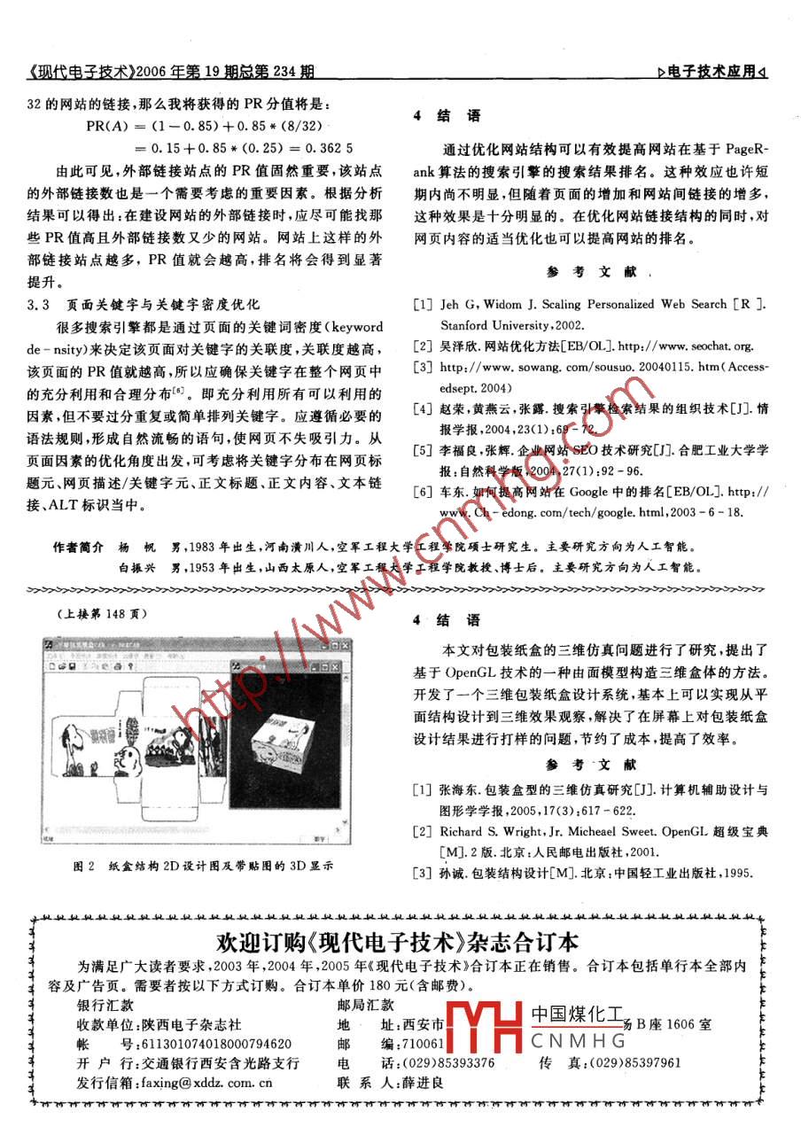 《現(xiàn)代電子技術(shù)》2006年第19期總第234期D電子技術(shù)應(yīng)用(基于Google的網(wǎng)站優(yōu)化技術(shù)楊帆',王秀偉”,白振興1(1.空軍工程大學(xué)工程學(xué)院陜西 西安710038;2. 葫蘆島有色金屬集團(tuán)電力分廠遼寧葫蘆島125003)摘要:搜索引擎已經(jīng)成為現(xiàn)在檢索信息的重要手段,為 了提高網(wǎng)站在搜索引擎中的排名,產(chǎn)生了網(wǎng)站優(yōu)化的概念,針對(duì)目前流行的Google搜索引擎,通過(guò)對(duì)網(wǎng)站結(jié)構(gòu)的分析,詳細(xì)闡述了網(wǎng)頁(yè)結(jié)構(gòu)對(duì)基于PageRank 算法的網(wǎng)站搜索引擎排名結(jié)果可能產(chǎn)生的影響,就如何提升網(wǎng)站在搜索引擎中的排名問(wèn)題提出了幾點(diǎn)優(yōu)化策略,分析結(jié)果表明:對(duì)網(wǎng)站結(jié)構(gòu)的優(yōu)化可以顯著提高網(wǎng)站在Google搜索引擎上的排名。關(guān)鍵詞:優(yōu)化;Google; PageRank;鏈接中囝分類號(hào):TP393文獻(xiàn)標(biāo)識(shí)碼:B文章編號(hào):1004 - 373X(2006)19 -149 - 03Optimization Technology for Website Based on GoogleYANG Fan' ,WANG Xiuwei2 ,BAI Zhenxing'(1. Engineering Institute. Air Force Engineering University ,Xi an,710038.China;2. Electric Power Branch Factory. Huludao Nonferrous Indusry Co. Ltd. , Huludao,125003 ,China)Abstract: Search engine become the import means for searching information. For the sake of improving the rank in searchengine, bring forth the concept of seatch optimization. Aiming at the Google search engine, it analyzes the possible influencethat various kinds of web structures exerted on the ranking results of search engines based on PageRank. Putting forward theoptimize strategy for how to improve the rank of website. The result of analysis shows that optimizing the structure of thewebsite can improve the rank for Google search engine.Keywords:optimize ;Google;PageRank;link隨著Internet的發(fā)展,人們已經(jīng)進(jìn)入信息量極為豐富1.1 用戶優(yōu)化的時(shí)代。Internet已經(jīng)成為當(dāng)今和未來(lái)人們獲取資源和信經(jīng)過(guò)網(wǎng)站的優(yōu)化設(shè)計(jì),用戶可以方便地瀏覽網(wǎng)站的信息交流的主要場(chǎng)所。為了幫助用戶快速找到需要的信息,息、使用網(wǎng)站的服務(wù)。具體表現(xiàn)是:以用戶需求為導(dǎo)向,網(wǎng)搜索引擎應(yīng)運(yùn)而生。目前,Google已經(jīng)成為使用最為廣泛.站導(dǎo)航方便,網(wǎng)頁(yè)下載速度盡可能快,網(wǎng)頁(yè)布局合理并且的搜索引擎之一。Google 等新一代搜索引擎的優(yōu)勢(shì)在于適合保存、打印、轉(zhuǎn)發(fā),網(wǎng)站信息豐富、有效,有助于用戶產(chǎn)他不僅索引量大,而且還能將最好的結(jié)果排在搜索結(jié)果的生信任。最前面,有利于用戶盡快找到所需的信息”。通過(guò)研究1.2 網(wǎng)絡(luò)環(huán)境優(yōu)化Google的排名規(guī)律,合理地優(yōu)化網(wǎng)站鏈接結(jié)構(gòu)可以提高搜以通過(guò)搜索引擎推廣網(wǎng)站的角度來(lái)說(shuō),經(jīng)過(guò)優(yōu)化設(shè)計(jì)索結(jié)果排名,而目前國(guó)內(nèi)互聯(lián)網(wǎng)站在處理網(wǎng)頁(yè)之間的鏈接的網(wǎng)站使得搜索引擎順利抓取網(wǎng)站的基本信息,當(dāng)用戶通結(jié)構(gòu)時(shí),往往存在很大的隨意性。殊不知這種隨意性往往過(guò)搜索引擎檢索時(shí),企業(yè)期望的網(wǎng)站摘要信息出現(xiàn)在理想導(dǎo)致網(wǎng)站在搜索結(jié)果中不能取得理想的排名。的位置,用戶能夠發(fā)現(xiàn)有關(guān)信息并引起興趣,從而點(diǎn)擊搜1網(wǎng)站優(yōu)化概述索結(jié)果并到達(dá)網(wǎng)站獲取進(jìn)一步信息,直至成為真正的顧網(wǎng)站優(yōu)化就是通過(guò)對(duì)網(wǎng)站功能.網(wǎng)站結(jié)構(gòu).網(wǎng)頁(yè)布局、客。對(duì)網(wǎng)絡(luò)環(huán)境優(yōu)化的表現(xiàn)形式是:適合搜索引擎檢索網(wǎng)站內(nèi)容等要素的合理設(shè)計(jì),使得網(wǎng)站內(nèi)容和功能表現(xiàn)形.(搜索引擎優(yōu)化),便于積累網(wǎng)絡(luò)營(yíng)銷網(wǎng)站資源(如互換鏈?zhǔn)竭_(dá)到對(duì)用戶友好并易于宣傳推廣的最佳效果,充分發(fā)揮接、中國(guó)煤化工1.3網(wǎng)站的網(wǎng)絡(luò)營(yíng)銷價(jià)值,提高在搜索引擎上的排名。YHCNMHG管理維護(hù)(日常信息更網(wǎng)站優(yōu)化設(shè)計(jì)具體表現(xiàn)在3個(gè)方面:用戶優(yōu)化、網(wǎng)絡(luò)新、維護(hù)、改版升級(jí)),有利于各種網(wǎng)絡(luò)營(yíng)銷方法的應(yīng)用,并環(huán)境優(yōu)化以及網(wǎng)站運(yùn)營(yíng)維護(hù)優(yōu)化2]。且可以積累有價(jià)值的網(wǎng)絡(luò)營(yíng)銷資源(獲得和管理注冊(cè)用戶收稿日期:2006-05-19資源等)。電子技術(shù)楊帆等:基于 Google的網(wǎng)站優(yōu)化技術(shù)以下分析一下網(wǎng)站內(nèi)部鏈接如何影響PageRank值。2 Google 采用的主要算法在這里考慮的是一一個(gè)相對(duì)獨(dú)立的網(wǎng)站,外部鏈接的影響暫Google憑借其先進(jìn)的排序機(jī)制已成為目前使用最為不考慮。廣泛的搜索引擎之一。Google 搜索引擎使用PageRank假設(shè)網(wǎng)站包含3個(gè)頁(yè)面,沒(méi)有外部鏈接,如圖1所示。算法來(lái)進(jìn)行網(wǎng)頁(yè)的排名,該算法最早出現(xiàn)在其創(chuàng)始人的一篇論文中,利用頁(yè)面相關(guān)性得分(RelevancyScore)+頁(yè)面.[C等級(jí)得分(PageRank