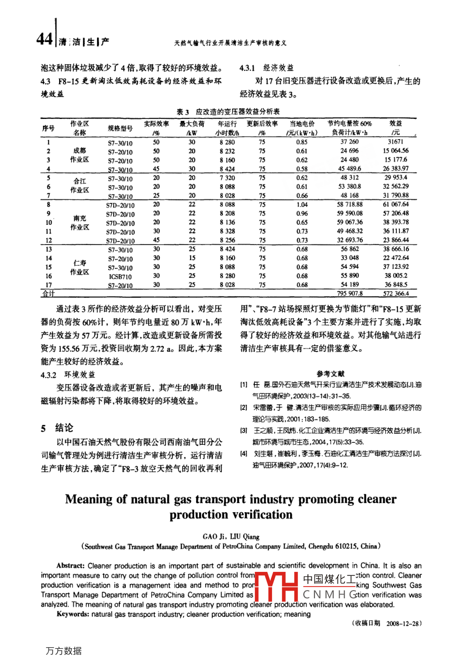 42清1潔生|產天然氣輸氣行業(yè)開展清潔生產審核的意義天然氣輸氣行業(yè)開屐清潔生產審核的意義高冀,劉強(西南油氣田分公司輸氣管理處,四川成都610215)摘要:清潔生產是我國持續(xù)發(fā)展和科學發(fā)展的一項重要內容,也是實現我國污染控制重點曲末端治理向生產過程控制轉變的重要措施,而“清潔生產審核”是推行清漕生產的一科管理思路和方涵。以中國石油天然氣股份有限公司西南油氣田分公司輸氣管理處為例進行清潔生產審核分析,闞逑天然氣蝓氣行業(yè)開展清潔生產審核的意義。關鍵詞:天然氣榆氣行業(yè);清潔生產審核;意義中圖分類號:X38文獻標志碼:A文章編號:16740912(200903-0042-031清潔生產與清潔生產審核的概念規(guī)范,以及公司相關文件和資料,開展審核工作。清潔生產包含了兩個全過程控制:即生產全過程3清潔生產審核的過程控制和產品整個生命周期全過程控制。對前者而言清輸氣管理處開展清潔生產審核工作主要分以下步潔生產的目的是節(jié)約原材料和能源,淘汰有毒有害的驟:(1)審核重點的確立及審核;(2)方案的產生與篩原材料,并在全部非產品物料和廢物離開生產過程以選;(3)方案實施。前,盡最大可能減少它們的排放量和毒性;對后者而31審核重點的確立及審核言清潔生產旨在減少產品整個生命周期過程中(從原輸氣管理處下設7個輸氣作業(yè)區(qū)和6個后服單料的提取到產品的最終處置)對人類和環(huán)境的影響。位涉及到96座輸配氣站點和138座閥室閥井。對清潔生產審核”是推行清潔生產的一種管理思路和方各作業(yè)站點在輸氣過程中各個主要廢棄物產生源,從法,其對象是現有生產裝置和生產過程方案對生產過天然氣的管理和指標監(jiān)測輸氣過程控制、技術工藝、程中從原材料使用到生產的每個環(huán)節(jié)、每個崗位進行設備維護和更新資源能源的使用廢棄物、管理和員審定有意識地尋找污染產生的“地點”和“原因”,并提工等8個方面分析浪費產生原因,最后決定將合江作出可行的解決方案也稱“污染預防審核或污染預防評業(yè)區(qū)的納溪站作為審核的重點區(qū)域,充分運用清潔生價”。對于不進行改造的現有產品和裝置結合物料衡產方法發(fā)現其資源能源流失的環(huán)節(jié)找出資源能源浪算、能量衡算實施清潔生產審核采取減污措施加強費的主要原因查找輸氣過程、作業(yè)區(qū)管理、站場維護生產管理,可以減少污染物的產生量和排放量以及廢棄物排放等方面存在的問題,為清潔生產方案的產生提供了依據。2天然氣輸氣行業(yè)開展清潔生產審核的目的32方案的產生與篩選為進一步控制廢氣、廢水、廢渣對周圍環(huán)境的影通過審核小組的宣傳動員、組織座談發(fā)動全處廣響提高企業(yè)的輸氣效率降低輸氣中資源能源消耗、大職工參與同時結合項目專家組的建議,從天然氣的天然氣損失,減輕污染壓力,提升企業(yè)的競爭力和品管中國煤億工術工藝設備維護位,依據《中華人民共和國清潔生產促進法》、《清潔生和管理和員工等8個產審核暫行辦法》和相關的國家標準行業(yè)標準及技術方面CNMHG灬。核小組對這些方案作者簡介:高冀(1956-),男,江蘇蘇州人,助理工程師,主要從事油氣田環(huán)境保護工作。天然氣輸氣行業(yè)開展清潔生產審核的意義清潔|生產43進行了整理匯總,從技術可行性、環(huán)境可行性、經濟可境效益行性、實施難易程度等方面對方案進行討論及分析最421經濟效益終選定了“F8-3放空天然氣的回收再利用”方案、“F場站探照燈更換為節(jié)能燈產生的經濟效益見表2。7站場探照燈更換為節(jié)能燈”和“F8-15更新淘汰低效表1放空天然氣回收利用經濟分析表高耗設備”三個主要方案。項目費用預算3.3方案實施設備投入費用1氣囊100個×400元個=4萬元331F8-3放空天然氣的回收再利用2緩沖罐21萬元天然氣的放空量占到總輸氣量的002%,因此,應3壓縮機2臺×80000元冶臺=16萬元采取措施加強對放空天然氣的回收再利用。具體方案4其它管線或設備41萬元×20%=82萬元是:采用可移動式的收集裝置將放空天然氣通過管道總計設備費用總計為492萬元二、運行費用收集到集氣囊,當氣囊被充滿到一定程度時氣體進入1壓縮機2臺×36kW×4M0d08元Wh20736元到緩沖罐中,并自動啟動壓縮機系統(tǒng)將天然氣壓縮到小計壓縮機運行費用為20736萬元定的氣壓狀態(tài)(略大于下游管線的壓力)后,通過管三設備折舊費折舊年限為10a,年折舊費為492萬元四投資回報道并入下游管線,當氣囊中的天然氣排空后,自動停止為避免同時放空的現象采用移動式一用一備方案壓縮機收集的天然氣也可以用于站點和周圍農戶生產生效益投資費用為:492萬元×2=984萬元活用氣收集放空天然氣:2680346m×50%13402萬m3產生費用:134.02m0.7元m2938萬元332F8-7站場探照燈更換為節(jié)能燈投資回報期N=(984+20736+9.84)4938=1.18a為了保證晚間輸氣的正常運行以及避免其它意外事故發(fā)生,輸氣管理處各作業(yè)區(qū)站場都使用探照燈,通過表2所作的經濟分析可以看出,更換為節(jié)能消耗掉大量的電量。因此在必須使用照明的前提下就型探照燈后1.5a時間即可收回成本。因此該方案可要考慮節(jié)約用電。該方案主要是將現有站場探照燈更產生較好的經濟效益換為節(jié)電型HID探照燈,不僅提高燈具的使用壽命,表2站