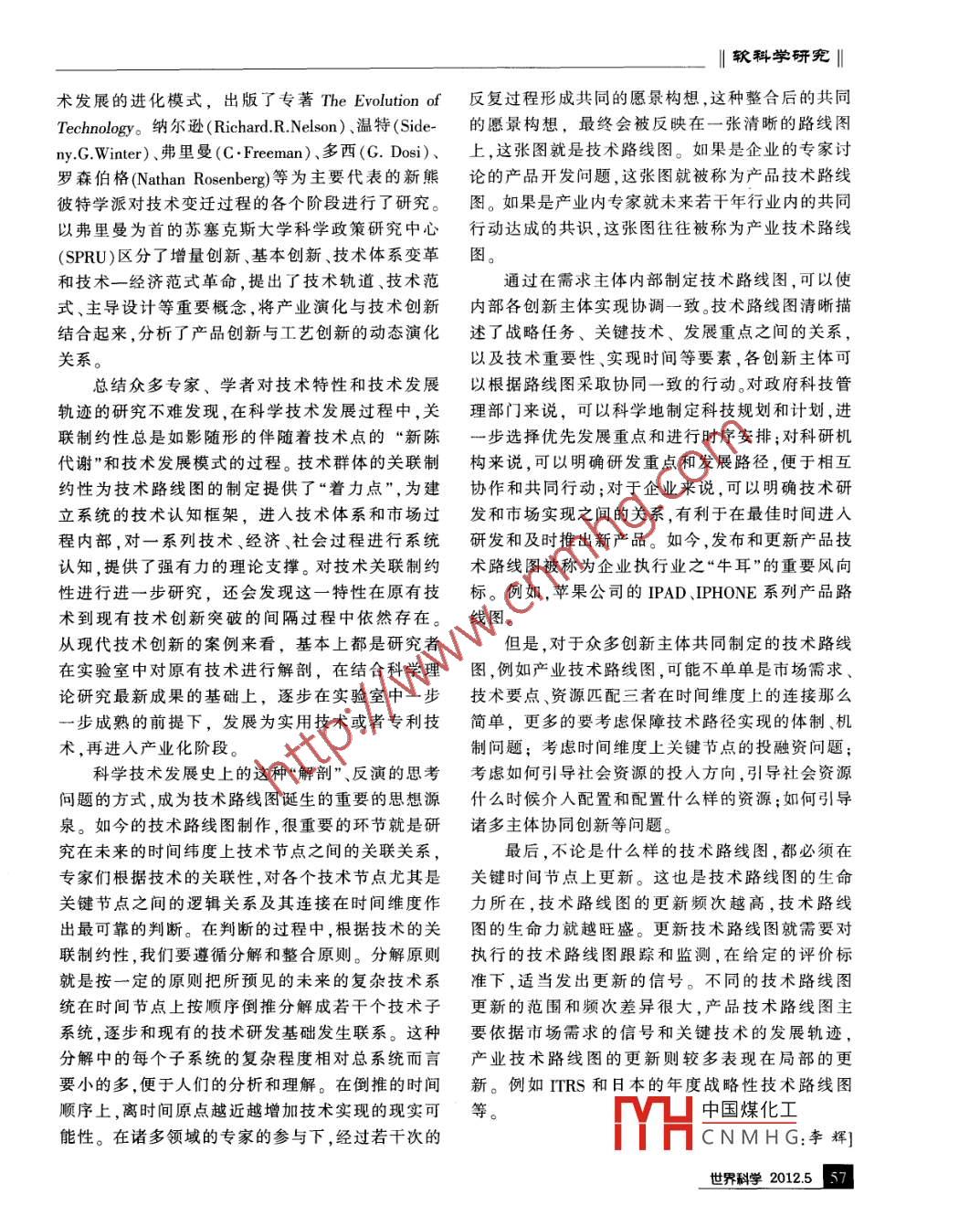 |軟科學(xué)研究|I從技術(shù)到技術(shù)路線圖孟海華迄今為止,學(xué)界公認技術(shù)預(yù)見的發(fā)展經(jīng)歷了三.新的技術(shù)元件為主要元件而形成的一系列相互次高潮,分別是第二次世界大戰(zhàn)期間、20 世紀50-制約的技術(shù)群的情況,在技術(shù)的發(fā)展過程中是普60年代以及上個世紀90年代。上個世紀末,技術(shù)路遍存在的。比如,從電子管技術(shù)出發(fā),逐漸發(fā)展出線圖逐漸成熟起來,并且被世界主要國家采用和推了集成電路技術(shù)、大規(guī)模集成電路技術(shù)、存儲器廣。在世界范圍內(nèi)有一定影響力的代表性路線圖是技術(shù)等,電子管技術(shù)作為初始元技術(shù)可以應(yīng)用于ITRS(世界半導(dǎo)體產(chǎn)業(yè)技術(shù)路線圖)和日本的年度各種不同的技術(shù)系統(tǒng)之中,起到主導(dǎo)作用;而電戰(zhàn)略性技術(shù)路線圖。如今,ITRS 每一年更新一次,重視機技術(shù)、計算機技術(shù)等技術(shù)系統(tǒng),則是晶體管要章節(jié)半年更新一次。日本的戰(zhàn)略性技術(shù)路線圖技術(shù)、陰極射線管技術(shù)等元技術(shù)及其原理的有機2011也已經(jīng)面世。國內(nèi)自2006年以來,掀起了技術(shù).組合,是元技術(shù)基礎(chǔ)上形成的技術(shù)群。路線圖研究熱潮。技術(shù)路線圖的出現(xiàn),或許是技術(shù)約翰.齊曼(J.Ziman)把技術(shù)和生態(tài)學(xué)進行了預(yù)見的第四次高潮。類比,認為:“不同規(guī)模、不同層次的各種技術(shù)形但是,,在技術(shù)路線圖熱潮中,我們需要做一些成相互共生、寄生與競爭的生態(tài)關(guān)系,使得任何冷思考,探究技術(shù)路線圖產(chǎn)生的歷史邏輯,揭示人技術(shù)的生存與發(fā)展不是孤立的事件”。正因為這們在技術(shù)創(chuàng)新突破中從離散到系統(tǒng)考慮技術(shù)問題種技術(shù)在組合、共生、寄生與競爭上的關(guān)聯(lián)制約的思維發(fā)展過程。這樣,也有利于我們對技術(shù)路線性,使得每一代特定的技術(shù)范式都會有其發(fā)展的圖構(gòu)成元素的進一步豐富和在更大范圍內(nèi)推廣應(yīng)界限。例如,蒸汽機汽缸的容積不可能無限制加.用技術(shù)路線圖。大,火車、汽車、飛機的速度不可能也不應(yīng)該無節(jié).首先,從技術(shù)的特性談起。關(guān)于技術(shù)的特性,我制加快,電子計算機的處理能力不可能無止境擴們不妨以蒸汽機為例做一說明。對于蒸汽機的基本展,微型化程度也不可能無止境地提高。也就是原理,在實驗室里只需要鐵架臺、酒精燈、燒瓶、注說,如果可以把技術(shù)的發(fā)展描述為某種函數(shù)曲線射器的活塞、橡皮管等極其簡單的儀器的組合,就的話,,這條技術(shù)曲線是有其上限的??梢约右匝菔尽?茖W(xué)史上,馮.居里克、薩弗里、紐可其次,讓我們聚焦技術(shù)發(fā)展模式。技術(shù)發(fā)展和門、瓦特等幾代人的艱辛努力的成果,就是把這種變革的模式受到許多學(xué)者的關(guān)注。許多學(xué)者認為盡實驗室里看似簡單的蒸汽機的基本技術(shù)單元(元技管科學(xué)范式的概念有些含混,用在技術(shù)上更易于導(dǎo)術(shù))一步一步地和其他技術(shù)結(jié)合起來,制造出能夠致混亂,但是技術(shù)確實具有類似“范式”或傳統(tǒng)的東滿足行業(yè)生產(chǎn)要求的、實用高效的蒸汽機。這些技西,技術(shù)發(fā)展表現(xiàn)出的間斷性就很類似于庫恩的科術(shù)之間及由這些技術(shù)組成的技術(shù)群之間是相互制學(xué)革命。美國特拉華大學(xué)科技史教授芭莎拉約的。例如,蒸汽機的工作效率和構(gòu)成蒸汽機部件(George Ballla) 較早對技術(shù)進化規(guī)律展開了研的材料密切相關(guān),就取決于一.系列的相關(guān)技術(shù),尤究。他把技術(shù)制品和生物物種進行了類比,結(jié)合技其是高難度的加工技術(shù)的支持,如各種機床技術(shù)的術(shù)發(fā)展史中的重大事件,構(gòu)造了一套比較完整的技發(fā)明、鍋爐的改進煉鐵和鑄造的改進以及采礦的進步等等。本文“中國煤化工博士,上海市科從初始元技術(shù)出發(fā),在技術(shù)原理的作用下,以學(xué) 學(xué)研究FYHCNMHG56世界科學(xué) 2012.5.| 軟科學(xué)研究II術(shù)發(fā)展的進化模式,出版了專著TheEvolutionof反復(fù)過程形成共同的愿景構(gòu)想,這種整合后的共同Technology。納爾遜(Richard.R.Nelson)、溫特(Side-的愿景構(gòu)想,最終會被反映在-張清晰的路線圖ny.G.Winter)、弗里曼(C.Freeman)、多西(G. Dosi)、上,這張圖就是技術(shù)路線圖。如果是企業(yè)的專家討羅森伯格(NathanRosenberg)等為主要代表的新熊論的產(chǎn)品開發(fā)問題,這張圖就被稱為產(chǎn)品技術(shù)路線彼特學(xué)派對技術(shù)變遷過程的各個階段進行了研究。圖。如果是產(chǎn)業(yè)內(nèi)專家就未來若干年行業(yè)內(nèi)的共同以弗里曼為首的蘇塞克斯大學(xué)科學(xué)政策研究中心行動達成的共識,這張圖往往被稱為產(chǎn)業(yè)技術(shù)路線(SPRU)區(qū)分了增量創(chuàng)新、基本創(chuàng)新、技術(shù)體系變革圖。和技術(shù)一經(jīng)濟范式革命,提出了技術(shù)軌道、技術(shù)范通過在需求主體內(nèi)部制定技術(shù)路線圖,可以使式、主導(dǎo)設(shè)計等重要概念,將產(chǎn)業(yè)演化與技術(shù)創(chuàng)新內(nèi)部各