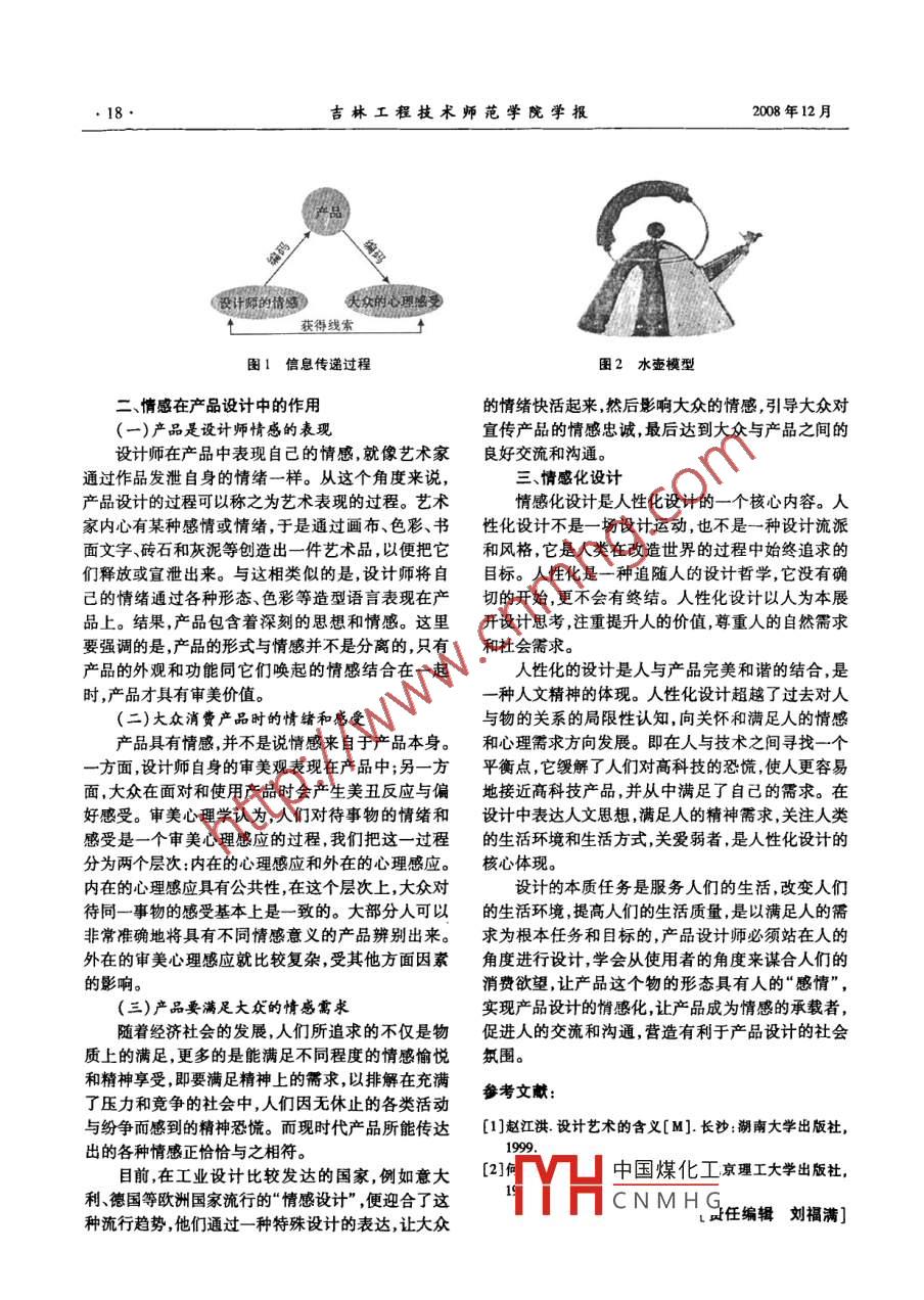 第24卷第12期吉林工程技術(shù)師范學(xué)院學(xué)報(bào)VoL 24 No. 122008年12月Joumal of Jilin Teacbers Intitte of Engineering and TechnologyDec. 2008談產(chǎn)品設(shè)計(jì)中的情感設(shè)計(jì)張雷',李伯峰2(1.吉林大學(xué)藝術(shù)學(xué)院,吉林長(zhǎng)春130012;2. 東遼縣電視大學(xué)社會(huì)科學(xué)系,吉林東遼136200)[摘要]本文著重 闡述了情感因素在產(chǎn)品設(shè)計(jì)中的重要作用,并指出設(shè)計(jì)師在設(shè)計(jì)產(chǎn)品時(shí)不僅要表現(xiàn)自身的情感,更重要的是應(yīng)通過(guò)產(chǎn)品設(shè)計(jì)最大限度地滿足受眾心理和情感上的需求,實(shí)現(xiàn)人性化設(shè)計(jì),最終在產(chǎn)品和人之間建立一種深刻的情感層次上的關(guān)系,實(shí)現(xiàn)“人”與“物”的高度統(tǒng)-。[關(guān)鍵詞]產(chǎn)品設(shè)計(jì);情感化設(shè)計(jì)[中團(tuán)分類號(hào)] J06 .[文獻(xiàn)標(biāo)識(shí)碼] A[文章編號(hào)] 1009 -9042(2008)12 -0017 -02On Emotional Factor of Product DesignZHANG Lei' ,II Bo - feng' .(1. College of Ar, Jilin University, Changchun Jilin 130012, China ;2. Department ofSocial Science ,Dongliao IV UNiversity , Dongliao Jilin 136200, China)Abstract:The article mainly emphasizes the important role of emotional factors in product de-sign. It is pointed out that designer should not only express own emotion , more importantly fur-thest meet the audience' demands of psychology and emotion,realize humanized design. Onlyin this way, can the deep emotional relationship between product and human be established.Thus the high unity between human and object can be realized.Key words : product design; emotion design在現(xiàn)代社會(huì),隨著物質(zhì)財(cái)富的日益豐富,人們更一種編碼過(guò)程,大眾在面對(duì)產(chǎn)品時(shí)會(huì)產(chǎn)生一些心理加注重情感和精神需求。產(chǎn)品不再被看作是一-種單上的感受,這是- -種審美心理感應(yīng)的過(guò)程。設(shè)計(jì)師純的物質(zhì)形態(tài),而更應(yīng)該是設(shè)計(jì)師與大眾情感交流從大眾的心理感受中獲得一定的線索和啟發(fā),并在的媒介?,F(xiàn)實(shí)生活中,我們經(jīng)常可以看到有個(gè)性、有設(shè)計(jì)中 最大限度地滿足受眾的心理需求。了解這一創(chuàng)意的甚至是一些看似怪誕的設(shè)計(jì),這些都不足為過(guò)程能夠很好地解釋情感化設(shè)計(jì)的概念。一旦人對(duì)奇,因?yàn)樵O(shè)計(jì)越來(lái)越追求“一種無(wú)目的性的、不可預(yù)產(chǎn)品建立某種“情感聯(lián)系",原本沒有生命的產(chǎn)品就料的和無(wú)法準(zhǔn)確測(cè)定的抒情價(jià)值”。消費(fèi)者根據(jù)個(gè)能夠表現(xiàn)人的情趣和感受,從而使人對(duì)產(chǎn)品產(chǎn)生一人感受和意向來(lái)選擇商品,社會(huì)已進(jìn)人文化和精神種依戀。我們來(lái)看看意大利某設(shè)計(jì)師設(shè)計(jì)的水壺,的消費(fèi)時(shí)代。如圖2所示。壺嘴處被設(shè)計(jì)成小鳥的形狀,水沸騰一產(chǎn)品設(shè)計(jì)中“情感”的含義時(shí)水壺就會(huì)發(fā)出小鳥的叫聲,設(shè)計(jì)師把大自然中富情感是指人對(duì)周圍事物以及對(duì)自己行為的態(tài)有生命意義的造型元素運(yùn)用到設(shè)計(jì)中,用戶在使用度,它是人對(duì)客觀事物的一種特殊反映形式, 是主體產(chǎn)品的過(guò)程中感受到大自然的趣味。設(shè)計(jì)師從大眾對(duì)外界刺激給予肯定或否定的心理反應(yīng),也是對(duì)客日常生活緊密聯(lián)系的“臺(tái)燈”身上找到靈感,大膽突觀事物是否符合自己需求的態(tài)度和體驗(yàn)。在產(chǎn)品設(shè)破以往傳統(tǒng)電腦的形態(tài),突出了產(chǎn)品的親人性和趣計(jì)中,情感是“設(shè)計(jì)師一產(chǎn) 品一大眾” 式的- -種味性。于是,這為設(shè)計(jì)師提出了新的、更高的要求;高層次信息傳遞過(guò)程。在這一-過(guò)程中,產(chǎn) 品扮演了即設(shè)計(jì)師除 了要有較強(qiáng)的造型能力之外,還要在設(shè)信息媒介的角色,它將設(shè)計(jì)師和大眾緊密地聯(lián)系在計(jì)中中國(guó)煤化工求,使人在使用-起,如圖1所示。設(shè)計(jì)師的情感表現(xiàn)在產(chǎn)品中是產(chǎn)品的二的情緒。YHCNMHG'收稿日期:2008 -06-10作者簡(jiǎn)介:張雷(1974- ) ,男,吉林通化人,吉林大學(xué)藝術(shù)學(xué)院在讀碩士研究生,主要從事藝術(shù)設(shè)計(jì)研究。18●吉林工程技術(shù)師范學(xué)院學(xué)報(bào)2008年12月設(shè)計(jì)師的情感天眾的心理感多↑獲得線索 ↑圖1信息傳遞過(guò)程圍2水壺模型二、情感在產(chǎn)品設(shè)計(jì)中的作用的情緒快活起來(lái),然后影響大眾的情感,引導(dǎo)大眾對(duì)(一)產(chǎn)品是設(shè)計(jì)師情感的表現(xiàn)宣傳產(chǎn)品的情感忠誠(chéng),最后達(dá)到大眾與產(chǎn)品之間的設(shè)計(jì)師在產(chǎn)品中表現(xiàn)自己的情感,就像藝術(shù)家良好交流和溝通。通過(guò)作品發(fā)泄自身的情緒一樣。從這個(gè)角度來(lái)說(shuō),三、情感化設(shè)計(jì)產(chǎn)品設(shè)計(jì)的過(guò)程可以稱之為藝術(shù)表現(xiàn)的過(guò)程。藝術(shù)情感化設(shè)計(jì)是人性化設(shè)計(jì)的一-個(gè)核心內(nèi)容。人家內(nèi)心有某種感情或情緒,于是通過(guò)畫布、色彩、書性化設(shè)計(jì)不是一場(chǎng)設(shè)計(jì)運(yùn)動(dòn