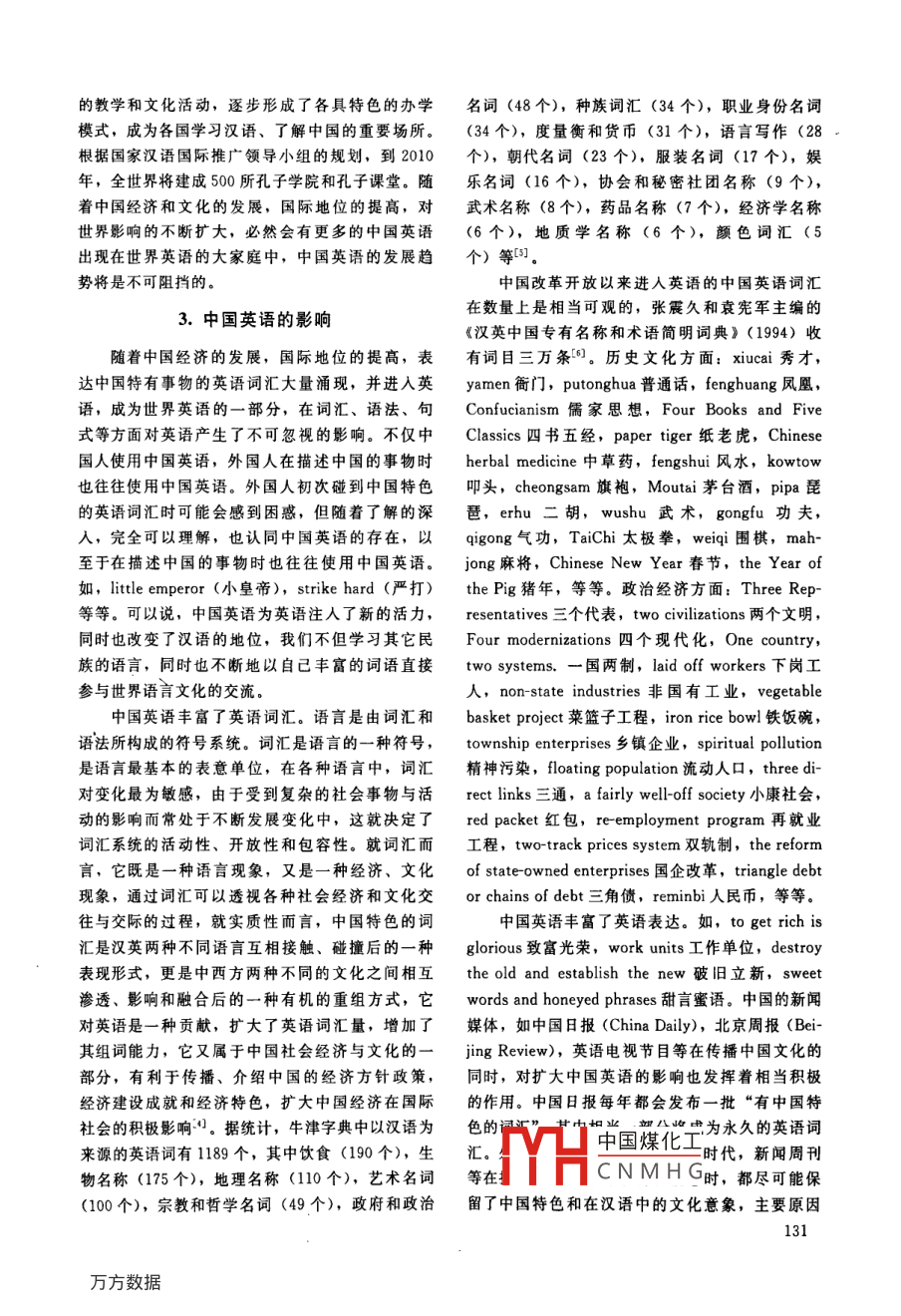 第32卷第2期衡陽師范學院學報No 2VoL. 322011年4月Journal of Hengyang Normal UniversityApr.2011中國英語的形成及影響趙湘(衡陽師范學院外語系,湖南衡陽421008)摘要:中國英語是具有中國特色的英語,它是由中國人根據(jù)自己的思維方式創(chuàng)的用以表達中國的政治、經(jīng)濟、社會文化等領城的事物與現(xiàn)象的一種英語變體。中國英語不僅豐富了英語詞匯及英語表達,也對英語產(chǎn)生了不可忽視的影響,已成為世界英語的一部分。中國英語是中外交流的產(chǎn)物,折射出中國不同時期的時代特征記載了中國改革開放后的社會圖景關鍵詞:中國英語;形成;影響;中國特色中圖分類號:H315文獻標識碼:A文章編號:1673-0313(2011)02-012904根據(jù)美國“全球語言監(jiān)督”( Global Language世界宣傳中國,傳播中華悠久而燦爛的文化,還Monitor)機構的報告,英語正在經(jīng)歷其歷史上前所未真的離不開中國英語。中國英語在我國對外宜傳有的變革,她正在加速吸收全球性詞匯,已逐漸成為方面所起的作用是巨大的,其影響也是十分深世界混合語言,全球化趨勢加速了其同化速率,而中遠的。國對其影響最大。從1994年加入世界英語行列的詞1.關于中國英語匯來看,5%至20%來自中國英語,超過任何其他的來源,而這些新詞和詞組,不用向母語為英語的人士中國英語,顧名思義,是具有中國特色的英特別解釋,都能被理解。這種中國趨勢改變了英語的語,它是由中國人(主要是中國的翻譯工作者)味道,也正在改變人們對英語語言的認知,使人們的根據(jù)自己的思維方式創(chuàng)造的用以表達中國的政治、思維方式更加色彩斑斕。該機構主席帕亞克( Paul Jj經(jīng)濟、社會文化等領域的事物與現(xiàn)象的一種英語Payack)指出(www.languagemonitor.com),中國有變體。我們在用英語描述中國特有的事物時經(jīng)常2.5億人在學習英語,幾乎相當于60年代全世界找不到對應詞,或有時勉強有對應詞但又找不到說英語人數(shù)的總和,由于中國增長的影響,它現(xiàn)恰當?shù)谋磉_方式,所以中國英語的詞匯和表達方在對世界英語( Global English)的沖擊比英語國式往往最富中國文化個性。中國英語既不同于中家還大。中國人每天都在制造新的英語詞匯,英式英語也不同于洋涇濱英語。中式英語(Ch語詞匯庫也隨著這些新詞匯的流通而迅速擴大 inglish)指口頭或書面表達的不地道的英語。不符languagemon合或不完全符合英語的規(guī)律和習慣。說者的思維這也許是我們中國人在語言方面太有想象力方式、表達方式以及詞匯的選擇和搭配都是中國和創(chuàng)造力的緣故。隨著中國經(jīng)濟的增長和國際地式的。出于受過一定的英語教育的人之口,常用位的提高,中國在全球的影響力不斷上升,在對來應付書面或口頭的日常交際。如,我們每天都外宣傳方面,我們根據(jù)自己特有的思想、語言和看書。( We see books every day.)這里的動詞應文化不斷地改變著英語的表達方式,從而形成具用read。洋涇濱英語( Pidgin english)是指硬扣有中國特色的中國英語( China english)。中國英漢語字眼,套用漢語詞序或語法的不倫不類的英語既是一種客觀存在,也是一種普遍現(xiàn)象,要向語H中國煤化工與之交往的一些CNMHG收稿日期:2010-1209者簡介:趙湘(1957—),男,河北邢臺人,教授,從事翻譯、語言與文化研究。沒有機會接受正規(guī)外語教育的中國人所說的英語。進入新世紀,特別是隨著我國加人WTO以及般指口語,輔以身勢語和當時情境,只能作最北京申奧、上海申博成功,標志著中國更加開放簡單的交際。它的特點是:詞匯主要取自外語,與外部世界的聯(lián)系更為密切。在這樣的歷史背景數(shù)量不多;語音夾雜當?shù)卣Z言的語音;語法簡化;下和社會環(huán)境中,掌握了英語,就能使我們更加多形象、直觀的表達。如, You see right no有效地參與國際競爭。德國語言學家、哲學家洪right.(你看對不對。)洋涇濱英語是中國特定時期堡特認為,語言是“一個民族進行思維和感知的的特定產(chǎn)物,對于中國的對外宣傳、英語教學及工具”,每一種語言都包含了一種獨特的世界觀。國際交流具有消極意義。但在英美人士看來,中語言習得的完成,是某種思維方式形成的標志。國英語同中式英語并沒有本質的區(qū)別,如,Long個人一旦首先習得了漢語,形成了中國式的思time no see.中國人自己不敢用,英美人士倒是用維方式,他將不可避免地在其英語使用中夾帶中得很自在;對中國特色的 Spring Festival Trans-國特點。由于漢英文化的差異,在用英語表示中portation他們也能理解并照用不誤,在他們的眼國社會文化中某些特有的事物與現(xiàn)象時,經(jīng)常發(fā)中這些都是 Chinglish,因為是中國人根據(jù)自己的現(xiàn)詞匯空缺,出現(xiàn)表達真空。這時人們常通過譯國情創(chuàng)造出來的。中國英語不是偶然現(xiàn)象,而是借、逐詞對譯、混合語等手段,使?jié)h語的詞匯進經(jīng)過了長期的使用和發(fā)展起來的現(xiàn)實,中國英語人英語交際。一切的語言都有其成長的過程,中可以用來介紹和表述獨特的中國文化2。雖說中國國英語由于長期的發(fā)展,已有許多開始被認可。英語不同于中式英語和洋涇濱英語,但后者對中另外,海外華裔作家在推動中國英語方面發(fā)揮了國英語的形成也是起了相當?shù)淖饔玫摹UZ言是文重要作用,他們用英語介紹中國文化或當代