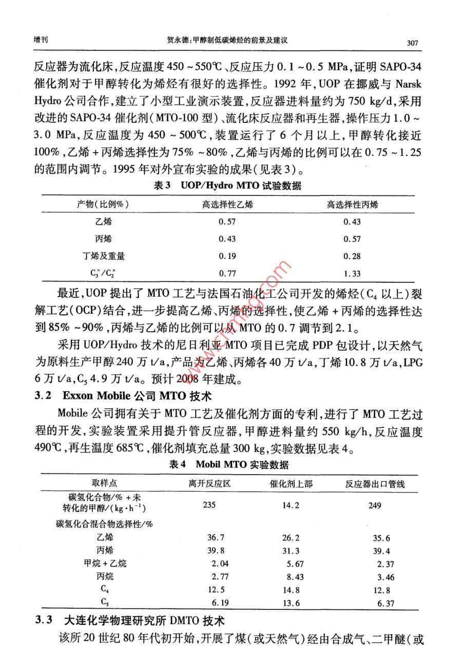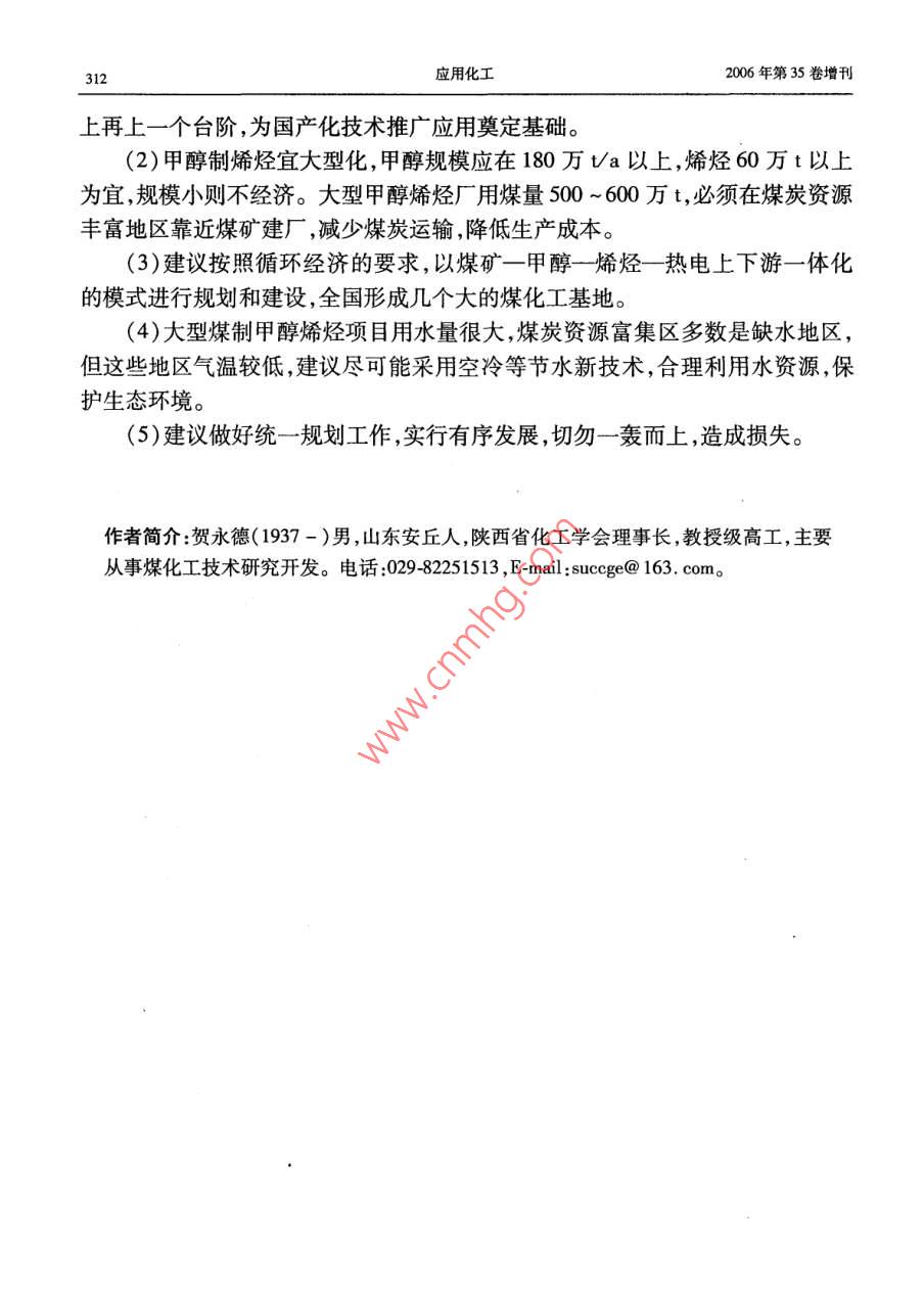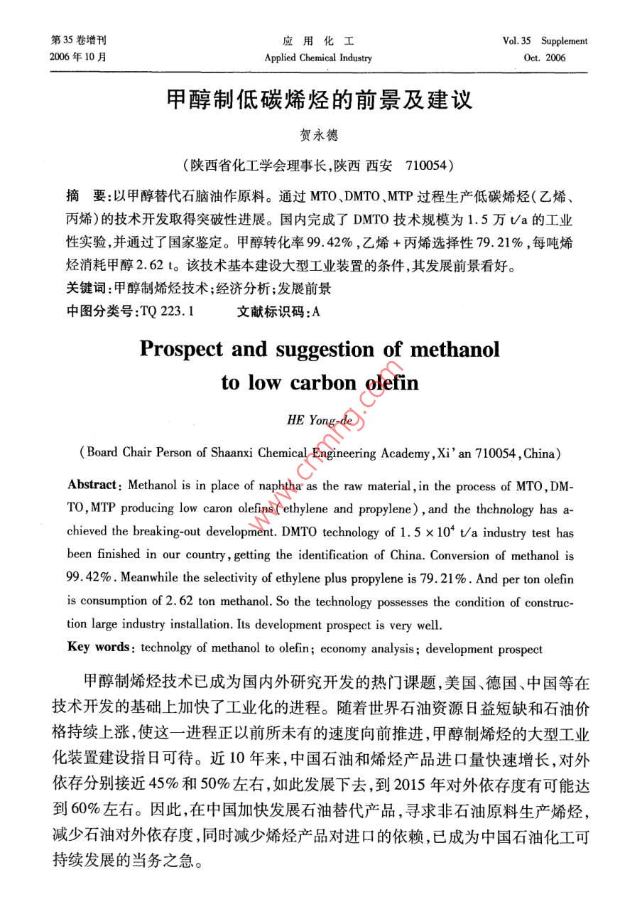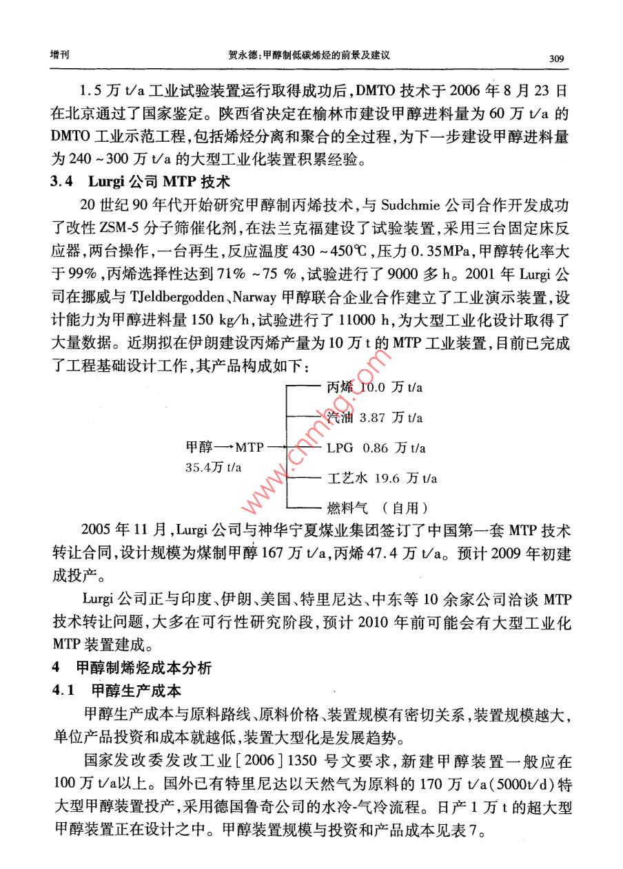 第35卷增刊應(yīng)用化工Vol. 35 Supplement2006年10月Aplied Chemical IndustryOct.2006甲醇制低碳烯烴的前景及建議賀永德(陜西省化工學(xué)會(huì)理事長(zhǎng),陜西西安710054)摘要:以甲 醇替代石腦油作原料。通過(guò)MTO、DMTO、MTP過(guò)程生產(chǎn)低碳烯烴(乙烯、丙烯)的技術(shù)開(kāi)發(fā)取得突破性進(jìn)展。國(guó)內(nèi)完成了DMTO技術(shù)規(guī)模為1.5萬(wàn)Va的工業(yè)性實(shí)驗(yàn),并通過(guò)了國(guó)家鑒定。甲醇轉(zhuǎn)化率99.42% ,乙烯+丙烯選擇性79. 21% ,每噸烯烴消耗甲醇2.62 t。該技術(shù)基本建設(shè)大型工業(yè)裝置的條件,其發(fā)展前景看好。關(guān)鍵詞:甲醇制烯烴技術(shù);經(jīng)濟(jì)分析;發(fā)展前景中圖分類號(hào):TQ 223.1文獻(xiàn)標(biāo)識(shí)碼:A .Prospect and suggestion of methanolto low carbon olefinHE Yong-de( Board Chair Person of Shaanxi Chemical Engineering Academy ,Xi' an 710054 ,China)Abstract: Methanol is in place of naphtha as the raw material ,in the process of MTO , DM-TO,MTP producing low caron olefins ( ethylene and propylene) , and the thchnology has achieved the breaking-out development. DMTO technology of 1.5 x 104 t/a industry test has .been finished in our country , getting the identification of China. Conversion of methanol is99. 42% . Meanwhile the selectivity of ethylene plus propylene is 79. 21 % . And per ton olefinis consumption of 2. 62 ton methanol. So the technology possesses the condition of construc-tion large industry installation. Its development prospect is very well.Key words: technolgy of methanol to olefin; economy analysis ; development prospect甲醇制烯烴技術(shù)已成為國(guó)內(nèi)外研究開(kāi)發(fā)的熱門(mén)課題,美國(guó)、德國(guó)、中國(guó)等在技術(shù)開(kāi)發(fā)的基礎(chǔ)上加快了工業(yè)化的進(jìn)程。隨著世界石油資源日益短缺和石油價(jià)格持續(xù)上漲,使這一進(jìn)程正以前所未有的速度向前推進(jìn),甲醇制烯烴的大型工業(yè)化裝置建設(shè)指日可待。近10年來(lái),中國(guó)石油和烯烴產(chǎn)品進(jìn)口量快速增長(zhǎng),對(duì)外依存分別接近45%和50%左右,如此發(fā)展下去,到2015年對(duì)外依存度有可能達(dá)到60%左右。因此,在中國(guó)加快發(fā)展石油替代產(chǎn)品,尋求非石油原料生產(chǎn)烯烴,減少石油對(duì)外依存度,同時(shí)減少烯烴產(chǎn)品對(duì)進(jìn)口的依賴,已成為中國(guó)石油化工可持續(xù)發(fā)展的當(dāng)務(wù)之急。增刊賀永德:甲醇制低碳烯烴的前景及建議3051石油資源短缺將制約烯烴工業(yè)的發(fā)展1.1全球石油儲(chǔ)量可開(kāi)采40年根據(jù)《BP世界能源統(tǒng)計(jì)2006》預(yù)測(cè),按目前的開(kāi)采速度計(jì)算,全球石油剩余儲(chǔ)量可開(kāi)采40年,煤炭可開(kāi)采162年。2003年以來(lái)石油價(jià)格持續(xù)上漲,2005年達(dá)到創(chuàng)紀(jì)錄的水平,全年平均每桶54.52美元;專家預(yù)計(jì),2006年國(guó)際原油價(jià)格將創(chuàng)新高,全年平均將達(dá)到每桶68美元;2007年仍將保持在每桶60美元以上的水平。低價(jià)油的時(shí)代已是一去不復(fù)返了。據(jù)統(tǒng)計(jì),1992 ~ 2004年,世界累計(jì)生產(chǎn)石油531.7億t,而新增儲(chǔ)量為126.9億t,僅為產(chǎn)量的23.87%,累計(jì)短缺350億t;2003年和2004年新增儲(chǔ)量更少,僅為4.1億t,大型油田的發(fā)現(xiàn)愈來(lái)愈少。石油開(kāi)采速度遠(yuǎn)遠(yuǎn)大于儲(chǔ)量增速,世界石油儲(chǔ)量的可持續(xù)增長(zhǎng)的能力令人擔(dān)憂。傳統(tǒng)的烯烴生產(chǎn)用原料主要來(lái)源于輕油(石腦油、輕柴油),全球烯烴生產(chǎn)能力中,以石腦油為原料的約占54%,其次為乙烷、丙烷,約占35%。1.2中國(guó)石油可開(kāi)采14 年根據(jù)中國(guó)統(tǒng)計(jì)年鑒2004年數(shù)據(jù),中國(guó)石油剩余可采儲(chǔ)量為24.9億t,按目.前開(kāi)采速度計(jì)算可開(kāi)采14 年,煤炭可開(kāi)采120年。2005 年中國(guó)生產(chǎn)原油1. 81億t,凈進(jìn)口石油1.42億t(原油+成品油) ,石油表觀消耗量為3.23億t。中國(guó)乙烯原料71.4%為石腦油和輕柴油,輕烴原料約占10.6%;-般原油煉制過(guò)程中石腦油和輕柴油產(chǎn)率約為25% ~30%,1 t乙烯需消耗輕油~3.2t。石油資源不足是嚴(yán)重制約烯烴產(chǎn)業(yè)發(fā)展的主要因素??窟M(jìn)口石油發(fā)展烯烴生產(chǎn)可能性較小,尋求替代石油烯烴原料已引起國(guó)家有關(guān)決策部門(mén)的高度重視。以甲醇為原料通過(guò)MTO、DMTO、MTP過(guò)程,進(jìn)行烯烴生產(chǎn)應(yīng)是中國(guó)發(fā)展烯烴產(chǎn)業(yè)的重要戰(zhàn)略選擇。歷年石油產(chǎn)量、進(jìn)口量、表觀消費(fèi)量見(jiàn)表1。表1歷年石油產(chǎn)量、 進(jìn)口量、表觀消費(fèi)量(當(dāng)量)單位:萬(wàn)t年份原油200120022003200420052010產(chǎn)量164901689016932174501808420000進(jìn)口量6025. 546940.77911212281.4 .1298815000 ~ 16000表觀消費(fèi)量21760. 52311026715.229731. 63230033000 ~ 350001.3烯烴 原料多元化要實(shí)現(xiàn)經(jīng)濟(jì)可持續(xù)發(fā)展,首先要能保持能源可持續(xù)發(fā)展。面對(duì)石油供應(yīng)及高油價(jià)的嚴(yán)峻形勢(shì),中國(guó)石油化工發(fā)展所需原料不能僅僅依賴石油,必須走多元化的路子,其中煤炭或天然氣制甲醇再進(jìn)--步生產(chǎn)低碳烯烴,是符合中國(guó)國(guó)情的重要選擇之一。306應(yīng)用化工2006年第35卷增