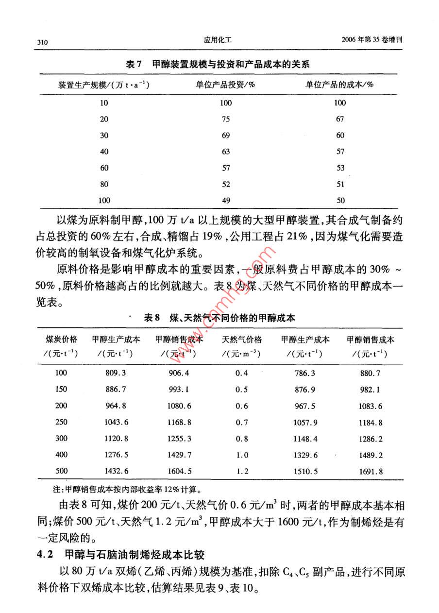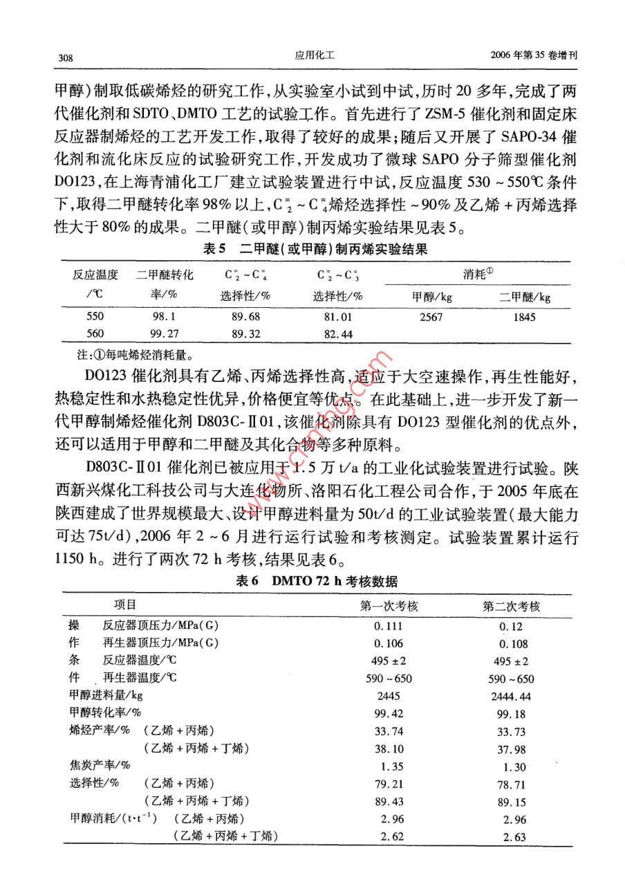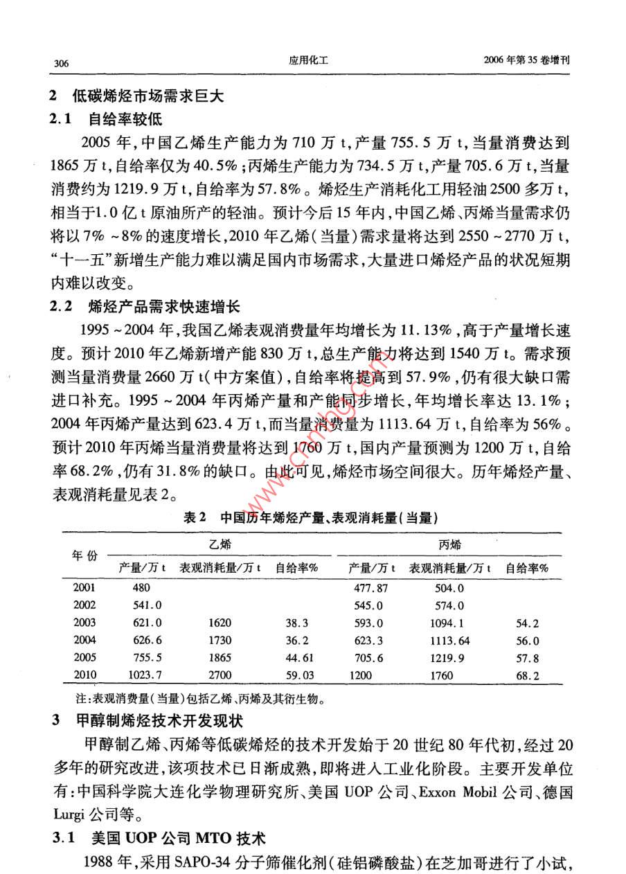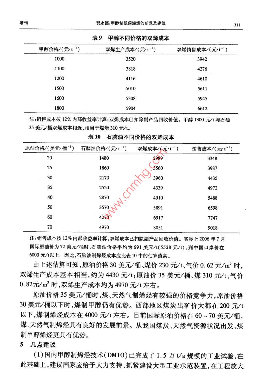第35卷增刊應(yīng)用化工Vol. 35 Supplement2006年10月Aplied Chemical IndustryOct.2006甲醇制低碳烯烴的前景及建議賀永德(陜西省化工學(xué)會(huì)理事長(zhǎng),陜西西安710054)摘要:以甲 醇替代石腦油作原料。通過(guò)MTO、DMTO、MTP過(guò)程生產(chǎn)低碳烯烴(乙烯、丙烯)的技術(shù)開(kāi)發(fā)取得突破性進(jìn)展。國(guó)內(nèi)完成了DMTO技術(shù)規(guī)模為1.5萬(wàn)Va的工業(yè)性實(shí)驗(yàn),并通過(guò)了國(guó)家鑒定。甲醇轉(zhuǎn)化率99.42% ,乙烯+丙烯選擇性79. 21% ,每噸烯烴消耗甲醇2.62 t。該技術(shù)基本建設(shè)大型工業(yè)裝置的條件,其發(fā)展前景看好。關(guān)鍵詞:甲醇制烯烴技術(shù);經(jīng)濟(jì)分析;發(fā)展前景中圖分類號(hào):TQ 223.1文獻(xiàn)標(biāo)識(shí)碼:A .Prospect and suggestion of methanolto low carbon olefinHE Yong-de( Board Chair Person of Shaanxi Chemical Engineering Academy ,Xi' an 710054 ,China)Abstract: Methanol is in place of naphtha as the raw material ,in the process of MTO , DM-TO,MTP producing low caron olefins ( ethylene and propylene) , and the thchnology has achieved the breaking-out development. DMTO technology of 1.5 x 104 t/a industry test has .been finished in our country , getting the identification of China. Conversion of methanol is99. 42% . Meanwhile the selectivity of ethylene plus propylene is 79. 21 % . And per ton olefinis consumption of 2. 62 ton methanol. So the technology possesses the condition of construc-tion large industry installation. Its development prospect is very well.Key words: technolgy of methanol to olefin; economy analysis ; development prospect甲醇制烯烴技術(shù)已成為國(guó)內(nèi)外研究開(kāi)發(fā)的熱門(mén)課題,美國(guó)、德國(guó)、中國(guó)等在技術(shù)開(kāi)發(fā)的基礎(chǔ)上加快了工業(yè)化的進(jìn)程。隨著世界石油資源日益短缺和石油價(jià)格持續(xù)上漲,使這一進(jìn)程正以前所未有的速度向前推進(jìn),甲醇制烯烴的大型工業(yè)化裝置建設(shè)指日可待。近10年來(lái),中國(guó)石油和烯烴產(chǎn)品進(jìn)口量快速增長(zhǎng),對(duì)外依存分別接近45%和50%左右,如此發(fā)展下去,到2015年對(duì)外依存度有可能達(dá)到60%左右。因此,在中國(guó)加快發(fā)展石油替代產(chǎn)品,尋求非石油原料生產(chǎn)烯烴,減少石油對(duì)外依存度,同時(shí)減少烯烴產(chǎn)品對(duì)進(jìn)口的依賴,已成為中國(guó)石油化工可持續(xù)發(fā)展的當(dāng)務(wù)之急。增刊賀永德:甲醇制低碳烯烴的前景及建議3051石油資源短缺將制約烯烴工業(yè)的發(fā)展1.1全球石油儲(chǔ)量可開(kāi)采40年根據(jù)《BP世界能源統(tǒng)計(jì)2006》預(yù)測(cè),按目前的開(kāi)采速度計(jì)算,全球石油剩余儲(chǔ)量可開(kāi)采40年,煤炭可開(kāi)采162年。2003年以來(lái)石油價(jià)格持續(xù)上漲,2005年達(dá)到創(chuàng)紀(jì)錄的水平,全年平均每桶54.52美元;專家預(yù)計(jì),2006年國(guó)際原油價(jià)格將創(chuàng)新高,全年平均將達(dá)到每桶68美元;2007年仍將保持在每桶60美元以上的水平。低價(jià)油的時(shí)代已是一去不復(fù)返了。據(jù)統(tǒng)計(jì),1992 ~ 2004年,世界累計(jì)生產(chǎn)石油531.7億t,而新增儲(chǔ)量為126.9億t,僅為產(chǎn)量的23.87%,累計(jì)短缺350億t;2003年和2004年新增儲(chǔ)量更少,僅為4.1億t,大型油田的發(fā)現(xiàn)愈來(lái)愈少。石油開(kāi)采速度遠(yuǎn)遠(yuǎn)大于儲(chǔ)量增速,世界石油儲(chǔ)量的可持續(xù)增長(zhǎng)的能力令人擔(dān)憂。傳統(tǒng)的烯烴生產(chǎn)用原料主要來(lái)源于輕油(石腦油、輕柴油),全球烯烴生產(chǎn)能力中,以石腦油為原料的約占54%,其次為乙烷、丙烷,約占35%。1.2中國(guó)石油可開(kāi)采14 年根據(jù)中國(guó)統(tǒng)計(jì)年鑒2004年數(shù)據(jù),中國(guó)石油剩余可采儲(chǔ)量為24.9億t,按目.前開(kāi)采速度計(jì)算可開(kāi)采14 年,煤炭可開(kāi)采120年。2005 年中國(guó)生產(chǎn)原油1. 81億t,凈進(jìn)口石油1.42億t(原油+成品油) ,石油表觀消耗量為3.23億t。中國(guó)乙烯原料71.4%為石腦油和輕柴油,輕烴原料約占10.6%;-般原油煉制過(guò)程中石腦油和輕柴油產(chǎn)率約為25% ~30%,1 t乙烯需消耗輕油~3.2t。石油資源不足是嚴(yán)重制約烯烴產(chǎn)業(yè)發(fā)展的主要因素??窟M(jìn)口石油發(fā)展烯烴生產(chǎn)可能性較小,尋求替代石油烯烴原料已引起國(guó)家有關(guān)決策部門(mén)的高度重視。以甲醇為原料通過(guò)MTO、DMTO、MTP過(guò)程,進(jìn)行烯烴生產(chǎn)應(yīng)是中國(guó)發(fā)展烯烴產(chǎn)業(yè)的重要戰(zhàn)略選擇。歷年石油產(chǎn)量、進(jìn)口量、表觀消費(fèi)量見(jiàn)表1。表1歷年石油產(chǎn)量、 進(jìn)口量、表觀消費(fèi)量(當(dāng)量)單位:萬(wàn)t年份原油200120022003200420052010產(chǎn)量164901689016932174501808420000進(jìn)口量6025. 546940.77911212281.4 .1298815000 ~ 16000表觀消費(fèi)量21760. 52311026715.229731. 63230033000 ~ 350001.3烯烴 原料多元化要實(shí)現(xiàn)經(jīng)濟(jì)可持續(xù)發(fā)展,首先要能保持能源可持續(xù)發(fā)展。面對(duì)石油供應(yīng)及高油價(jià)的嚴(yán)峻形勢(shì),中國(guó)石油化工發(fā)展所需原料不能僅僅依賴石油,必須走多元化的路子,其中煤炭或天然氣制甲醇再進(jìn)--步生產(chǎn)低碳烯烴,是符合中國(guó)國(guó)情的重要選擇之一。306應(yīng)用化工2006年第35卷增