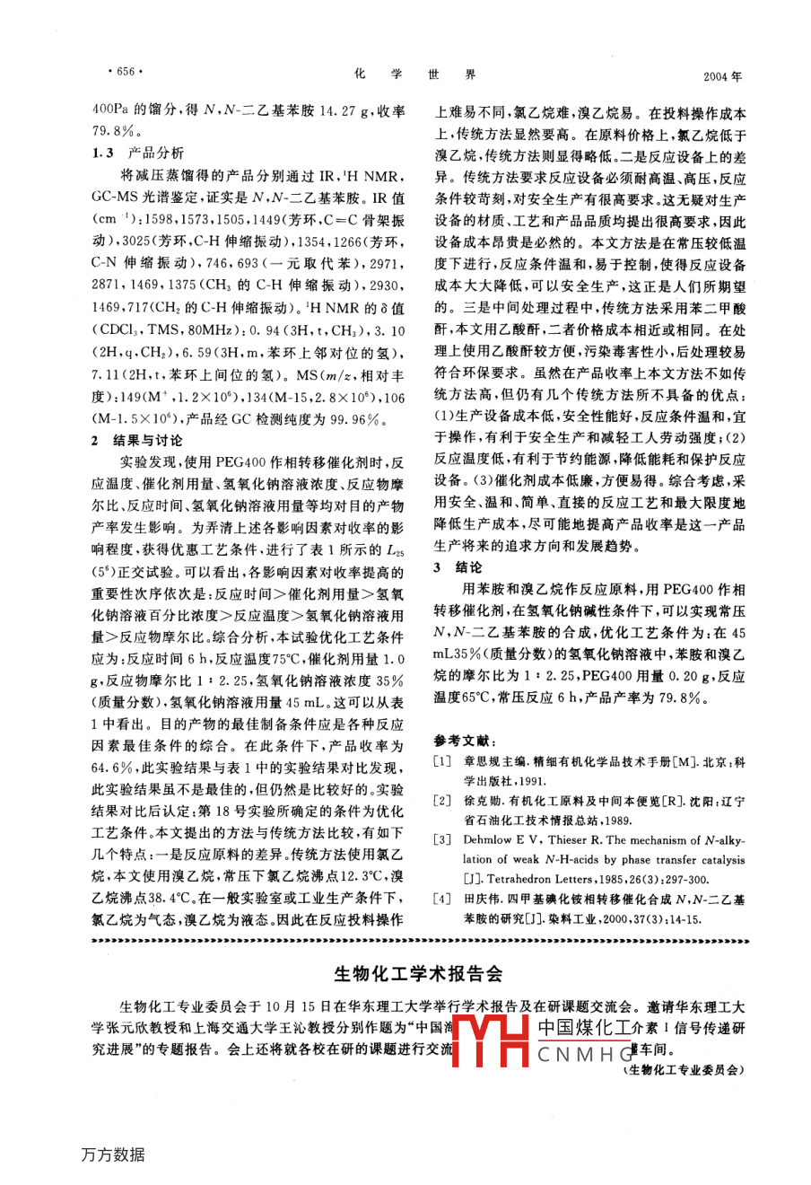 ●654●化學界2004年.聚乙二醇400相轉移催化合成N,N-二乙基苯胺的研究田慶偉(大連交通大學環(huán)境科學與工程學院,遼寧大連116028)摘要:用聚乙二醇 400作相轉移催化劑,在常壓下由苯胺和溴乙烷合成N,N-二乙基苯胺,研究了多種反應因素對目的產物產率的影響,提出了常壓催化合成目的產物的最佳工藝條件是:苯胺和渙乙烷的摩爾比為1 : 2. 25,催化劑用量0.20g,在45 ml35%(質量分數)的氫氧化鈉溶液中,反應溫度65°C,常壓反應6h,產品收率79. 8%。關鍵詞:聚乙二醇,相轉移催化,N,N -二乙基苯胺.中圖分類號:TQ 223. 61文獻標識碼:A文章編號:0367-6358(2004)12-0654-03Study on Phase Transfer Catalytic Synthesis ofN ,N-Diethylaniline with Polyethylene Glycol 400 as CatalystTIAN Qing-wei(Department of Entironmental Science and Enginering .Dalian Railrway Insitute ,Liaoning Dalian 116028.China)Abstract: Using polyethylene glycol 400 as phase transfer catalyst , N, N-diethylaniline is synthesized byreaction of aniline with bromoethane under atmospheric pressure. The factors affecting the yield of the tar-get product have been studied. The optimal reaction conditions are molar ratio of aniline to bromoethane ,1: 2. 25 ;35% sodium hydroxide solution,45 mL ;catalyst ,0. 2 g;reaction temperature ,65°C ;reaction time ,6h;and normal atmosphere. The yield of N ,N-diethylaniline is 79. 8%.Key words :polyethylene glycol ;phase transfer catalysis ;N ,N-diethylanilineN,N-二乙基苯胺是制備優(yōu)秀染料、藥物和彩胺,研究了多種反應因素對目的產物產率的影響,提色顯影劑的重要中間體,用途廣泛川。傳統(tǒng)合成方法出了最佳工藝條件,產品產率為79. 8%,此項工作是將定量的苯胺.氯乙烷壓倒裝有液堿的高壓釜中,鮮見報道。夾套蒸氣升溫,到溫度為120C,壓力為1. 2 MPa1實驗時,停汽。其后由于反應熱產生,溫度可升到215~1.1測試儀器和試劑230°C,壓力達4.5~5.5 MPa,反應3 h,出料用水汽Perkin - Elmer1730型傅里葉變換紅外光譜蒸餾,得粗品,加苯二甲酸酐酯化,再進行一次蒸餾儀:美國PE公司;PFT-NMR BrukerAC- 80型核得成品,產品收率在85%以上1。近年來,常壓相轉磁共振譜儀:美國Bruker公司;日立AC-80型質移催化合成N,N-二乙基苯胺的方法53.4]引起人們.譜儀:日本日立公司,島津GC-16型氣相色譜儀:關注。在此基礎上,本文提出用聚乙二醇400日本島津公司。(PEG400)作相轉移催化劑,在氫氧化鈉溶液存在.苯胺、氫氧化鈉、乙酸酐均為AR;溴乙烷、.下,使苯胺和溴乙烷作用,合成了N,N-二乙基苯PEG400均為CP收稿日期:2003-10-30:修回日期:2003-12-30中國煤化工作者簡介:田慶偉(19683~),男,碩士,副教授,主要從事精細化學品的研究.MYHCNMHG第12期●655●表1 L2s(5*)正 交試驗表催化劑反應物配比氫氧化鈉溶氯氧化鈉溶試號反應時間/h 反應溫度/°C產率/%用量/g_ n(苯胺) : n(澳乙烷)/摩爾比液濃度/%液用量/mL51:1.50.32541.120.401: 1.753563.30. 601: 2.00.4(40. 30.801:2.254571.61.00112.50.5(73. 01;2.0047.51 +2. 2555. 11: 2. 503(26.77569.20.20.1: 1.7540050.81:2.50.l053. 41: 1.5058. 5651. 001568. 70.20.1: 2.003063.8891: 2.2550. 65058. 85572. 10. 201 :2. 2579.8191;2.5062.48553. 321221:2.5053. 72:1: 1. 501045.92449.112.00.3:43. 1289. 5248. 5289.2268. 0239.5270.5249. 5302.5269.5290.5308.8254.5295. 0261.4251.0 .267.0259. 5272.5326.4316. 0258.5304. 6295.0294. 0330. 5269. 0296.5307. 957.949.757.853. 647.954.11399. 31/549.960.553.958. 161.850.959.052.350.251.954.5N/565. 363.251.760.958.8V/566.153. 859.3極差17.413.515.97.513.91.2實驗方法取,萃取液與油層混合,用無水硫酸鎂干燥3h,過在裝有電動攪拌、溫度計、回流冷凝器的500 .濾,蒸出乙醚。用等體積的乙酸酐處理剩余物并保持mL四頸燒瓶中,加入11 mL(0. 12 mol)苯胺和過夜,以除去游離的仲胺。加人過量10%(質量分20. 25 mL(0.27 mol)溴乙烷,0.20 g(5X 10~* mol)數)的鹽酸洗滌至酸性(pH=1~2),分出乙酰N-乙PEG400,35 mL45%(質量分數)的氫氧化鈉溶液,基苯胺,用25%(質量分數)氫氧化鈉溶液調pH=加熱控制反應瓶內溫度為65°C,常壓下攪拌反應6平層。水層用30mL乙h,冷卻至室溫,將反應液倒入分液漏斗中,靜置分中國煤化工合用無水硫酸鎂干層。將油、水兩層分離。水層用30 mL乙醚分3次萃:YHCNMHG收集沸點62~66°C/●656.比學世2004年400Pa的餾分,得N,N-二乙基苯胺14. 27 g,收率上難易不同,氯乙烷難,溴乙烷易。在投料操作成本79. 8%。上,傳統(tǒng)方法顯然要高。在原料價格上,氯乙烷低于1.3產 品分析溴乙烷,傳統(tǒng)方法則顯得略低。二是反應設備上的差將減壓蒸餾得的產品分別通過IR,'H NMR,異。傳統(tǒng)方法要求反應設備必須耐高溫、高壓,反應GC-MS光譜鑒定,證實是N,N-二乙基苯胺。IR值條件較苛刻,對安全生產有很高要求.這無疑對生產(cm ' ):1598,1573, 1505,1449(芳環(huán),C=C骨架振設備的材質、工藝和產品品質均提出很高要求,因此動),3025(芳環(huán),C-H伸縮振動), 1354, 1266(芳環(huán),設備成本昂貴是必然的。本文方法是在常壓較低溫C-N伸縮振動), 746,693(-元取代苯), 2971,度下進行,反應條件溫和,易于控制,使得反應設備2871, 1469, 1375(CH3的C-H伸縮振動), 2930,成本大大降低,可以安全生產,這正是人們所期望1469,717CH2的C-H伸縮振動)。'H NMR的δ值的。三是中間處理過程中,傳統(tǒng)方法采用苯二甲酸(CDCls,TMS, 80MHz):0. 94(3H,t,CH),3. 10酐,本文用乙酸酐,二者價格成本相近或相同。在處(2H,q.CH2),6. 59(3H,m,苯環(huán)上鄰對位的氫),理上使用乙酸酐較方便,污染毒害性小,后處理較易7.11(2H,t,苯環(huán)上間位的氫)。MS(m/z, 相對豐符合環(huán)保要求。雖然在產品收率上本文方法不如傳度):149(M* ,1. 2X 10*),1
