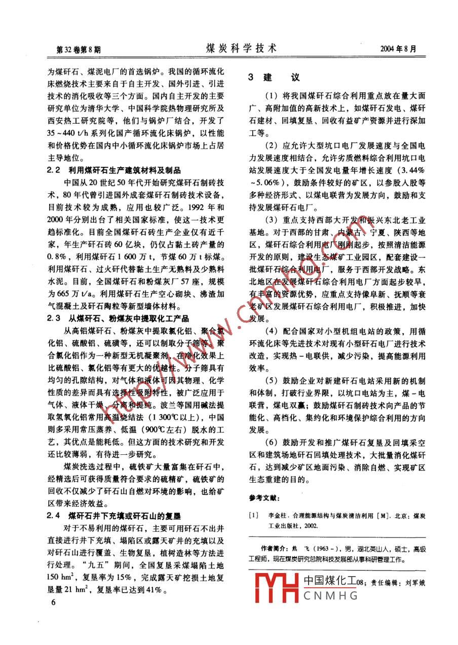 第32卷第8期煤炭科學(xué)技術(shù)2004年8月經(jīng)團(tuán)煤矸石電廠及劣質(zhì)煤的合理利用熊飛,王金華(煤炭科學(xué)研究總院,北京10013) .摘要:對我國煤矸石排放、利用現(xiàn)狀尤其是煤矸石電廠發(fā)展現(xiàn)狀及存在的問題進(jìn)行了分析,提出我國當(dāng)前形勢下劣質(zhì)煤的合理利用途徑與政策建議,為政府有關(guān)部門決策提供了依據(jù)。關(guān)鍵詞:煤矸石;劣質(zhì)煤;綜合利用.中圖分類號: X75文獻(xiàn)標(biāo)識碼: A文章編號: 0253 -2336 (2004) 08 -0004 -03Coal refuse-fired electric power plant and rational utilization of low-rank coalXIONG Fei, WANG Jin-hua( China Coal Research Insiue , Beijing100013, China)Abstract: Base on the analysis on the coal refuse dumping and utilization status in China, especially the development status and existingissues of the coal refue-fired eletric power plants , the paper provide the rational utilization access and policy proposals of coal refuse inthe present situation of China. The paper is to be references to the decision making departments of the govermment.Key words: coal refuse; low-rankcoal; comprehensive utilization煤矸石是煤礦在建井、開拓掘進(jìn)、采煤和煤炭排放也將逐年提高。煤矸石長期堆存,占用大量土洗選過程中排出的含炭巖石,是煤礦建設(shè)、生產(chǎn)過地。同時造成自燃,污染大氣和地下水質(zhì)。但是煤程中伴生的廢棄物。煤矸石一般占原煤產(chǎn)量的矸石又具有一定的發(fā)熱量和可利用的礦物質(zhì),可作15% ~20%,我國煤矸石和巖石的年排放量大約在為發(fā)電燃料、生產(chǎn)建材產(chǎn)品,提取有用元素以及復(fù)1.3億t以上,截至2002年底,全國矸石累計(jì)堆存墾造田等,也是可利用的資源。因此,劣質(zhì)煤及煤量35億t,占地約1.4萬hm',全國1 500座矸石矸石綜合利用逐漸成為煤炭結(jié)構(gòu)調(diào)整的有效途徑,山中,有130余座正在自燃,排放大量CO、CO2、也是煤炭企業(yè)實(shí)現(xiàn)扭虧增盈與可持續(xù)發(fā)展的重要措H2S、SO2等有毒有害氣體。煤矸石是目前我國排放量最大的工業(yè)固體廢棄物之- -。隨著我國潔凈煤技術(shù)發(fā)展戰(zhàn)略的實(shí)施,煤炭人1我國劣質(zhì)煤電廠建設(shè)現(xiàn)狀選比例逐年增加,煤矸石的排放比例尤其是選矸的煤矸石中通常含有20%以上的低熱值煤炭,設(shè)計(jì)與實(shí)施提供了科學(xué)依據(jù)。5結(jié)論(3) 該項(xiàng)技術(shù)的研究成功為紅會一礦實(shí)現(xiàn)合(1)以大放高堅(jiān)硬頂煤預(yù)先綜合弱化技術(shù)為理集中生產(chǎn)、建設(shè)高產(chǎn)高效現(xiàn)代化礦井打下堅(jiān)實(shí)基研究重點(diǎn),通過主要配套技術(shù)研究,使工作面回采礎(chǔ),拓寬了綜采放頂煤技術(shù)的適用條件,其成果在.率達(dá)到84.5%,工作面平均月產(chǎn)達(dá)到10.59萬t,國內(nèi)類似條件礦井中推廣應(yīng)用取得良好效果。取得了良好的技術(shù)經(jīng)濟(jì)效果。(2)通過比較深人分析研究堅(jiān)硬頂煤預(yù)先弱作者簡介:事德璽(1957-),男,甘肅靈臺人,高級工程化作用機(jī)理和基本規(guī)律,提出的預(yù)先綜合弱化基本師,現(xiàn)任靖遠(yuǎn)煤業(yè)有限責(zé)任公司科學(xué)研究設(shè)計(jì)院院長。方法及合理布孔、爆破、注水等主要參數(shù)的定量、定性確定方法,為現(xiàn)場頂煤預(yù)先綜合弱化工藝方案中國煤化工,責(zé)任編輯:李軍濤4MYHCNMHG第32卷第8期煤炭科學(xué)技術(shù)2004年8月其發(fā)熱量大約6.28~12.55 MJ/kg, 有的選中煤和完善化工作,正逐步應(yīng)用于實(shí)踐。煤泥的發(fā)熱量- -般在8.37 ~ 16.74 MJ/kg,這部分據(jù)不完全統(tǒng)計(jì),目前全國煤矸石綜合利用電廠熱值較低的燃料可作為發(fā)電和供熱燃料。國家先后.年盈利在4億元以上,絕大部分(90% 以上)的頒布了劣質(zhì)煤綜合利用電廠的法規(guī)和政策,鼓勵和煤矸石綜合利用電廠經(jīng)濟(jì)效益較好。2000年對國支持劣質(zhì)煤綜合利用電廠的發(fā)展。此外國家還在稅有重點(diǎn)煤礦綜合利用項(xiàng)目進(jìn)行跟蹤調(diào)查,效益列前收政策上,給予煤矸石綜合利用的電廠減免所得10名的均是煤矸石綜合利用電廠,由此可知,煤稅、減半征收增值稅的優(yōu)惠。在技術(shù)政策上,出臺.矸石綜合利用電廠在煤礦調(diào)整產(chǎn)業(yè)結(jié)構(gòu)中的重要地了.《煤矸石綜合利用技術(shù)政策要點(diǎn)》,引導(dǎo)企業(yè)依位。雖然近年來,煤矸石綜合利用電廠建設(shè)呈現(xiàn)出靠技術(shù)進(jìn)步,提升技術(shù)裝備水平。同時對煤矸石綜良好發(fā)展勢頭,但還存在以下主要問題:①國家合利用的電廠采取了認(rèn)定制度,對煤矸石及洗選矸給予的優(yōu)惠政策落實(shí)難;②電網(wǎng)的關(guān)系協(xié)調(diào)難;石實(shí)行了排放收費(fèi)制度,每噸5~30元。因此,從③市場監(jiān)管力度不大,市場上存在著借綜合利用政策層面上為煤矸石綜合利用的電廠創(chuàng)造了較好的電廠之名,行燃煤小火電之事的現(xiàn)象;④電廠立外部環(huán)境。項(xiàng)難,環(huán)境保護(hù)政策趨嚴(yán),環(huán)保壓力加大;⑤電隨著國家鼓勵、扶持煤炭企業(yè)興辦煤矸石綜合力行業(yè)關(guān)停小火電,對煤矸石、煤泥綜合利用電廠利用電廠有關(guān)政策的相繼出臺和煤炭企業(yè)建設(shè)煤矸提出更高的要求。石綜合利用電廠積極性的不斷提高,煤矸石發(fā)
