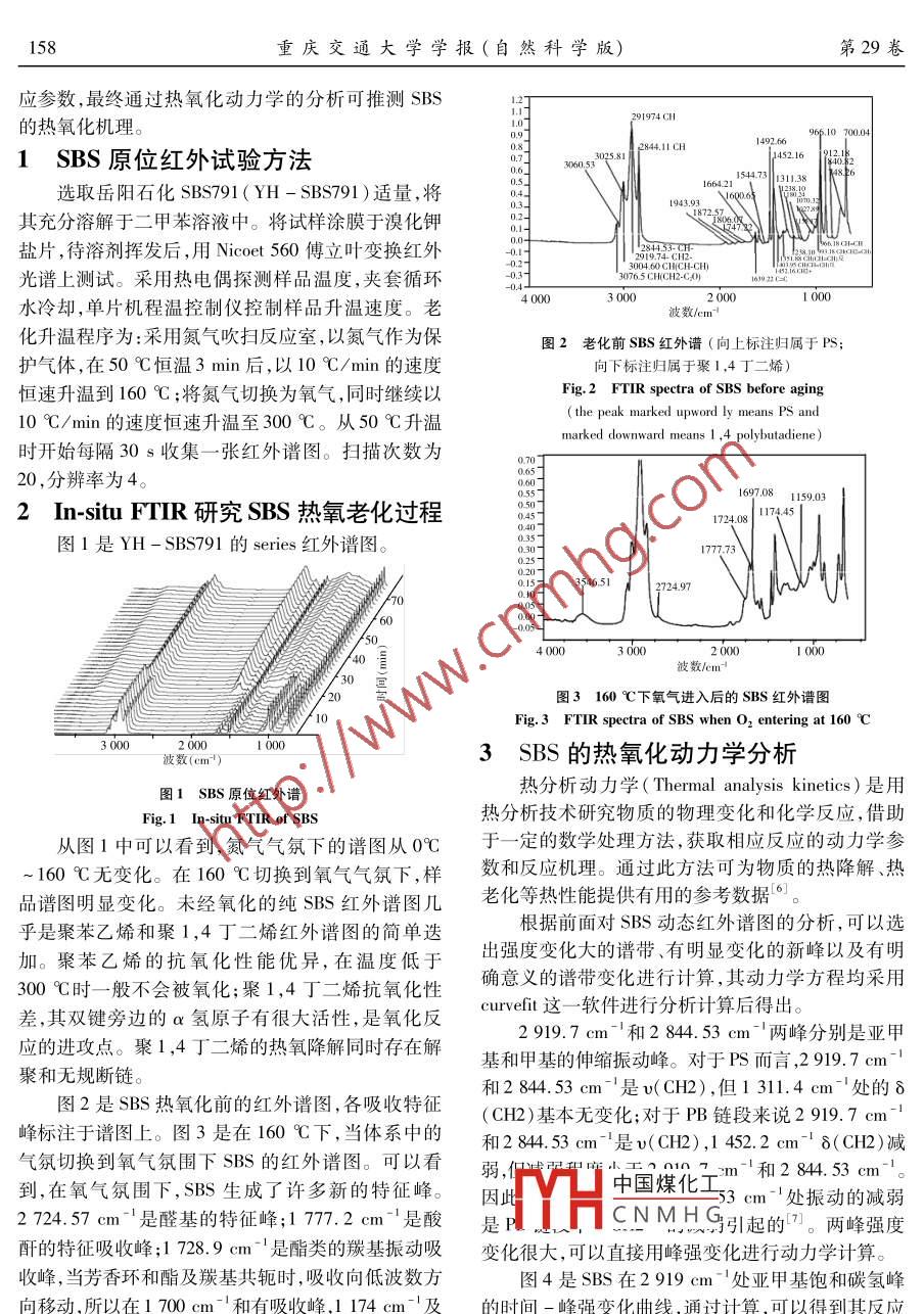 第29卷第1期重慶交通大學(xué)學(xué)報(bào)(自然科學(xué)版)Vol 29 Ne2010年2月JOURNAL OF CHONGQING JIAOTONG UNIVERSITY(NATURAL SCIENCE)Feb.2010SBS熱氧老化動(dòng)力學(xué)研究曹雪娟',雷運(yùn)波2(1.重慶交通大學(xué)土木建筑學(xué)院,重慶400074;2.后勤工程學(xué)院軍事建筑工程系,重慶4000411摘要:采用原位紅外技術(shù)跟蹤SBsS熱氧化過(guò)程,同時(shí)通過(guò)熱分析動(dòng)力學(xué)技術(shù)計(jì)算了SBS的氧化動(dòng)力學(xué)反應(yīng)參數(shù)。研究表明,160℃以下時(shí),氮?dú)夥諊械腟BS無(wú)降解斷鏈現(xiàn)象發(fā)生。在氧氣氛圍下,SBS中的PB段發(fā)生熱氧化降及無(wú)規(guī)則斷鏈。在300℃以下時(shí),SBS中的PS段抗氧性能優(yōu)異,無(wú)氧化發(fā)生;PB段中雙鍵旁的α氫原子有很大性,是氧化反應(yīng)的進(jìn)攻點(diǎn),其熱氧化降解同時(shí)存在解聚和無(wú)規(guī)斷鏈,自動(dòng)氧化反應(yīng)是SBS熱氧老化的主要特征,應(yīng)機(jī)理為自由鏈?zhǔn)?反應(yīng)過(guò)程包括鏈引發(fā)、鏈增長(zhǎng)和鏈終止,反應(yīng)經(jīng)過(guò)初始自由基的誘導(dǎo)期后,SBS迅速被氧化并發(fā)生嚴(yán)重降解。關(guān)鍵詞:SBS熱氧化;原位紅外;熱分析動(dòng)力學(xué);自動(dòng)氧化中圖分類號(hào):TQ334.3;TQ031.7文獻(xiàn)標(biāo)志碼:A文章編號(hào):1674-0696(2010)01-0157-05Study on Thermal Oxidative Aging Kinetics of SBSCAO Xue-juan, LEI Yun-bo2(1. Shool of Civil Engineering Architecture, Chongqing Jiaotong University, Chongqing 400074, China2 Department of Architecture Martial Engineering, Chongqing Institute of Logistics Engineering of PLAChongqing 400041, China)Abstract: The thermal oxidation process of SBs is tracked by in-situ FTIR; meanwhile, the reaction parameters of SBS oxdation kinetics are calculated by thermal analysis kinetics. The results show that there is no chain scission and degradationoccurred in nitrogen atmosphere below 160C; while, in oxygen atmosphere, thermal oxidative degradation and randomchain scission occur in PB segment of SBS; PS segment of SBs has excellent anti-oxidation performance and it cant be oxidized when temperature is below 300C. The a-H beside the double-bond has great activity, which is easy to be oxidizedThe results also show that both of chain scission and de-polymerization occur in the thermal oxidation reaction. Auto-oxida-tion is the main feature of SBs thermal aging oxidation process. The mechanism of the reaction is freely-chained reactionwhich includes chain initiation, chain growth and chain termination. After the reaction experiences the induction period ofinitial free radical, SBS is oxidized rapidly and degraded severelyKey words: thermal oxidation of SBS; in-situ FTIR thermal analysis kinetics; auto-oxidation苯乙烯-丁二烯-苯乙烯嵌段共聚物(SBS)鏈結(jié)構(gòu)的變化。周立新等4將SBS樣條置于熱氧是目前世界上產(chǎn)量最大的熱塑性彈性體之一,因其老化箱中,測(cè)試了不同抗氧體系下的SBS氧化前后優(yōu)良的拉伸性能、良好的耐低溫性、加工性、溶解性的力學(xué)性能。 SINGHR P.等用動(dòng)態(tài)接觸角和紅外及獨(dú)特的抗滑性而被大量應(yīng)用于橡膠制品、黏合劑光譜以及掃描電鏡硏究SBS在紫外輻照后的變化,及瀝青和樹(shù)脂的改性劑等領(lǐng)域,SBS已成為了世上并提出了SBS的光氧化老化機(jī)理。 WISHWA PRAS目前消費(fèi)量最大的熱塑性彈性體2。但是由于ADA.等分析了不同溶劑溶解SBS的老化情況SBS分子結(jié)構(gòu)中的丁二烯段(PB)不飽和雙鍵的存目前關(guān)于SBS老化的研究多局限于老化前后性能在,使其對(duì)光、熱敏感性增強(qiáng),SBS的老化會(huì)大大降的評(píng)價(jià)機(jī)理研究較少因出,筆者結(jié)合原位動(dòng)態(tài)紅低其使用性能。因此,對(duì)于SBS老化性能的研究具外中國(guó)煤化工了SBS的熱氧老化過(guò)有重要意義。四川大學(xué)葉榮根等3采用紫外光加程,CNMH可溫度變化的分子結(jié)構(gòu)速老化研究了老化前后的力學(xué)性能、特性黏度、分子改變情況,同時(shí)可以得到熱降解、熱老化的動(dòng)力學(xué)反收稿日期:2009-09-08基金項(xiàng)目:國(guó)家高技術(shù)研究發(fā)展計(jì)劃項(xiàng)目(863計(jì)劃)(2003AA333020)乍者簡(jiǎn)介:曹雪娟(1979-),女,四川鄰水人,博土研究生,研究方向?yàn)橹凡牧霞捌涓男约夹g(shù)。E-mail:caoxuejuan@tom.com。158重慶交通大學(xué)學(xué)報(bào)(自然科學(xué)版)第29卷應(yīng)參數(shù),最終通過(guò)熱氧化動(dòng)力學(xué)的分析可推測(cè)SBS的熱氧化機(jī)理。1SBS原位紅外試驗(yàn)方法544.73選取岳陽(yáng)石化SBS791(YH-SBS791)適量,將其充分溶解于二甲苯溶液中。將試樣涂膜于溴化鉀鹽片,待溶劑揮發(fā)后,用 Nicolet560傅立葉變換紅外光譜上測(cè)試。采用熱電偶探測(cè)樣品溫度,夾套循環(huán)水冷卻,單片機(jī)程溫控制儀控制樣品升溫速度。老3000波數(shù)/cm化升溫程序?yàn)?采用氮?dú)獯祾叻磻?yīng)室,以氮?dú)庾鳛楸D2老化前SBS紅外譜(向上標(biāo)注歸屬于PS護(hù)氣體,在50℃恒溫3min后,以10℃/min的速度向下標(biāo)注歸屬于聚1,4丁二烯恒速升溫到160℃;將氮?dú)馇袚Q為氧氣,同時(shí)繼續(xù)以Fig 2 FTIR spectra of SBs before aging10℃/min的速度恒速升溫至300℃。從50℃升溫marked downward means 1, 4 polybutadiene時(shí)開(kāi)始每隔30s收集一張紅外譜圖。掃描次數(shù)為20,分辨率為41159032In- situ ftir研究SBS熱氧老化過(guò)程圖1是YH-SBS791的 serles紅外譜圖。1777732000圖3160