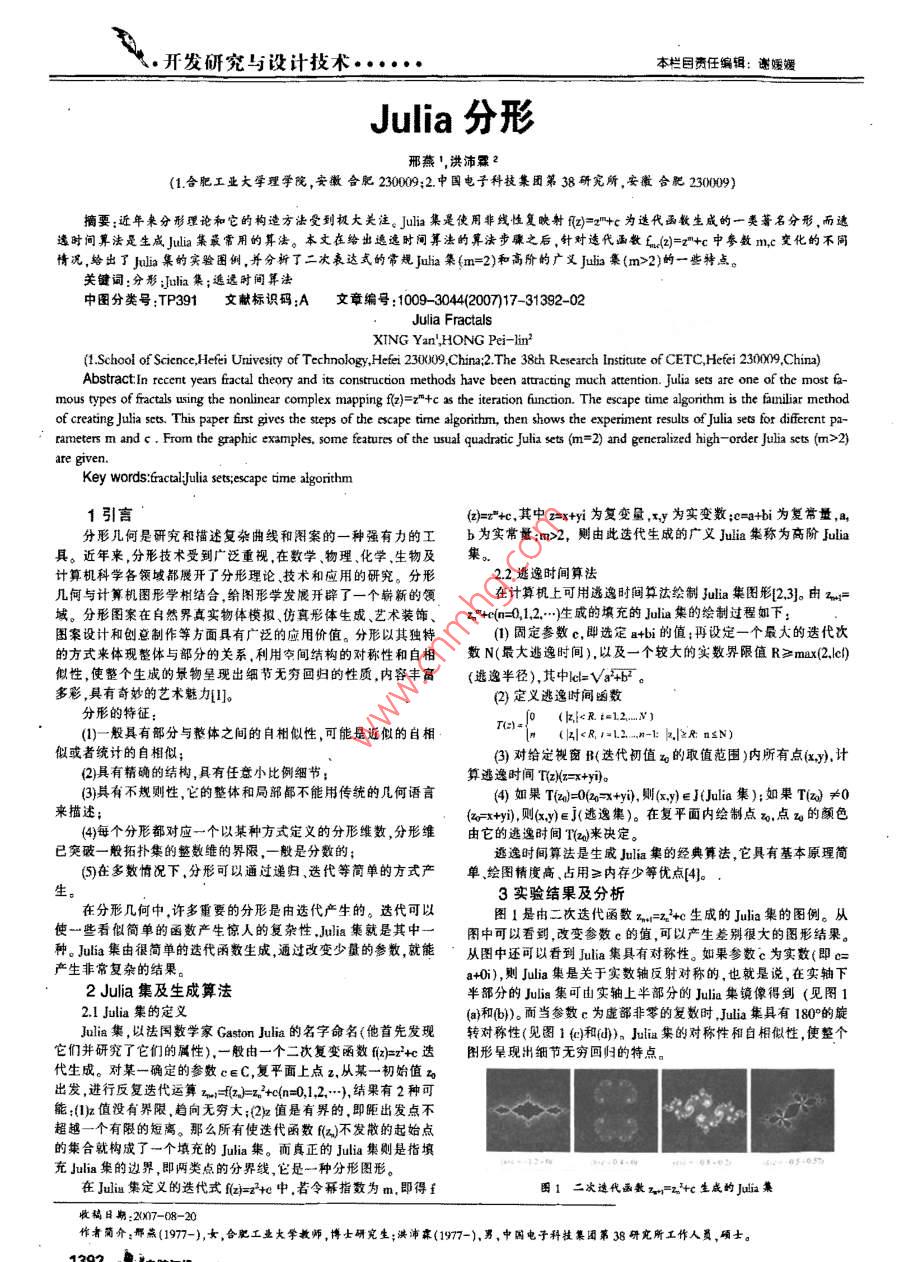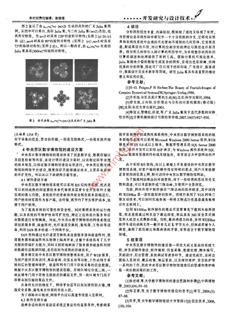 ·開發(fā)研究與設(shè)計(jì)技術(shù)·本欄目責(zé)任編輯:謝媛媛Juia分形邢燕'洪沛霖2(1合肥工業(yè)大學(xué)理學(xué)院,安激合肥230009:2中國電子科技集團(tuán)第38研究所,安合肥23000摘要:近年來分形理論和它的構(gòu)造方法受到極大關(guān)注。Juli集是使用非線性復(fù)映射f=z"+c為選代函數(shù)生威的一類著名分形,而遮逸時(shí)間算法是生成Jla集最常用的算法。本丈在給出逃逸時(shí)間算法的算法步之后,針對(duì)代函數(shù)(2=z”+c中參數(shù)mc變化的不同情況,給出了Jl集的實(shí)驗(yàn)圖例,并分析了二次表達(dá)式的常規(guī)ja集(m=2)和高階的廣義j集(m>2)的一些特點(diǎn)。關(guān)鍵詞:分形Juha集;進(jìn)遠(yuǎn)時(shí)間算法中圖分類號(hào):TP391文獻(xiàn)標(biāo)識(shí)碼A文章編號(hào):100930442007)17-31392-02Julia fractalsXING Yan HONG Pei-h(1.School of Science, Hefei Univesity of Technology, Hefei 23009, China; 2. The 38th Research Institute of CETC, Hefei 230009, China)Abstract In recent years fractal theory and its construction methods have been attracting much attention. Julia sets are one of the most famous types of fractals using the nonlinear complex mapping f(z)=z +c as the iteration function. The escape time algorithm is the familiar methodof creating Julia sets. This paper first gives the steps of the escape time algorithm, then shows the experiment results of Julia sets for diferent parameters m and c. From the graphic examples, some features of the usual quadratic Julia sets(m=2)and generalized high-order Julia sets(m>2)are given.Key words ractal Julia sets; escape time algorithm1引言,其中zx+yi為復(fù)變量,xy為實(shí)變數(shù);e=a+bi為復(fù)常量分形幾何是研究和描述復(fù)雜曲線和圖案的一種強(qiáng)有力的工b為實(shí)常量;m>2,則由此選代生成的廣義 Julia集稱為高階 Julia具。近年來,分形技術(shù)受到廣泛重視,在數(shù)學(xué)、物理、化學(xué)生物及集。計(jì)算機(jī)科學(xué)各領(lǐng)域都展開了分形理論、技術(shù)和應(yīng)用的研究。分形逃逸時(shí)間算法幾何與計(jì)算機(jī)圖形學(xué)相結(jié)合給圖形學(xué)發(fā)展開辟了一個(gè)嶄新的領(lǐng)在計(jì)算機(jī)上可用選逸時(shí)間算法繪制Jui集圖形2,3]由z=域。分形圖案在自然界真實(shí)物體模擬、仿真形體生成、藝術(shù)裝飾、z°cn=012…)生成的填充的Juia集的繪制過程如下:圖案設(shè)計(jì)和創(chuàng)意制作等方面具有廣泛的應(yīng)用價(jià)值。分形以其獨(dú)特(1)固定參數(shù)c,即選定a+bi的值;再設(shè)定一個(gè)最大的迭代次的方式來體現(xiàn)整體與部分的關(guān)系,利用李間結(jié)構(gòu)的對(duì)稱性和自相數(shù)N(最大逃逸時(shí)間),以及一個(gè)較大的實(shí)數(shù)界限值R≥max(2似性,使整個(gè)生成的景物呈現(xiàn)出細(xì)節(jié)無夯回歸的性質(zhì)內(nèi)容豐富(選逸半徑),其中d=Va+b2。多彩具有奇妙的藝術(shù)魅力1(2)定義逃逸時(shí)間函數(shù)分形的特征(i2)生成的高階的廠義Juia集圖4結(jié)論例。從圖中可以看出高階 Julia集,與二次 Julia案(m=2)類似,也分形圖形層次豐富內(nèi)涵深刻既體現(xiàn)了混沌又體現(xiàn)了有序具有對(duì)稱性。當(dāng)m=3時(shí)具有120的旋轉(zhuǎn)對(duì)稱性(見圖2()b))分形理論是非線性科學(xué)研究中一個(gè)十分活躍的分支,它研究自然和(d),m4時(shí)具有90°的旋轉(zhuǎn)對(duì)稱性(見圖2(e),m=5時(shí)具有界和非線性系統(tǒng)中出現(xiàn)的不光滑和不規(guī)則的幾何形體它發(fā)展迅72的旋轉(zhuǎn)對(duì)稱性(見圖2(1)。所以一般而言,由xm=3+e生成的速,新成果層出不窮,用計(jì)算機(jī)繪制分形的理論與算法也新月Julia集具有360m)9的旋轉(zhuǎn)對(duì)稱性。異。將分形幾何學(xué)引入到計(jì)算機(jī)圖形學(xué)中,為非規(guī)整形狀圖形的計(jì)箅機(jī)描述和處理提供了有利工具。借助討算杋可視化技術(shù)」Julia集能由少量的數(shù)據(jù)生成復(fù)雜的圖形,呈現(xiàn)出色彩斑斕、結(jié)優(yōu)美的分形圖案,因此可廣泛應(yīng)用于紡織印染、廣告設(shè)計(jì)、服裝設(shè)計(jì)、裝設(shè)計(jì)及美術(shù)教學(xué)等領(lǐng)域。研究Juia集具有著重要的理論意義和實(shí)用價(jià)值參考文獻(xiàn)[IJH-O, Peitgen, P H Richter. The Beauty of Fractals: Images of◆Complex Dynamical Systems Mf]Springer-Verlag. 1986.2]齊東旭分形及其計(jì)算機(jī)生成M北京科學(xué)出版社1994曾文曲王向陽分形理論與分形的計(jì)算機(jī)模擬(修訂版)沈陽東北大學(xué)出版社2001=1,·4606(c)m4.0-097(1mc=車1·5日氏]秦宜云智繼紅,任波等廣義Jia集關(guān)于選代參數(shù)的對(duì)稱性分析U計(jì)算機(jī)輔助設(shè)計(jì)與圖形學(xué)學(xué)報(bào),200719072927-930圖2透代函數(shù)zm=zc(m>2)生成的廣又ja集(上擴(kuò)第1354頁統(tǒng)開發(fā)和維護(hù)的成熟性和易用性,中央蘇區(qū)數(shù)字博物館系統(tǒng)的服對(duì)于采集的信息,要雙份存儲(chǔ),一份是無損格式,一份是有損壓縮務(wù)器操作系統(tǒng)可以采用 Microsoft Windows2009rer件WEB格式鞭務(wù)釆用1S50或以上版本,數(shù)據(jù)庫管理采用 SQL Server2004中央蘇區(qū)數(shù)字博物館的建設(shè)方案軟件。軟件開發(fā)可以采用ASP語言,與 Windwos操作系統(tǒng)和SQL中央蘇區(qū)數(shù)字博物館的建設(shè)涉及了息數(shù)字化數(shù)據(jù)存儲(chǔ)以 Server數(shù)據(jù)庫管理欽件形成