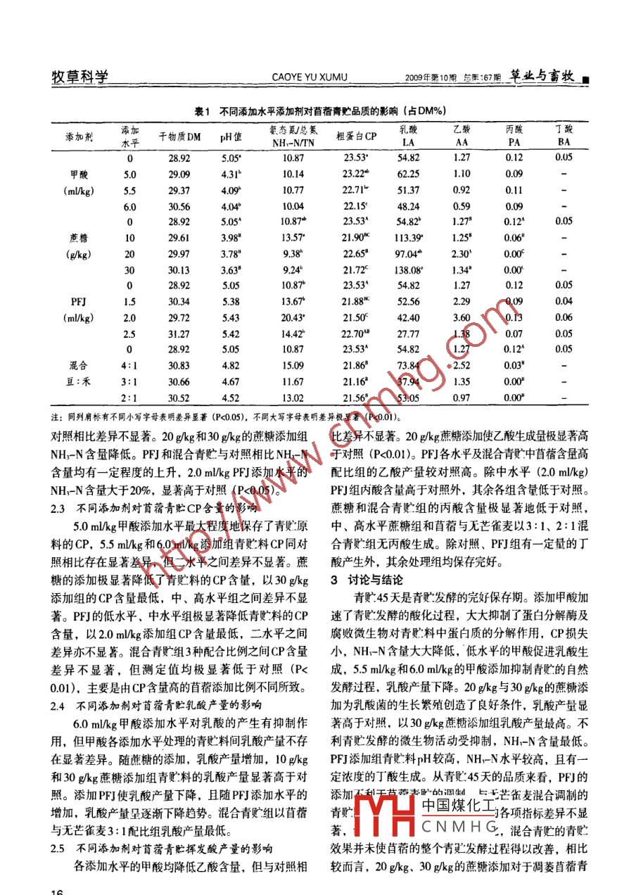 。草業(yè)與畜牧2009年勇10期 總第167期CAOYE YU XUMU牧草科學(xué)不同青貯添加劑對苜蓿青貯品質(zhì)的影響朱慧森,董寬虎*(山西農(nóng)業(yè)大學(xué)動物科技學(xué)院,山西太谷030801)摘要: 以紫花苜蓿為材料,采用隨機區(qū)組設(shè)計,研究不同添加水平添加劑,甲酸(5.0 ml/kg. 5.5 m/kg和6.0 ml/kg)、蔗糖(10g/kg、 20 g/kg和30 glkg)、發(fā)酵汁PFJ (1.5 m/kg. 2.0 mlkg和2.5 mlkg)和不同比例無芒雀麥(25%. 33%和50%)混合青貯對青貯pH值、氨態(tài)氮(NH-N) 含量及乳酸產(chǎn)量的影響。結(jié)果表明:蔗糖(30 gkg)添加效果最好,甲酸(6.0ml/kg)次之,以下依次為混合青貯、直接青貯和PFJ青貯。關(guān)鍵詞:苜蓿;青貯添加劑;青貯品質(zhì)中圖分類號: S816.7文獻標識碼: A文章編號: 1673- -8403(2009)10 -0015-03世界各國用于飼草加工貯存的方式很多,但青貯(10 gkg.20 g/kg和30 gkg)、發(fā)酵汁PFJ (1.5 ml/kg、和田間干燥是兩種主要的調(diào)制手段,田間干燥為獲得2.0 m/kg和2.5 mlkg)和不同比例無芒雀麥(25% 、高的干物質(zhì)產(chǎn)量常常延誤收獲期,導(dǎo)致營養(yǎng)物質(zhì)含量33%和50%),混勻,填裝人塑料容器中,壓實加蓋密封。顯著降低,若是干燥過程中遇雨淋常會造成可溶性養(yǎng)在青貯后的第45天,準確稱取20 g左右的青貯分的大量流失。在北美,苜蓿被典型地用來制作青貯料,加蒸餾水浸提36 h,將浸提液過濾,-20條件飼料。青貯調(diào)制主要在歐洲、日本及許多發(fā)展中國家冷凍保存,供pH值、氨態(tài)氮、乳酸的測定。本試驗盛行。豆科牧草中苜蓿粗蛋白含量高、緩沖能值高共設(shè)4個處理,每個處理設(shè)4個添加水平,重復(fù)3次。(390-570 mE) (MeDonald, 1991) 川、水溶性碳水化1.3測試指標合物(WSC)含量低,而難以用常規(guī)方式青貯。本試驗pH值采用廈門分析儀器廠生產(chǎn)的pHS -3C精密酸旨在向同一干物質(zhì)水平的苜蓿中加入不同的添加劑后,度計進行測定。對羥基聯(lián)苯比色法測定乳酸含量。研究不同添加水平添加劑對苜蓿青貯品質(zhì)的影響。SQ -206氣相色譜儀測定乙酸、丙酸、丁酸含量。氨1材料與方法 .態(tài)氮含量采用苯酚一-次氯酸鈉比色法測定1.1試驗材料(Broderick和Kang, 1980) 內(nèi)。紫花苜蓿(Medicago sativa L)和無芒雀麥.1.4 數(shù)據(jù)統(tǒng)計分析(Bromus inermis Leyss)均采自山西農(nóng)業(yè)大學(xué)動物科采用Excel 2003對原始數(shù)據(jù)進行處理,SAS 軟件技試驗站牧草標本區(qū)。甲酸、蔗糖為分析純。發(fā)酵汁進行方差分析和多重比較。(Previously fermented juice ,PFJ)按照如下方法制2結(jié)果與分析(見表1)備:稱取50g紫花苜蓿鮮樣,榨汁、過濾,向濾液中2.1不 同添加劑對首蓿青貯pH值的影響加入0.2%的蔗糖,30C恒溫培養(yǎng)箱中培養(yǎng)兩天,添加甲酸、蔗糖處理的青貯料,隨甲酸、蔗糖添pH4.0。加水平的增加,青貯料的pH呈不同程度的下降趨1.2 試驗方法勢,其中甲酸處理組青貯料pH與對照相比呈顯著下刈割紫花苜蓿,全株晾曬15 h后,切短成2~3 cm降趨勢,蔗糖添加組不同添加水平處理的青貯料均極的小段,晾曬18h,待水分含量降至60%~70%時,顯著低于對照(P<0.01), 以30 g/kg添加組青貯料pH添加甲酸(5.0 mlkg、5.5 mlkg和6.0 m/kg)、蔗糖值最低備 添tmuk平間青曠料的pH不存在顯著差異。中國煤化工所升高,混合青貯.收稿日期: 2009-04-13作者簡介:朱慧森(1977- ), 女,西晉中人,在讀博士,對pHRYHCNMHG主要從事草地資源開發(fā)應(yīng)用方面的研究。2.2不 同添加劑對苜蓿青貯NH,-N含量的影響+通訊作者由表1可知,甲酸對NH-N的產(chǎn)量影響不大,同15牧草科學(xué)CAOYE YU XUMU2009年第10期總年:67用草業(yè)與畜牧_■表1不同添加水平添加劑對苜蓿青貯品質(zhì)的影響 (占DM%)添加氨態(tài)氮總氮乳酸乙酸丙酸丁酸添加劑水平干物質(zhì)DMpH值NH-NTN粗蛋白CPLAAAPABA028.925.05*10.8723.53"54.821.270.120.05甲酸29.094.31'10.1423.22*62.251.100.09(mlkg).529.374.09*10.7722.7151.370.920.11.030.5610.0422.15*48.245.05^10.87*23.53*54.82* .0.12^蔗糖1029.613.98"13.57*21.90113.39*1.25*0.06"(g/kg)2029.973.78"9.38*22.65"97.04*2.30'0.00C30.13 .3.63*9.2421.72138.08*1.34"0.005.0523.53'PFJ30.345.3813.67*21.88年52.562.290.04(m/kg)29.725.420.43"21.50f42.403.600.130.0631.275.4314.42*22.7027.771.380.0723.53^混合4:130.834.8215.0921.8673.842.520.03"豆:禾3:130.6611.6721.1637.941.350.00"2:130.524.5213.0221.5653.050.970.00*注:同列肩標有不同小寫字母表明差異顯著(P<0.05), 不同大寫字母表明差異極顯著(P<0.01)。對照相比差異不顯著。20 e/kg和30 g/kg的蔗糖添加組比差異不顯著。20 g/kg蔗糖添加使乙酸生成量極顯著高NH3-N含量降低。PFJ 和混合青貯與對照相比NH3-N于對照(P<0.01)。 PFJ各水平及混合青貯中苜蓿含量高含量均有一定程度的上升, 2.0 ml/kg PFJ添加水平的配比組的乙酸產(chǎn)量較對照高。除中水平(2.0 ml/kg)NH-N含量大于20%,顯著高于對照(P<0.05)。PFJ組丙酸含量高于對照外,其余各組含量低于對照。2.3不 同添加劑對苜蓿青貯CP含量的影響蔗糖和混合青貯組的丙酸含量極顯著地低于對照,5.0 ml/kg甲酸添加水平最大程度地保存了青貯原中、高水平蔗糖組和苜蓿與無芒雀麥以3:1.2:1混料的CP,5.5 mlkg和6.0 m/kg添加組青貯料CP同對合青貯組無丙酸生成。除對照、PFJ組有一定量的丁照相比存在顯著差異,但二水平之間差異不顯著。蔗酸產(chǎn)生外,其余處理組均保存完好。糖的添加極顯著降低了青貯料的CP含量,以30 gkg3討論與結(jié)論添加組的CP含量最低,中、高水平組之間