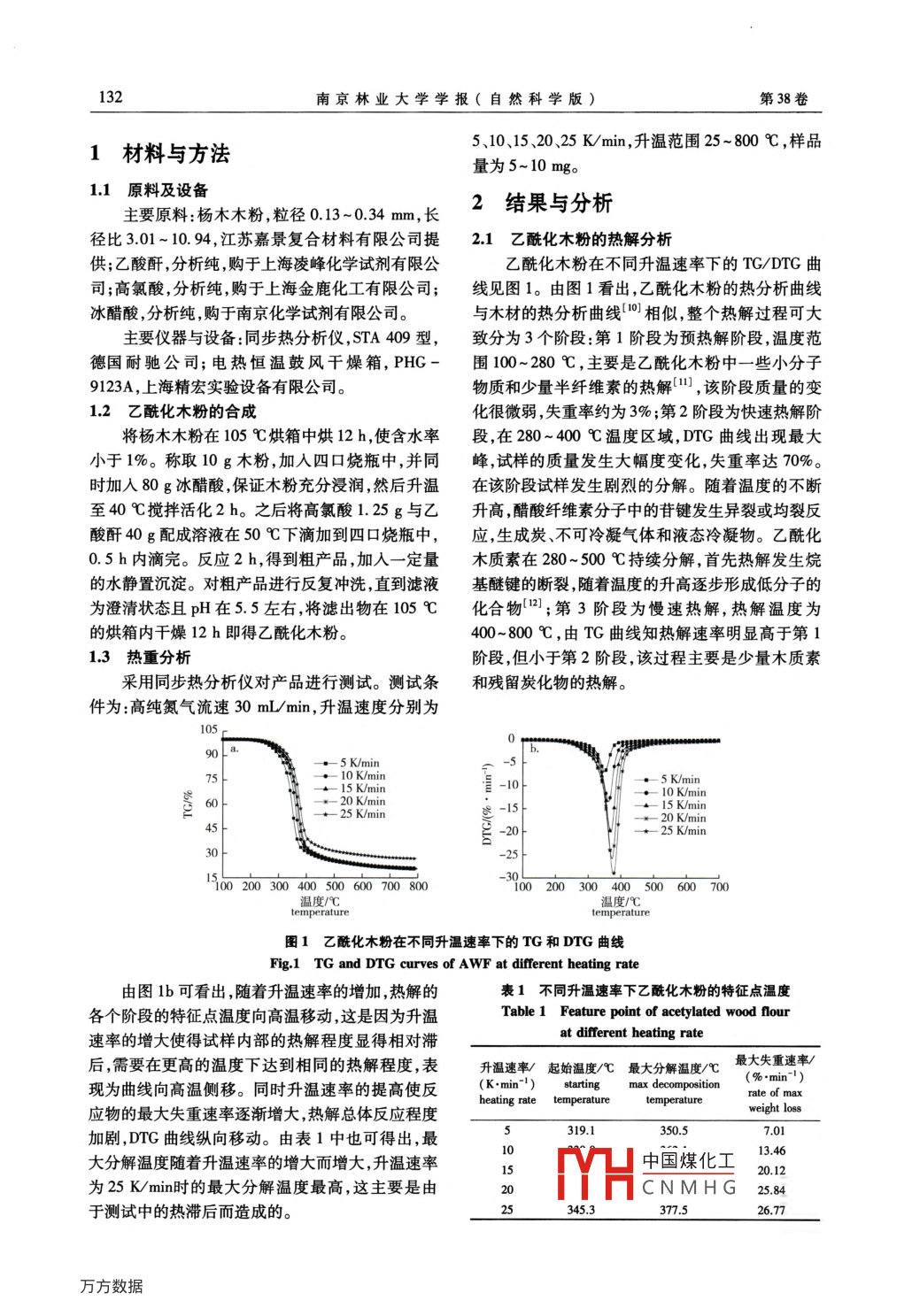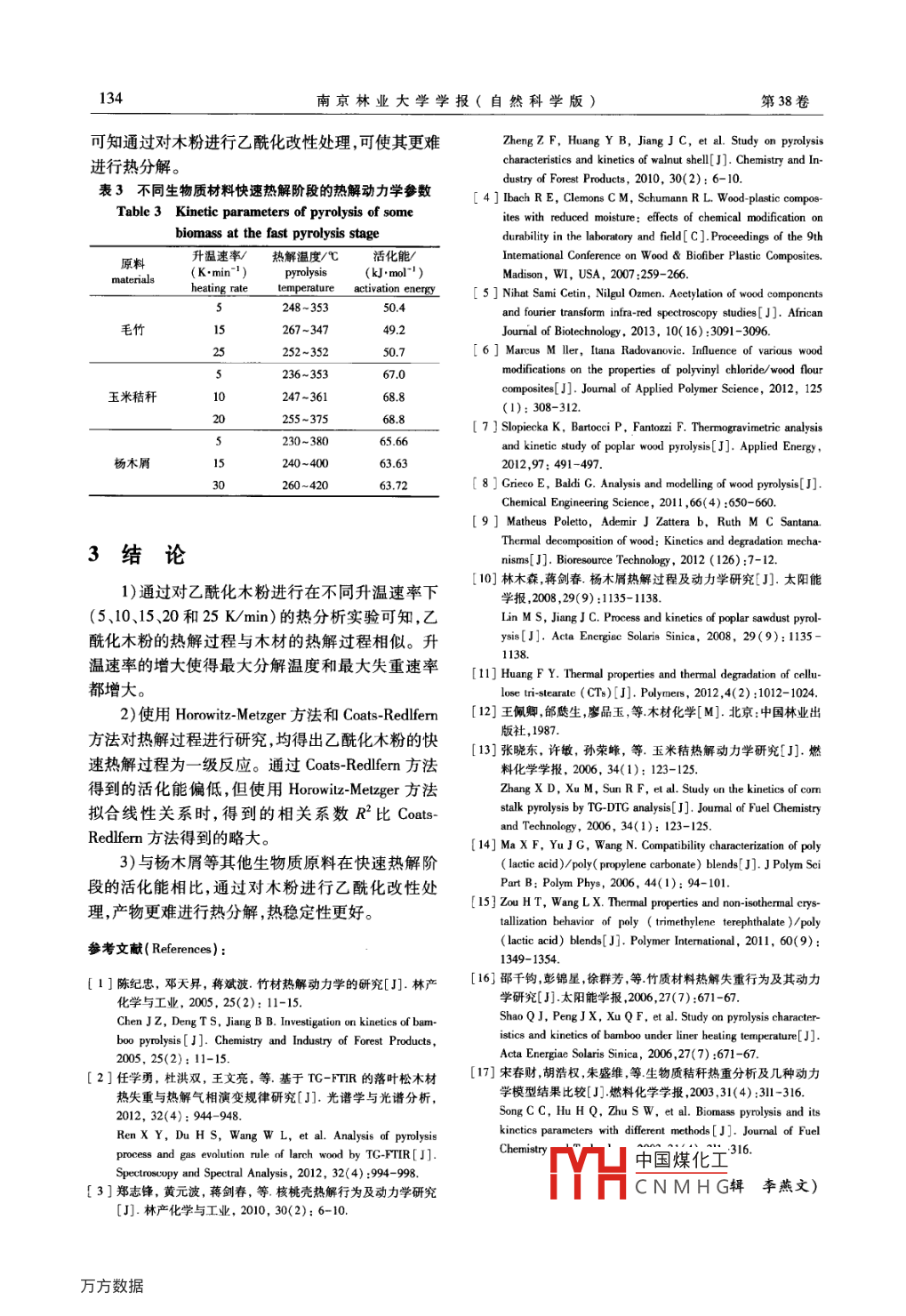 第38卷第4期南京林業(yè)大學(xué)學(xué)報(bào)(自然科學(xué)版)Vol 38. No 42014年7月Journal of Nanjing Forestry University( Natural Sciences Edition)Jul.,2014doi:10.3969/jin.1000-20062014.04.025乙酰化木粉的熱解動(dòng)力學(xué)研究謝振華1,張明明,金立維1,2(1中國(guó)林業(yè)科學(xué)研究院林產(chǎn)化學(xué)工業(yè)研究所,生物質(zhì)化學(xué)利用國(guó)家工程實(shí)驗(yàn)室,國(guó)家林業(yè)局林產(chǎn)化學(xué)工程重點(diǎn)開(kāi)放性實(shí)驗(yàn)室,江蘇省生物質(zhì)能源與材料重點(diǎn)實(shí)驗(yàn)室,江蘇南京210042;2中國(guó)林業(yè)科學(xué)研究院林業(yè)新技術(shù)研究所,北京100091)摘要:利用熱重分析儀在升溫速率分別為5、10、15、20和25K/min的條件下對(duì)乙?;痉圻M(jìn)行熱解研究,利用Horowitz-Metzger和Coas- Redfern兩種不同的動(dòng)力學(xué)模型對(duì)乙?;痉圻M(jìn)行熱解動(dòng)力學(xué)分析。結(jié)果表明:乙酰化木粉的熱解過(guò)程主要分為預(yù)熱解、快速熱解和慢速熱解3個(gè)階段,其中快速熱解階段失重率可達(dá)70%。對(duì)實(shí)驗(yàn)數(shù)據(jù)進(jìn)行回歸擬合,結(jié)果顯示快速熱解過(guò)程是一級(jí)反應(yīng)。由兩種模型計(jì)算所得的活化能數(shù)值不同,但是總體變化趨勢(shì)基本相同。與其他一些生物質(zhì)材料的熱解參數(shù)對(duì)比可知乙?;痉鄹y被熱分解。關(guān)鍵詞:乙?;痉?熱解動(dòng)力學(xué);活化能;生物質(zhì)材料中圖分類(lèi)號(hào):TQ352文獻(xiàn)標(biāo)志碼:A文章編號(hào):1000-2006(2014)04-0131-04Study on pyrolysis kinetics of acetylated wood flourXIE Zhenhua, ZHANG Mingming, JIN Liwei(1. Institute of Chemical Industry of Forestry Products, CAF; National Engineering Lab. for Biomass Chemical Utilization;Key and Open Lab. on Forest Chemical Engineering, SFA; Jiangsu Provincal Key Lab of Biomass Energy and MaterialNanjing 210042, China; 2. Institute of Forest New Technology, CAF, Beijing 100091, China)Abstract:The pyrolysis characteristics of acetylated wood flour(AWF)were studied at different heating rates(5, 1015, 20 and 25 K/min)by thermogravimetric analysis, and the pyrolysis kinetics was studied by Horowitz-Metzger andCoats-Redlfern. The result showed that the pyrolysis process of AWF included pre-pyrolysis, fast pyrolysis and slow pyrol-ysis. The percentage of loss weight of AWF at fast pyrolysis stage reached 70%. The experiment data regressed by twodifferent models illuminated the fast pyrolysis process was a first-order reaction. Activation energy values calculated byh model were different, but the overall trend was almost the same It was showed that a WF decomposed less thasome other biomass materials by contrasting their pyrolysis parameters.Key words: acetylated wood flour(AWF); pyrolsis kinetics; activation energy biomass materials熱解動(dòng)力學(xué)特性直接關(guān)系到生物質(zhì)熱化學(xué)利用壽命和擴(kuò)大使用范圍“。用。通過(guò)生物質(zhì)熱解動(dòng)力學(xué)分析可深入地了解反對(duì)木粉進(jìn)行乙?;男蕴幚硪鹆吮姸鄬W(xué)者應(yīng)過(guò)程或機(jī)理,還可預(yù)測(cè)反應(yīng)速率以及反應(yīng)的難易的關(guān)注6。對(duì)乙?;痉圻M(jìn)行熱解及分析其熱程度-。木粉主要由纖維素、半纖維素和木質(zhì)素分解機(jī)理,對(duì)木粉推廣使用具有十分重要的作用。組成,由于含有大量的羥基使得其極性很強(qiáng)。大量當(dāng)前有關(guān)木材的熱解動(dòng)力學(xué)研究較多9,但是關(guān)的木粉用于制備木塑復(fù)合材料,而木塑復(fù)合材料的于乙?;痉鄣臒峤庋芯繄?bào)道較少。另一成分一般都是弱極性或者非極性的塑料,使得筆者利用熱重分析儀在高純氮?dú)獾姆諊卵心痉叟c塑料之間的極性相差較大。通過(guò)乙?;木苛艘阴;痉墼诓煌郎厮俾氏碌臒峤鈩?dòng)力學(xué)性處理可以使木粉中大量的羥基被乙?;〈袨?用兩種不同的動(dòng)力學(xué)模型對(duì)其熱解動(dòng)力學(xué)進(jìn)從而降低其極性和親水性,延長(zhǎng)木塑復(fù)合材料的使行了研究。收稿日期:2013-06-19修回日期:2013-12-07基金項(xiàng)目:國(guó)家林業(yè)公益性行業(yè)科研重大專(zhuān)項(xiàng)項(xiàng)目(201104004)V凵中國(guó)煤化工第一作者:謝振華,碩士生。*通信作者:金立維副研究員,博士。E-mail: liwei-jinCNMHG引文格式謝振華,張明明,金立維.乙?;痉鄣臒峤鈩?dòng)力學(xué)研究[J].南京林業(yè)大學(xué)學(xué)報(bào):自然科學(xué)版,2014,38(4):131-134132南京林業(yè)大學(xué)學(xué)報(bào)(自然科學(xué)版)第38卷1材料與方法5、10、15、2025K/min,升溫范圍25~800℃,樣品量為5~10mgc1.1原料及設(shè)備主要原料楊木木粉粒徑013-034m,長(zhǎng)2結(jié)果與分析徑比301~10.94,江蘇嘉景復(fù)合材料有限公司提21乙?;痉鄣臒峤夥治龉?乙酸酐,分析純,購(gòu)于上海凌峰化學(xué)試劑有限公乙?;痉墼诓煌郎厮俾氏碌?TG/DTG曲司;高氯酸,分析純,購(gòu)于上海金鹿化工有限公司;線見(jiàn)圖1。由圖1看出,乙?;痉鄣臒岱治銮€冰醋酸,分析純,購(gòu)于南京化學(xué)試劑有限公司。與木材的熱分析曲線相似,整個(gè)熱解過(guò)程可大主要儀器與設(shè)備:同步熱分析儀,STA409型,致分為3個(gè)階段:第1階段為預(yù)熱解階段,溫度范德國(guó)耐馳公司;電熱恒溫鼓風(fēng)干燥箱,PHC-圍100~280℃,主要是乙?;痉壑幸恍┬》肿?123A,上海精宏實(shí)驗(yàn)設(shè)備有限公司。物質(z