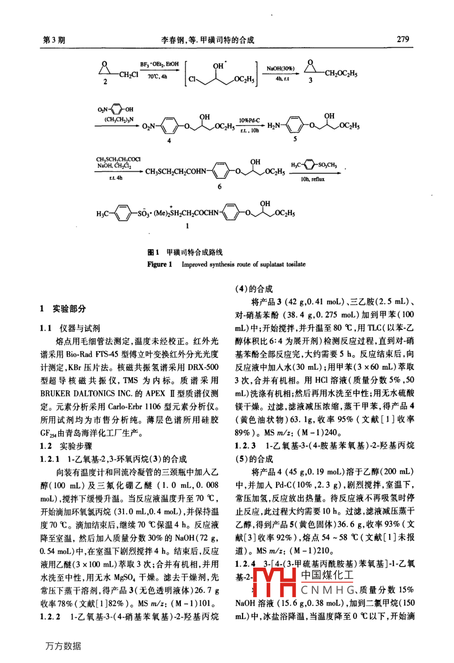 廣東藥學(xué)院學(xué)報(bào)278Joumal of Guangdong Pharmaceutical College Jun. 2009 ,25(3)甲磺司特的合成李春鋼,劉英,劉艷敏,賈征,董卓(唐山職業(yè)技術(shù)學(xué)院臨床醫(yī)學(xué)系,河北唐山063000)摘要:目的優(yōu)化甲磺司特合成路線及工藝條件,使其適合工業(yè)生產(chǎn)。方法以環(huán)氧氯丙烷為起始原料經(jīng)過醚化和環(huán)合“一鍋法”、再醚化催化氫化、?;?、成鹽5步反應(yīng)合成了甲磺司特。結(jié)果合成得到目標(biāo)產(chǎn)物,純度大于99% ,總收率37.2% .產(chǎn)物經(jīng)MS.'H-NMR JIR、元素分析等方法確證了結(jié)構(gòu)。結(jié)論與文獻(xiàn)報(bào)道的路線相比,本研究較詳細(xì)考察了合成工藝,摸索出了最佳的投料方式,優(yōu)化了原料配比,縮短了反應(yīng)時(shí)間,簡(jiǎn)化了合成工藝。關(guān)鍵詞:甲磺司特;環(huán)氧氯丙烷;支氣管哮喘中圖分類號(hào):R914文獻(xiàn)標(biāo)識(shí)碼:A 文章編號(hào) :1006 - 8783(2009)03 -0278 -03Synthesis of suplatast tosilateLI Chun. gang, LIU Ying,LIU Yan-min ,JIA Zheng,DONG Zhuo(Tangshan Vocational Technical College, Tangshan, Hebei 063000 , China)Abstract : Objective To optimize the synthetic route of suplatast tosilate to make it suitable for industrialproduction. Methods Epichlorohydrin was used as staring malerial and adopted bhydrocarbylation andcyclization by one .po method ,ollowed with re-hydrocarbylation , catalytic hydrogenation , acylation , and saltformation to afford suplatast tosilate. Results The target compound was synthesized , with its purity morethan 99 % and the total yield of 37.2 %. The structure of the product was elucidated by MS,' H-NMR,IRand elemental analysis. Conclusion Compared with the synthesis route that had been reported in theliterature , the syntheais route in this study was optimized by exploration of optimization of the Molar ratio ofraw materials , shortening of the reaction time , and simplification of synthesis route.Key words :suplatast tosilate; epichlorohydrin; bronchial asthma甲磺司特(1 , suplatast tosilate, ST),化學(xué)名:[1]以環(huán)氧氯丙烷為起始原料經(jīng)過醚化、環(huán)合、再醚(士)-(2-(4-( 3-乙氧基2-羥基丙氧基)苯基氨基甲.化肼解還原、?;⒊甥}等6步反應(yīng)合成ST,總收酰)乙基)二甲基锍對(duì)甲苯磺酸鹽",是日本大鵬率 38. 8% ,優(yōu)點(diǎn)是反應(yīng)周期較短,條件溫和易控制,(Taiho)制藥公司開發(fā)的選擇性Th2細(xì)胞因子抑制不足之處是還原反應(yīng)所用的水合肼毒性較大,不利劑,于1995年在日本上市。本藥可明顯抑制支氣管于工業(yè)生產(chǎn);文獻(xiàn)[3]以環(huán)氧氯丙烷、對(duì)硝基苯酚為壁中嗜酸性細(xì)胞的產(chǎn)生,臨床用于治療過敏性疾病起始原料經(jīng)過醚化、氫化還原:?;?、成鹽6步反應(yīng)如支氣管哮喘、特應(yīng)性皮炎、過敏性鼻炎2]。合成ST,總收率37.4%,其中成鹽反應(yīng)在室溫條件文獻(xiàn)報(bào)道的甲磺司特合成路線有兩條:文獻(xiàn)下需反應(yīng)5 d,反應(yīng)周期較長(zhǎng)。本文以文獻(xiàn)[1]路線為主、參考文獻(xiàn)[3]路線的氫化還原反應(yīng),將醚化和環(huán)合兩步反應(yīng)合并為一步,收稿日期:2009 -02 -25;修回8期:2009 -04 -30作者簡(jiǎn)介:李春鋼(1966 - ) ,男(漢族) ,講師.碩士,主要從事采用中國煤化工驟的工藝條件、原藥物合成研究, Email: lchungang@ sohu. com。料醞|YHC NMH G成了1(見圖1)。第3期李春鋼,等.甲磺司特的合成279RBF;"OEL. EIOHOH°NaOH(30%)-CH2OC2Hs-CH2C1 70C,4hau人OCHs4.t 3ONC )OHQH(CH,CH2)NOH o 10%PL.C .O2N-o 0CHs-t.10 H2N-a ,OC2Hs5CH,SCH2CH2COC1OHHc >-SOQ.CH,NaOH, CH.C2+ CHqSCH2CH2COHN-OCHs比4h10b, rethuxQIHzC- h-sO3. (Me)2SH2CH2COCHNo人OC2Hs圖1 甲磺司特合成路線Figure 1 Improved synthesis route of suplatast toilate(4)的合成將產(chǎn)品3 (42 g,0.41 moL) 、三乙胺(2.5 mL)、1實(shí)驗(yàn)部分對(duì)-硝基苯酚(38.4 g,0. 275 moL)加到甲苯( 1001.1 儀器與試劑mL)中;開始攪拌,并升溫至80 C ,用TLC(以苯乙熔點(diǎn)用毛細(xì)管法測(cè)定,溫度未經(jīng)校正。紅外光醇體積比6:4為展開劑)檢測(cè)反應(yīng)過程,直到對(duì)-硝譜采用Bio-Rad FTS45型傅立葉變換紅外分光光度基苯酚全部反應(yīng)完,大約需要5 h。反應(yīng)結(jié)束后,向計(jì)測(cè)定,KBr壓片法。核磁共振氫譜采用DRX-500反應(yīng)液中加人水(30 mL) ;用甲苯(3 x60 mL)萃取型超導(dǎo)核磁共振儀, TMS為內(nèi)標(biāo)。質(zhì)譜采用3次,合并有機(jī)相。用HCl溶液(質(zhì)量分?jǐn)?shù)5% ,50BRUKER DALTONICS INC.的APEX II 型質(zhì)譜儀測(cè)mL)洗滌有機(jī)相;然后再用水洗至中性;用無水硫酸定。元素分析采用Carlo-Erbr 1106型元素分析儀。鎂干燥。過濾,濾液減壓濃縮,蒸干甲苯,得產(chǎn)品4所用試劑均為市售分析純。薄層色譜所用硅膠(黃色油狀物)63.1g, 收率95%(文獻(xiàn)[1]收率GFzs4由青島海洋化工廠生產(chǎn)。89%)。MS m/z; (M-1)240。.1.2 實(shí)驗(yàn)步驟1.2.3 1-乙 氧基-3-(4-胺基苯氧基)-2-羥基丙烷.1.2.1 1-乙氧基-2 ,3-環(huán)氧丙烷(3)的合成(5)的合成向裝有溫度計(jì)和回流冷凝管的三頸瓶中加入乙將產(chǎn)品4 (45 g,0. 19 moL)溶于乙醇(200 mL)醇(100 mL)及三氟化硼乙醚(1.0 mL,0. 008中,并加入Pd-C( 10% ,2.3 g),劇烈攪拌,室溫下,moL) ,攪拌下緩慢升溫。當(dāng)反應(yīng)液溫度升至70 C,常壓加氫,反應(yīng)放出熱量。待反應(yīng)液不再吸氫時(shí)停開始滴加環(huán)氧氯丙烷(31.0 mL,0.4 moL) ,并保持溫止反應(yīng),此過程大約需要10 h。過濾,濾液減壓蒸干度70 C。滴加結(jié)