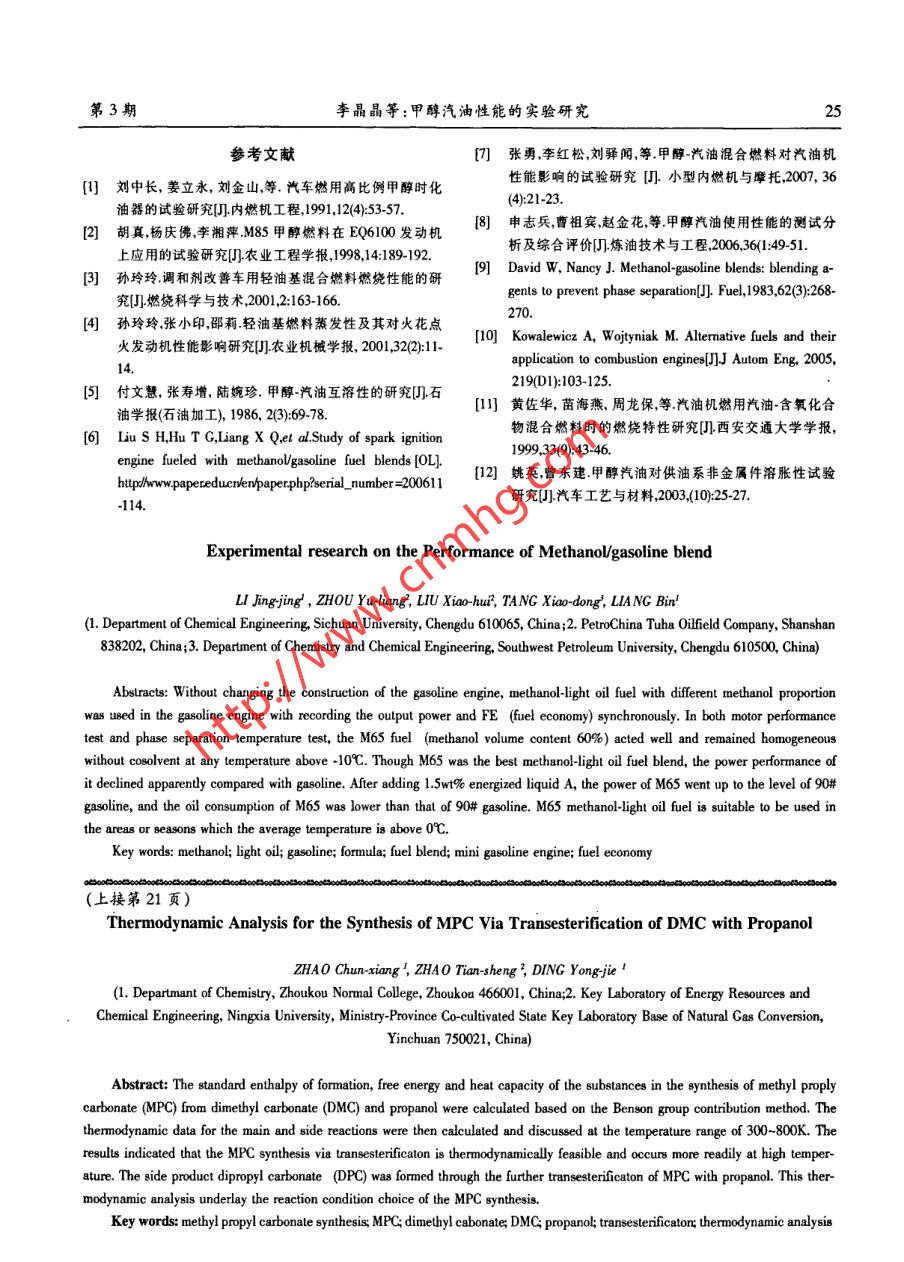 22天然氣化工2008年第33卷甲醇汐油性能的實(shí)驗(yàn)研究李晶晶,周郁良",劉曉輝”,唐曉東”,梁斌'(1.四川大學(xué)化學(xué)工程學(xué)院,成都610065;2.中國(guó)石油吐哈油田分公司,新疆鄯善838202;3.西南石油大學(xué)化學(xué)化工學(xué)院,成都610500)摘要:在未調(diào)整汽油機(jī)結(jié)構(gòu)的前提下,開展了燃用不同摻燒比的甲醇-輕烴汽油對(duì)發(fā)動(dòng)機(jī)輸出功率及燃油經(jīng)濟(jì)性影響的研究,并進(jìn)行了混合燃料的相分離溫度實(shí)驗(yàn)。結(jié)果表明,M65(甲醇體積含量為65%)甲醇汽油既能使發(fā)動(dòng)機(jī)穩(wěn)定運(yùn)行,又可在?10C以上保持均一相,無助溶劑添加;但與90#汽油相比,其動(dòng)力性下降明顯。向M65中舔加1.5%(質(zhì)量分?jǐn)?shù))的增能劑A后,該燃油的動(dòng)力性提高到了90*汽油的水平,且油耗量(當(dāng)量汽油)優(yōu)于90汽油,適宜在最低氣溫商于-5C的地區(qū)或季節(jié)使用。關(guān)鍵詞:甲醇;輕烴;汽油;配方;混合燃料;小型汽油機(jī);燃料經(jīng)濟(jì)性中團(tuán)分類號(hào):TQ 038.1文獻(xiàn)標(biāo)識(shí)碼:A文章編號(hào)1001-9219(200803-22-04醇類被認(rèn)為是最具應(yīng)用前景的內(nèi)燃機(jī)燃油替本研究的目的所在。本文提出將高揮發(fā)性輕烴組分代燃料之-一。醇類燃料主要指甲醇、乙醇,雖然乙醇(性能與70*汽油相近)與甲醇混合,利用輕烴組分已在我國(guó)部分省市進(jìn)行封閉式推廣,但由于以陳化的易揮發(fā)性幫助甲醇燃料啟動(dòng)和穩(wěn)定運(yùn)行;同時(shí)甲糧、玉米等糧食作生產(chǎn)原料,大規(guī)模生產(chǎn)將影響到醇的高辛烷值特性和高含氧特性又可彌補(bǔ)輕烴辛我國(guó)的糧食安全。與乙醇相比,甲醇生產(chǎn)原料主要烷值的不足,并提高燃燒效率。是天然氣和煤,更適合我國(guó)國(guó)情,具有更好的經(jīng)濟(jì)1實(shí)驗(yàn)部分性。但受甲醇蒸發(fā)潛熱大,與汽油互溶性差等因素的影響,甲醇的摻燒比例- -般小于<15%(體積比),也有1.1 試驗(yàn)原料人研究M85以上的甲醇燃料,但需要對(duì)發(fā)動(dòng)機(jī)構(gòu)造甲醇由川西北氣礦甲醇廠提供,工業(yè)級(jí),規(guī)格:作較大改動(dòng),且改裝后不再適用于汽油燃料購(gòu),不便99.7% ;油田輕烴由吐哈油田公司提供;增能劑、緩于推廣。因此,在維持現(xiàn)有發(fā)動(dòng)機(jī)構(gòu)造條件下,如何蝕劑自制;90*汽油市售。既提高甲醇摻燒量,又保證油品質(zhì)量和燃燒性能是1.2主要試驗(yàn)設(shè)備表1輕烴、甲醇和汽油主要理化性質(zhì)比較網(wǎng)Table 1The comparison of physicochemical propertyamong light oil, methanol and gasoline性質(zhì)輕烴汽油甲醇相對(duì)密度/g/cm'0.65-0.700.70-0.790.793「蒸汽壓(Reid)kPa-10060-90(冬季)34.7RrOR:45-~70(夏利)8佛點(diǎn)/C .34-14025-20564.70廠汽化潛熱/~J/kg~395~380R,q R.d低熱值MJ/kg42.043.520.0理論空燃比hg/kg14.6-15.16.451-gasoline engine generator, 2-gasoline tank; 3-mehanolight辛烷值(RON)65~7084~97112il gas blend tank; 4,5-changover valve; 6,7-oil quantityindicator; 8-gate valve of generator' 8 output circuit; 9,10-power收稿8期:2008-01-22;基金項(xiàng)目:中國(guó)石油吐哈油田公司項(xiàng)switch; R, Rs, R, R-0W, 100W or 200W dismountable loads目資助(JC050520074);作者簡(jiǎn)介:李晶晶(1982-),女,博士圄1小型汽油發(fā)電機(jī)試驗(yàn)裝置生,電郵ljingjing1216@gmail.com;*聯(lián)系人:電話028-Fig.1 Experimental apparatus of mini gasoline engine88117829 ,郵箱tdx3079@163.com。generation test第3期李晶晶等:甲醇汽油性能的實(shí)驗(yàn)研究23小型汽油發(fā)電試驗(yàn)裝置(見圖1),自建。汽油機(jī)1000 |900 0W第3二0.0-0000舞型號(hào)為ZSQF1.0A,單缸,四沖程,壓縮比為8:1,發(fā)800 I電機(jī)最大功率800W,重慶宗申通用動(dòng)力機(jī)械公司700 I; 600生產(chǎn)。實(shí)驗(yàn)方法采用原機(jī)械工業(yè)部頒布的JB3743-84《汽車發(fā)動(dòng)機(jī)性能試驗(yàn)方法》。400甲醇汽油相分離溫度試驗(yàn)方法參照文獻(xiàn)問,冷卻300200裝置為上海陽德石油儀器制造公司生產(chǎn)的SYP1022-I石油產(chǎn)品傾點(diǎn)濁點(diǎn)凝點(diǎn)冷濾點(diǎn)試驗(yàn)器。01020304050607080 90甲醇體積分?jǐn)?shù)%2實(shí)驗(yàn)結(jié)果與討論圖3 甲醇添加量對(duì)燃料經(jīng)濟(jì)性的影響2.1甲醇汽油的動(dòng)力性和油耗的實(shí)驗(yàn)對(duì)比Fig.3 Elfect of the methanol volume content on the e發(fā)動(dòng)機(jī)各參數(shù)不變,考察不同甲醇含量的甲醇conomy of blend fuel汽油輸出功率以及油耗量情況,實(shí)驗(yàn)結(jié)果如圖2.3 22 甲醇輕烴互溶性實(shí)驗(yàn)所示。實(shí)驗(yàn)中汽油箱和甲醇汽油箱均保溫在25C(保證甲醇~輕烴混合燃料為均-相)。實(shí)驗(yàn)發(fā)現(xiàn)燃用M70(甲醇體積含量占總?cè)剂象w積的70%)以下的甲醇汽油,小型汽油機(jī)工作正常,-50 5 101520253035 404550556065 70758085 90當(dāng)甲醇體積含量大于70%時(shí),發(fā)動(dòng)機(jī)工作變粗暴,高負(fù)荷下發(fā)動(dòng)機(jī)工作極不穩(wěn)定,燃用M85以上的甲罘-15-20醇汽油時(shí)甚至出現(xiàn)發(fā)動(dòng)機(jī)熄火。從試驗(yàn)數(shù)據(jù)看出隨著甲醇添加量的增加,在高負(fù)荷下汽油機(jī)的輸出功甲醇體職含慧/%率有所下降,而在低負(fù)荷下燃料的油耗量增加明圍4甲醇體積含量對(duì)燃料相分離溫度的影響顯。這是由于甲醇的熱值低,且蒸發(fā