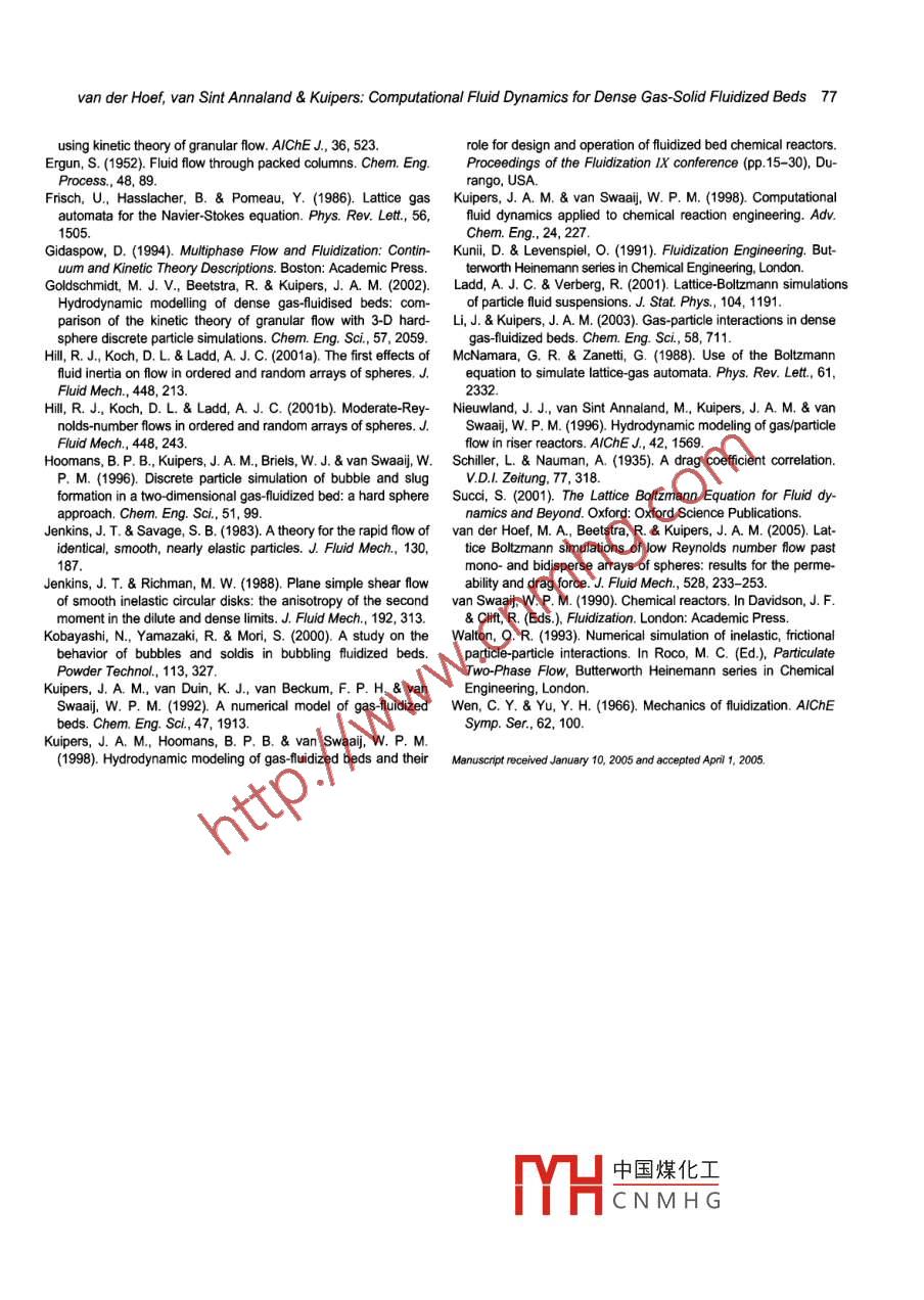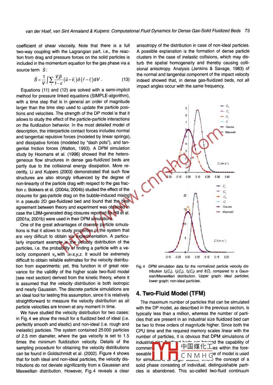 CHINA PARTICUOLOGY Vol. 3, Nos. 1- -2, 69-77, 2005COMPUTATIONAL FLUID DYNAMICS FOR DENSE GAS-SOLIDFLUIDIZED BEDS: A MULTI-SCALE MODELING STRATEGYM. A. van der Hoef, M. van Sint Annaland and J. A. M. Kuipers*Department of Science & Technology, University of Twente, 7500 AE Enschede, The Netherands"Author to whom correspondence should be addressed. E-mail: j.a.m.kuipers@utwente.nlproduction of fuels, frilizers and base chemicals. The scale-up of these processes is often problematic and is related tothe intrinsic complexities of these flows which are unfortunately not yet flly understood despite signifcant efrts made inboth academic and industial research laboratories. In dense gas-particle flows both (fectve) fuid-paricle and (issipative) paricle-particle interactions need to be accounted for because these phenomena to a large extent govern theprevailing flow phenomena, i.e. the formation and evolution of heterogeneous structures. These structures have signif-cant impact on the quality of the gas solid contact and as a direct consequence thereof strongly affect the performance ofthe process. Due to the inherent complexity of dense gas particles flows, we have adopted a multi-scale modeling ap-proach in which both fuid-particle and particle-particle interactions can be properly accounted for. The idea is essentiallythat fundamental models, taking into account the relevant details of fluid-particle (attice Boltzmann model) and parti-cle- particle (discrete particle model) interactions, are used to develop closurelaws to feed continum models which canbe used to compute the flow structures on a much larger (industrial) scale. Our multi-scale approach (see Fig. 1) involvesthe lttie Boltzmann model, the discrete particle model, the continuum model based on the kinetic theory of granular flow,and the discrete bubble model. In this paper we give an overview of the multi-scale modeling strategy, accompanied byilustrative computational results for bubble formatin. In aditin, areas which need substantial further atetion will behighlighted.Keywords dense gas- solid flow, gas-luidized beds, multi-scale modelling1. Introductionelementary physical principles such as drag, friction andDense gas-particle flows are frequently encountered in adissipation (i) based on this insight, develop models withvariety of industrially important gas-solid contactors, ofpredictive capabilties for dense gas-particle flows en-countered in engineering scale equipment. To this end, wewhich the gas-fuidized bed can be mentioned as a veryconsider gas solid flows at four distinctive levels of mod-important example. Due to their favorable mass and heattransfer characteristics, gas-fluidized beds are often ap-At the most detailed level of description the gas flow fieldplied in the chemical, petrochemical, metallurgical, envi-is modeled at scales smaller than the size of the solid par-ronmental and energy industries in large scale operations tcles. The iteraction of the gas phase with the solid phaseinvoling i.e. coating, granulation, drying, and synthesis of is incorporated by imposing "stick* boundary conditins atfuels and base chemicals (Kuni & Levenspiel, 1991). Lackthe surface of the solid particles. This model thus alows usof understanding of the fundamentals of dense gas-particleto measure the effective momentum exchange betweenflows, and in particular of the effects of gas-particle dragthe two phases, which can be used in the higher scaleand particle-particle interations (Kuipers et al, 1998;models. In our model, the flow field between sphericalKuipers & van Swaaij, 1998), has led to severe dificultiesparticles is solved by the latice Bolzmann model (Succi,in the scaleup of these nustily important gas-soid 2001; Ladd & Verberg, 200) although in principle othercontactors (van Swaij, 1990). To arrive at a better under-methods (such as standard computational fluid dynamics)standing of these complicated systems in which bothcould be used as well. At the intermediate level of descrip-gas-particle and priclpartcle iteractions play a domi- tion the Aow feld is modeled at a scale larger than the sizenant role, computer models have become an indispensa-of the particles, where a grid cell typically containsble tool. However, the prime difculty with modeling0(10)~0(10) particles, which are assumed to be perfectgas-fluidized beds is the large separation of scales: thespheres (diameter d), This model consists of two parts: alargest flow structures can be of the order of meters; yetLagrangian code for updating the positions and velocitiesthese structures are found to be directly infuenced byof the solid particles from Newton's law, and a Euleriandetails of the particle-particle collisions, which take placecode for Jndatina the local aas densitv and velocity fromon the scale of millimeters or less. Therefore, we havethe Navi中國(guó)煤化工et al, 1996). The :adopted a muti-level modeling strategy (see Fig. 1), withadvantag_Jel (DPM) is that itthe prime goal to () obtain a fundamental insight in thecan accMHCN M H Gie-partitle itera-complex dynamic behavior of dense gas-particle fluidized tions in a realistic manner, for system sizes of about 0(10")suspensions; that is, to gain an understanding based on particles, which is sufcienty large to llow for a direct70CHINA PARTICUOLOGY Vol. 3, Nos. 1-2, 2005Larger geometryLattice BoltzmannDiscrete ParticleContinuumDiscrete BubbleModelFluid-particleParticle-particleLarge scale motioninteractionIndustrial sizeBubble behavior→Larger scale phenomenaFig. 1 Mutilevel modeling scheme for dense gas-fluidized beds.comparison with laboratory scale experiments. As a logicalHence, in this model both the gas-phase and the solidconsequence of this approach a closure law for the effec-phase are treated on an equal footing, and for both phasestive momentum exchange has to be specified, which canan Eulerian code is used to describe the time evolutionbe obtained from the aforementioned lttice Boltzmann (see