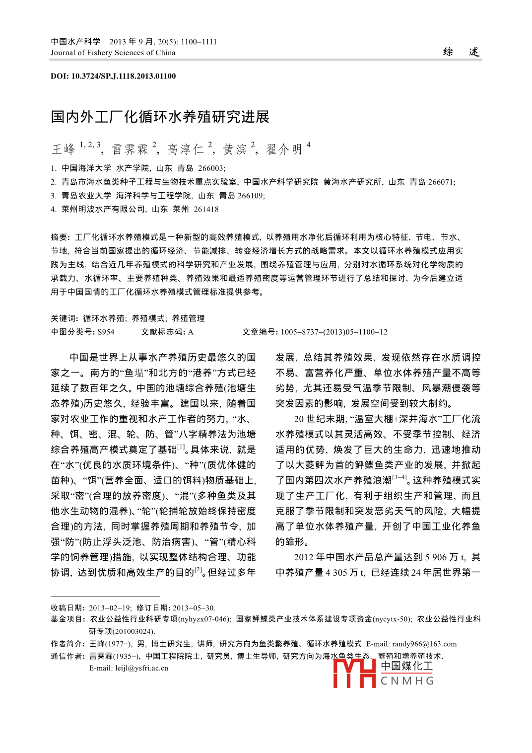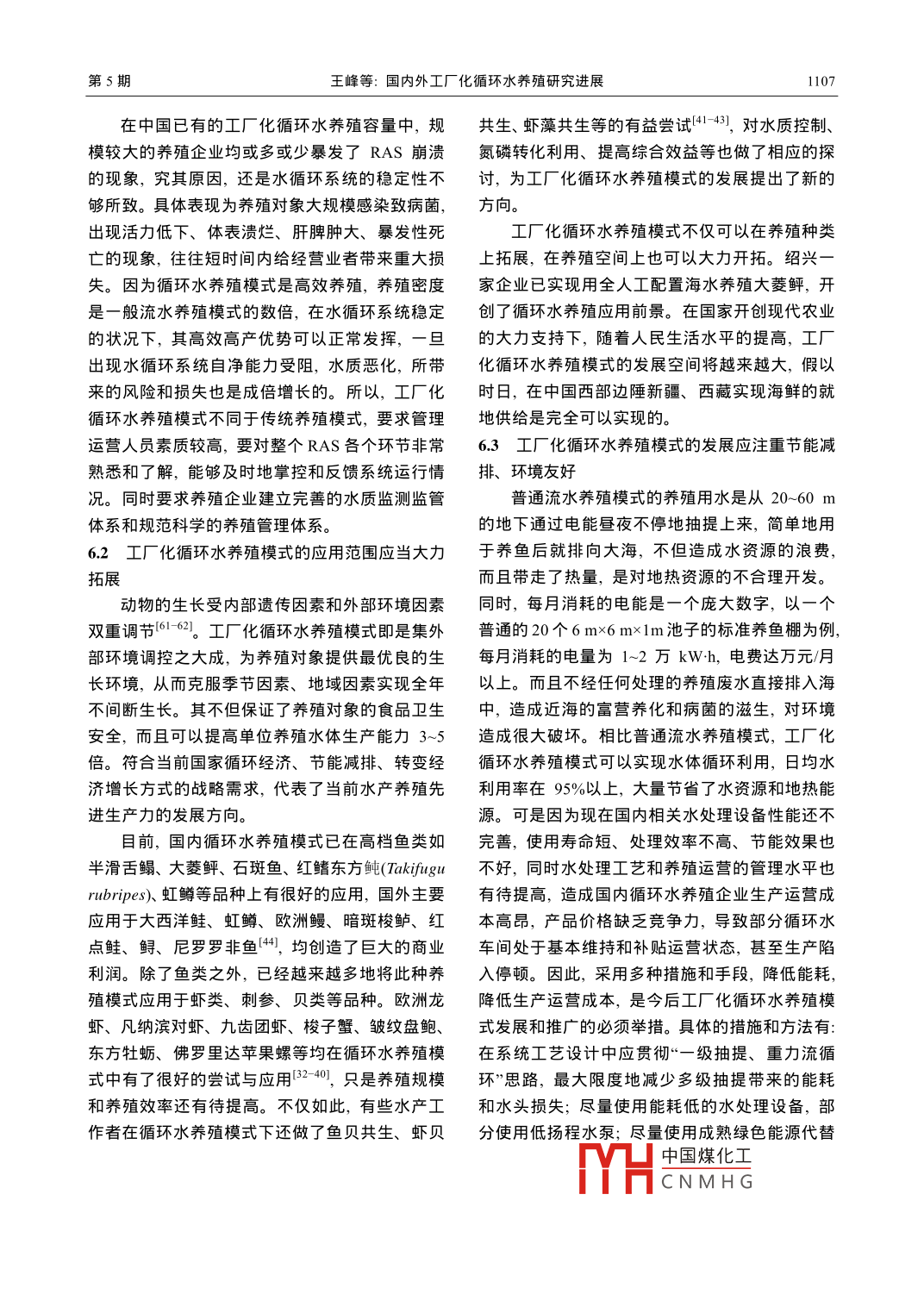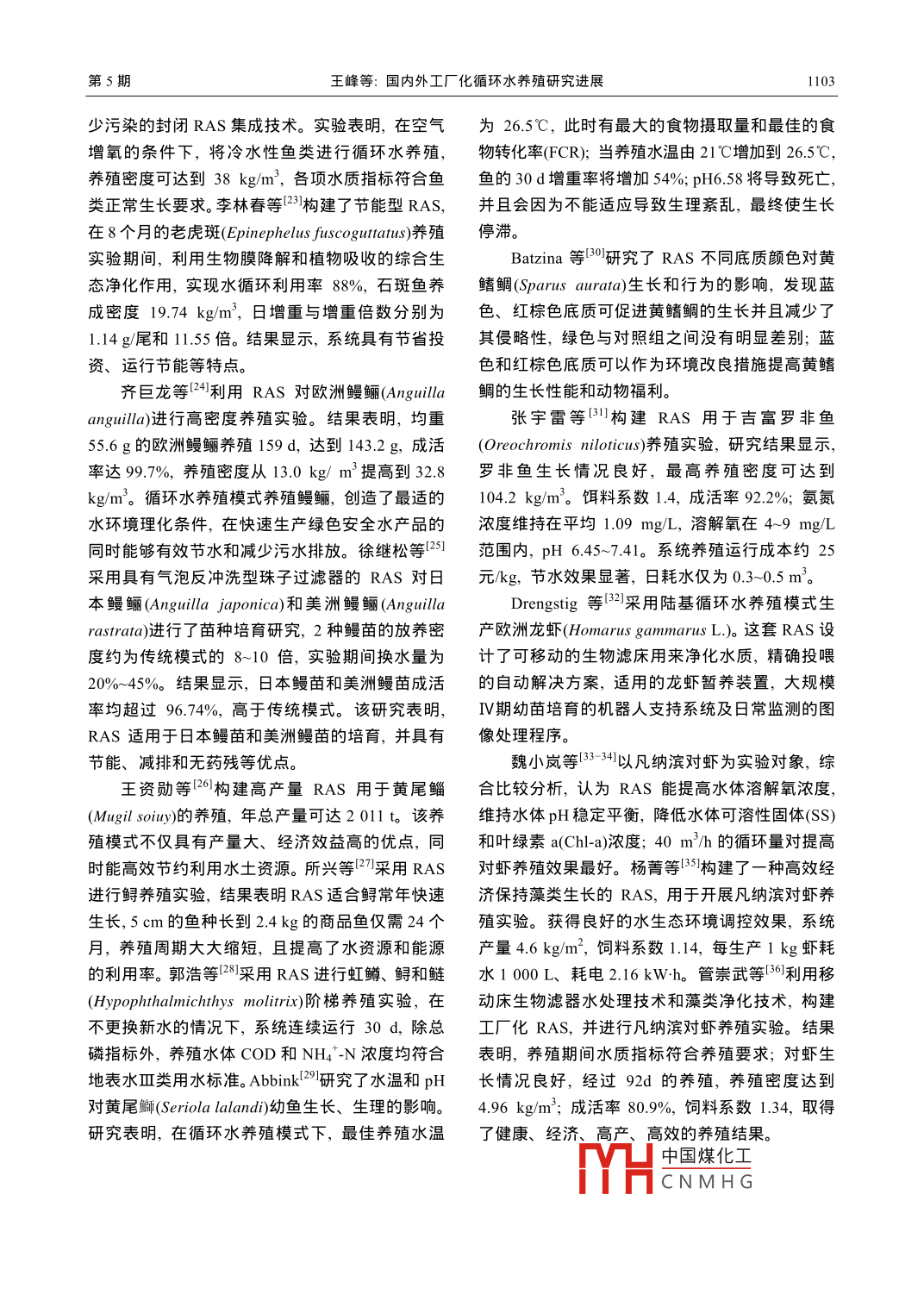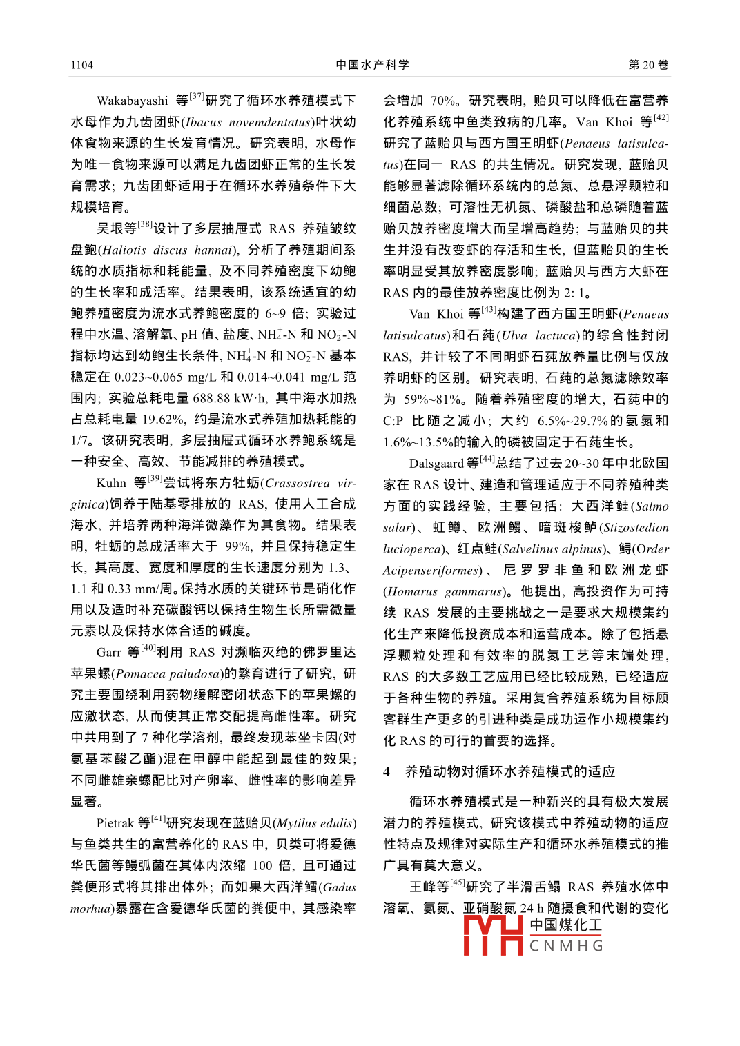 中國水產(chǎn)科學(xué)2013年9月,20(5:1100-1111Journal of Fishery Sciences of China綜述DOI:10.3724/SPJ.1118.2013.01100國內(nèi)外工廠化循環(huán)水養(yǎng)殖研究進展王峰·3,雷霽霖?,高淳仁?,黃濱?,翟介明41.中國海洋大學(xué)水產(chǎn)學(xué)院,山東青島2660032.青島市海水魚類種子工程與生物技術(shù)重點實驗室,中國水產(chǎn)科學(xué)研究院黃海水產(chǎn)研究所,山東青島266071;3.青島農(nóng)業(yè)大學(xué)海洋科學(xué)與工程學(xué)院,山東青島2661094.萊州明波水產(chǎn)有限公司,山東萊州261418摘要:工廠化循環(huán)水養(yǎng)殖模式是一種新型的髙效養(yǎng)殖模式,以養(yǎng)殖用水凈化后循環(huán)利用為核心特征,節(jié)電、節(jié)水、節(jié)地,符合當(dāng)前國家提岀的循環(huán)經(jīng)濟、節(jié)能減排、轉(zhuǎn)變經(jīng)濟増長方式旳戰(zhàn)略需求。本文以循環(huán)水養(yǎng)殖模式應(yīng)用實踐為主線,結(jié)合近幾年養(yǎng)殖模式的科學(xué)研究和產(chǎn)業(yè)發(fā)展,圍繞養(yǎng)殖管理與應(yīng)用,分別對水循環(huán)系統(tǒng)對化學(xué)物質(zhì)的承載力、水循環(huán)率、主要養(yǎng)殖種類、養(yǎng)殖效果和最適養(yǎng)殖密度等運營管理環(huán)節(jié)進行了總結(jié)和探討,為今后建立適用于中國國情的工廠化循環(huán)水養(yǎng)殖模式管理標(biāo)準(zhǔn)提供參考。關(guān)鍵詞:循環(huán)水養(yǎng)殖;養(yǎng)殖模式;養(yǎng)殖管理中圖分類號:S954文獻標(biāo)志碼:A文章編號:1005-8737-(2013)05-1100-12中國是世界上從事水產(chǎn)養(yǎng)殖歷史最悠久的國發(fā)展,總結(jié)其養(yǎng)殖效果,發(fā)現(xiàn)依然存在水質(zhì)調(diào)控家之一。南方的“魚塭”和北方的“港養(yǎng)”方式已經(jīng)不易、富營養(yǎng)化嚴重、單位水體養(yǎng)殖產(chǎn)量不高等延續(xù)了數(shù)百年之久。中國的池塘綜合養(yǎng)殖(池塘生劣勢,尤其還易受氣溫季節(jié)限制、風(fēng)暴潮侵襲等態(tài)養(yǎng)殖)歷史悠久,經(jīng)驗豐富。建國以來,隨著國突發(fā)因素的影響,發(fā)展空間受到較大制約。家對農(nóng)業(yè)工作的重視和水產(chǎn)工作者的努力,水20世紀(jì)末期,“溫室大棚+深井海水”工廠化流種、餌、密、混、輪、防、管”八字精養(yǎng)法為池塘水養(yǎng)殖模式以其靈活高效、不受季節(jié)控制、經(jīng)濟綜合養(yǎng)殖高產(chǎn)模式奠定了基礎(chǔ)山。具體來說,就是適用的優(yōu)勢,煥發(fā)了巨大的生命力,迅速地推動在“水”(優(yōu)良的水質(zhì)環(huán)境條件)、“種”(質(zhì)優(yōu)體健的了以大菱鲆為首的鲆鰈魚類產(chǎn)業(yè)的發(fā)展,并掀起苗種)、“餌”(營養(yǎng)全面、適口的餌料)物質(zhì)基礎(chǔ)上,了國內(nèi)第四次水產(chǎn)養(yǎng)殖浪潮3。這種養(yǎng)殖模式實采取“密”(合理的放養(yǎng)密度)、“混”(多種魚類及其現(xiàn)了生產(chǎn)工廠化,有利于組織生產(chǎn)和管理,而且他水生動物的混養(yǎng))、“輪'(輪捕輪放始終保持密度克服了季節(jié)限制和突發(fā)惡劣天氣的風(fēng)險,大幅提合理)的方法,同時掌握養(yǎng)殖周期和養(yǎng)殖節(jié)令,加高了單位水體養(yǎng)殖產(chǎn)量,開創(chuàng)了中國工業(yè)化養(yǎng)魚強“防”(防止浮頭泛池、防治病害)、“管”(精心科的雛形。學(xué)的飼養(yǎng)管理)措施,以實現(xiàn)整體結(jié)構(gòu)合理、功能2012年中國水產(chǎn)品總產(chǎn)量達到5906萬t,其協(xié)調(diào),達到優(yōu)質(zhì)和高效生產(chǎn)的目的2。但經(jīng)過多年中養(yǎng)殖產(chǎn)量4305萬t,已經(jīng)連續(xù)24年居世界第收稿日期:2013-02-19;修訂日期:2013-05-30.基金項目:農(nóng)業(yè)公益性行業(yè)科研專項( nyhyzx07-046);國家鲆鰈類產(chǎn)業(yè)技術(shù)體系建設(shè)專項資金( nycytx-50);農(nóng)業(yè)公益性行業(yè)科研專項(201003024作者簡介:王峰(1977-,男,博士研究生,講師,研究方向為魚類繁養(yǎng)殖、循環(huán)水養(yǎng)殖模式.E-mai:randy966@l63.com通信作者:雷霽霖(1935-),中國工程院院士,研究員,博士生導(dǎo)師,研究方向為海水魚類生態(tài)、繁殖和增養(yǎng)殖技術(shù)E-mail: leijl@ysfri accn中國煤化工CNMHG第5期王峰等:國內(nèi)外工廠化循環(huán)水養(yǎng)殖研究進展l101位。但經(jīng)過10多年的發(fā)展,隨著養(yǎng)殖規(guī)模的不和較低的餌料轉(zhuǎn)化率,所養(yǎng)對蝦符合無公害水產(chǎn)斷提升,水資源的無節(jié)制利用,流水養(yǎng)殖模式面品要求。 Martins等研究了RAS對養(yǎng)殖用水和尼臨水質(zhì)資源破壞、病害逐年增多、食品安全需求、羅羅非魚( Oreochromis niloticus)組織中重金屬離沿海工業(yè)用地擠壓和國家倡導(dǎo)節(jié)能減排等壓力,子的濃縮效果。研究表明,RAS中As、Fe、Mn其發(fā)展已經(jīng)面臨一個瓶頸,亟待轉(zhuǎn)變。在此基礎(chǔ)Ni和Zn等重金屬離子隨著水交換率的減小而濃上,一種新的養(yǎng)殖模式——工廠化循環(huán)水養(yǎng)殖模度增加;養(yǎng)殖水體中重金屬離子的積累并不會轉(zhuǎn)式應(yīng)運而生。工廠化循環(huán)水養(yǎng)殖模式是以養(yǎng)殖用化為魚類肝和組織中的積累;RAS中單位魚體質(zhì)水凈化后循環(huán)利用為核心特征,節(jié)電、節(jié)水、節(jié)量金屬離子的含量低于人類食用所要求的安全水地,符合當(dāng)前國家提出的循環(