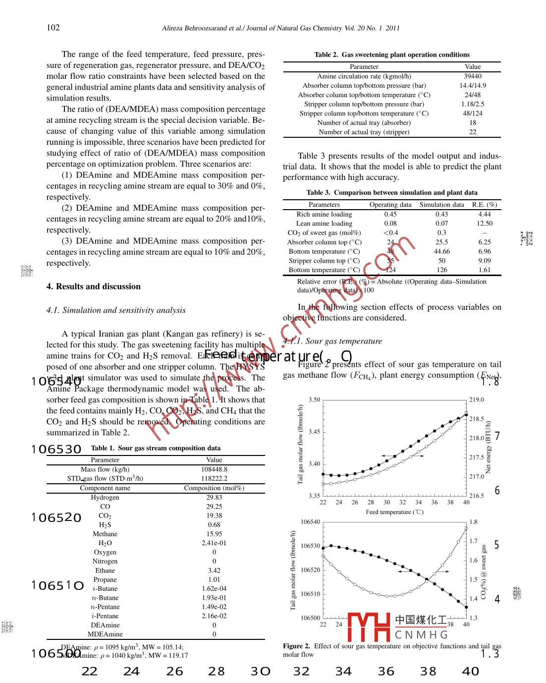 Availableonlineatwww.sciencedirect.comJoumal ofScience DirectNatural GasChemistryELSEVIERJournal of Natural Gas Chemistry 20(2011)99109Multiobjective optimization scheme for industrial synthesis gassweetening plant in GtL processAlireza Behroozsarand 1* Akbar ZamaniyanIslamic Azad Universit IIkhchi branch. P0 Box. 651335-7996. Tabriz ran2. Department of Natural Gas Conversion, Gas Research Division, Research Institute of Petroleum Industry(RIPI), Tehran 14665-1998, IranManuscript received April 9, 2010: revised October 6, 2010 1AbstractIn industrial amine plants the optimized operating conditions are obtained from the conclusion of occurred events and challenges that arenormal in the working units. For the sake of reducing the costs, time consuming, and preventing unsuitable accidents, the optimization couldbe performed by a computer program. In this papsis of amine plant is performed at first. The optimization ofthis unit is studied using Non-dominated sortingl in order produce sweet gas with CO2 mole percentage less than 2.0%and H2S concentration less than 10 ppm for application in, FischeThe simulation of the plant in HYSYS V.3. I software habeen linked with MATLAB code for real-parameterthe amine process. Three scenarios are selected to corthe effect of (DEA/MDEA)mass composition peratctive junctions. Results show that sour gas temperatuand pressure of 3398C and 14.96 bar, DEA/CO2 molar flow ratitemperature and pressure of 94.92C and 3.0 b40regenerator pressure of 1.5 bar, and ratio of DEA/MDEA=20%for minimizing plant energy consumption, aminecirculation rate, and carbon dioxide recovery.Key wordsamine plant; multiobjective optimization; Non-Don ed Softing Genetic Algorithm; amine circulation rate1. Introductionas the base amine with the addition of one or two more reactive amines such as mea or deaNatural and refinery gases contain typically acid gases inThe major advantage of the amine treatment is that it isconcentrations ranging from a few parts per million to tens of widely commercialized technology in which the hydrocarbdrmolume percentage [1]. The major acid gases are hydrogen loss is almost negligible. However, the operating and capsulfide(H2S) and carbon dioxide(CO2). The typical prod- tal costs shoot up very rapidly as the concentration of carbouct is a CH4-enriched residue stream containing less than 2% dioxide in the feed gas increases [21CO2, which is sold as a pipeline fuel [2, 3]. Carbon dioxide,Technology using alkanolamine solutions, or simplewhich falls into the category of acid gases, is highly corrosive amine solutions, for the removal of hydrogen sulfide and carand rapidly destroys pipelines and equipment; it also reduces bon dioxide from natural gas has been around for decadesthe heating value of a natural gas stream and wastes pipeline Since the 1960s and 1970s, several amines have come intoapacity [2, 4]. Acid gas removal and dehydration are the most general use, but there is little information available on whichcommonly employed processes and various technologies are amine is best suited to a particular service. Many inefficientilable to design engineer for these processes [5]. Acid amine gasoptimized bygas removal technologies include absorption with an aqueous changing their amine solutions [7]. Aqueous alkanolaminealkanolamine solution, cryogenic adsorption and membrane solutions are widely used for the removal of acid gasesprocesses [4, 6]. The chemical solvents and physical solvents such as CO2 and H2S from gas streams. Examples ofor combination of these two have been used extensively in ex- such streams include natural gases, synthesis gases from theisting base load LNG facilities. In the past few years, mixed gasification of coal and heavy oils, and tail gases from sulfuramine solvents for the removal of acid gases have received in- plants and petroleum chemical plants. Aqueous solutions ofcreased attention. In most cases, the mixtures contain MDEa alkanolamines reaes and therefore中國(guó)煤化工Corresponding author. Tel: +98(412)3459142: Fax: +98(412)3444355: E-mail: behroozsarandar(@CNMHGCopyright(2011, Dalian Institute of Chemical Physics, Chinese Academy of Sciences. All rights reservedoi:10.1016/S1003-9953(1060153-3100Alireza Behroozsarand et al Journal of Natural Gas Chemistry VoL. 20 No I 2011are widely used to remove them. The alkanolamines solution ing HYSYS V.3. I software. The plant is used for carbongroups include monoethanolamine (MEA), diethanolamine dioxide and hydrogen sulfide capture from synthesis gas in(EA), methyldiethanolamine (MDEA), di-propanolamine the Ft process(iron catalyst based). After that, three op-(IPA), and diglycolamine( DGA). Although the acid gas- timization scenarios of plant using Non-Dominated Sortingamine reactions are reversible, irreversible reactions may also Genetic Algorithm-II is performed by considering minimizoccur, resulting in the products from which the amines are not ing the plant energy consumption, amine circulation rate, andeasily recoveredmaximizing carbon dioxide recoveryThe Fischer-Tropsch process (or Fischer-Tropsch Syrthesis) is a catalyzed chemical reaction in which synthesis 2. Amine treating facilitygas(syngas), a mixture of carbon monoxide and hydrogenis converted into liquid hydrocarbons in various forms. TheFigure I represents a simple amine treating facility. Sourmost common catalysts are based on iron and cobalt, although gas is introduced in the absorber where it contacts lean aminenickel and ruthenium have also been used. The principal pur- solution traveling down the column. The acid gas componentpose of this process is to produce synthetic petroleum, typi- CO2 and H2S, is absorbed by the amine solution and the sweetcally from coal, natural gas or biomass. In the FT process, gas leaves the absorber for further processing. The rich amineproduced synthesis gas enters gas sweetening plant to capture solution is sent to a flash tank and absorbed hydrocarbonscarbon dioxide and hydr