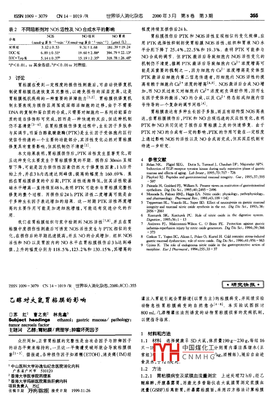 sSN1009-3079cN14-1019/R世界華人消化雜志2000年3月第8卷第3表2不同阻斷劑對NOS活性及NO合成水平的影響程度持續(xù)至損傷后24h.NO組織NO胃液胃粘膜損傷后PIK和NOS活性呈現(xiàn)相似的變化規(guī)律,應(mxg蛋自-min-1)mmg蛋自-min-1)(p①)用PIK選擇性抑制劑使胃粘膜NOS活性、組織和胃液NO水3.L2±0.53平分別下降了254%,22.5%和19.3%.表明PIK可能參與DC組6.89±0.511960±288394.79±22,13°D+T5.140.37±2.35b318.78±26.48bO合成的調(diào)節(jié).但PIK激活后導致細胞內(nèi)NOS活性變化的P<0.01,ws其余各組,P<0.01w對照組機制仍不清楚,推測PTIK激活后導致細煦內(nèi)Ca2濃度增高可觸是其重要的桃制之一,因為細胞內(nèi)Ca2濃度增高是受體型3討論PTK激活后細胞內(nèi)第二信息傳遞者,而細胞內(nèi)NOS活性的提冒粘膜在受到一定程度的損傷性刺激后,可啟動快修復機高有賴于細胞內(nèi)Ca2+濃度的增高(·9,NS激活后合咸№O增制使胃粘膜迅速恢復其完整性,以避免損慚向深層發(fā)展,這是加,而NO反過來又對細胞內(nèi)Ca2濃度起負調(diào)控作用,因而生胃粘膜抵抗疾瘸的亠種重要的屏障能力(1,2).胃粘膜快修復機長丙子受體的激活、O的合成、以及Ca2穩(wěn)態(tài)組成細胞內(nèi)信制主要表現(xiàn)為損傷區(qū)周圍或深部活細胞的遷移,由于不需要號傳導的一個復雜的調(diào)節(jié)網(wǎng)絡4DNA的復制和蛋白質(zhì)的合成,只需要對細胞內(nèi)一系列功能蛋白胃粘膜表達有多種生長因子多肽,而且有結構型NO6商表質(zhì)的適當修飾即可完成,因而是一種快速的反應,但這種機制達,在胃粘膜損傷后,PTK和NO出現(xiàn)迅速的反應性變化,表明仍不甚濟楚3-61.在胃粘膜損傷修復過程中,生長因子多肽參PIK和NO共同促進了損傷后胃粘膜上皮的快速修復.由于與其調(diào)節(jié),而蛋白酪氨酸激酶(PTK)是生長因子受體胞內(nèi)區(qū)行PIK對NO的合成有一定的影響,PIK的作用可能在一定程度使信號傳遞的一個主要的功能部分,其活性變化必然對胃粘膜上通過影響NOS的活性以及NO合成而完成,但其深層機制有修復異有重要影響,但其機制仍不清楚2待進一步研究本文結果表明,胃粘膜損傷后,PTK活性發(fā)生顯著變化,而且這種變化主要發(fā)生于胃粘膜修復的早期.損傷后30min呈短參考文獻暫下降,可能是因為損傷性因素仍然大于修復性因素,1h后開Relan NK, FLigiel SEG, Dutta S, Tureaud ], Chauhan DP, Majumdar APN始上升,并在3h內(nèi)迅速達到峰值,提高的幅度為160.69%.雖4Lb,19577m6k然在胃粘膜修復的中后期,PTK活性逐漸降低,但其活性較基2 Playford R. Peptides and gastrointestinal mural integrity. Gut, 1995: 37: 595礎水平增高一直持續(xù)至48h,表明PIK可能參與胃粘膜完鏊性3Pmw山H,CwmP,. liam 5. Present views on restitution of gastrointestina修復的整個過程,而損傷后24hPIK活性二度增高可能是由4 Moncada s, Palmer RM, Higgs EA. Nitricysiology, pathophysioks于多種生長因子表達增加的結果這一時期PTK活性再度增5 Tepperman Bl, Voula bl, Soper Br. Effect of neutropenia on gastric mu高的主要作用可能是加速細胞增殖,可能還有促進分化的作and mucosal6 Kooturek SK, Konturek PC. Role of nitric oxide in the digestive system我們在胃粘膜組織勻裳中檢測到NOS活性8,并且在胃7Ax時, Malooententi-Wilson C,oBwE.oian粘膜中度損傷性刺激后可誘發(fā)NOS活性發(fā)生與PTK相似的變ischemia-reperfusion injury by nitric oxide generators. Dig Dis Sci化,在損傷后的早期迅速提高,并且NO的合成增加.組織NOs8 Coskun t, Yegen BC, Alican i, Peker o, Kurtel h. Cold restraint strese- induccd活性和NO以及胃腔內(nèi)的NO水平在胃粘膜損傷后3h達到峰stric mucosal dysfunction: ole of nitric oxide. Dig Dis Sci, 1996441: 956-9639 Gyres K. The role of endogenous nitric oxide in the gastroprotective action of值,上升的幅度分別為118.5%,123.2%和130.15%,其增高的orpine. EurJ Pharmacol, 1994: 255: 33-37ISSN100-3079CN14-1019/R世界華人消化雜志,20008(3):355·研究快報·乙醇對大鼠胃粘膜的影響灌注入胃能引起全胃腸道(以胃為主)的粘膜病變,并廷緩實驗動物急性胃粘膜病變的自然愈合4-8).本實驗試圖探討口蘇紅1曹之憲2林兆鑫800mL/酒精灌注法所誘發(fā)的動物胃粘膜損害的發(fā)病機制,ubject headinthanol; gastric mucosa/ pathology;以便指導臨床tumor necrosis factor主題詞乙醇;胄粘膜/病理學;腫瘤壞死因子1材料和方法眾所周知,正常胃粘膜的完整性是由攻擊因子與防御因子1.1材料選擇健康♀SD大鼠,體質(zhì)量190g~230g每組16的動態(tài)平衡來維持的,一旦這一平衡遭受破壞就會導敦粘膜損只~18中國煤化工分別胃內(nèi)灌注蒸餾水(正害1-3.據(jù)報道,各種損傷因子如酒精(ETOH)、消炎痛(M)經(jīng)常組)CNMHG4g,酒精組),隨后自由進食及水,了山醫(yī)科大學孫逸仙紀念醫(yī)院消化內(nèi)科12方法2香港大學醫(yī)學院藥理系1.2.1胃粘膜病變及漿膜血流量測定上述處理72h后,經(jīng)乙香港大學瑪麗醫(yī)院胃腸肝病內(nèi)科項目數(shù)數(shù)據(jù)接受日期199126醚麻醉,開腹暴露胃,用漱光多普勒儀在大鼠腺胃測定漿膜血收稿日期流量(GSBF)后離斷胃,并暴露巖膜面,釆用四方格法計算粘膜ssN1009-3079cN14-1019/R世界華人消化雜志2000年3月第8卷第3期損傷面積(mm2),然后分別計算每組血流及損傷面積,并刮取胃本實驗結果表明,試驗組PGE2水平均顯著高于對照組(P粘膜層組織迅速置入液氮后轉入一70℃低溫冰箱保存,用于測<0.01),但仍未能提供有效保護作用,說明酒精所致大鼠胃粘定粘膜MPO,FGE2及TNFa水