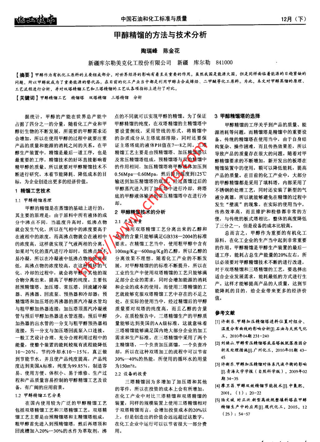 幽四技有中國石油和化工標準與質(zhì)量12月(下)甲醇精餾的方法與技術分析陶瑞峰陳金花新疆庫爾勒美克化工股份有限公司新疆庫爾勒841000[摘要]甲醇作為有機化工原料的主要組成部分,對世界經(jīng)濟的影響有著至關重要的作用。雖然我國是能源大國,但是同樣面臨著能源的日趨緊缺的問題,所以甲醇就成為了重要能源的替代品。在目前的化工產(chǎn)業(yè)當中都是利用甲醇去合成烯烴、二甲醚等化工原料。為此,本文對甲醇蒸館的原理、工藝流程進行分析,并對雙塔精鎦工藝和三塔精餾的工藝從各項指標上進行了對比。.. [關鍵詞]甲醇精餾工藝 精餾塔雙塔精餾 三塔精餾 分析據(jù)統(tǒng)計,甲醇的產(chǎn)能在世界總產(chǎn)能中點的不同就可以實現(xiàn)甲醇的精餾。為了保證3 甲醇精餾塔的選擇占據(jù)了四分之一的分量,隨著化工產(chǎn)業(yè)和甲甲醇精餾的純度,在雙塔精餾的主精餾塔中甲醇精餾的工序關乎到產(chǎn)品的質(zhì)量、能醇衍生物的不斷發(fā)展,所需要的甲醇需求還要設置側(cè)線,采用管線的形式,將精餾中源消耗等問題,而精餾塔是精餾中的重要設會增加,所以在使用甲醇的過程中就要注重的雜質(zhì)成分從主塔底部排除,同時還要保備。 傳統(tǒng)的精餾塔在使用當中,由于自身結(jié)產(chǎn)品的質(zhì)量和能源的消耗之間的關系。在甲證主塔塔底的液體PH值在7-8之間。三塔構復雜、 操作困難,而且傳熱效果差,所以醇生產(chǎn)裝置中,精餾是最后一道工序,也是精餾工藝主要是由預精餾塔、加壓精餾塔以導致產(chǎn) 品的質(zhì)量存在很大的問題。隨著對甲最重要的工序,精餾技術的好壞直接影響著及常壓精餾塔組成。預精餾塔與雙胎精餾中醇精餾要 求的不斷增加,新開發(fā)出的板塔在精甲醇的質(zhì)量。所以就要對甲醇精餾技術不的作用相同,加壓精餾塔將甲醇液體加壓到精餾裝置中的使用,額可以降低能耗,提高斷進行研究,本著節(jié)能降耗、降低成本的目0.56Mpa- 0.60Mpa, 然后提升溫度到125C產(chǎn)品的質(zhì)量。在目前的化工產(chǎn)業(yè)中,大部分標,為企業(yè)創(chuàng)造出更多的經(jīng)濟價值。輸送到加壓精餾塔的底部,經(jīng)過蒸餾過后的的甲醇精餾都是采用了 填料塔,內(nèi)部采用了1精餾工藝技術甲醇蒸汽進入到了加壓塔中進行冷卻,將塔不銹鋼的處理工藝,同時還安裝了新型的氣底的甲醇液體輸送到常壓精餾塔中在進行冷液分離器, 所以就能夠避免在精餾的過程中1.1甲醇精餾原理卻。發(fā)生“壁流”的現(xiàn)象。在實際的使用當中,甲醇的精餾是在蒸餾的基礎上進行的。其主要的原理是:由于原料中所有液體的成2甲醇精餾技術的分析傳熱效率高,而且維護和檢修都非常的方便,與傳統(tǒng)的板式塔相比,整體的高度降低分中沸點不同,當溫度升高時,低沸點物2.1產(chǎn)品質(zhì)量就會發(fā)生氣化,所以在氣相中的濃度要高于使用雙塔精餾工藝分離出來的乙醇和了三分之一-,但是設備的成本比較高。在液相中的濃度,而高沸點物就會在液相中雜質(zhì)的含 量只能夠滿足GB338- -2004的標準總而言之,甲醇作為重要的有機化工的濃度高,這樣就實現(xiàn)了氣液兩相的分離。要求。在精餾工藝當中,使用粗甲醇中含有原料,在化工企業(yè)的生產(chǎn)當中起到非常重要的作用。甲醇精餾是甲醇生產(chǎn)裝置的最后一如果對氣化的蒸汽進行冷卻時,低沸點物不100mg/Kg- 600mg/Kg的乙醇, 所以乙醇的道工序,能耗占總生產(chǎn)能量的20%左右,所易冷凝,所以在冷凝液中低沸點物的濃度很分離 效果不理想。隨著化工產(chǎn)業(yè)的不斷發(fā)以必須要對甲醇精餾技術不斷的進行改進,低,高沸點物的濃度較高,在這種循環(huán)的氣展,對甲醇精餾的的標準不斷提升,所以在對于雙塔精餾和三塔精餾的工藝,要選擇出化、冷卻的過程中,就會將甲醇中其他的混工業(yè)的生產(chǎn)中使用雙塔精餾的工藝只能夠滿適合企業(yè)發(fā)展需求,能耗最低的方式進行生合物分離出來,提高了甲醇的純度。主要包足部分企業(yè)的需求,同時會增加能源的消耗產(chǎn)。這樣才能夠提高產(chǎn)品的人質(zhì)量,達到節(jié)括預精餾塔、加壓塔、常壓塔、回流罐冷凝和企業(yè)的成本的使用。而使用三塔精餾的工器、再沸器、回流泵、預熱器和冷卻器:預藝 就能夠克服雙塔精餾工藝中存在的不足之值能降耗的目的,給企業(yè)帶來更多的經(jīng)濟價精餾塔和加壓塔的再沸器的蒸汽冷凝水管均處。在實際的使用當中,經(jīng)過精餾后的甲醇與粗甲醇加熱器連接;加壓塔頂蒸汽冷凝液質(zhì)量要對雙塔的純度高,而且乙醇的含量參考文獻管與預后甲醇加熱器進水管連接;預后甲醇少,在質(zhì)檢報告中,三塔精餾生產(chǎn)的甲醇質(zhì)[1]許新樂.甲醇加壓精餾塔進料位置對組分、加熱器的出水管的一分支與粗甲醇預熱器相量能夠達到美國的AA級標準,這就意味著溫度分布曲線的影響分析[].石油與天然氣化連接,另一分支與加壓塔回流泵入口連接。三塔精餾能夠滿足國內(nèi)絕大部分企業(yè)的加工一般工藝設計合理、 充分合理利用過程中的需求和生產(chǎn)標準。在三塔精餾中采用了兩個工,2010年04期231 -240能量,使整個裝置的能耗較現(xiàn)有流程能降低主精餾塔,一個負責加壓蒸餾,一個負責冷(2) 劉煥山,甲醇常壓精餾塔底層塔板脫落原
