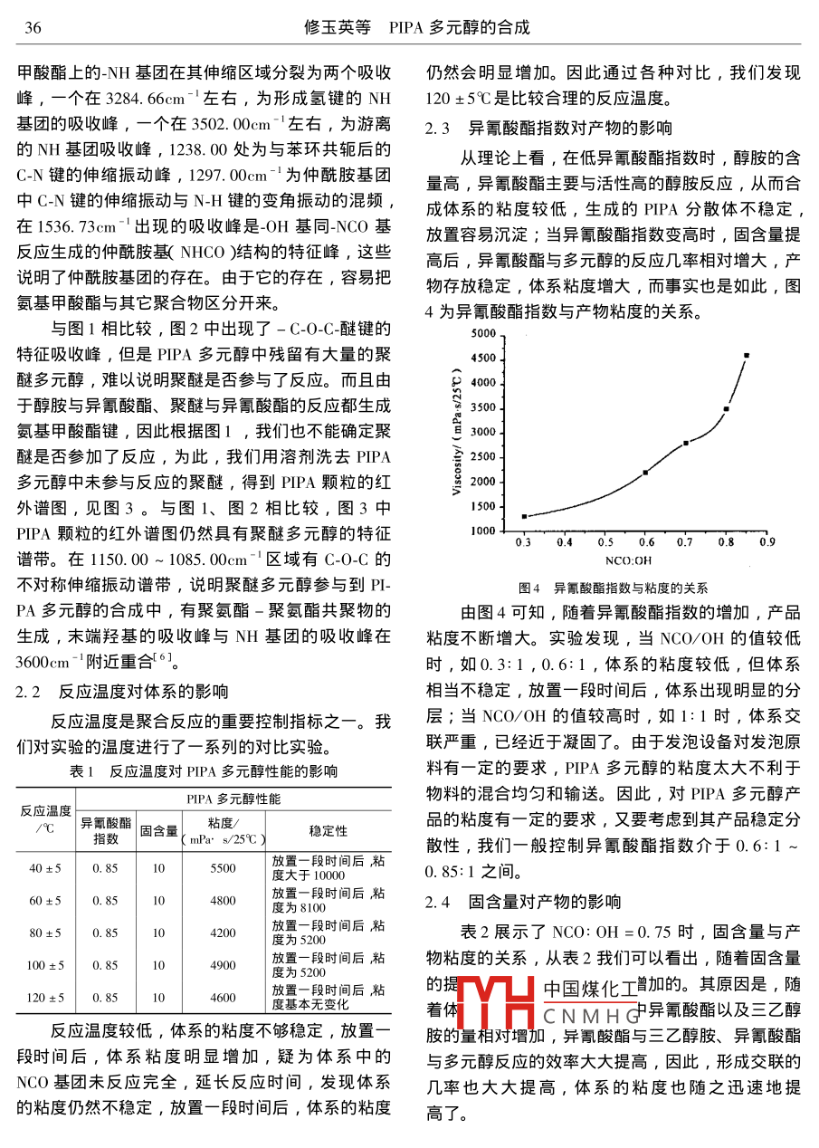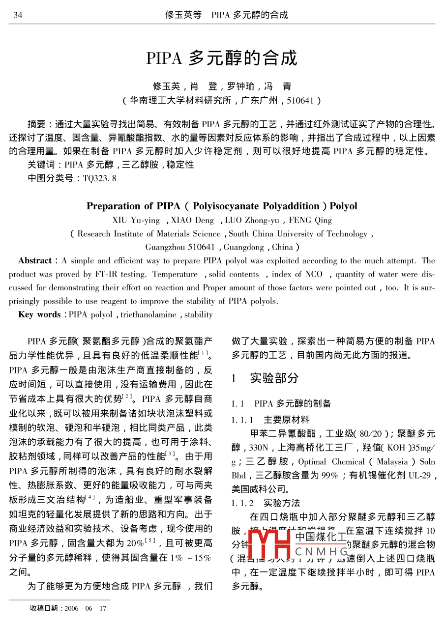 34修玉英等PIPA 多元醇的合成PIPA多元醇的合成修玉英,肖登,羅鐘瑜,馮青(華南理工大學(xué)材料研究所,廣東廣州, 510641 )摘要:通過(guò)大量實(shí)驗(yàn)尋找出簡(jiǎn)易、有效制備PIPA多元醇的工藝,并通過(guò)紅外測(cè)試證實(shí)了產(chǎn)物的合理性。還探討了溫度、固含量、異氰酸酯指數(shù)、水的量等因素對(duì)反應(yīng)體系的影響,并指出了合成過(guò)程中,以上因素的合理用量。如果在制備PIPA多元醇時(shí)加入少許穩(wěn)定劑,則可以很好地提高PIPA多元醇的穩(wěn)定性。關(guān)鍵詞: PIPA多元醇, 三乙醇胺,穩(wěn)定性中圖分類(lèi)號(hào): TQ323.8Preparation of PIPA ( Polyisocyanate Polyaddition ) PolyolXIU Yu-ying , XIAO Deng , LUO Zhong-yu,F(xiàn)ENG Qing( Research Institute of Materials Science , South China University of Technology ,Guangzhou 510641 , Guangdong , China )Abstract : A simple and efficient way to prepare PIPA polyol was exploited according to the much attempt. Theproduct was proved by FT-IR testing. Temperature , solid contents , index of NCO , quantity of water were dis-cussed for demonstrating their effort on reaction and Proper amount of those factors were pointed out , too. It is sur-prisingly possible to use reagent to improve the stability of PIPA polyols.Key words : PIPA polyol , triethanolamine , stabilityPIPA多元醇聚氨酯多元醇)合成的聚氨酯產(chǎn)做了大量實(shí)驗(yàn),探索出一種簡(jiǎn)易方便的制備PIPA.品力學(xué)性能優(yōu)異,且具有良好的低溫柔順性能[1。多元醇的工藝,目前國(guó)內(nèi)尚無(wú)此方面的報(bào)道。PIPA多元醇一般是由泡沫生產(chǎn)商直接制備的,反應(yīng)時(shí)間短,可以直接使用,沒(méi)有運(yùn)輸費(fèi)用,因此在1實(shí)驗(yàn)部分節(jié)省成本上具有很大的優(yōu)勢(shì)2。PIPA 多元醇自商1.1 PIPA多元醇的制備業(yè)化以來(lái),既可以被用來(lái)制備諸如塊狀泡沫塑料或1.1.1 主要原材料模制的軟泡、硬泡和半硬泡,相比同類(lèi)產(chǎn)品,此類(lèi)甲苯二異氰酸酯,工業(yè)級(jí)( 80/20 );聚醚多元泡沫的承載能力有了很大的提高,也可用于涂料、醇, 330N,上海高橋化工三廠(chǎng),羥值( KOH )35mg/膠粘劑領(lǐng)域,同樣可以改善產(chǎn)品的性能31。由于用g;三乙醇胺, Optimal Chemical ( Malaysia ) SolnPIPA多元醇所制得的泡沫,具有良好的耐水裂解Bhd ,三乙醇胺含量為99% ;有機(jī)錫催化劑UL-29 ,性、熱膨脹系數(shù)、更好的能量吸收能力,可與兩夾美國(guó)威科公司。板形成三文治結(jié)構(gòu)4],為造船業(yè)、重型軍事裝備.1.1.2 實(shí)驗(yàn)方法如坦克的輕量化發(fā)展提供了新的思路和方向。出于在四口燒瓶中加入部分聚醚多元醇和三乙醇商業(yè)經(jīng)濟(jì)效益和實(shí)驗(yàn)技術(shù)、設(shè)備考慮, 現(xiàn)今使用的按,中國(guó)煤化工_在室溫下連續(xù)攪拌10PIPA多元醇,固含量大都為20%[5],且可被更高分鐘的聚醚多元醇的混合物分子量的多元醇稀釋,使得其固含量在1% ~ 15%MHCNMHG(混合仙小小到1力計(jì);速倒入上述四口燒瓶之間。中,在一定溫度下繼續(xù)攪拌半小時(shí),即可得PIPA為了能夠更為方便地合成PIPA多元醇,我們多元醇。收稿日期: 2006 -06-172006年第35卷第4期合成材料老化與應(yīng)用351.2 PIPA多元醇的性能測(cè)試見(jiàn)圖3。100.01.2.1紅外光譜( FT-IR )分析90 r80采用PERKIN-ELMER-1700紅外光譜儀,對(duì)PI-15010.3.0| 8672278.01 521.94,0.0m70PA多元醇進(jìn)行定性表征。601.2.2 粘度測(cè)試5040120743159.97用NDJ-1型旋轉(zhuǎn)式粘度計(jì),測(cè)得各分散體在室30137.015.8溫下( 25C )的粘度。20102870.68. 20.361.2.3 分散穩(wěn)定性測(cè)試112.9.004000.0 30002000 15001000 500.0采用LG10-24型離心機(jī)以6000轉(zhuǎn)速分離各PI-Wavenumber/cm'PA多元醇30分鐘,觀察試管底部固含量。圖1330N聚醚多元醇的紅外光譜圖2結(jié)果與討論.1.0PIPA多元醇是多異氰酸酯與含有多個(gè)羥基、0.8.伯胺基或是叔胺基的低分子化合物在高分子量的多0.6元醇中,尤其是在聚醚多元醇中發(fā)生加成反應(yīng)的產(chǎn)019454物。在制備PIPA多元醇的過(guò)程中,異氰酸酯既可0.4-1373.271”以和多元醇反應(yīng),又可以和醇胺反應(yīng),這是一對(duì)競(jìng)0.2-219269836爭(zhēng)反應(yīng),在反應(yīng)過(guò)程中,如何控制競(jìng)爭(zhēng)反應(yīng)使體系1109.0327成為穩(wěn)定的分散液體是該工藝的關(guān)鍵。然而目前還4000350030002500 2000 1500 1000 s00 0沒(méi)有相關(guān)熱力學(xué)方面的數(shù)據(jù)來(lái)顯示反應(yīng)的方向,其反應(yīng)的結(jié)果主要取決于以下幾個(gè)方面:官能團(tuán)-圖2 PIPA 多元醇的紅外光譜圖0H、-NCO的相對(duì)活性;混合物中異氰酸酯的含1.1 :1.量;反應(yīng)制備工藝的選擇等。0.9374本法在-定程度上避免其他滴定方式的缺陷,R 0.80.7又可簡(jiǎn)便地進(jìn)行生產(chǎn),它與現(xiàn)有技術(shù)相比具有如下767.64優(yōu)點(diǎn)和效果:可以用較為簡(jiǎn)便的裝置在較短時(shí)間內(nèi)0.5-3302.021968.35合成PIPA多元醇,合成速度快,生產(chǎn)效率高;合” 03+1708.47 1231.47成過(guò)程操作簡(jiǎn)單、容易控制,重現(xiàn)性好,并不需要0.1使用特殊的設(shè)備,生產(chǎn)成本較低;所制備的PIPA .0.40000 3500 3000 2500 2000 1500 10000 500 0多元醇粘度較低、穩(wěn)定性好。異氰酸酯指數(shù)是指異氰酸酯中NCO基與多元圖3 PIPA 顆粒的紅外光譜圖醇胺中的羥基的摩爾比,是PIPA合成體系中的一圖1中,3500. 10cm-