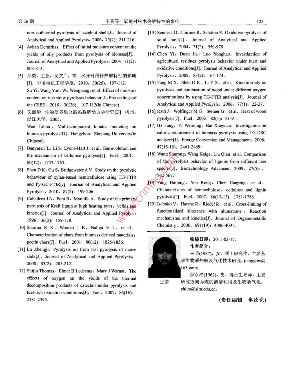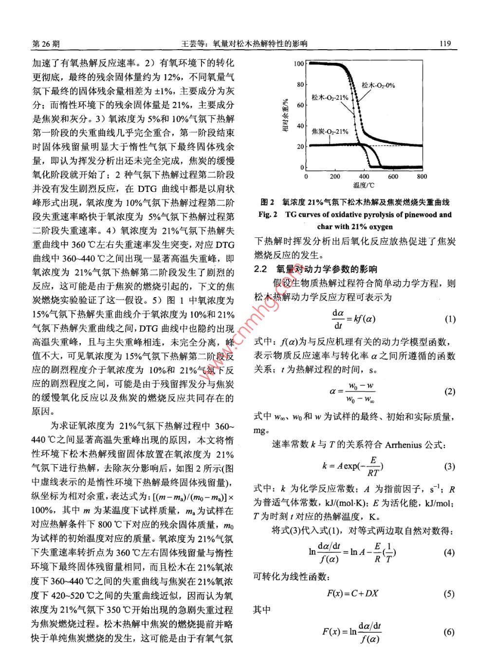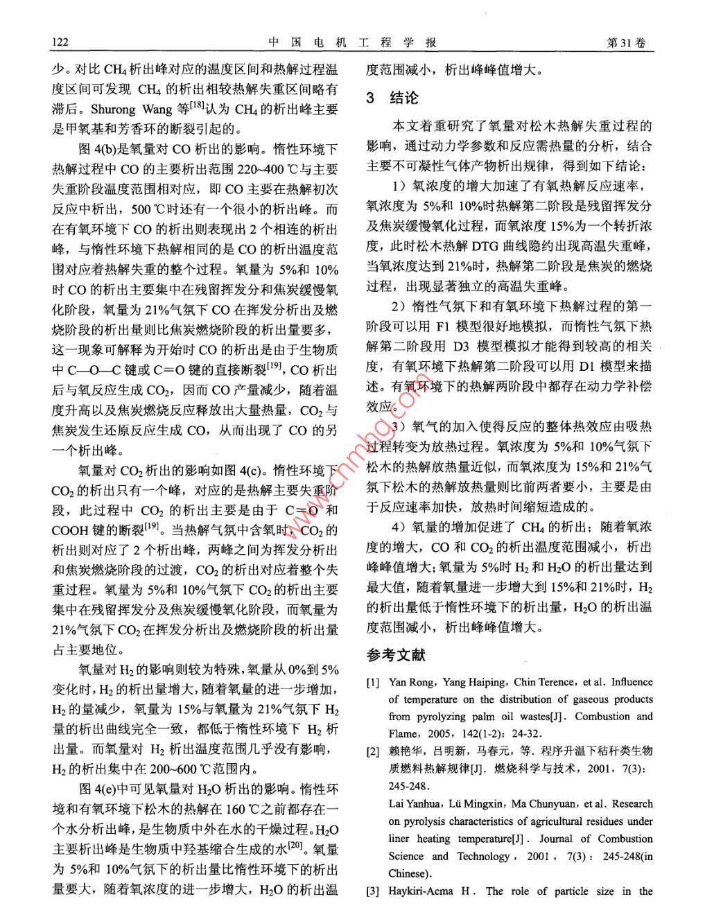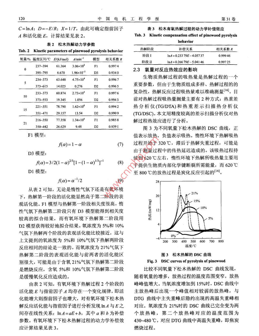 第31卷第26期中國電機(jī)工程學(xué)報(bào)VoL 31 No 26 Sep 15, 20112011年9月15日Proceedings of the CSEeC2011 Chin. Soc. for Elec Eng. 117文章編號:0258-8013(2011)260117-07中圖分類號:TM6文獻(xiàn)標(biāo)志碼:A學(xué)科分類號:47020氧量對松木熱解特性的影響王蕓,陳亮,蘇毅,吳文廣,羅永浩(上海交通大學(xué)機(jī)械與動(dòng)力工程學(xué)院,上海市閔行區(qū)200240)Effect of Oxygen Concentration on Pinewood pyrolysis BehaviorWANG Yun, CHEN Liang, SU Yi, WU Wenguang, LUO Yonghao(School of Mechanical Engineering, Shanghai Jiaotong University, Minhang District, Shanghai 200240, China)ABSTRACT: The effects of the oxygen concentration on the式,在生物質(zhì)熱化學(xué)應(yīng)用中具有重要影響,吸引了pinewood pyrolysis characteristic were studied through the眾多學(xué)者的注意。experiments under five different oxygen concentrations(0%,目前,國內(nèi)外關(guān)于生物質(zhì)熱解的研究主要集中5%109419%,21) by thermogravimetric-mass spectrometry在2個(gè)方面:熱解影響因素和熱解機(jī)制。影響生物displayed the heat of the pyrolysis process. The kinetic質(zhì)熱解的因素主要包括溫度、升溫速率、生物質(zhì)顆parameters were calculated. Results show that oxygen had粒大小和生物質(zhì)中初始水分含量等”針對生物質(zhì)significant effects on pyrolysis: accelerating the reaction rate.熱解機(jī)理的研究,眾多學(xué)者認(rèn)為可將生物質(zhì)熱解看All the pyrolysis processes were well described by kinetic作是主要組分纖維素、半纖維素和木質(zhì)素?zé)峤獾募觩arameters and there were compensation effects between them.權(quán),并試圖從動(dòng)力學(xué)和熱解途徑的角度解釋生物質(zhì)的熱解機(jī)理69temperature range became narrower and the exothermic pealincreased. For other gases except H2, the oxygen narrowed the現(xiàn)有對生物質(zhì)熱解的研究大多是在完全惰性leasing temperature range and favored the releasing peak氣氛下進(jìn)行的,而實(shí)際生物質(zhì)熱化學(xué)轉(zhuǎn)化過程中熱KEY WORDS: oxygen concentration; pyrolysis; char; heat;解反應(yīng)很難在完全惰性環(huán)境下進(jìn)行,這是由于設(shè)備的密封性限制以及生物質(zhì)原始顆粒本身內(nèi)部孔隙摘要:基于熱重質(zhì)譜聯(lián)用儀上松木在5種不同氧量氣氛下和物料堆積形成的空隙中都存在著大量空氣。因0%、%、10%、15%、21%)的熱解實(shí)驗(yàn)研究考察了熱解氣此,對于含氧氣氛下生物質(zhì)熱解的研究具有重要意氛中氧氣濃度對熱解特性的影響,通過差式掃描量熱分析曲義。一些學(xué)者也開始注意到了氧氣對生物質(zhì)熱解特線討論了氧量對反應(yīng)熱效應(yīng)的影響并對熱解過程的動(dòng)力學(xué)性的影響。如K. Sharma等將果膠質(zhì)分別在純氦特性進(jìn)行了分析。結(jié)果表明:氧氣對松木熱解2個(gè)階段都有氣環(huán)境下和含氧5%氣氛下熱解,含氧環(huán)境下焦炭重要影響,氧氣加速了熱解反應(yīng);所求解的動(dòng)力學(xué)參數(shù)能較的BET比表面積比氦氣環(huán)境下得到焦炭的BET比好的描述反應(yīng)過程,有氧熱解過程存在動(dòng)力學(xué)補(bǔ)償效應(yīng):氧表面積要小。氧氣不僅對固體產(chǎn)物焦炭的性質(zhì)有影濃度的增大減小了反應(yīng)放熱溫度范圍,增大了放熱峰峰值除H2外的其他氣體隨著氧濃度的增大,析出溫度范圍變窄,響, Zheng Ji-Lu'發(fā)現(xiàn)氧氣的存在還會(huì)改變液體產(chǎn)析出峰峰值增大。物的含氧量。而 Shiju Thomas)鄰苯二酚作為固關(guān)鍵詞:氧量;熱解;焦炭;熱效應(yīng);松木體燃料模型化合物,改變通入石英管流反應(yīng)器中氧氣與氣態(tài)鄰苯二酚的比例,得到熱解產(chǎn)物分布與氧0引言量的關(guān)系:C1-C5碳?xì)浠衔镆约皢苇h(huán)碳?xì)浠衔锬茉炊倘焙铜h(huán)境污染問題越來越受到人們的在溫度低于850℃時(shí)隨著氧量的增加而增加,溫度關(guān)注,生物質(zhì)能作為一種可替代型能源,具有資源高于850℃時(shí)隨著氧量的增加而減少。 Senneca等13分布廣泛、清潔和可再生等優(yōu)點(diǎn),因此受到世界各提出了有氧熱解的機(jī)理假設(shè):氧氣可能不僅與熱解國的重視。熱解是一種重要的生物質(zhì)熱化學(xué)轉(zhuǎn)化方生成的揮發(fā)分發(fā)生反應(yīng),還會(huì)克服邊界層的擴(kuò)散阻118中國電機(jī)工程學(xué)報(bào)第31卷力以及揮發(fā)分析出的流動(dòng)阻力進(jìn)入生物質(zhì)孔隙內(nèi)始溫度為40℃,終溫800℃,升溫速率為20Kmin,部參與反應(yīng)。 Yi Chen等4研究了有氧氣氛下稻稈、試樣質(zhì)量為(85±1)mg玉米桿和玉米芯3種物質(zhì)的熱解特性,發(fā)現(xiàn)隨著氧2結(jié)果與分析量的增加,同一種生物質(zhì)的燃燒特性指數(shù)增大,易于燃燒,各氣體析出溫度范圍減小,析出終溫增大。21氧量對失重特性的影響M. X. Fang等5發(fā)現(xiàn)棉花稈、印茄木的有氧熱解過圖1為松木在不同氧量下的熱解失重曲線(TG程中都存在臨界氧濃度,氧濃度高于或是低于臨界曲線)和失重速率曲線DTG曲線)。松木在純氬氣環(huán)氧濃度時(shí),燃燒階段為單一過程,熱解氣氛中含氧境下的熱解反應(yīng)可分為2個(gè)階段:237-394℃為熱濃度低于臨界氧濃度時(shí),燃燒階段為2個(gè)過程。以解主要失重階段,395-800℃為半焦緩慢失重階段。上關(guān)于有氧氣氛下生物質(zhì)熱解文獻(xiàn)均表明氧氣對有氧氣氛下的熱解過程也可分為2