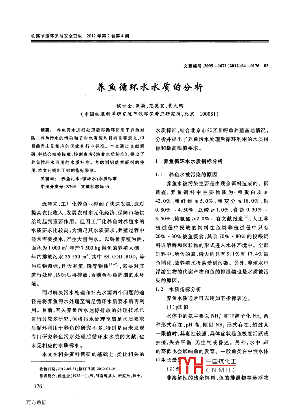 鐵路節(jié)能環(huán)保與安全衛(wèi)生2012年第2卷第4期文章編號(hào):2095-1671(2012)04-0176-03養(yǎng)魚循環(huán)水水質(zhì)的分析侯世全,洪蔚,范英宏,黃大鵬(中國(guó)鐵道科學(xué)研究院節(jié)能環(huán)保勞衛(wèi)研究所,北京100081)摘要:養(yǎng)魚污水進(jìn)行處理后再循環(huán)回用于養(yǎng)魚對(duì)水質(zhì)標(biāo)準(zhǔn),結(jié)合北京市郊區(qū)某鱘魚養(yǎng)殖基地情況防止養(yǎng)魚污水的污染和節(jié)省水資源均具有重要意義,但分析并提出了養(yǎng)魚污水處理后循環(huán)利用的水質(zhì)指目前尚未見相應(yīng)的國(guó)家和行業(yè)標(biāo)準(zhǔn)。本文通過文獻(xiàn)調(diào)標(biāo)和最高限值要求。研,并結(jié)合相關(guān)標(biāo)準(zhǔn),特別參考《漁業(yè)水質(zhì)標(biāo)準(zhǔn)》,提出了養(yǎng)魚循環(huán)水回用的水質(zhì)標(biāo)準(zhǔn)??紤]到鋁鹽絮凝劑的使1養(yǎng)魚循環(huán)水水質(zhì)指標(biāo)分析用,本文還提出了鋁的指標(biāo)限制。關(guān)鍵詞:養(yǎng)魚污水;循環(huán)水;水質(zhì)標(biāo)準(zhǔn)1.1養(yǎng)魚水被污染的原因中圖分類號(hào):X703文獻(xiàn)標(biāo)志碼:A養(yǎng)魚水被污染主要是由殘余餌料造成的。據(jù)調(diào)查,養(yǎng)魚飼料中主要物質(zhì)為:粗蛋白質(zhì)≥近年來工廠化養(yǎng)魚業(yè)得到了快速發(fā)展,這對(duì)42.0%、粗纖維≤5.0%、粗灰分≤18.0%、鈣提高農(nóng)民收入、發(fā)展農(nóng)村多元化經(jīng)濟(jì)、保障市場(chǎng)供0.80%~4.50%、總磷≥1.0%、食鹽0.30%給均起到重要作用。但因工廠化養(yǎng)魚對(duì)養(yǎng)殖水的3.50%、賴氨酸≥2.0%。有文獻(xiàn)報(bào)道,人工養(yǎng)水質(zhì)要求比較高,為滿足其水質(zhì)要求,養(yǎng)殖過程中殖過程中投放的飼料在魚類養(yǎng)殖過程中只有經(jīng)常需要換水,產(chǎn)生大量污水。以鱘魚養(yǎng)殖為例,20%-30%被魚攝食其余70%-80%的投喂飼面積為100m2年產(chǎn)7500kg鱘魚的養(yǎng)殖大棚_料以溶解和顆粒物的形式進(jìn)入水體環(huán)境中。全部年約排放污水25550m,其中S、CoD、B0oD,等飼料中,所含的氮、磷大約只有9.1%和174%被污染物超標(biāo),且含有氮、磷等物質(zhì)2),需要對(duì)其魚同化,故養(yǎng)殖水極易受到污染。另外,養(yǎng)殖水中進(jìn)行處理達(dá)標(biāo)后再排放,否則會(huì)污染周圍的水環(huán)浮游生物的代謝產(chǎn)物和魚的排泄物也是水質(zhì)被污境染的原因。同時(shí)解決污水處理和補(bǔ)充水源兩個(gè)問題的途1.2水質(zhì)指標(biāo)分析徑是將養(yǎng)魚污水處理至滿足循環(huán)水質(zhì)要求后再利養(yǎng)魚水質(zhì)通??梢杂萌缦轮笜?biāo)表述。用。目前,有關(guān)養(yǎng)魚污水達(dá)標(biāo)排放的處理技術(shù)已(1)pH值進(jìn)行過較多研究,但將污水處理至滿足水質(zhì)要求水體中的氨主要以NH4和非離子化NH,兩后循環(huán)利用于養(yǎng)魚的研究不多,特別是尚未發(fā)現(xiàn)種形式存在,pH高,則以NH3形式存在,超過某專門研究養(yǎng)魚污水處理后循環(huán)水水質(zhì)的文獻(xiàn),也一限值時(shí),其毒性較強(qiáng),具體癥狀是魚極度活躍或未見相應(yīng)的水質(zhì)標(biāo)準(zhǔn)。抽搐,失去平衡,無生氣或昏迷。另外,水中pH本文在相關(guān)資料調(diào)研的基礎(chǔ)上,類比相關(guān)的的高低也會(huì)影響魚的發(fā)育。一般魚類在中性水體中生長(zhǎng)最中國(guó)煤化工收稿日期:201240521;修訂日期:201207405H(2)SCNMHG作者簡(jiǎn)介:侯世全(1952一),男,河南輝縣人,研究員,碩士。非溶解性的殘余餌料、魚的排泄物等懸浮物176鐵路節(jié)能環(huán)保與安全衛(wèi)生2012年第2卷第4期會(huì)產(chǎn)生大量的氮、亞硝酸鹽、硝酸鹽以及顆粒有機(jī)養(yǎng)殖污水中常用的細(xì)菌學(xué)指標(biāo)。腐屑和溶解有機(jī)腐屑,如不及時(shí)清除這些懸浮物,則會(huì)很快污染水質(zhì),影響魚類生長(zhǎng)并誘發(fā)魚病??紤]到污水處理過程中可能選用鋁鹽作為絮(3)COD凝劑,人長(zhǎng)期飲用鋁濃度高的水則可能導(dǎo)致老年通過化學(xué)方法氧化水中有機(jī)物的需氧量,間癡呆,故選取鋁作為參考控制指標(biāo)。接表征污染物的含量。水體中有機(jī)物含量過高會(huì)造成水中溶解氧降低,引起水質(zhì)惡化,導(dǎo)致魚類生養(yǎng)魚循環(huán)水水質(zhì)指標(biāo)限值分析長(zhǎng)緩慢,甚至死亡或泛池。目前,尚未見國(guó)家和行業(yè)主管部門制定出處(4 )BOD理養(yǎng)魚污水后回用于養(yǎng)魚的水質(zhì)標(biāo)準(zhǔn)和相關(guān)規(guī)通過生物方法氧化水中有機(jī)物的需氧量,間定,可供參考借鑒的相關(guān)標(biāo)準(zhǔn)有接表征可生化污染物的含量。(1)GB8978-1996《污水綜合排放標(biāo)準(zhǔn)》(5)溶解氧為一般排污單位執(zhí)行的排放標(biāo)準(zhǔn),雖為排放污染物被氧化造成水中的溶解氧降低,溶解標(biāo)準(zhǔn),但也有參考意義,對(duì)12中列出的指標(biāo),參氧是水中生物呼吸所必不可少的,也是保證水中考標(biāo)準(zhǔn)中要求最嚴(yán)格的一級(jí)標(biāo)準(zhǔn)限值。有機(jī)物進(jìn)行無機(jī)化分解所必須的。(2)GB18918—2002《城鎮(zhèn)污水處理廠污染物(6)氨氮排放標(biāo)準(zhǔn)》殘餌排泄物及有機(jī)碎屑等物質(zhì)不斷地被水為城鎮(zhèn)污水處理廠執(zhí)行的排放標(biāo)準(zhǔn),