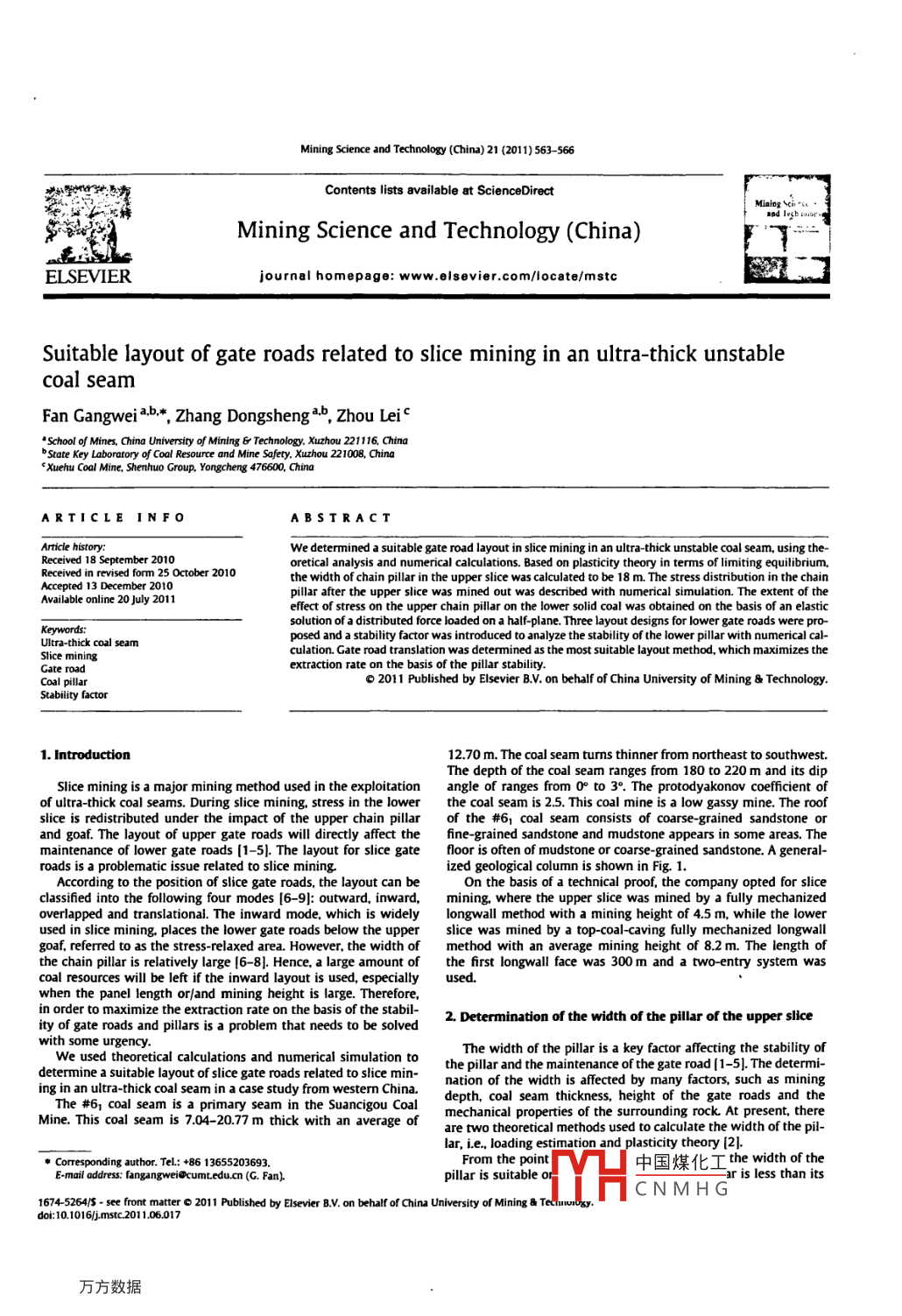 Mining Science and Technology(China)21(2011)563-566Contents lists available at Science Directted letb tuiMining Science and Technology( China)ELSEVIERournalhomepagewww.elsevier.com/locate/mstcSuitable layout of gate roads related to slice mining in an ultra-thick unstablecoal seamFan Gangweia, b * Zhang dongsheng b, Zhou LeicSchool of Mines, China University of Mining E Technology. Xuzhou 221116, ChinaState Key laboratory of Coal Resource and Mine Safety, Xuzhou 221008, ChinaXuehu Coal Mine, Shenhuo Group, Yongcheng 476600, chinaARTICLE INFOA BSTRACT≈=We determined a suitable gate road layout in slice mining in an ultra-thick unstable coal seam, using the-oretical analysis and numerical calculations. Based on plasticity theory in terms of limiting equilibriumrevised form 25 october 201013 December 2010the width of chain pillar in the upper slice was calculated to be 18 m. The stress distribution in the chainAvailable online 20 july 2011pillar after the upper slice was mined out was described with numerical simulation. The extent of theeffect of stress on the upper chain pillar on the lower solid coal was obtained on the basis of an elasticsolution of a distributed force loaded on a half-plane. three layout designs for lower gate roads were proposed and a stability factor was introduced to analyze the stability of the lower pillar with numerical cal-Slice miningculation Gate road translation was determined as the most suitable layout method, which maximizes theGate roadextraction rate on the basis of the pillar stabilityo 2011 Published by Elsevier B V on behalf of China University of Mining TechnologyStability factor1 Introduction12.70 m. The coal seam tums thinner from northeast to southwestThe depth of the coal seam ranges from 180 to 220 m and its dipSlice mining is a major mining method used in the exploitation angle of ranges from 0 to 3. the protodyakonov coefficient ofof ultra-thick coal seams. During slice mining, stress in the lower the coal seam is 2. 5. This coal mine is a low gassy mine the roofslice is redistributed under the impact of the upper chain pillar of the #61 coal seam consists of coarse-grained sandstone orand goaf. the layout of upper gate roads will directly affect the fine-grained sandstone and mudstone appears in some areas. themaintenance of lower gate roads [1-5 the layout for slice gate floor is often of mudstone or coarse-grained sandstone. a general-roads is a problematic issue related to slice mining.ized geological column is shown in Fig. 1According to the position of slice gate roads, the layout can beOn the basis of a technical proof, the company opted for sliceclassified into the following four modes [6-9]: outward, inward, mining, where the upper slice was mined by a fully mechanizedoverlapped and translational. the inward mode, which is widely longwall method with a mining height of 4.5 m, while the lowersed in slice mining, places the lower gate roads below the upper slice was mined by a top-coal-caving fully mechanized longwallgoaf, referred to as the stress- relaxed area. However the width of method with an average mining height of 8. 2 m. the length ofthe chain pillar is relatively large [6-8 Hence, a large amount of the first longwall face was 300 m and a two-entry system wcoal resources will be left if the inward layout is used, especially used.when the panel length or/ and mining height is large. therefore,in order to maximize the extraction rate on the basis of the stabil- 2. Determination of the width of the pillar of the upper sliceity of gate roads and pillars is a problem that needs to be solvedwith some urgencyThe width of the pillar is a key factor affecting the stability ofWe used theoretical calculations and numerical simulation to the pillar and the maintenance of the gate road ( 1-5). The determidetermine a suitable layout of slice gate roads related to slice min- nation of the width is affected by many factors, such as mininging in an ultra-thick coal seam in a case study from western China.The #61 coal seam is a primary seam in the Suancigou Coal depth, coal seam thickness, height of the gate roads and theMine. This coal seam is 7.04-20.77 m thick with an average of mechanical properties of the surrounding rock At present, thereare two theoretical methods used to calculate the width of the pillar, ie, loading estimation and plasticity theory [2].s Corresponding author teL: +86 13655203693From the point中國煤化工 the width of theE-mailaddress:fangangwei@.edu.cn(GFan).pillar is suitabless than itsCNMHG1674-5264/5-see front matter o 2011 Published by Elsevier B V on behalf of China University of Mining Teciuuugydot:101016 mstc201106017G. Fan et aL/ Mining Science and Technology( China)21(2011)563-566THicknesshology Column平*以Specifications073337[JI3.2-1539391Grey white,softMusnob) Outward lavoutCoarse.94942333Grey whteFig- 2. Schematic gate road layout related to slice mining.M十0C= 1.2 MPa is cohesion, o- 25 is the friction angle andy-25 kN/mis the average volume forceCalculated from Eq (2), the width of the plastic zone in the pil704-207127lar at the entry side, xr, was 3. 423 m.ng to Eq (1).MudstoneI 3.65BLack,medium-hardB=X+2m+x1=5.083+2×45+3423=17508m0302135From a safety point of view, we decided the width of the upperFIg 1. Generalized geological column.pillar to be 18 m3. Layout of lower gateroadsultimate strength [2 ] The load limit and the ultimate strength canbe calculated by a simple estimation or an empirical formulaGiven the position of the gate roads, three possible layoutAlthough this method is simple, the calculation error is relativelyAccording to plasticity theory, a plastic zone will appear at both(1) Inward layout: The lower gate roads are positioned below thesides of a mined-out area and the gate roads. the pillar remainsupper goaf, forming an echelon pillar(see Fig. 2a). If anstable only if an elastic core exists in the pillar after the plasticinward layout were employed, the width of the lower pil