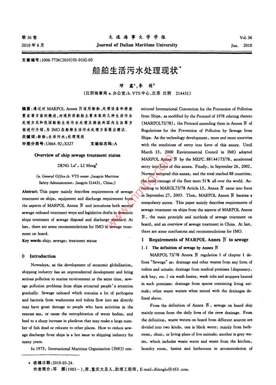 第36卷大連海事大學學報vL.362010年6月Journal of Dalian Maritime UniversityJun.2010文章編號:1006-7736(2010)S1010203船舶生活污水處理現(xiàn)狀鄧露,李萌(江陰海事局a辦公室;b.VTS中心,江蘇江陰214431)摘要:通過對 MARPOL AnnexⅣ適用船舶、處理設(shè)備和排放 stituted International Convention for the Prevention of pollution要求等方面的概述對現(xiàn)階段船舶主要采取的幾種生活污水 from Ships, as modified by the Protocol of 1978 relating thereto處理方式和我國船舶生活污水處理及排放的國內(nèi)立法等方( MARPOL73/78), the Protocol amending them in Annex w of面進行介紹,為IMO在船舶生活污水處理方面提出建議,Regulations for the Prevention of Pollution by Sewage from關(guān)鍵詞:船舶;生活污水;處理現(xiàn)狀Ships. As the technology development, more and more countries中圖分類號:U664.92;X327文獻標志碼:Awith the conditions of entry into force of this annex. UntilOverview of ship sewage treatment statusMarch 13, 2000 Environmental Council in IMO adoptedMARPOL Annex I by the MEPC. 88(44)73/78, acceleratedDENG Lu, LI Mengentry into force of this annex. Finally, in September 26, 2002(a. General office: b. VTS center, Jiangyin MaritimeNorway accepted this annex, and the total reached 88 countriesSafety Administration, Jiangyin 214431, China;the total tonnage of the fleet meet 51% all over the world. Ac-cording to MAROL73/78 Article 15, Annex I came into forceAbstract: This paper mainly describes requirements of sewage in September 27, 2003. Then, MARPOL Annex N became atreatment on ships, equipment and discharge requirement fromthe aspects of MARPOL Annex N and introduces both severalompulsory annex. This paper mainly describes requirements ofsewage onboard treatment ways and legislative drafts in domestisewage treatment on ships from the aspects of MARPOL Anneships treatment of sewage disposal and discharge standardN, the main principle andLast, there are some recommendations for IMO in sewage trboard, and an overview of sewage treatment in China. At lastment on boardhere are some conclusions and recommendations for IMoKey words: ship; sewage; treatment status1 Requirements of MARPOL Annex i to sewage1.1 The definition of sewage by Annex N0 IntroductionMARPOL 73/78 Annex N regulation 1 of chapter 1 deNowadays, as the development of economic globalizationfines"Sewage"as: drainage and other wastes from any form oftoilets and urinals; drainage from medical premises( dispensaryserious pollution to marine environment at the same timesick bay, etc. )via wash basins, wash tubs and scuppers locatedage pollution problems from ships attracted people's attention in such premises: drainage from spaces containing living angradually. Sewage onboard which contains a lot of pathogens mab; other waste waters when mixed with the drainages de-and bacteria from washrooms and toilets flow into sea directlfined abovemay have great damage to people who have activities in theFrom the definition of Annex N, sewage on board shipnearest sea, or cause the eutrophication of water bodies, and mainly comes from the daily lives of the crew drainage.Fromlead to a sharp increase in plankton that may make a largethe definition, waste waters on board from different sources areber of fish dead or relocate to other places. How to reduce sew. divided into two kinds, one is black water, mainly from bath-age discharge from ships is a hot issue to shipping industry for room, clinic, or living place of live animals; another is grey wa-ter, which includes waste water and waste from the kitchenIn 1973, International Maritime Organization(IMO)con- laundry room, basins and bathrooms in accommodation of收稿日期:201003-24作者簡介:鄧露(1983-),男,重慶大足人,助理工程師,Emal:denglu@163.com鄧露,等:船舶生活污水處理現(xiàn)狀103crews. In this paper below, sewage is not for grey water but for ample, in port of Gdansk, the port reception surcharge is fromblack water10 EUR to 15 EUR per cubic meter. Compared with sewage1.2 The application of Annex l to shipstreatment plants, it is much expensiveShips which involve in international voyage are 400 Gt or 2.2 Discharge treatment equipmenover, shall meet the Annex N requirements in September 27, 2.2.1 Biological treatment plant2008. And after that it should be surveyed and certificated byAt present, the biological treatment plant is in use aerobicclassification or administration compulsorilybiological treatment method of the activated sludge and biofilm1.3 Sewage equipment reqnirementprocess. Fig. 2 illustrates a process of aerobic biological treat-Regulation 9, 10 in Chapter 3 of MARPOL Annex N es- ment plant. The advantages are simple structure, easy mainte-tablished a series of technology standards that each ship (in ac- nance, limit pharmaceutical usage, low cost, small volume ofcordance with requirements in Annex N)should has one of sew. sludge after treatment. However, the aerobic biological treat-age treatment plant, sewage comminuting and disinfecting sys- ment needs oxygen in the process and large volume tanktem, holding tank, which shall be of a type approved or satisfiedby the administration; and discharge flanges which connectedith shore facilities or other ships should satisfied the minimum1.4 Discharge requirement of sewage in the seFig. 1 shows that the reasonable distance of dischargingrage in the sea. Still in MARPOL Annex I, there are nony requirements about grey water discharge. Thus grey watercan be flow out of shipcase and any place in legalFig. 2 An example of work principleOCEAN2.2.2 Chemical treatment plantChemical treatment plant is still an essential component invage treatment schemes. Normally, the purposes of thechemical treatment are pH adjustment, removal of suspendedsolids from sewage( Precipitation), removal dissolved materialsin the sewage( Coagulation/ Flocculation), and improve waterquality(Clarification