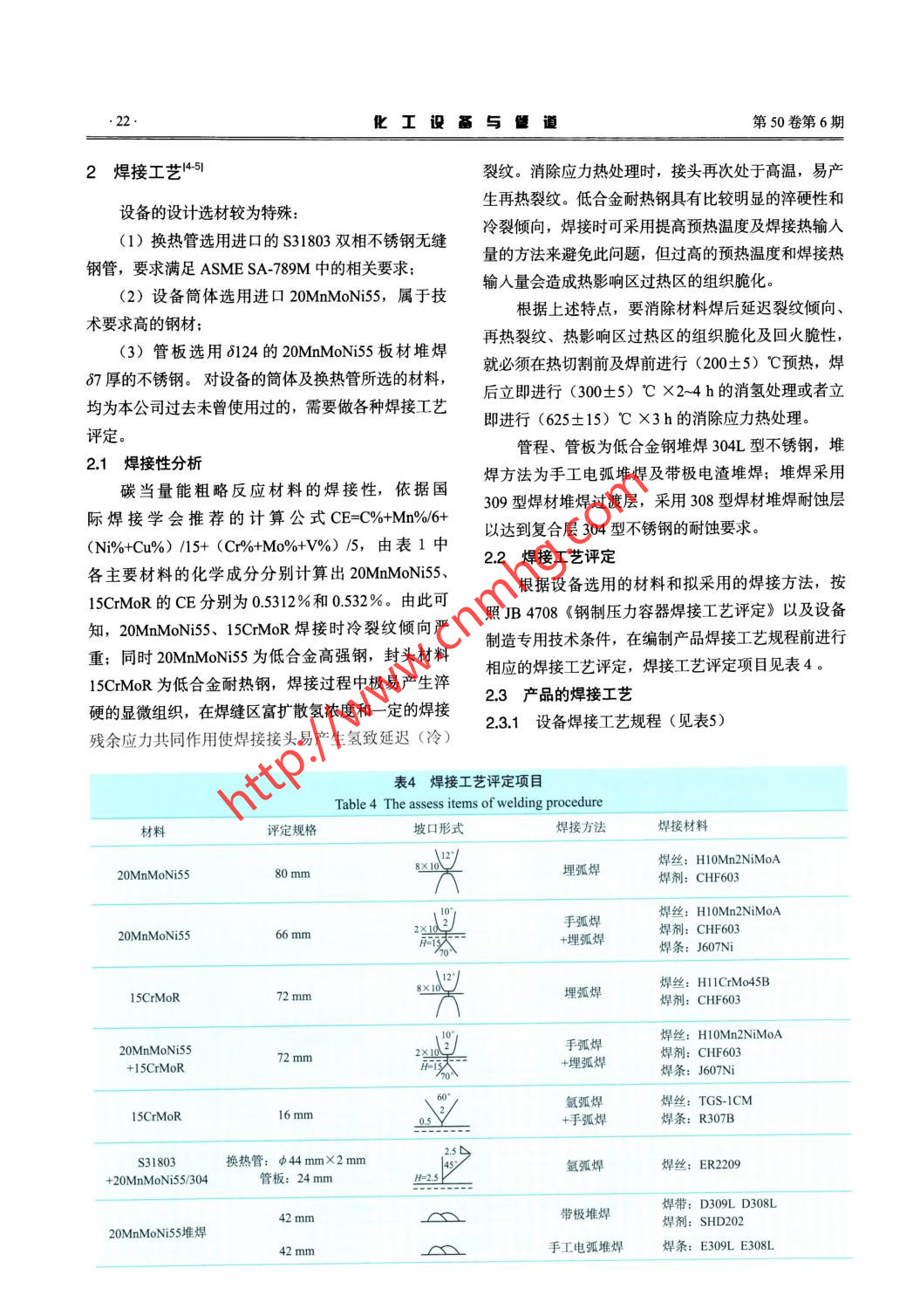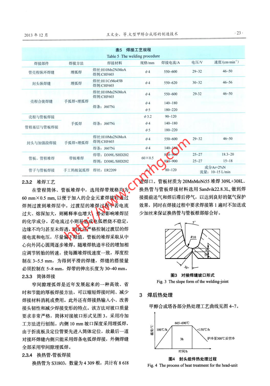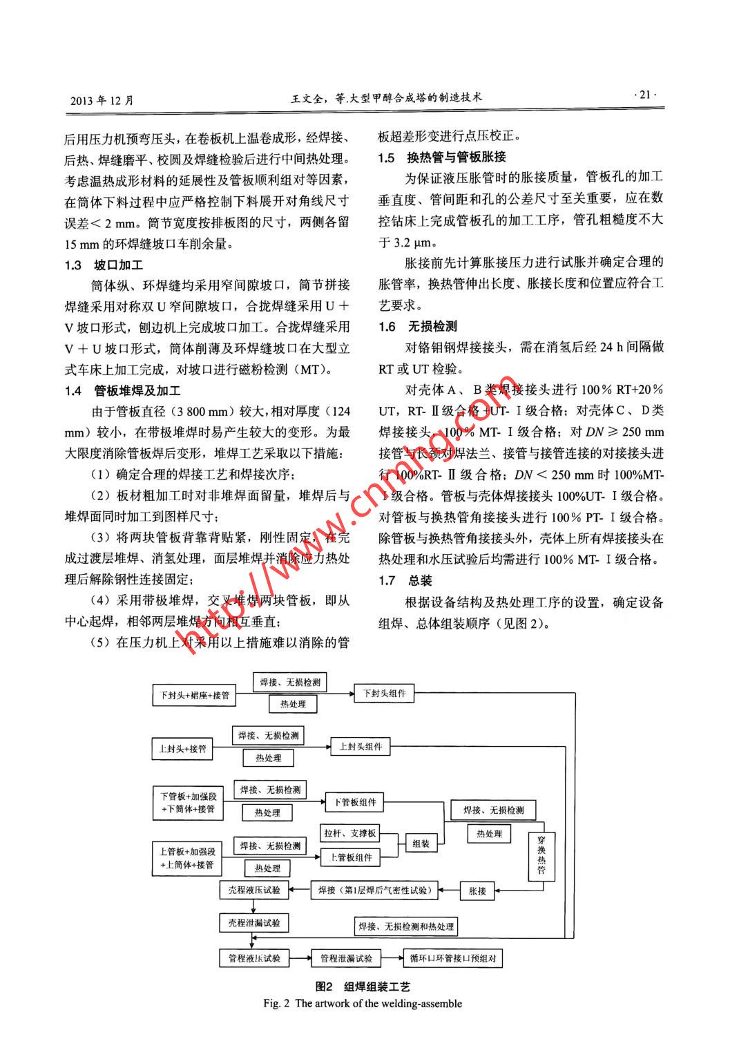 第50卷第6期化工設(shè)備與管道Vol. 50 No.62013年12月PROCESS EQUIPMENT & PIPINGDec. 2013大型甲醇合成塔的制造技術(shù)王文全,王風(fēng)友,岳偉,符治,楊文峰(中核集團(tuán)西安核設(shè)備有限公司,西安710021)摘要從材料、成形、加工、焊接、熱處理和無損檢測等方面介紹了250 kt/a甲醇合成塔的關(guān)鍵制造技術(shù)特點(diǎn)。關(guān)鍵詞甲醇合成塔; 成形;加工;焊接;熱處理;無損檢測中圖分類號: TQ 050.6; ThH 16文獻(xiàn)標(biāo)識碼: A文章編號: 1009-3281 (2013) 06-0019-006為某單位制造的250kt/a甲醇合成塔按結(jié)構(gòu)形表1技術(shù)特性式屬固定床式換熱反應(yīng)容器,是目前國內(nèi)同類合Table 1 Technique parameter table成塔中單體規(guī)模最大的。設(shè)備規(guī)格φ4 014 mmX技術(shù)參數(shù)殼程管程設(shè)計(jì)壓力/MPa5.8.713 881 mmX66 mm;殼體材質(zhì)20MnMoNi55;封設(shè)計(jì)溫度/C270275頭材質(zhì)15CrMoR;換熱管材質(zhì)S31803,數(shù)量4309工作壓力/MPa3..9根,規(guī)格φ44mmX2mmX7000mm;管板材質(zhì)工作溫度(進(jìn)出) /C220- 250225- 25520MnMoNi55堆焊308L,規(guī)格124+7 mm;換熱面工作介質(zhì)鍋爐給水合成氣、觸媒積3997m;設(shè)備總質(zhì)量203120kgo.水壓試驗(yàn)壓力MPa6.875 (臥試)11.3 (臥試)氣密性試驗(yàn)MPa甲醇合成塔結(jié)構(gòu)簡圖見圖1,技術(shù)特性見表1,腐蝕裕量/mm設(shè)備主要材料化學(xué)成分見表2,力學(xué)性能見表3。該換熱面積m23 997設(shè)備自投人使用后運(yùn)行一直良好,下面筆者就從主要1甲醇合成塔制造工藝1131零部件材料性能、成形加工、焊接、熱處理和無損檢測等方面介紹以下250kta甲醇合成塔的關(guān)鍵制造技由圖1結(jié)構(gòu)圖可見,此設(shè)備結(jié)構(gòu)較為特殊。術(shù)特點(diǎn),希望對同行有所幫助。(1)設(shè)備的上、下管板是鑲嵌在加強(qiáng)段簡體內(nèi)部,且均為雙面全焊透結(jié)構(gòu),焊肉較厚,因而易使管板產(chǎn)生焊接變形;(2)設(shè)備的支持板為整圓,決定了筒體的最終合攏焊縫必須在筒體的中間部位,且此條焊縫只能進(jìn)行局部熱處理;(3)設(shè)備的上、下封頭只有在換熱管與管板組焊完畢,殼程壓力試驗(yàn)合格后,才能與簡體組焊,且兩道環(huán)焊縫也只能做局部熱處理;(4)換熱管必須在組裝前逐根進(jìn)行水壓試驗(yàn),合格后才能用于組裝: .(5)換熱管與管板連接方式采用強(qiáng)度焊加貼脹,管箱簡體內(nèi)壁需進(jìn)行帶極堆焊。收稿日期: 2013-07-12圖1甲醇合 成塔結(jié)構(gòu)作者簡介:王文全(1967-),男,陜西西安人,工程師。從事Fig.1 The sketch of the equipment structure壓力容器的制造工作。2013年12月王文全,等.大型甲醇合成塔的制造技術(shù).21.后用壓力機(jī)預(yù)彎壓頭,在卷板機(jī)上溫卷成形,經(jīng)焊接、板超差形變進(jìn)行點(diǎn)壓校正。后熱、焊縫磨平、校圓及焊縫檢驗(yàn)后進(jìn)行中間熱處理。1.5 換熱管與管板脹接考慮溫?zé)岢尚尾牧系难诱剐约肮馨屙樌M對等因素,為保證液壓脹管時(shí)的脹接質(zhì)量,管板孔的加工在筒體下料過程中應(yīng)嚴(yán)格控制下料展開對角線尺寸垂直度、管間距和孔的公差尺寸至關(guān)重要,應(yīng)在數(shù)誤差< 2 mm。筒節(jié)寬度按排板圖的尺寸,兩側(cè)各留控鉆床上完成管板孔的加工工序,管孔粗糙度不大15 mm的環(huán)焊縫坡口車削余量。于3.2 um。1.3坡口加工脹接前先計(jì)算脹接壓力進(jìn)行試脹并確定合理的簡體縱、環(huán)焊縫均采用窄間隙坡口,筒節(jié)拼接脹管率,換熱管伸出長度、脹接長度和位置應(yīng)符合工焊縫采用對稱雙U窄間隙坡口,合攏焊縫采用U +藝要求。v坡口形式,刨邊機(jī)上完成坡口加工。合攏焊縫采用1.6 無損檢測V + U坡口形式,筒體削薄及環(huán)焊縫坡口在大型立對鉻鉬鋼焊接接頭,需在消氫后經(jīng)24h間隔做式車床上加工完成,對坡口進(jìn)行磁粉檢測(MT)。RT或UT檢驗(yàn)。1.4管板堆焊及加工對殼體A、B類焊接接頭進(jìn)行100%RT+20%由于管板直徑(3 800 mm)較大,相對厚度(124UT, RT- II級合格+UT- I級合格:對殼體C、D類mm)較小,在帶極堆焊時(shí)易產(chǎn)生較大的變形。為最焊接接頭,100%MT-I級合格;對DN≥250mm大限度消除管板焊后變形,堆焊工藝采取以下措施:接管與長頸對焊法蘭、接管與接管連接的對接接頭進(jìn)(1)確定合理的焊接工藝和焊接次序;行100%RT- I級合格; DN < 250 mm時(shí)100%MT-(2)板材粗加工時(shí)對非堆焊面留量,堆焊后與I級合格。管板與殼體焊接接頭100%UT- I級合格。堆焊面同時(shí)加工到圖樣尺寸:對管板與換熱管角接接頭進(jìn)行100% PT- I 級合格。(3)將兩塊管板背靠背貼緊,剛性固定,在完除管板與換熱管角接接頭外,殼體上所有焊接接頭在成過渡層堆焊、消氫處理,面層堆焊并消除應(yīng)力熱處熱處理和水壓試驗(yàn)后均需進(jìn)行100% MT- I級合格。理后解除鋼性連接固定;1.7 總裝(4)采用帶極堆焊,交叉堆焊兩塊管板,即從根據(jù)設(shè)備結(jié)構(gòu)及熱處理工序的設(shè)置,確定設(shè)備中心起焊,相鄰兩層堆焊方向相互垂直;組焊、總體組裝順序(見圖2)。(5)在壓力機(jī)上對采用以上措施難以消除的管焊接、無損檢測下封頭+裙座+接管下封頭組件熱處理上封頭+接管[ 焊接、無損檢測上封頭組件下管板+加強(qiáng)段下管板組件+下簡體+接管上管板+加強(qiáng)段| 焊接、無損檢測拉桿、支撐板組裝熱處理.|穿上