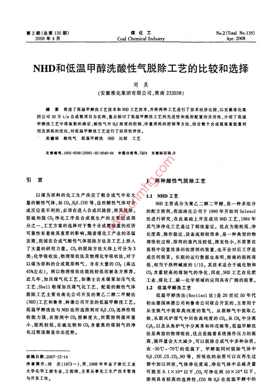 - 期刊名字:煤化工