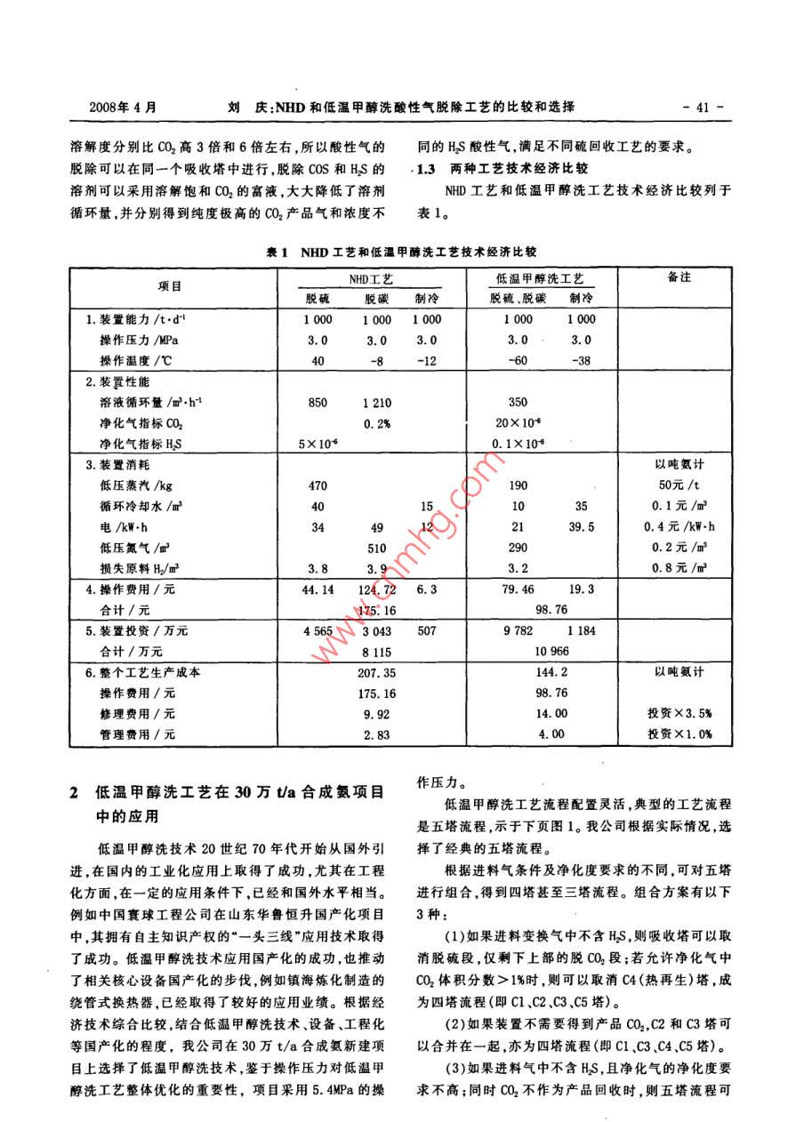 第2期(總第135期)煤化工No.2 (Total No 135)2008年4月Coal Chemical IndustApr.2008NID和低溫甲醇洗酸性氣脫除工藝的比較和選擇劉慶(安徽淮化集團(tuán)有限公司,淮南232038擴(kuò)要簡(jiǎn)述了低溫甲醇洗工藝技術(shù)和ND工藝技術(shù),并將兩種工藝進(jìn)行了技術(shù)經(jīng)濟(jì)比較,以安徽淮化集團(tuán)公司30萬(wàn)t/a合成氨項(xiàng)目為實(shí)例,重點(diǎn)探討了低溫甲醇洗工藝的先進(jìn)性和流程配置的靈活性,介紹了低溫甲醇洗工藝中塔板數(shù)的確定、酸性氣中HS濃度的控制、冷量消耗的控制等方法,結(jié)合整個(gè)合成氨裝置能量利用及消耗的優(yōu)化,對(duì)低溫甲醇洗工藝進(jìn)行了經(jīng)濟(jì)性評(píng)價(jià)。關(guān)鍵詞酸性氣低溫甲醇洗NHD比較工藝文章編號(hào):1005-9598(2008)-02-004004中圖分類(lèi)號(hào):TQ54文獻(xiàn)標(biāo)識(shí)碼:B引言1兩種酸性氣脫除工藝以煤為原料的化工生產(chǎn)決定了粗合成氣中有大11NHD工藝量的酸性氣體,如CQ2、HS、COS等,這些酸性氣體對(duì)合NHD主要成分為聚乙二醇二甲醚,是一種多組分成反應(yīng)是不利的,必須在進(jìn)入合成回路前將其脫除。的配方溶劑。我國(guó)南化公司于1980年開(kāi)始對(duì) Selexol脫硫和脫CO2凈化工序是合成氨生產(chǎn)的主要組成部法進(jìn)行研究,在此基礎(chǔ)上開(kāi)發(fā)成功NHD工藝,1984年分之一,工藝方案的選擇對(duì)于整個(gè)合成氨裝置的經(jīng)濟(jì)其氣體凈化工藝通過(guò)了部級(jí)鑒定。優(yōu)點(diǎn)為能耗低、凈可靠性有著極其重要的影響。隨著煤化工產(chǎn)業(yè)的迅猛化度高操作穩(wěn)定、設(shè)備流程較簡(jiǎn)單,是一種典型的物發(fā)展我國(guó)在合成氣酸性氣體脫除方法及工藝上投入理吸收過(guò)程溶劑的蒸汽壓較低,揮發(fā)性小,不需要在了大量的研究力量。CO2的脫除方法大體上可分為3流程中設(shè)置洗滌回收溶劑的裝置,也不會(huì)對(duì)后工序造類(lèi):化學(xué)吸收法物理吸收法及物理化學(xué)吸收法。對(duì)于成任何損害。長(zhǎng)期的運(yùn)行數(shù)據(jù)也表明,溶液的損耗很以煤為原料的合成氨原料氣,含有大量的CO2(高達(dá)低,相當(dāng)于熱鉀堿液的1/15。其技術(shù)適合于硫化物和45%左右),則以物理吸收法能耗較低而被各方推薦。C2含量較高的煤制氣的凈化,因此,ND工藝在化肥近幾年,加壓煤氣化工藝,如德士古水煤漿加壓氣化工業(yè)煤化工、碳一化學(xué)領(lǐng)域的應(yīng)用具有廣闊的前景。工藝、Shel1粉煤加壓煤氣化工藝,配套的酸性氣體12低溫甲醇洗工藝脫除工藝主要有南化公司開(kāi)發(fā)的聚乙二醇二甲醚法低溫甲醇洗法( Rectisol法)是20世紀(jì)50年代(NHD)工藝和魯奇、林德公司開(kāi)發(fā)的低溫甲醇洗工藝。初由德國(guó)林德公司和魯奇公司聯(lián)合開(kāi)發(fā)的,主要用于低溫甲醇洗法與ND法所選溶劑對(duì)HSCO2選擇性吸從變換氣中提取高純度的氫氣,從裂解氣中提取乙收能力強(qiáng),在溶劑中C2溶解度大,所需溶劑循環(huán)量炔,從鼓風(fēng)爐煤氣中回收高純度的CO2,從CH4中分離小,能耗較低,在硫化物和c2含量高的煤制氣的凈c品2,以及從焦?fàn)t氣中分離苯和環(huán)戊烯等。低溫甲醇洗化過(guò)程逐漸顯示出優(yōu)勢(shì)。法是典型的物理吸收,優(yōu)點(diǎn)是隨著系統(tǒng)操作壓力的提高,循環(huán)量會(huì)大大減少,可以脫除合成氣中多種雜質(zhì)在-30℃~-70℃的低溫下,甲醇能同時(shí)脫除氣體中收稿日期:2007-12-14HS、C0S、CS、CQ2、NO等,所吸收的雜質(zhì)可以在再生過(guò)作者簡(jiǎn)介:劉慶(1973-),男,1998年畢業(yè)于浙江工業(yè)程中加以回收,氣體凈化度高,凈化氣體中總硫含量大學(xué)化學(xué)工程專(zhuān)業(yè),工程師,主要從事化工生產(chǎn)技術(shù)管理可脫至0.1×106以下,CO2可凈化到10×106以下與開(kāi)發(fā)工作。溶劑具有較高的選擇性,CS和HS在低溫甲醇中的2008年4月劉慶:NHD和低溫甲醇洗酸性氣脫除工藝的比較和選擇41溶解度分別比C2高3倍和6倍左右,所以酸性氣的同的HS酸性氣,滿(mǎn)足不同硫回收工藝的要求。脫除可以在同一個(gè)吸收塔中進(jìn)行,脫除C0S和HS的13兩種工藝技術(shù)經(jīng)濟(jì)比較溶劑可以采用溶解飽和CQ2的富液,大大降低了溶劑NHD工藝和低溫甲醇洗工藝技術(shù)經(jīng)濟(jì)比較列于循環(huán)量,并分別得到純度極高的2產(chǎn)品氣和濃度不表1。衰1NHD工藝和低溫甲醇洗工藝技術(shù)經(jīng)濟(jì)比較項(xiàng)目NHD工藝低溫甲醇洗工藝備注脫硫脫碳制冷脫硫、脫碳制冷1.裝置能力/td001000100010001000操作壓力/MP3.03.03.0操作溫度/℃2.裝置性能溶液循環(huán)量/m3h501210凈化氣指標(biāo)CO20.2%20×10凈化氣指標(biāo)HS0.1X1063.裝置消耗以噸氨計(jì)低壓蒸汽/kg47050元/t循環(huán)冷卻水/m150.1元/m0.4元/kWh低壓氮?dú)?m30.2元/m3損失原料H/m30.8元4.操作費(fèi)用/元44.14124.726.379.4619.3合計(jì)/元175.165.裝置投資/萬(wàn)元4565304350797821184合計(jì)/萬(wàn)元8115109666.整個(gè)工藝生產(chǎn)成本207.35144.2以噸氨計(jì)操作費(fèi)用/元175.16修理費(fèi)用/元9.92投資×3.5%管理費(fèi)用/元投資×1.0%2低溫甲醇洗工藝在30萬(wàn)ta合成氨項(xiàng)目作壓力。低溫甲醇洗工藝流程配置靈活,典型的工藝流程中的應(yīng)用是五塔流程,示于下頁(yè)圖1。我公司根據(jù)實(shí)際情況,選低溫甲醇洗技術(s