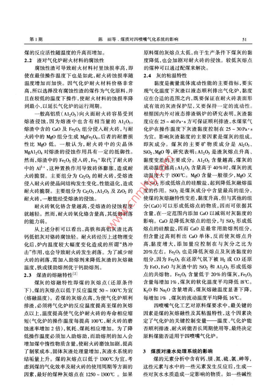 2010年2月大色阻Feb. 2010第33卷第1期Lange Scale Nitrogenous Fertilizer IndustryVol.33 No.1煤質(zhì)對四噴嘴氣化系統(tǒng)的影響陳麗王雷(兗礦國泰化工有限公司,山東滕州,77527)摘要簡要介紹不同煤質(zhì)的各種特性及其對煤漿制備氣化系統(tǒng)、渣水處理系統(tǒng)的影響,探索適于水煤漿氣化爐應(yīng)用的煤種,保證系統(tǒng)穩(wěn)定運(yùn)行,節(jié)約生產(chǎn)成本。關(guān)鍵詞煤質(zhì)水煤漿氣化適應(yīng)性摻燒混煤1煤質(zhì)對煤漿制備系統(tǒng)的影響強(qiáng)的分散性和穩(wěn)定性。煤種對添加劑的選擇性也1.1成漿性[川很強(qiáng),一種煤用某種添加劑可以制得性能優(yōu)越的影響煤成漿性的因素很多,如煤的種類,煤的水煤漿,但換一種煤卻不一-定行。根據(jù)兗礦國泰灰分含量,內(nèi)在水分含量,灰成分,煤的粒度分布,化工有限公司用煤特點(diǎn),磨煤用的添加劑一般選制備水煤漿用水特性,制漿溫度,攪拌時(shí)間強(qiáng)度,用造紙廢液,主要成分為木質(zhì)素磺酸鈉。添加劑的種類、用量等,且有些因索之間是密切相1.2煤的可磨性關(guān)的。其中最關(guān)鍵的是煤的種類、添加劑的質(zhì)量煤被破碎的難易程度稱為煤的可磨性,不同及用量。性能好的煤漿要有高的碳含量、低黏度,的煤有不同的可磨性指數(shù)。煤的可磨性直接影響表觀流動性、穩(wěn)定性好,析水率低等。- -般水煤漿磨煤機(jī)的工作狀況,既影響水煤漿的產(chǎn)量和質(zhì)量加壓氣化工藝要求煤漿濃度在60%以上,黏度小又影響磨煤機(jī)的電量消耗。于1.200Pa.so變質(zhì)程度淺的煤,內(nèi)表面大,吸附水多,不易制得高濃度煤漿,年老煤親水性官能團(tuán)2煤質(zhì)對氣化爐系統(tǒng)的影響少,與水的結(jié)合力弱,也不易制得高濃度煤漿。-.2.1反應(yīng)活性(碳轉(zhuǎn) 化率)般變質(zhì)程度較深,內(nèi)在水分含量較低的年輕煙煤煤在氣化爐內(nèi)的反應(yīng)時(shí)間--般為4~ 10s,這較易制出高濃度的水煤漿。煤的內(nèi)水含量越高,樣短暫的反應(yīng)時(shí)間,只有反應(yīng)速度很快才能達(dá)到煤中0/C越高,含氧官能團(tuán)和親水官能團(tuán)越多,較高的碳轉(zhuǎn)化率,而提高反應(yīng)溫度又受到耐火材孔隙率越大,煤的制漿難度越大。目前較為通用料使用壽命、設(shè)備材質(zhì)和運(yùn)行周期的限制,因此氣評價(jià)成漿性難易程度的數(shù)學(xué)模型如下:化原料煤要求有較高的反應(yīng)活性,才能使氣化反D=7.5 +0.5Mu -0.05Ha應(yīng)在瞬間完成。煤反應(yīng)活性主要與煤化程度有式中:M odr -煤的分析基最高內(nèi)在水分;關(guān),一般煤的反應(yīng)活性隨著煤化程度的加深而降Her-煤的哈氏可磨指數(shù);低。煤中礦物質(zhì)含量和組成對反應(yīng)活性也有影D-成漿難度指數(shù)。響,礦物質(zhì)含量高,降低了煤中固定碳含量,使反當(dāng)D≤4時(shí),煤易成漿;4< D≤7,成漿難易程應(yīng)活性降低。而礦物質(zhì)中的堿金屬化合物對碳與度-般;7< D≤10,難于成漿;D≥10,極難成漿。CO2的反應(yīng)起催化作用,使煤的反應(yīng)活性提高。煤的內(nèi)在水含量越高所制得的煤漿濃度越收稿8期:2009-03-18;收到修改稿日期201-22。低,而且使添加劑的消耗、煤耗氧耗均有一定的作者簡介:陳麗,女,1982 年出生,助理工程師,004年畢業(yè)增加。因此,一般水煤漿加壓氣化原料用煤的最于陜西科技大學(xué)應(yīng)用化學(xué)專業(yè),一直在兗礦國泰化工有限公司從高內(nèi)在水含量以M不大于8%為宜。制備水煤漿事煤化工技術(shù)工作。聯(lián)系電話: 0632-2368361; E-mail: ycqph @時(shí),加入添加劑可以改善水煤漿性能,添加劑有較163. com。第1期陳麗等.煤質(zhì)對四噴嘴氣化系統(tǒng)的影響51煤的反應(yīng)活性隨溫度的升高而增加。原料煤的灰熔點(diǎn)太低,由于生產(chǎn)條件下煤灰的黏2.2渣對氣化爐耐火材料的腐蝕性度降低,也會加劇對耐火磚的侵蝕。較低灰熔點(diǎn)腐蝕性渣可導(dǎo)致耐火材料襯里蝕損率高,即的煤種可以通過配煤來解決。使在最佳操作溫度下也是如此,耐火磚蝕損率隨2.4灰的粘溫特性溫度增加而加快。因氣化爐耐火材料價(jià)格非常黏度是衡量流體流動性能的主要指標(biāo),要實(shí)高,所以選擇沒有腐蝕性渣的煤作為氣化原料,并現(xiàn)氣化溫度下灰渣以液態(tài)順利排出氣化爐,黏度且在較低的溫度下操作,使耐火材料的蝕損率降應(yīng)在合適的范圍之內(nèi),既要保證在耐火磚表面形到最小,以延長氣化爐的運(yùn)行周期。成有效的灰渣保護(hù)層,又要保持一定的流動性。一般高鋁質(zhì)(A1203)向火面耐火磚容易受到根據(jù)國內(nèi)外對液態(tài)排渣鍋爐的研究表明,灰渣黏熔渣侵蝕,因?yàn)槿墼幸埠邢喈?dāng)量的Al203。度應(yīng)在25 ~ 40Pa*s方可保證順利排渣,水煤漿氣熔渣中含的CaO及Fe2O3 組分侵人耐火磚,與耐化爐在操作溫度下灰渣黏度控制在25 ~ 30Pa.s火磚中的MgO組分生成MgFe204,后者的耐磨損為宜。影響灰渣黏度的主要因素是煤灰的組成,性比MgO低。--般認(rèn)為,耐火磚中的尖晶體即灰成分。煤灰的主要礦物質(zhì)成分是Al203、MgAl2O4對熔渣的侵蝕作用具有一定的抵御性。SiO2、MgO等,研究表明:A1203是渣灰熔點(diǎn)升高、然而,熔渣中的Fe2O3侵人磚, Fe3+取代了耐火磚黏度變差的主要成分。Al2O3 含量越高,煤灰的中的AI+,這種置換作用導(dǎo)致磚體膨