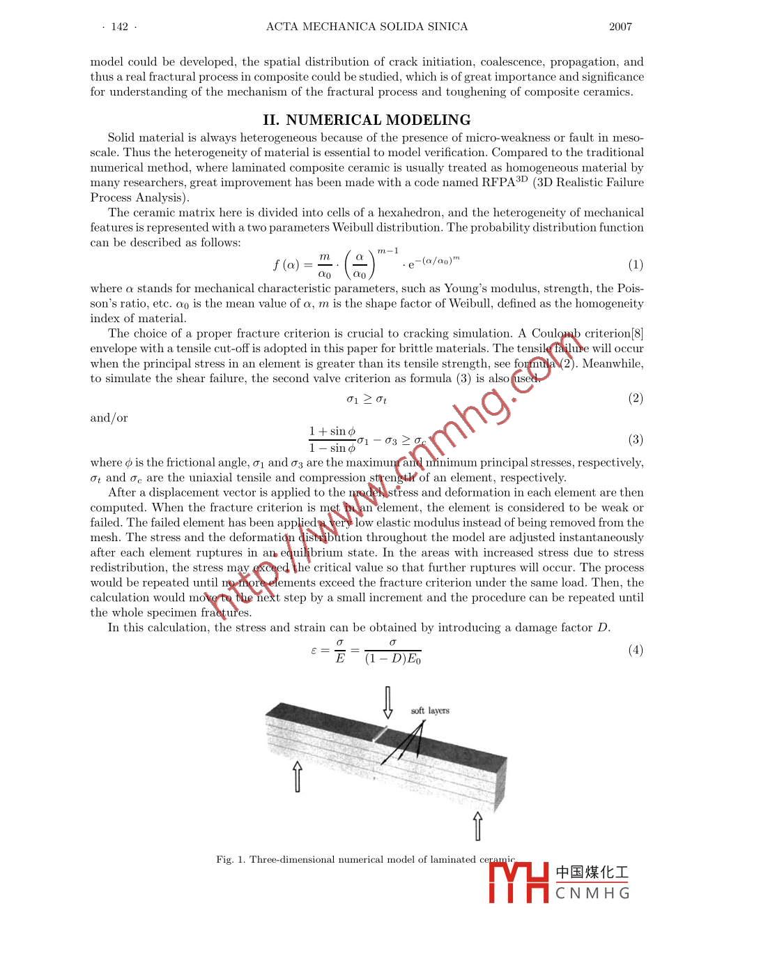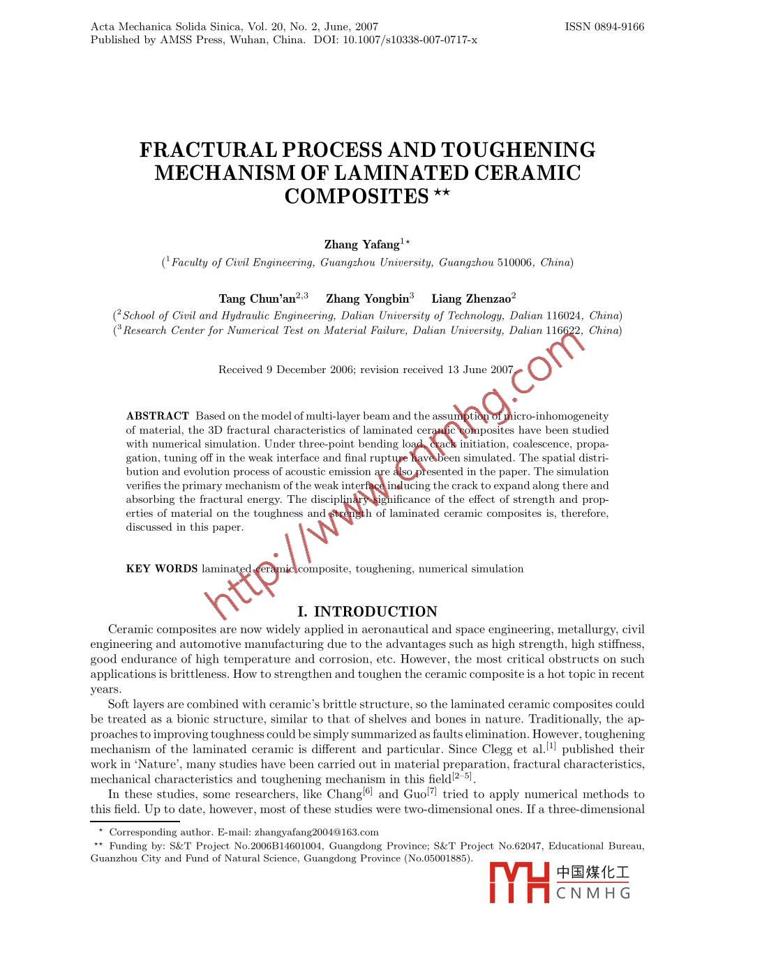 Acta Mechanica Solida Sinica, Vol. 20, No.2, June, 2007ISSN 0894-9166Published by AMSS Press, Wuhan, China. DOI: 10.1007/s10338-007-0717-xFRACTURAL PROCESS AND TOUGHENINGMECHA NISM OF LA MINATED CERA MICCOMPOSITES **Zhang Yafangl*( Faculty of Civil Engineering, Guangzhou University, Guangzhou 510006, China)Tang Chun'an2Zhang Yongbin3 Liang Zhenzao2(2 School of Ciwil and Hydraulic Engineering, Dalian University of Technology, Dalian 116024, China)(3 Research Center for Numerical Test on Material Failure, Dalian University, Dalian 116622, China)Received 9 December 2006; revision received 13 June 2007.ABSTRACT Based on the model of multi-layer beam and the assumption of micro-inhomogeneityof material, the 3D fractural characteristics of laminated ceramic composites have been studiedwith numerical simulation. U nder three-point bending load, crack initiation, coalescence, propa-gation, tuning off in the weak interface and final rupture have been simulated. The spatial distri-bution and evolution process of acoustic emission are also presented in the paper. The simulationverifies the primary mechanism of the weak interface inducing the crack to expand along there andabsorbing the fractural energy. The disciplinary significance of the effect of strength and prop-erties of material on the toughness and strength of laminated ceramic composites is, therefore,discussed in this paper.KEY WORDS laminated ceramic composite, toughening, numerical simulationI. INTRODUCTIONCeramic composites are now widely applied in aeronautical and space engineering, metallurgy, civilengineering and automotive manufacturing due to the advantages such as high strength, high stifness,good endurance of high temperature and corrosion, etc. However, the most critical obstructs on suchapplications is brittleness. How to strengthen and toughen the ceramic composite is a hot topic in recentyears.Soft layers are combined with ceramic's brittle structure, so the laminated ceramic composites couldbe treated as a bionice structure, similar to that of shelves and bones in nature. Traditionally, the ap-proaches to improving toughness could be simply summarized as faults elimination. However, tougheningmechanism of the laminated ceramic is different and particular. Since Clegg et al.l1] published theirwork in 'Nature,many studies have been carried out in material preparation, fractural characteristics,mechanical characteristics and toughening mechanism in this field2- 5].In these studies, some researchers, like ChanglO] and Guol7 tried to apply numerical methods tothis field. Up to date, however, most of these studies were two- dimensional ones. If a three-dimensional★Corresponding author. E-mail: zhangyafang2004@ 163.comsponan** Funding by: S&T Project No.2006B14601004, Guangdong Province; S&T Project No.62047, Educational Bureau,Guanzhou City and Fund of Natural Science, Guangdong Province (No.05001885).中國(guó)煤化工MHCNM HGACTA MECHANICA SOLIDA SINICA2007model could be developed, the spatial distribution of crack initiation, coalescence, propagation, andthus a real fractural process in composite could be studied, which is of great importance and significancefor understanding of the mechanism of the fractural process and toughening of composite ceramics.II. NUMERICAL MODELINGscale. Thus the heterogeneity of material is essential to model verification. Compared to the traditionalnumerical method, where laminated composite ceramic is usually treated as homogeneous material bymany researchers, great improvement has been made with a code named RFPA3D (3D Realistic FailureThe ceramic matrix here is divided into cells of a hexahedron, and the heterogeneity of mechanicalfeatures is represented with a two parameters Weibull distribution. The probability distribution functioncan be described as follows:f(a)="(9).e-(a/ao)where a stands for mechanical characteristic parameters, such as Young's modulus, strength, the Pois-son's ratio, etc. ao is the mean value of a, m is the shape factor of Weibull, defined as the homogeneityindex of material.The choice of a proper fracture criterion is crucial to cracking simulation. A Coulomb criterion[8]envelope with a tensile cut-off is adopted in this paper for brittle materials. The tensile failure will occurwhen the principal stress in an element is greater than its tensile strength, see formula (2). Meanwhile,to simulate the shear failure, the second valve criterion as formula (3) is also used.σ1≥σt(2)and/or.1+sinφ1- sinσ1-σ3≥σcwhere φ is the frictional angle, σ1 and σ3 are the maximum and minimum principal stresses, respectively,σt and σc are the uniaxial tensile and compression strength of an element, respectively.After a displacement vector is applied to the model, stress and deformation in each element are thencomputed. When the fracture criterion is met in an element, the element is considered to be weak orfailed. The failed element has been applied a very low elastic modulus instead of being removed from themesh. The stress and the deformation distribution throughout the model are adjusted instantaneouslyafter each element ruptures in an equilibrium state. In the areas with increased stress due to stressredistribution, the stress may exceed the critical value so that further ruptures will occur. The processwould be repeated until no more elements exceed the fracture criterion under the same load. Then, thecalculation would move to the next step by a small increment and the procedure can be repeated untilthe whole specimen fractures.In this calculation, the stress and strain can be obtained by introducing a damage factor D.(4)e=E=(1-D)Eosoft layersFig. 1. Three-dimensional numerical model of laminated (中國(guó)煤化工YHCNM HGVol. 20, No. 2 Zhang Yafang et al: Fractural Process and Toughening Mechanism of Composites143.and/orσ= Eo(1- D)e(5)where Eo and E are Young's moduli for the initial stage and damaged stage, respectively.For damage factor D, when no damage happ