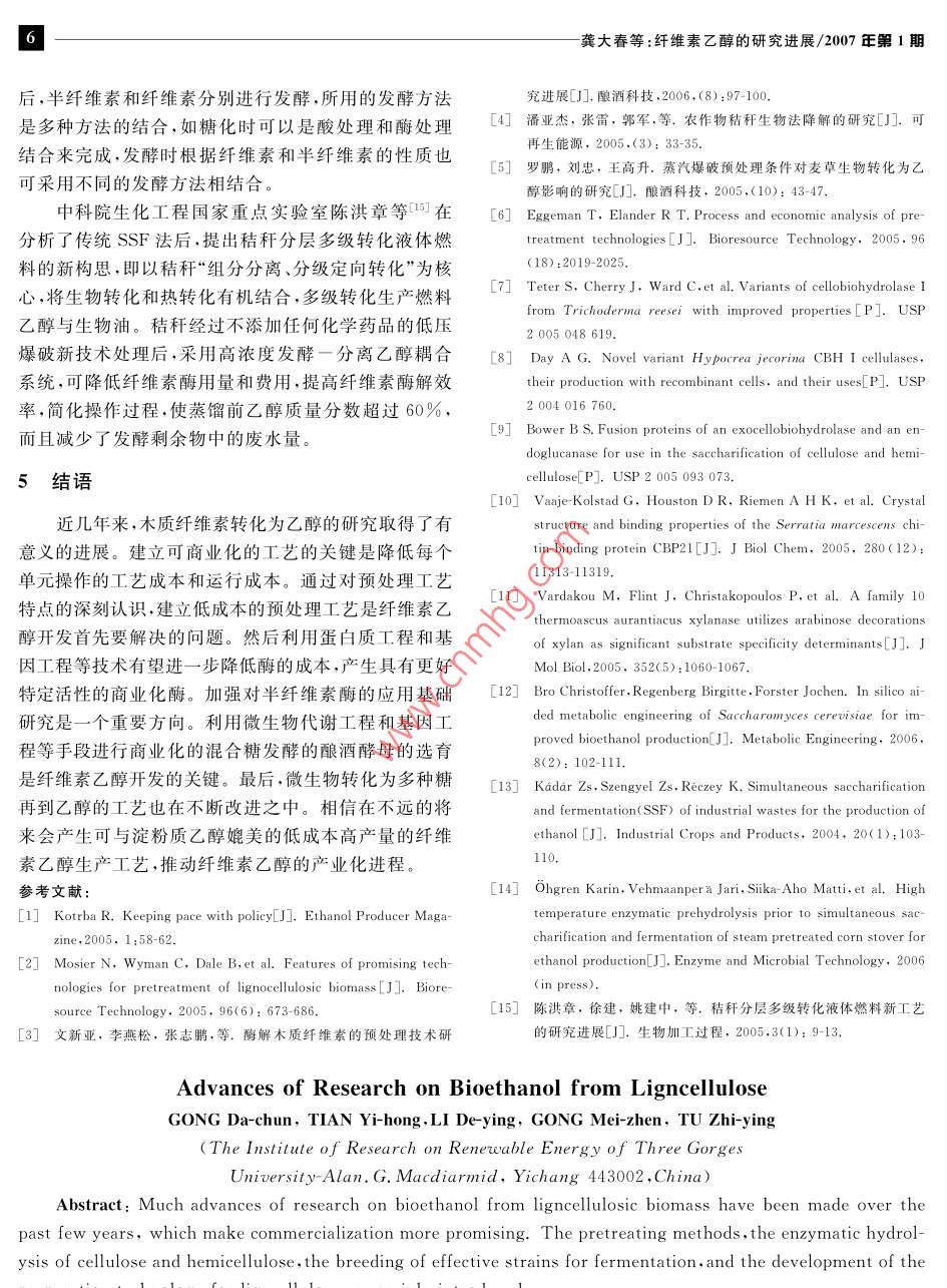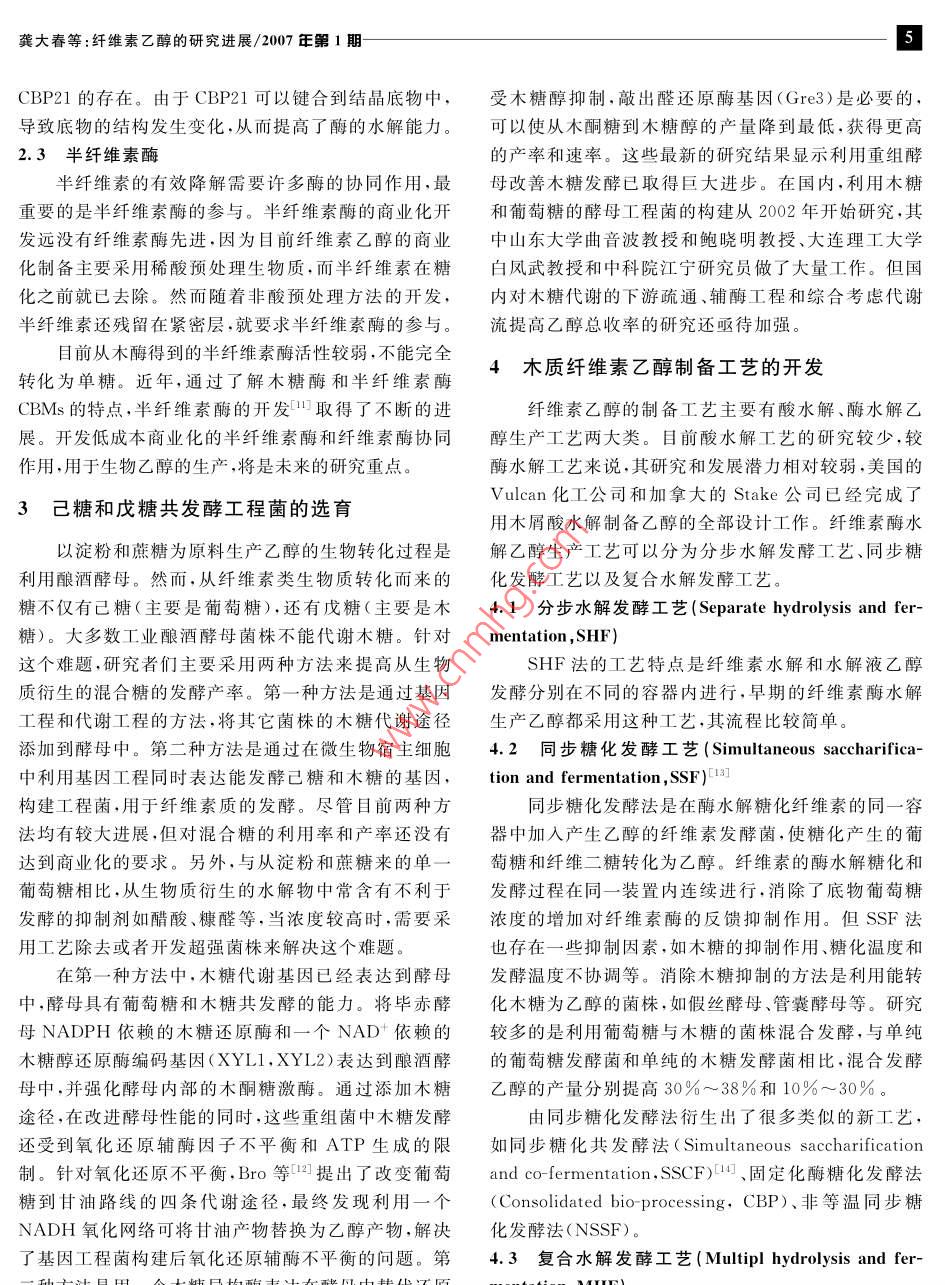 2007.Vl24N1化學(xué)與生物工程Chemistry Bioengineering纖維素乙醇的研究進(jìn)展龔大春,田毅紅,李德瑩,龔美珍,涂志英三峽大學(xué)—艾倫·麥克德爾米德再生能源研究所,湖北宜昌443002)摘要:近年來以纖維素類生物質(zhì)為原料制備乙醇的硏究取得了許多進(jìn)展,使纖維素乙醇的開發(fā)更具商業(yè)化前景重點(diǎn)介紹了木質(zhì)纖維素轉(zhuǎn)化為乙醇的原料預(yù)處理方法、纖維素和半纖維素的酶法降解、有效可靠的發(fā)酵菌種的選育及木質(zhì)纖維素乙醇制備工藝的開發(fā)關(guān)鍵詞:木質(zhì)纖維素;生物乙醇;進(jìn)展中圖分類號(hào):TQ223.12TQ517.44文獻(xiàn)標(biāo)識(shí)碼文章編號(hào):1672-5425(2007)01-0004-021世紀(jì)所面臨的能源、資源、環(huán)境等危機(jī),已成為進(jìn)一步降低酶制劑的成本人類文明發(fā)展的主要障礙。人們正在努力尋找替代化2.1產(chǎn)纖維素酶工程菌的構(gòu)建石燃料的新能源,以降低對(duì)不可再生能源的依賴、控制利用基因工程方法可改善纖維素酶的性能、降低二氧化碳的排放、保護(hù)生態(tài)環(huán)境。纖維素原料是地球糖化生物質(zhì)底物所需的酶量。對(duì)于纖維素酶工程菌最上產(chǎn)量最大的可再生資源,包括林木、農(nóng)作物秸稈、農(nóng)初的目標(biāo)是纖維二糖酶,它們?cè)谔烊焕w維素酶系中副產(chǎn)品加工下腳料等,在自然生態(tài)系統(tǒng)的能量流與物般占60%~80%。 Teter等利用定點(diǎn)突變、定向飽質(zhì)循環(huán)流中有重要地位,開發(fā)以木質(zhì)纖維素為原料制和突變、PCR擴(kuò)增和DNA分子進(jìn)化,產(chǎn)生了里氏木酶?jìng)湟掖嫉墓に囀俏磥硪掖忌a(chǎn)的發(fā)展方向的變種,突變株在酵母中表達(dá),通過選育改善其熱穩(wěn)定作者在此重點(diǎn)闡述近幾年有效的木質(zhì)纖維素生物性和熱活性。重組菌的綜合性能超過母本,用于預(yù)處轉(zhuǎn)化為乙醇的研究進(jìn)展。在生物轉(zhuǎn)化工藝中主要有三理后的玉米秸稈的水解。Day也利用定點(diǎn)突變,得步:纖維素預(yù)處理、纖維素酶解、酵母發(fā)酵及乙醇分離到新的 Hypocreajecorena纖維二糖酶Cel7A(CBH1)1纖維素預(yù)處理工藝變種,幾個(gè)突變株表達(dá)在里氏木酶中顯示出好的熱穩(wěn)定性和可逆性纖維素原料預(yù)處理方法主要有物理方法、化學(xué)方另一種方法是將異源酶引入里氏木酶系統(tǒng)中,加法、物理化學(xué)法和生物法。最有工業(yè)化前景的預(yù)處理方強(qiáng)整個(gè)體系的性能。 Bower介紹了將幾個(gè)菌的內(nèi)切法是物理化學(xué)法:低壓氨爆和CO爆破。在蒸汽爆破酶引入里氏木酶的方法。從 Acidothermus cellulo過程中,纖維素結(jié)晶度和聚合度下降,細(xì)胞結(jié)構(gòu)被破壞, oticus來的GH5A蛋白,被融合到里氏木酶的纖維二從而破壞纖維素一半纖維素一木質(zhì)素的結(jié)構(gòu),半纖維素糖酶中,表達(dá)在里氏木酶中,發(fā)現(xiàn)在纖維素的糖化過程通過自水解作用轉(zhuǎn)變成單糖和寡糖,部分木質(zhì)素的芳中具有更高的活性,結(jié)果顯示6h達(dá)到20%的纖維素醚鍵斷裂且發(fā)生部分縮合作用。由于化學(xué)方法涉及濃轉(zhuǎn)化率,用母本的纖維素酶則需要10h酸、濃堿,對(duì)生物質(zhì)的主要成分會(huì)有不同的影響。另外,2.2酶一底物相互作用機(jī)理的研究技術(shù)經(jīng)濟(jì)分析對(duì)主要的預(yù)處理方法進(jìn)行原料成本評(píng)價(jià)碳水化合物鍵合的模型(CBMs)表明,通過和結(jié)和性能評(píng)價(jià)對(duì)工業(yè)化工藝的選擇至關(guān)重要晶纖維素表面鍵合,靶向鎖定特定底物的催化活性中2纖維素和半纖維素的酶法降解心,通過提高表面的有效濃度,可加強(qiáng)酶的催化活性。同時(shí)有人認(rèn)為酶的靶點(diǎn)在取向時(shí),能裂解多糖的結(jié)構(gòu),近幾年,從細(xì)菌和真菌里分離得到新的纖維素酶從而加快水解速率。最近, Vaaje-Kolstad等0提出和半纖維素酶。依靠基因工程、酶工程和發(fā)酵工藝將有效的殼多糖降解取決于一個(gè)小的非催化蛋白基金項(xiàng)目:湖北省教育廳重大項(xiàng)目(D200613006)收稿日期:2006-10-11龔大春等:纖維素乙醇的研究進(jìn)展/2007年第1期CBP21的存在。由于CBP21可以鍵合到結(jié)晶底物中,受木糖醇抑制,敲出醛還原酶基因(Gre3)是必要的,導(dǎo)致底物的結(jié)構(gòu)發(fā)生變化,從而提高了酶的水解能力??梢允箯哪就堑侥咎谴嫉漠a(chǎn)量降到最低,獲得更高2.3半纖維素酶的產(chǎn)率和速率。這些最新的研究結(jié)果顯示利用重組酵半纖維素的有效降解需要許多酶的協(xié)同作用,最母改善木糖發(fā)酵已取得巨大進(jìn)步。在國(guó)內(nèi),利用木糖重要的是半纖維素酶的參與。半纖維素酶的商業(yè)化開和葡萄糖的酵母工程菌的構(gòu)建從2002年開始研究,其發(fā)遠(yuǎn)沒有纖維素酶先進(jìn),因?yàn)槟壳袄w維素乙醇的商業(yè)中山東大學(xué)曲音波教授和鮑曉明教授、大連理工大學(xué)化制備主要采用稀酸預(yù)處理生物質(zhì),而半纖維素在糖白鳳武教授和中科院江寧研究員做了大量工作。但國(guó)化之前就已去除。然而隨著非酸預(yù)處理方法的開發(fā),內(nèi)對(duì)木糖代謝的下游疏通、輔酶工程和綜合考慮代謝半纖維素還殘留在緊密層,就要求半纖維素酶的參與。流提高乙醇總收率的