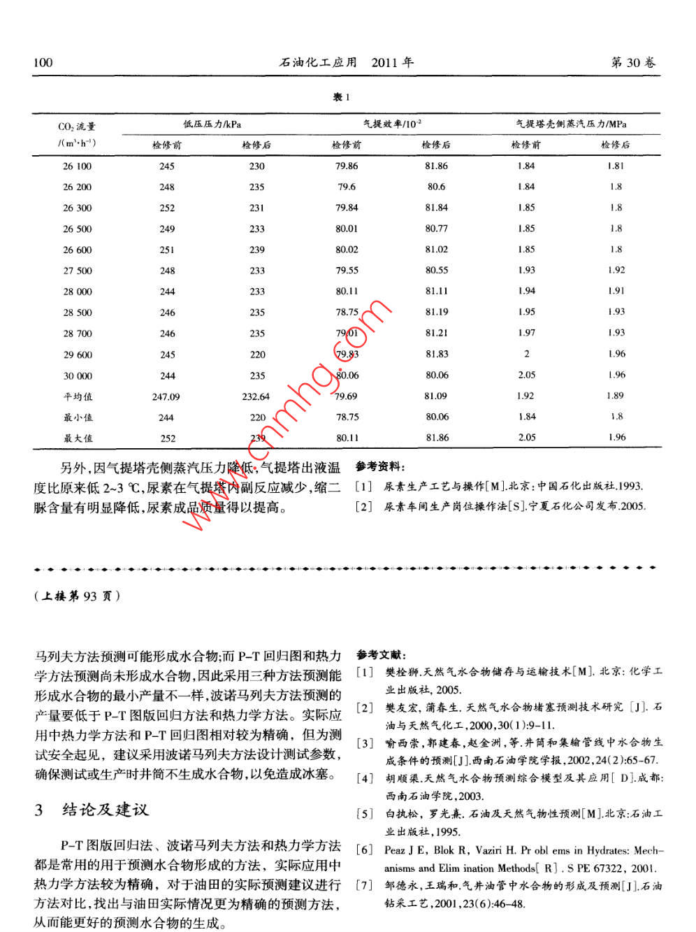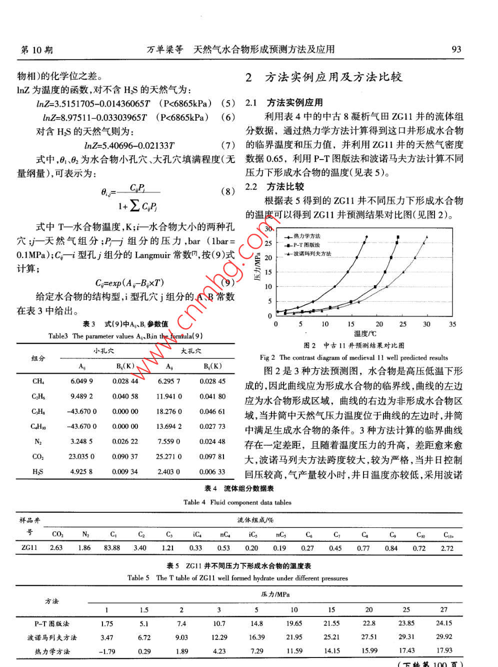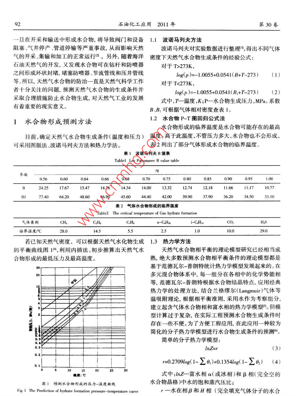 Vol30 No 10石油化工應(yīng)用第30卷第10期Oct 2011PETROCHEMICAL INDUSTRY APPLICATION20l1年10月天然氣水合物形成預(yù)測(cè)方法及應(yīng)用萬(wàn)單梁ψ,萬(wàn)單靜2,王喬1,康凱峰,楊雪1(1.長(zhǎng)江大學(xué)石油工程學(xué)院,湖北荊州434023;2.中原油田陜北勘探開(kāi)發(fā)處,河南濮陽(yáng)457001)摘要:在天然氣開(kāi)采及運(yùn)輸過(guò)程中,氣體組成、溫度、壓力和含水量成為水合物形成的主要原因,所以,天然氣水合物的形成預(yù)測(cè)方法和防治成為天然氣科學(xué)界十分關(guān)注的問(wèn)題。本文對(duì)常用的天然氣水合物的形成預(yù)測(cè)方法進(jìn)行介紹和對(duì)比,并應(yīng)用于油田實(shí)際的水合物生成預(yù)測(cè)。關(guān)鍵詞:天然氣;水合物;壓力;溫度;預(yù)測(cè)中圖分類號(hào):P744文獻(xiàn)標(biāo)識(shí)碼:A文章編號(hào):1673-5285(2011)10-0091-04The forecasting methods and application ofnatural gas hydrate formationWAN Danliang', WAN Danjing WANG Qiao, KANG Kaifeng, YANG Xue(I. College of Petroleum Engineering, Yangtze University, Jingzhou Hubei 434023China; 2. Zhongyuan Oilfield Northern Shanxi Exploration and Development, PuyangHenan, 457001, China)Abstract: In the course of natural gas mining and transportation, gas composition, tempera-ture, pressure and water content become the main causes of hydrate formation. The forecast-ing methods and prevention of natural gas hydrate formation become the issue of closely at-tention in natural gas science. This paper introduces and compares the common natural gashydrate formation forecast method, applying it in the actual oil field of hydrate formationforecastKey words: natural gas; hydrate; pressure; temperature; forecast天然氣開(kāi)采及儲(chǔ)運(yùn)過(guò)程中,當(dāng)天然氣處于飽和或天然氣中形成,但其條件是溫度極低,且誘導(dǎo)期很長(zhǎng)過(guò)飽和含水狀態(tài)時(shí)將有游離水析出,在足夠低的溫度而在天然氣采輸過(guò)程的工況條件下,形成穩(wěn)定水合物或足夠高的壓力條件下,由于壓力波動(dòng)氣體流向突變的前提則是必須有液相水存在。因此,對(duì)于任何組分的而產(chǎn)生的攪動(dòng)、酸性氣體的存在以及微小水合物晶核天然氣,在給定壓力和其它條件具備下可以形成水合的誘導(dǎo),天然氣中的碳?xì)浠衔锱c水組合形成一種復(fù)物。值得注意的是:一定組分的天然氣水合物必有一個(gè)雜但又不穩(wěn)定的白色晶體,即天然氣水合物,分子式臨界溫度,即水合物存在的最高溫度,高于臨界溫度般用M.nH2O,M為水合物中的氣體分子,n為水時(shí),再高的壓力也不能形成水合物。分子數(shù)。大量研究表明,水合物也有可能在未飽和的水合物的存在給實(shí)際生產(chǎn)、運(yùn)行帶來(lái)很大的危害,收稿日期:2011-07-27簡(jiǎn)介:萬(wàn)單梁,男(1983-),長(zhǎng)江大學(xué)石油工程專業(yè)在讀碩士研究生,主要從事油氣田開(kāi)發(fā)研究,郵箱:l79196805@q4com。石油化工應(yīng)用2011年第30卷旦在開(kāi)采和輸送中形成水合物,將導(dǎo)致閥門(mén)和設(shè)備11波諾馬列夫方法阻塞、氣井停產(chǎn)、管道停輸?shù)葒?yán)重事故,從而影響天然波諾馬列夫?qū)?shí)驗(yàn)數(shù)據(jù)進(jìn)行整理,得出不同氣體氣的開(kāi)采、集輸和加工的正常運(yùn)行。另外,隨著海洋密度下天然氣水合物生成條件的經(jīng)驗(yàn)公式石油天然氣的開(kāi)發(fā),又發(fā)現(xiàn)水合物可在鉆桿和防噴器對(duì)于T>273K,之間形成環(huán)狀封堵,堵塞防噴器、節(jié)流管線和壓井管線log(p)=-1.0055+0.0541(B+7-273)(1)等。所以,天然氣水合物的防治一直是天然氣科學(xué)工作對(duì)于T<273K,者十分關(guān)注的問(wèn)題,預(yù)測(cè)天然氣水合物的生成條件并log(p)=-1.005540.0541(B+7-273)(2)釆取合理措施防止水合物生成,對(duì)天然氣工業(yè)的發(fā)展式中,7一溫度,K;P一水合物生成壓力,MPa。系數(shù)有著重要的現(xiàn)實(shí)意義。B、B1可根據(jù)氣體相對(duì)密度查表1。1水合物形成預(yù)測(cè)方法1.2水合物PT圖回歸公式法水合物形成的臨界溫度是水合物可能存在的最高目前,確定天然氣水合物生成條件(溫度和壓力)溫度。高于此溫度,不管壓力多大,水合物也不會(huì)形成,可采用圖版法、波諾馬列夫方法和熱力學(xué)法。表2列出了部分氣體形成水合物的臨界溫度。表1波諾馬列夫B值表Tablel Ley ponomarev b value table參教0.560.640.700.750.850.900.9524.2517.67154714.76143414.0013.3212.74121811661.1710.77B77,4064.2048604690456044.40420039903790362034.5033.10表2氣體水合物形成的臨界溫度Table2 The critical temperature of Gas hydrate formation氣體類別CHaCHeCHEn-CLHIoi-CaHtoCOz臨界溫度/C28.014.55.52.5100290若已知天然氣密度,可以根據(jù)天然氣水化物生成1.3熱力學(xué)方法的平衡曲線圖1州,利用內(nèi)插法,初步推算出天然氣水天然氣水合物相平衡的理論模型研究已經(jīng)相當(dāng)成合物形成的最低壓力及最高溫度。熟,絕大多數(shù)預(yù)測(cè)水合物相平衡條件的理論模型都是基于范德瓦爾-普朗特統(tǒng)計(jì)熱力學(xué)模型發(fā)展起來(lái)的。在多元混合物體系中,每一組分在各相中的化學(xué)勢(shì)能相等,范德瓦爾-普朗特根據(jù)水合物結(jié)晶特點(diǎn),應(yīng)用經(jīng)典熱力學(xué)的處理方法,結(jié)合蘭格繆爾( Langmuir)氣體等溫吸附理論,根據(jù)相平衡準(zhǔn)則,采用水作為考察組分,建立起含氣體水合物相和富水相的熱