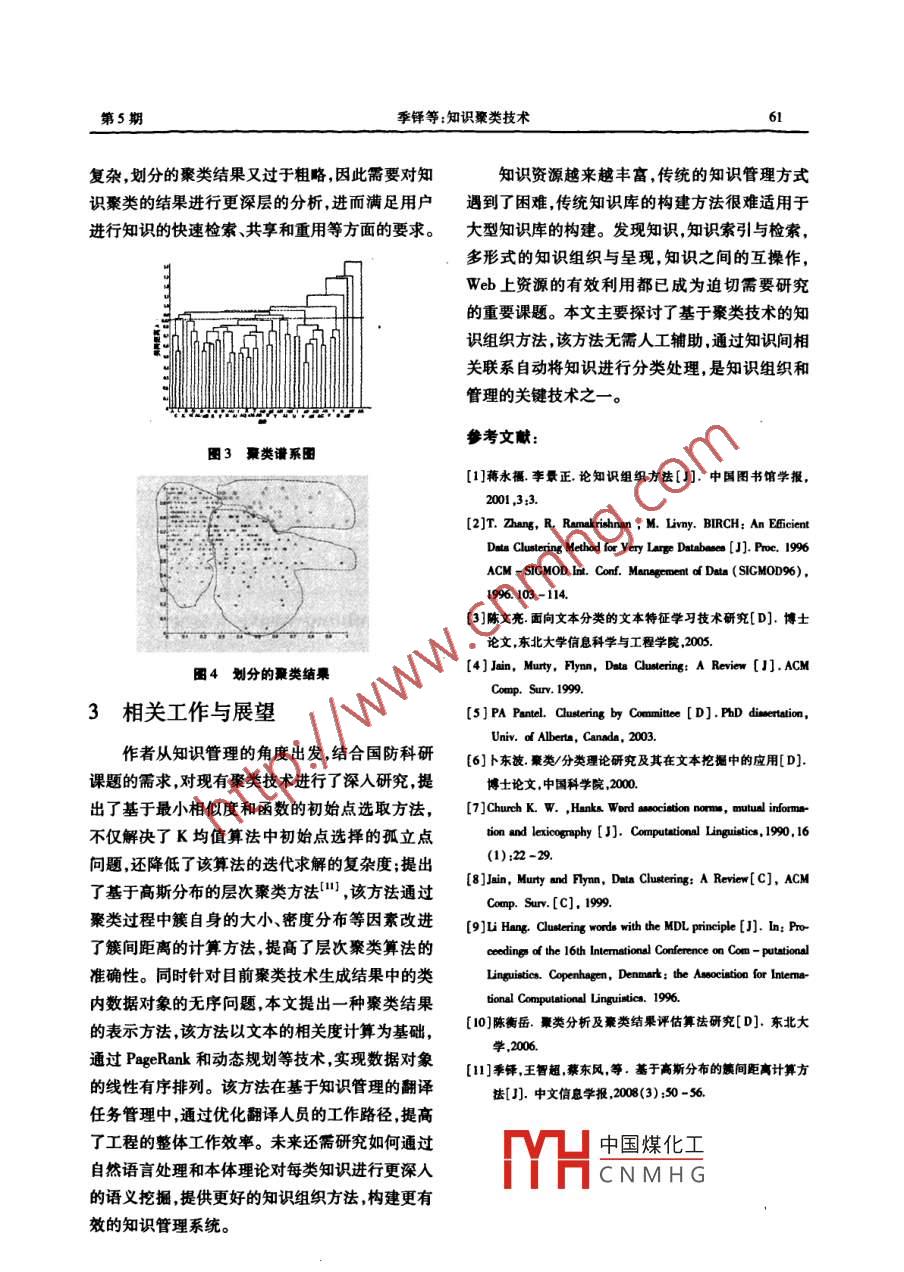 2008年10月沈陽(yáng)航空工業(yè)學(xué)院學(xué)報(bào)Oet. 2008第25卷第5期Joumal of Shenyang Institute of Aeronautical EngineeringVol. 25 No.5文章編號(hào):1007 - 1385(2008)05 -0058 -05知識(shí)聚類(lèi)技術(shù),季鋒苗霄霄(沈陽(yáng)航空工業(yè)學(xué)院知識(shí)工程中心,遼寧沈陽(yáng)100)4摘要:隨著知識(shí)管理的不斷深人,知識(shí)庫(kù)所 包容的知識(shí)內(nèi)容越來(lái)越多,如何建立知識(shí)的分類(lèi)體系,構(gòu)建合理的知識(shí)關(guān)聯(lián)顯得尤為重要。知識(shí)豪類(lèi)是- -種 無(wú)指導(dǎo)的自動(dòng)分類(lèi)方法,在知識(shí)的組織和管理中發(fā)揮著重要作用,不僅可以有效地節(jié)約知識(shí)庫(kù)優(yōu)化的人力資源,而且還可以更有效的反映知識(shí)間的本質(zhì)聯(lián)系。為此主要探討了知識(shí)豪類(lèi)的基本過(guò)程,包括知識(shí)特征的選取、相似度的計(jì)算和豪類(lèi)算法最后介紹了作者的- -些相關(guān)工作。關(guān)鍵詞:知識(shí)管理;知識(shí)豪類(lèi);知識(shí)庫(kù)中圈分類(lèi)號(hào):TP391.1文獻(xiàn)標(biāo)識(shí)碼:A .隨著互聯(lián)網(wǎng)的不斷發(fā)展,信息激增和信息超;的知識(shí)聚類(lèi)更具有實(shí)用的研究?jī)r(jià)值。載給用戶帶來(lái)了巨大的壓力和焦慮。單純的面向1聚類(lèi)分析技術(shù)文獻(xiàn)和網(wǎng)絡(luò)資源的信息組織形式已經(jīng)遠(yuǎn)遠(yuǎn)不能滿足用戶對(duì)有效知識(shí)的獲取和利用。用戶更多的是聚類(lèi)分析是數(shù)據(jù)挖掘技術(shù)中的重要組成部分,需要有價(jià)值和意義的情報(bào)和知識(shí)內(nèi)容,所以對(duì)現(xiàn)它能夠在數(shù)據(jù)中發(fā)現(xiàn)令人感興趣的分布模式。聚類(lèi)有的信息組織方法的擴(kuò)充和發(fā)展已經(jīng)上升到知識(shí)過(guò)程就是將-群( set)物理的或抽象的對(duì)象,根據(jù)它組織的層面,通過(guò)挖掘信息內(nèi)部更深層次的知識(shí)們之間的相似程度,分為若干組( group),其中相似內(nèi)容,為用戶提供更好的知識(shí)管理服務(wù)。的對(duì)象構(gòu)成-組。一個(gè)聚類(lèi)( cluster),又稱(chēng)簇,就是所謂知識(shí)組織就是將知識(shí)精煉的過(guò)程,是知由彼此相似的一組對(duì)象所構(gòu)成的集合,不同聚類(lèi)中識(shí)管理的重要環(huán)節(jié)之一。文獻(xiàn)[1]提到了七種組對(duì)象通常是不相似的。聚類(lèi)分析就是從給定的數(shù)據(jù)織方法,包括知識(shí)表示、知識(shí)重組、知識(shí)聚類(lèi)、知識(shí)集中搜索數(shù)據(jù)對(duì)象之間所存在的有價(jià)值聯(lián)系。而在存檢、知識(shí)編輯、知識(shí)布局和知識(shí)監(jiān)控。本文主要許多應(yīng)用中,一個(gè)聚類(lèi)中所有對(duì)象常??梢员划?dāng)作介紹有關(guān)知識(shí)對(duì)象按其屬性類(lèi)別加以集中整序或-個(gè)對(duì)象來(lái)進(jìn)行處理或分析。整合的知識(shí)聚類(lèi)過(guò)程。作為統(tǒng)計(jì)學(xué)的一個(gè)分支,聚類(lèi)分析已有多年的人工的知識(shí)聚類(lèi)方法多種多樣,包括以學(xué)科歷史,這些研究主要集中在基于距離的聚類(lèi)分析方聚類(lèi)、以主題概念聚類(lèi)、以人聚類(lèi)、以用聚類(lèi)和以面。許多統(tǒng)計(jì)軟件包,諸如:S - Plus, SPSS和SAS,時(shí)空聚類(lèi)等。人工的知識(shí)聚類(lèi)可以保證知識(shí)主題都包含基于k -均值、k -中心等諸多聚類(lèi)分析方法。劃分的合理性、準(zhǔn)確性,但在互聯(lián)網(wǎng)信息(主要是在機(jī)器學(xué)習(xí)中,聚類(lèi)分析屬于一種無(wú)指導(dǎo)的學(xué)習(xí)方網(wǎng)頁(yè)內(nèi)容信息)爆炸式增長(zhǎng)的前提下,需要支付法。與分類(lèi)學(xué)習(xí)不同,無(wú)指導(dǎo)學(xué)習(xí)不依靠事先確定大量的人力資源,另外知識(shí)的分類(lèi)體系的調(diào)整是的數(shù)據(jù)類(lèi)別,以及標(biāo)有數(shù)據(jù)類(lèi)別的學(xué)習(xí)訓(xùn)練樣本集一個(gè)不斷迭代的過(guò)程,其間還面臨對(duì)知識(shí)分類(lèi)體合。正因?yàn)槿绱?聚類(lèi)分析是一種觀察式學(xué)習(xí)法系不斷地進(jìn)行細(xì)化和擴(kuò)充,難以避免人員支出和(eaming by obervation) ,而不是示例式學(xué)習(xí)法( tea時(shí)間支出的無(wú)限制增長(zhǎng)。而知識(shí)聚類(lèi)技術(shù)可將采ming by example)。聚類(lèi)分析己被應(yīng)用到許多領(lǐng)域,集到的知識(shí)進(jìn)行無(wú)指導(dǎo)的自動(dòng)分析,有效地將知其中包括:模式識(shí)別、數(shù)據(jù)分析、市場(chǎng)分析等領(lǐng)域,特識(shí)按規(guī)定的分類(lèi)標(biāo)準(zhǔn)進(jìn)行劃分,保證了劃分的快別是“中國(guó)煤化工的一個(gè)重要手段速性和準(zhǔn)確率。與人工的知識(shí)聚類(lèi)相比,無(wú)指導(dǎo)發(fā)揮TYHCNMHG收稿日期:2008-03-252知識(shí)聚類(lèi)作者簡(jiǎn)介:浮鋒( 1981 -),男,遼寧葫蘆島人,助教,主要研究方向:信息檢索,E - mail:jiduo_ 1@ 163. com。知識(shí)聚類(lèi)是對(duì)采集的原始知識(shí)集合進(jìn)行劃分的第5期季鐸等:知識(shí)聚類(lèi)技術(shù)59- -種方法將-一個(gè)知識(shí)集劃分成不同的小類(lèi)。同類(lèi)方法可以改善性能。目前,特征選取的研究主要知識(shí)要盡量“緊密" ,而類(lèi)與類(lèi)之間的知識(shí)要盡量“疏是針對(duì)