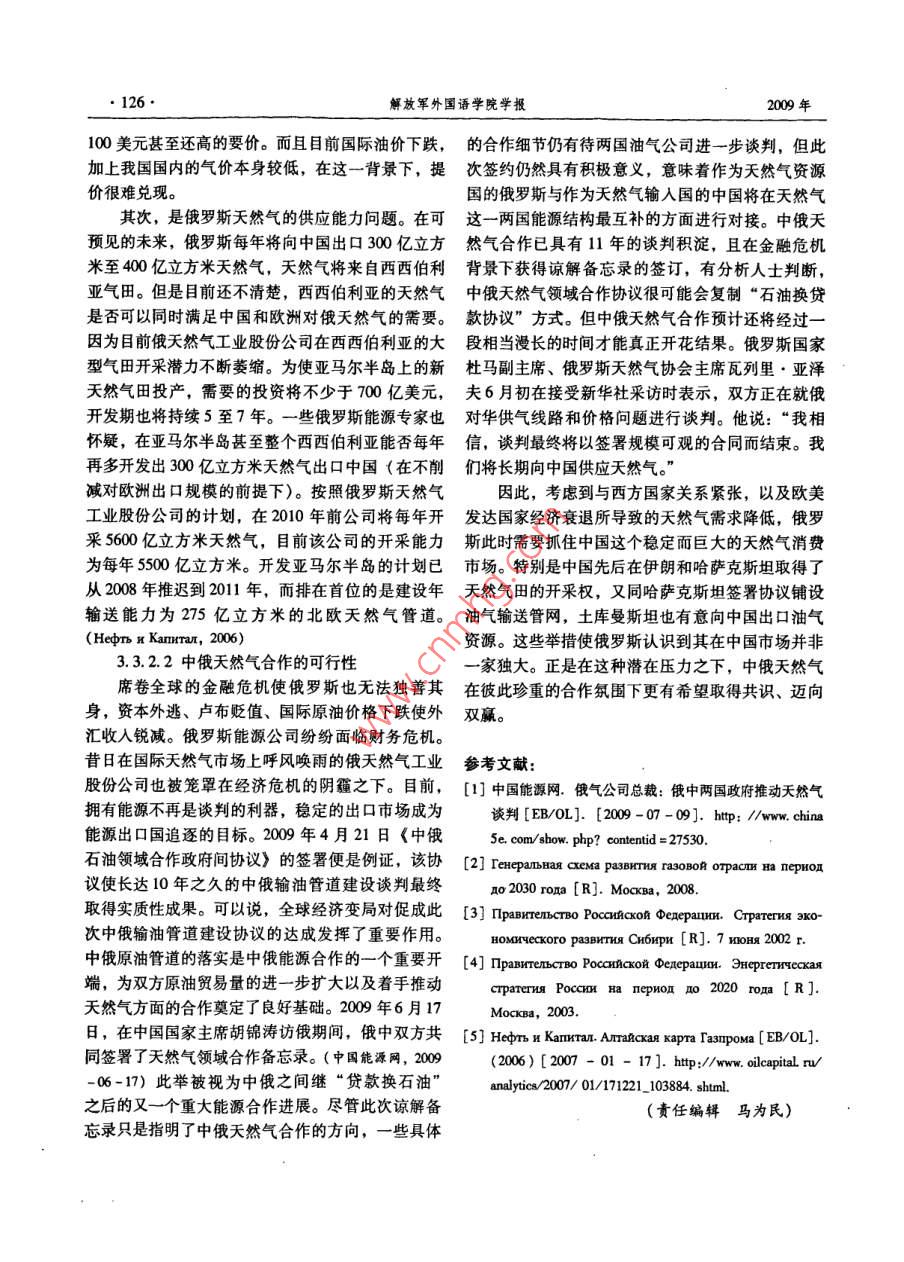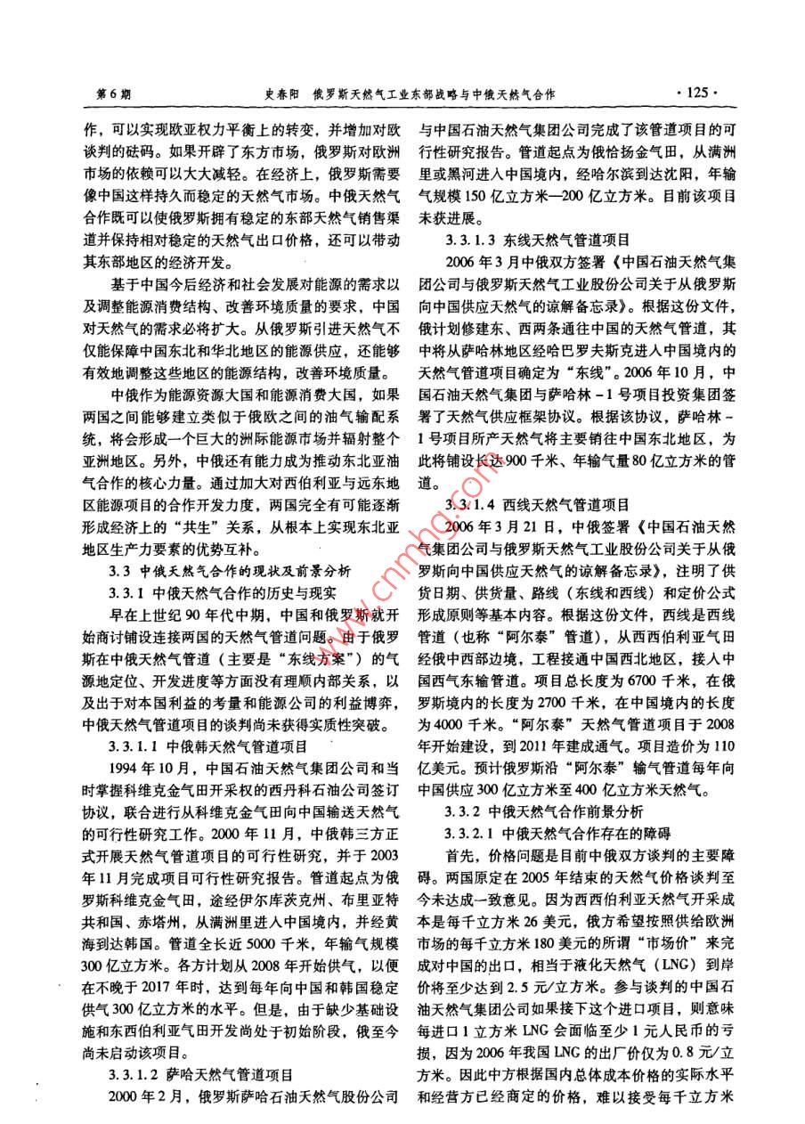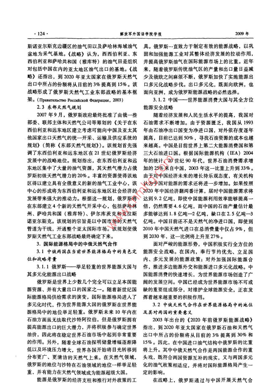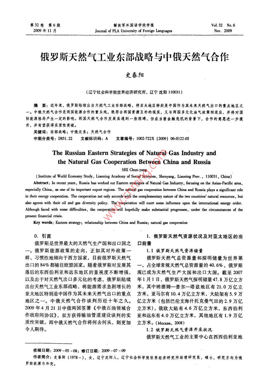 第32卷第6期解放軍外國語學院學報Vol 32 No 6009年11月oumal of PLA University of Foreign LanguagesNov.2009俄羅斯天然氣工業(yè)東部戰(zhàn)略與中俄天然氣合作史春陽(遼寧社會科學院世界經(jīng)濟研究所,遼寧沈陽110031)摘要:近年來,俄羅斯陸續(xù)出臺天然氣工業(yè)東部戰(zhàn)略,將亞大地區(qū)特別是中國作為其未來天然氣出口的重點地區(qū)之。中俄天然氣合作是兩國能源合作的重頭戲,既符合兩國資源互補的現(xiàn)實,又與兩國多元化油氣政策相適應,并將對國際能源格局產(chǎn)生一定的影響。兩國天然氣合作發(fā)展雖遇到一些阻礙,但在當前金融危機的背景下,合作的意愿進一步提升,并有望獲得實質性突破。關鍵詞:東部戰(zhàn)略;中俄關系;天然氣合作中圖分類號:D851.22文獻標識碼:A文章編號:1002-722X(2009)06012205The Russian Eastern Strategies of Natural Gas Industry andthe Natural Gas Cooperation Between China and RussiaSHI Chun-yang(Institute of World Economy Study, Liaoning Academy of Social Sciences, Shenyang, Liaoning Prov., 110031, China)Abstract: In recent years, Russia has worked out Eastem strategies of Natural Gas Industry, focusing on the Asian-Pacific area,especially China, as one of its important export regions. The natural gas cooperation between China and Russia plays a significant rolein their energy cooperation. The cooperation not only accords with the complementary nature of the two countries'natural resources, butalso agrees with their oil and gas diversity policy. The cooperation will exert some influence upon the intemational energy orderAlthough faced with some difficulties, the cooperation will hopefully make substantial progresses, under the circumstances of thepresent financial crisis.Key words: Eastern strategy: relationship between China and Russia; natural gas cooperation0.引言1.俄羅斯天然氣資源狀況及對亞太地區(qū)的出俄羅斯是世界最大的天然氣生產(chǎn)國和出口國之口前景俄羅斯能源政策的走向,正如其對外政策1.1俄羅斯天然氣資源儲量樣,習慣性地傾向于西方國家,目前俄羅斯天然氣俄羅斯天然氣總資源量和探明儲量為世界第出口的84%都輸往歐盟國家。隨著俄羅斯對發(fā)展其一,占全球常規(guī)天然氣總資源量的40.6%,俄羅斯落后的東西伯利亞和遠東地區(qū)的重視度不斷增強,現(xiàn)已成為天然氣生產(chǎn)大國和出口大國。截至2007以及出于對天然氣出口多元化的考慮,俄羅斯陸續(xù)年1月1日,俄羅斯天然氣探明儲量47.8萬億立方出臺天然氣工業(yè)東部戰(zhàn)略,將能源需求急劇增長的米,其中納德姆一普爾一塔茲地區(qū)有210萬億立亞太地區(qū)特別是中國作為其未來天然氣出口的重點方米,亞馬爾有10.4萬億立方米,大陸架有59萬地區(qū)之一。中俄天然氣合作談判歷經(jīng)十年之久。億立方米(包括巴倫支海什托克曼氣田的29萬億2009年4月21日中俄兩國簽署《中俄石油領域合立方米),俄歐大陸有46萬億立方米,東西伯利作政府間協(xié)議》,雙方獲得輸油管道建設談判的實亞和遠東有40萬億立方米,其他地區(qū)有1.9萬億質性突破。而中俄天然氣合作將何去何從,則更加立方米。( MocKBa,2006)令人期待。1.2俄羅斯天然氣資源開采狀況俄羅斯天然氣工業(yè)的主要中心在西西伯利亞地收稿日期:200-05-08;修訂日期:200-07-09作者簡介:史春陽(1978-),女,遼寧沈陽人,遼寧社會科學院世界經(jīng)濟研究所助理研究員,碩士,研究方向為俄羅斯能源與外交。史春陽俄羅斯天然氣工業(yè)東部戰(zhàn)略與中俄天然氣合作123區(qū)。20世紀七八十年代,在西西伯利亞石油天然氣立方米。2020年俄羅斯向亞太國家出口液化氣將達產(chǎn)區(qū)的北部形成了世界最大的天然氣工業(yè)綜合體。到200億立方米,到2030年達到266億立方米。90年代初,蘇聯(lián)的天然氣開采量超過了8000億立2.俄羅斯天然氣工業(yè)東部戰(zhàn)略方米,占世界總采量的40%以上。蘇聯(lián)解體后,俄從2002年俄羅斯政府確定的《西伯利亞經(jīng)濟羅斯受90年代經(jīng)濟危機的影響和油氣公司改革、發(fā)展戰(zhàn)略》到2007年9月出臺的《東部天然氣規(guī)勘探開發(fā)投資不足、國內氣價低迷等因素制約,致劃》,俄羅斯天然氣工業(yè)東部戰(zhàn)略逐漸形成并最終使天然氣年產(chǎn)量從191年的6430億立方米降到確定下來,其中體現(xiàn)的俄羅斯國家理念是以發(fā)展俄1997年的5570億立方米,進入天然氣產(chǎn)量低谷,羅斯東部天然氣綜合體系來一方面滿足俄國內和東按可比價計算的固定資本投資額僅為1990年的部地區(qū)的天然氣需求,另一方面開拓亞太市場,擺41.5%。近年來,由于2001年底扎波里亞爾巨型脫對歐洲的依賴,并奠定其在亞太天然氣市場的大氣田投入開發(fā)、2004年佩斯佐夫大型氣田投產(chǎn),俄國地位。羅斯天然氣產(chǎn)量下降的趨勢有所緩解并保證了天然2.1西伯利亞經(jīng)濟發(fā)展戰(zhàn)略氣開采量的增長,200年已經(jīng)達到6540億立方米。200年6月俄羅斯政府確定了《西伯利亞經(jīng)濟俄羅斯天然氣年產(chǎn)量由1996-1997年的低谷恢復發(fā)展戰(zhàn)略》。該戰(zhàn)略指出了決定西伯利亞經(jīng)濟發(fā)展到1991年天然氣產(chǎn)量的高峰水平,并創(chuàng)歷史新高,前景和其在俄羅斯經(jīng)濟地位中的主要因素之一就是年增長速度為2%-2.5%。該地區(qū)巨大的資源潛力,包括礦產(chǎn)資源,同時也指按照《俄羅斯2020年前的能源戰(zhàn)略》對天然出制約西伯利亞經(jīng)濟