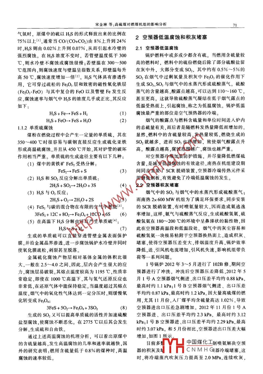 江蘇電機(jī)工程第3卷第5期702014年9月Jiangsu Electrical Engineering高硫煤對(duì)燃煤機(jī)組的影響分析宋金琳',張光2(1.江蘇省電機(jī)工程學(xué)會(huì),江蘇南京20020:2.江蘇南熱發(fā)電有限責(zé)任公司,江蘇南京20035)摘要:通過對(duì)南熱2*600 MW機(jī)組鍋爐水冷壁的高溫腐蝕.空預(yù)器的低溫腐蝕及積灰堵塞和脫硫系統(tǒng)的情況分析,對(duì)鍋爐高溫腐蝕和低溫腐蝕機(jī)理進(jìn)行了闡述,論迷了燃用高硫謀對(duì)機(jī)組運(yùn)行帶來的危害及應(yīng)對(duì)措施。關(guān)鍵詞:高硫堞;高溫腐蝕;空預(yù)器;堵塞;脫硫中圖分類號(hào):TK224.9文獻(xiàn)標(biāo)志碼:B文章編號(hào):1009 0665<2014)05- 0070-03隨著電廠煤炭市場的放開,鍋爐設(shè)計(jì)煤種很難保表1 1號(hào)鍋爐燃燒器區(qū)域水冷壁測厚mm證,大量的高硫煤進(jìn)人爐內(nèi)燃燒,造成爐內(nèi)高溫燃燒序號(hào)A層C層D層 F層區(qū)域的水冷壁大面積腐蝕和空預(yù)器冷端的低溫腐蝕、6.2.6.4 6.7,6.5 6.3.6.6 6.4.6.1積灰堵塞,嚴(yán)重影響火電機(jī)組的安全運(yùn)行。文中以江6.4.6.5 6.4.6.6 6.6.6.3 6.2.6.5蘇南熱發(fā)電有限責(zé)任公司(以下簡稱南熱)2x 6006.8.6.4 6.3.6.5 6.6.6.2 6.6,6.5Mw燃煤機(jī)組為例,分析水冷壁高溫腐蝕的機(jī)理,并6.1.6.5 6.3.6.5 6.1.6.5 6.6.6.1就燃用高硫煤帶來水冷壁高溫腐蝕、空預(yù)器積灰堵56.7.6.3 6.3,6.2 6.5.6.4 6.5.6.2平均6.436.43 6.416.37塞脫硫系統(tǒng)的危害和采取的對(duì)策進(jìn)行了介紹。抽樣測厚,高溫腐蝕減薄量最大1.1mm,最小0.1mm,1水冷壁高溫腐蝕平均約0.6 mm。南熱2x600MW超臨界機(jī)組鍋爐型號(hào)為通過上述檢查、測厚發(fā)現(xiàn),2臺(tái)鍋爐才運(yùn)行2年左HG- 1965/25.4 YM5,為一次中間再熱.超臨界壓力變右,水冷璧區(qū)域的高溫腐蝕已經(jīng)相當(dāng)嚴(yán)重,為此在機(jī)組壓運(yùn)行帶內(nèi)置式再循環(huán)泵啟動(dòng)系統(tǒng)的直流鍋爐,單爐檢修期間,對(duì)1號(hào)2號(hào)鍋爐的水冷壁進(jìn)行了大面積的膛平衡通風(fēng)、固態(tài)排渣、全鋼架、全懸吊結(jié)構(gòu)、π型布防腐噴涂,以期適當(dāng)減緩高溫腐蝕的發(fā)生。2012年3月置。鍋爐島為露天布置。鍋爐同步安裝選擇性催化還.1號(hào)機(jī)組102B級(jí)檢修對(duì)水冷壁腐蝕嚴(yán)重區(qū)域進(jìn)行了防原法(SCR)脫硝裝置。脫硫系統(tǒng)采用石灰石一石膏濕腐噴涂。(1)前后墻:上自中間層燃燒器(A .D層燃燒法脫硫工藝。鍋爐設(shè)計(jì)煤種為神府煤,校核煤種為淮器)上部1.5m處(標(biāo)高27.7m),下至水冷壁拐角下1南煤。m處(標(biāo)高17.2m)以上區(qū)域,噴涂面積約為500m;南熱1號(hào).2號(hào)機(jī)組分別于2010年1月和8月(2)兩側(cè)墻:上自燃燼風(fēng)燃燒器噴口中心下1.5m處通過168h試運(yùn)行。由于煤炭市場變化.燃用煤種偏(標(biāo)高34.7m),下至水冷壁拐角下1m處(標(biāo)高17.2離設(shè)計(jì)煤種較多,尤其在2012年大量高硫煤的燃用m)以上區(qū)域,噴涂面積約為550m2。2013年2月I號(hào)機(jī)導(dǎo)致鍋爐水冷壁高溫腐蝕嚴(yán)重。2012年3月1號(hào)機(jī)組103C級(jí)檢修期間對(duì)上述噴涂區(qū)域進(jìn)行了檢查,總體組102B和2月2號(hào)機(jī)組臨檢期間發(fā)現(xiàn)2臺(tái)鍋爐水效果較好,未發(fā)現(xiàn)噴涂層大面積脫落及高溫腐蝕情況,冷壁燃燒器區(qū)域及兩側(cè)墻均發(fā)生大面積高溫腐蝕,面局部由于噴砂除銹不徹底,小范圍出現(xiàn)噴涂層脫落,在積均高達(dá)1600m2,腐蝕減薄嚴(yán)重處高達(dá)1.2mm。此次103C級(jí)檢修中進(jìn)行了二次處理。1號(hào)鍋爐高溫腐蝕主要集中在前墻A層(中層)1.1高溫腐蝕的機(jī)理燃燒器、后墻D層(中層)燃燒器下方及周圍區(qū)域以鍋爐水冷壁的高溫腐蝕是--個(gè)及其復(fù)雜的物理化及兩側(cè)墻區(qū)域,對(duì)上述區(qū)域分別在燃燒器噴口下方學(xué)過程,研究表明:水冷壁的高溫腐蝕大多屬于硫化物500mm處和相鄰燃燒器區(qū)域抽取2點(diǎn)進(jìn)行測厚,結(jié).型腐蝕,其腐蝕產(chǎn)物主要是鐵的硫化物和氧化物。引起果見表1。該處水冷壁管設(shè)計(jì)為D38*7.3 mm,由表1硫化物型高溫腐蝕的主要原因是煤粉在缺氧條件下燃可以看出高溫腐蝕減薄量最大1.2mm,最小0.5mm,燒產(chǎn)生了HS以及游離態(tài)硫,其與管壁基體金屬鐵以及平均約0.9 mm。鐵的氧化物發(fā)中國煤化工2號(hào)鍋爐高溫腐蝕同樣主要集中在前后墻燃燒1.1.1硫化氫THCNMHG器區(qū)域及兩側(cè)墻熱負(fù)荷較高區(qū)域,對(duì)上述區(qū)域進(jìn)行了研究表明: M勝rI遼里工(示數(shù)a<1.00以及當(dāng)水冷壁附近因煤粉濃度過高,空氣量不夠而出現(xiàn)還原性收稿日期:2014-03- -20;修回日期:2014- 05-12宋金琳等:高硫煤對(duì)燃煤機(jī)組的影響分析7氣氛時(shí),原煤中的硫以H2S的形式釋放出來的比例在2空預(yù)器低溫腐蝕和積灰堵塞.75%以上甲,通常當(dāng)CO/(CO+CO2)由8%上升到24%時(shí),H2S則由0.02%上升到0.07%,從而引起水冷壁的2.1空預(yù)器低溫腐蝕強(qiáng)烈腐蝕。在H2S濃度不變時(shí),若管壁溫度低于300鍋爐燃料中或多或少都含有硫。當(dāng)燃用含硫量較C,則水冷壁不腐蝕或腐蝕很慢;若壁溫在300~500高的燃料時(shí),燃料中的硫份燃燒后除了部分硫酸鹽留C范圍內(nèi),則腐蝕速度與壁溫呈指數(shù)關(guān)系,即壁溫每升在灰中外,大部分變成SO2,其中約有0.5%~5%的高50 C,腐蝕速度