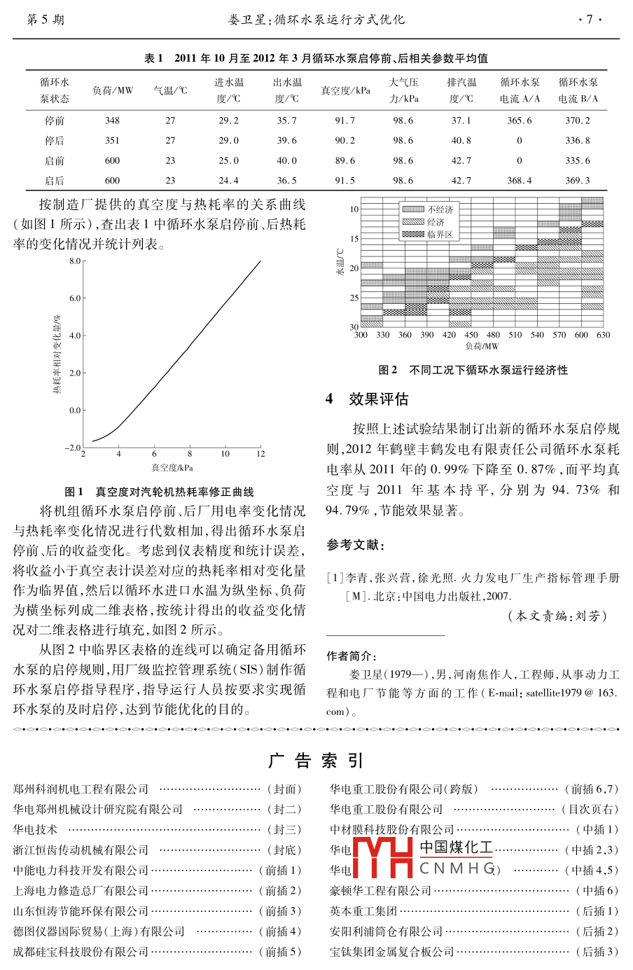 第36卷第5期華電技術(shù)Vol.36 No. 52014年5月Huadian TechnologyMay.2014循環(huán)水泵運(yùn)行方式優(yōu)化婁衛(wèi)星(鶴壁豐鶴發(fā)電有限責(zé)任公司,河南鶴壁458008 )摘要:目前很多電廠循環(huán)水泵運(yùn)行方式不盡合理,影響機(jī)組經(jīng)濟(jì)性。通過分析不同負(fù)荷和循環(huán)水溫下循環(huán)水泵的啟、停數(shù)據(jù),采取耗差分析的方法找出循環(huán)水泵最佳運(yùn)行方式,可為電廠的節(jié)能降耗提供參考。關(guān)鍵詞:循環(huán)水泵;耗差分析;運(yùn)行方式;節(jié)能優(yōu)化中圖分類號(hào):TM 621文獻(xiàn)標(biāo)志碼:B文章編號(hào):1674 - 1951(2014)05 -0006 -02耗最低的循環(huán)水泵運(yùn)行方式卻并不一定利潤最高。0引言因此,從節(jié)能減排政策方面考慮,以達(dá)到最佳供電煤循環(huán)水泵是電廠主要耗能設(shè)備之一,鶴壁豐鶴耗為目標(biāo)進(jìn)行優(yōu)化。發(fā)電有限責(zé)任公司2臺(tái)600 MW機(jī)組的循環(huán)水泵耗2.1試驗(yàn)數(shù)據(jù)的采集電量占廠用電量的15%~25%,占發(fā)電量的在一定的循環(huán)水進(jìn)水溫度及負(fù)荷條件下,利用0.5% ~1.3%。在電廠嚴(yán)峻的經(jīng)營壓力下,試驗(yàn)研究試驗(yàn)方法得到不同循環(huán)水流量、不同循環(huán)水溫度、不循環(huán)水泵的最佳運(yùn)行方式意義重大。該公司技術(shù)人同機(jī)組負(fù)荷下的排汽壓力。至少要采集從冬天到夏員收集整理不同負(fù)荷和循環(huán)水溫下循環(huán)水泵的啟、天大約6個(gè)月時(shí)間里不同工況的數(shù)據(jù)。停數(shù)據(jù),以耗差分析理論為基礎(chǔ),找到電廠容易實(shí)現(xiàn)2.2耗差分析理論的循環(huán)水泵運(yùn)行方式優(yōu)化方法。發(fā)電廠熱力系統(tǒng)是一個(gè)復(fù)雜的、多變量的非線性系統(tǒng),數(shù)學(xué)上非線性系統(tǒng)求解相對(duì)比較困難,尚無1循環(huán)水 泵運(yùn)行經(jīng)濟(jì)性的影響因素通用的解決方法。以系統(tǒng)工程的觀點(diǎn),促使偏離設(shè)循環(huán)水泵最佳運(yùn)行方式的確定,取決于循環(huán)水計(jì)工況運(yùn)行的各種原因稱為擾動(dòng),擾動(dòng)可以是單-一溫度、機(jī)組負(fù)荷、機(jī)組熱力特性、機(jī)組極限背壓、凝汽的,也可以是多種擾動(dòng)同時(shí)存在。進(jìn)一步假定擾動(dòng)器換熱系數(shù)、循環(huán)水泵特性以及上網(wǎng)單價(jià)、標(biāo)煤單價(jià)為不影響機(jī)組工作流程的小擾動(dòng),則可以大大簡化等諸多因素。單純從提高機(jī)組熱經(jīng)濟(jì)性方面考慮,計(jì)算分析過程。影響循環(huán)水泵經(jīng)濟(jì)性主要有以下幾個(gè)方面。2.3 優(yōu)化方法(1)降低排汽壓力可以減少機(jī)組的冷源損失,收集1個(gè)大氣環(huán)境溫度變化周期里備用循環(huán)水提高機(jī)組的循環(huán)效率。但隨著排汽壓力的下降,排泵啟停前/后的循環(huán)水溫度、真空度(或排汽壓力)、汽比容增加,排汽余速損失會(huì)逐漸增大,當(dāng)排汽壓力負(fù)荷等數(shù)據(jù);由于備用循環(huán)水泵啟停會(huì)改變?cè)\(yùn)行低于機(jī)組的極限背壓時(shí),汽輪機(jī)的做功反而會(huì)降低。水泵的電流,所以還需要收集單個(gè)循環(huán)水泵運(yùn)行時(shí)(2)循環(huán)水流量增加會(huì)提高機(jī)組真空度,提高的電機(jī)功率和2臺(tái)循環(huán)水泵同時(shí)運(yùn)行時(shí)的電動(dòng)機(jī)功機(jī)組效率。但增加循環(huán)水量意味著循環(huán)水泵功耗也率之和。先按循環(huán)水泵啟停前、后真空度變化情況會(huì)相應(yīng)增加,這樣會(huì)部分或全部抵消真空度升高帶在廠家提供的機(jī)組效率曲線上進(jìn)行查找,得出機(jī)組.來的收益。效率的相對(duì)變化量;再將循環(huán)水泵啟停前、后的電動(dòng)(3)在一定的循環(huán)水進(jìn)水溫度和流量下,汽輪機(jī)功率與發(fā)電負(fù)荷相比,得出循環(huán)水泵啟停前、后廠機(jī)排汽壓力受汽輪發(fā)電機(jī)組的熱力特性、凝汽器的用電率的相對(duì)變化量;最后,按耗差分析原理,將兩清潔程度、真空系統(tǒng)嚴(yán)密性等多種因素的影響,在不者都作為對(duì)機(jī)組供電煤耗影響的小擾動(dòng),兩者進(jìn)行同的負(fù)荷下,相同的排汽壓力對(duì)汽輪發(fā)電機(jī)組功率代數(shù)機(jī)如后則可俱出收興亦化量;按收益變化量來的影響是不同的。判斷中國煤化工節(jié)能降耗。H片CNMHG2優(yōu)化的理論依據(jù)及方法試驗(yàn)的實(shí)施煤炭市場價(jià)格波動(dòng)頻繁,導(dǎo)致推算出的供電煤鶴壁豐鶴發(fā)電有限責(zé)任公司2011年10月至2012年3月共6個(gè)月的循環(huán)水泵啟停前、后相關(guān)參收稿日期:2013-07 -31;修回日期:2014-03 -20數(shù)平均值統(tǒng)計(jì)結(jié)果見表1。第5期婁衛(wèi)星:循環(huán)水泵運(yùn)行方式優(yōu)化表12011年10月至2012年3月循環(huán)水泵啟停前、后相關(guān)參數(shù)平均值循環(huán)水進(jìn)水溫出水溫大氣壓排汽溫循環(huán)水泵循環(huán)水泵負(fù)荷/MW氣溫/°C真空度/kPa泵狀態(tài).度/C度/9C力/kPa電流A/A電流 B/A停前3482729. 235.791.798.637. 1365.6370.2停后35129.039.690.298.6.40.8336. 8啟前6002225. 040.0.89.642. 70335. 6啟后2:24.436. 591.598. 642.7368.4369.3按制造廠提供的真空度與熱耗率的關(guān)系曲線(如圖1所示),查出表1中循環(huán)