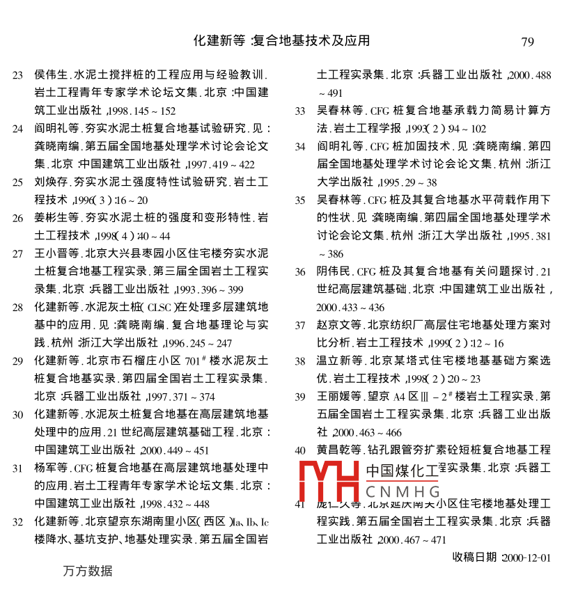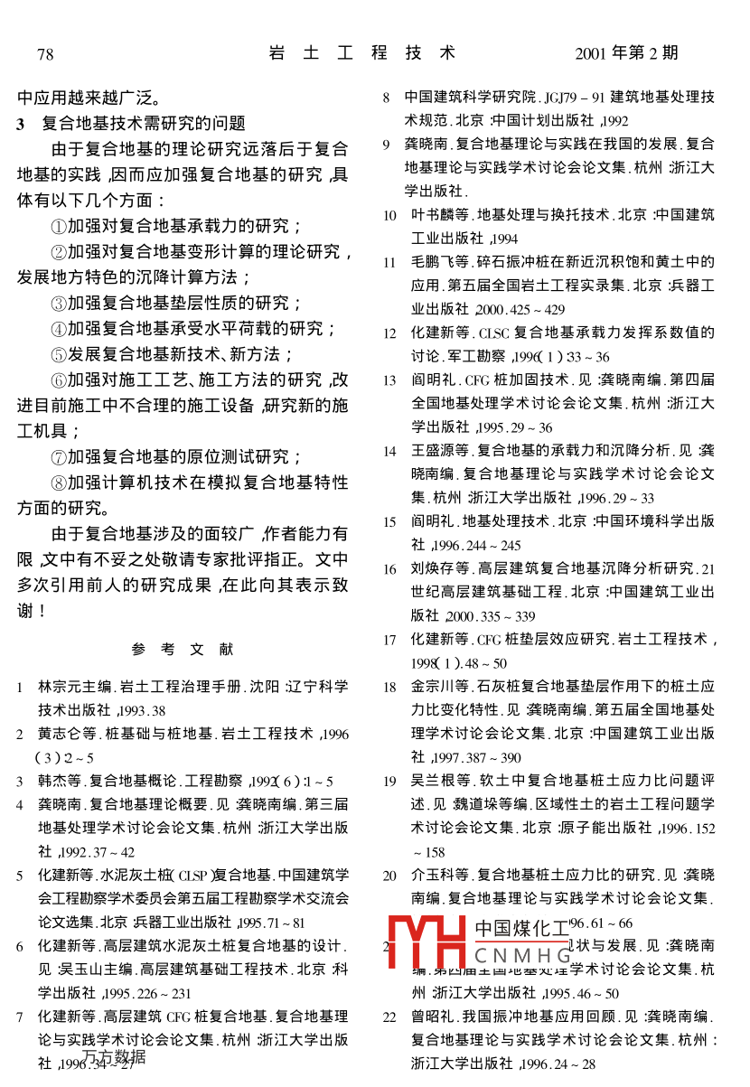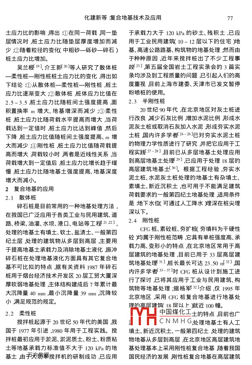 巖土工程技術(shù)2001年第2期Geotechnical Engineering TechniqueNo.2200l復(fù)合地基技術(shù)及應(yīng)用化建新(中兵勘察設(shè)計(jì)研究院北京10003張寶龍王玉霞北京市房屋建筑設(shè)計(jì)院北京1000)(北臺(tái)鋼鐵機(jī)船有限責(zé)任公司遼寧本溪117017)【摘要】提出了復(fù)合地基的設(shè)計(jì)原則對(duì)復(fù)合地基承載力計(jì)算、變形計(jì)算、柔性墊層進(jìn)行了探討提出了復(fù)合地基技術(shù)需研究的問(wèn)題【關(guān)鍵詞】復(fù)合地基承載力計(jì)算變形計(jì)算柔性墊層【中圖分類(lèi)號(hào)】Tu472Composite Foundation Technique and It s application(Abstract] The design principle of composite foundation is given. Calculation of bearing capacity of composite foundation calculation of deformation and soft cushion is studied. The research problems of composite foundation technique are pro-posite foundation calculation of bearing capacity calculation of deformation soft cushion受力層除加固體外還應(yīng)包括加固體下一定范復(fù)合地基是指在地基土中采用置換或增圍內(nèi)的下臥層。而樁基的受力作用表現(xiàn)為樁強(qiáng)的方式在土中設(shè)置由散體材料土、砂、碎側(cè)向抵抗力和樁端阻力受力層為樁周土層和石等淢膠結(jié)材料石灰、水泥、粉煤灰構(gòu)成加樁尖以下一定范圍的下臥層固樁(柱體與樁間土一起承擔(dān)建筑荷載復(fù)復(fù)合地基按材料類(lèi)型、制樁方式和樁體剛合地基中樁體或柱體通過(guò)置換、擠密作用對(duì)度進(jìn)行分類(lèi)45土體進(jìn)行加1按成樁所用材料可分為:散體材料樁類(lèi)復(fù)合地基與樁基有明顯的區(qū)別黃志侖2](如碎石樁、砂樁、鋼渣樁、礦渣樁等)復(fù)合地曾把它叫樁地基突岀了地基的概念。韓杰3〕基冰泥、灰土樁欻如深層攪拌樁、粉嘖樁、夯認(rèn)為復(fù)合地基屬于地基范疇。實(shí)水泥土樁、灰土樁、二灰樁等)復(fù)合地基砼復(fù)合地基和樁基礎(chǔ)在構(gòu)造上有明顯區(qū)別,樁類(lèi)如砼樁、CFG樁廈合地基。復(fù)合地基中樁體與基礎(chǔ)通過(guò)柔性墊層碎石或按制樁方式可分為擠土樁類(lèi)(如振沖樁、砂湘相連接,復(fù)合地基設(shè)計(jì)中充分考慮天然土錘擊樁、強(qiáng)夯碎石樁、鉆孔夯擴(kuò)樁)復(fù)合地基強(qiáng)度而樁基礎(chǔ)中樁通過(guò)承氜剛性盧上部結(jié)非擠土類(lèi)柢旋噴樁、攪拌樁、砼灌注樁、粉煤構(gòu)直接連接樁與承臺(tái)構(gòu)成一個(gè)整體在設(shè)計(jì)灰灌填杵算合地基時(shí)僅考慮樁間土體對(duì)樁的摩阻力和樁的端承中國(guó)煤化工分為散體樁復(fù)合地力。在受力方面,對(duì)于荷載較小的多層建筑,CNMHG性樁復(fù)合地基和剛復(fù)合地基主要受力層在加固體內(nèi),對(duì)于高層性樁復(fù)合地基。建筑由于基礎(chǔ)底面大、荷載大復(fù)合地基主要作者簡(jiǎn)介花歉揚(yáng)4年生男汊族河南洛陽(yáng)人頑士學(xué)位教授級(jí)高工?,F(xiàn)主要從事技術(shù)管理和施工管理工作。巖土工程技術(shù)2001年第2期1復(fù)合地基的設(shè)計(jì)活因而該方法在對(duì)噪聲有一定限制的場(chǎng)地不設(shè)計(jì)原則能使用根據(jù)有關(guān)資料67,復(fù)合地基的設(shè)計(jì)應(yīng)滿1.2復(fù)合地基承載力計(jì)算足以下原則國(guó)內(nèi)外許多學(xué)者對(duì)散體樁、柔性樁、半剛a.滿足建筑荷載對(duì)復(fù)合地基承載力的要性樁、剛性樁承載力計(jì)算進(jìn)行了研究其主要求成果如下在進(jìn)行復(fù)合地基設(shè)計(jì)時(shí)巖土工程師首先散體樁行業(yè)標(biāo)準(zhǔn)JGJ79-9158應(yīng)考慮結(jié)構(gòu)工程師根據(jù)建筑物上部載荷、基礎(chǔ)f(1-m)s(1)載荷以及活載荷等載荷情況所提出的復(fù)合地式中/m—復(fù)合地基承載力標(biāo)準(zhǔn)值A(chǔ)Pa基承載力要求然后根據(jù)已有的單樁、復(fù)合地fk—樁體單位截面積承載力標(biāo)準(zhǔn)基資料結(jié)合建筑場(chǎng)地的巖土工程勘察報(bào)告,值k設(shè)計(jì)岀樁徑、樁長(zhǎng)、樁土置換率等同時(shí)進(jìn)行復(fù)∫k——樁間土承載力標(biāo)準(zhǔn)值kPa合地基承載力的計(jì)算以滿足建筑荷載對(duì)復(fù)合—面積置換率地基承載力的要求為原則并考慮一定的安全對(duì)于小型工程的粘性土地基如無(wú)現(xiàn)場(chǎng)載度。若存在有軟弱下臥層時(shí)按規(guī)范進(jìn)行軟弱荷試驗(yàn)資料時(shí)復(fù)合地基承載力標(biāo)準(zhǔn)值可按下下臥層驗(yàn)算b.滿足GBJ7-89規(guī)范、地區(qū)規(guī)范或設(shè)詐式計(jì)算fpk=[1+m(n-1)y。k(2)人對(duì)建筑物變形和傾斜的有關(guān)要求高層建筑由于其高度高、載荷大地基的或k=[1+n(n-1)3cm)(3)變形及傾斜是基礎(chǔ)設(shè)計(jì)中應(yīng)考慮的主要問(wèn)題。式中——樁士應(yīng)力比無(wú)實(shí)測(cè)資料時(shí)可取24原土強(qiáng)度低取最大值原土巖土工程師進(jìn)行高層建筑復(fù)合地基設(shè)計(jì)時(shí)在強(qiáng)度高取最小值滿足建筑荷載對(duì)復(fù)合地基承載力要求的前提下應(yīng)對(duì)復(fù)合地基和下臥層的變形進(jìn)行計(jì)算——樁間土的十字板抗剪強(qiáng)度,也可其最大變形量及傾斜值均應(yīng)滿足規(guī)范的有關(guān)用處理前地基土的十字板抗剪強(qiáng)規(guī)定或設(shè)計(jì)人員的要求以保證建筑物的安全度