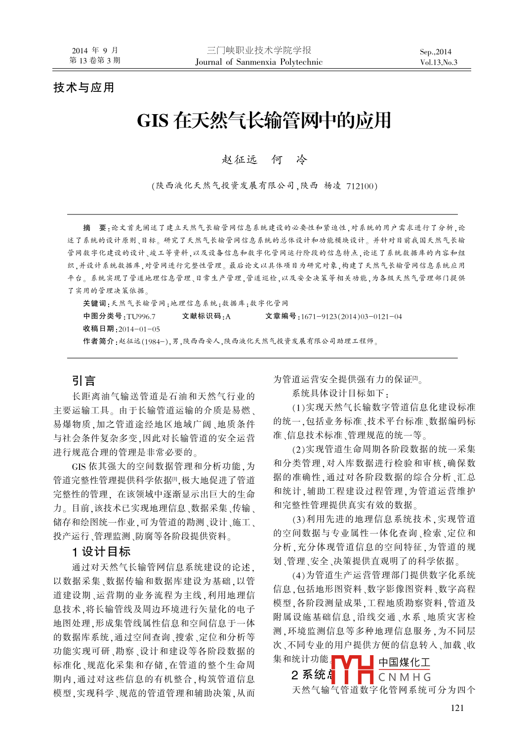 2014年9月三門峽職業(yè)技術(shù)學院學報Sep.,2014第13卷第3期Journal of Sanmenxia PolytechnicVol. 13. No. 3技術(shù)與應用GIS在天然氣長輸管網(wǎng)中的應用趙征遠何冷(陜西液化天然氣投資發(fā)展有限公司,陜西楊凌712100)摘要:論文首先闡述了建立天然氣長輸管網(wǎng)信息系統(tǒng)建設的必要性和緊迫性,對系統(tǒng)的用戶需求進行了分析,論述了系統(tǒng)的設計原則、目標。研究了天然氣長輸管網(wǎng)信息系統(tǒng)的總體設計和功能模塊設計。并針對目前我國天然氣長輸管網(wǎng)數(shù)字化建設的設計、竣工等資料,以及設備信息和數(shù)字化管網(wǎng)運行階段的信息特點,論述了系統(tǒng)數(shù)據(jù)庫的內(nèi)容和鉏織,并設計系統(tǒng)數(shù)裾庫,對管網(wǎng)進行完整性管理。最后論文以具體項目為研究對象,構(gòu)建了天然氣長輸管網(wǎng)信息系統(tǒng)應用平臺。系統(tǒng)實現(xiàn)了管道地理信息管理、日常生產(chǎn)管理,管道巡檢,以及安全決策等相關(guān)功能,為各級天然氣管理部門提供了實用的管理決策依據(jù)。關(guān)鍵詞:天然氣長輸管網(wǎng);地理信息系統(tǒng);數(shù)據(jù)庫;數(shù)字化管網(wǎng)中圖分類號:TU996.7文獻標識碼:A文章編號:1671-9123(2014)03-0121-0收稿日期:2014-01-05作者簡介:趙征遠(1984-),男,陜西西安人,陜西液化天然氣投資發(fā)展有限公司助理工程師。引言為管道運營安全提供強有力的保證。長距離油氣輸送管道是石油和天然氣行業(yè)的系統(tǒng)具體設計目標如下主要運輸工具。由于長輸管道運輸?shù)慕橘|(zhì)是易燃(1)實現(xiàn)天然氣長輸數(shù)字管道信息化建設標準易爆物質(zhì),加之管道途經(jīng)地區(qū)地域廣闊、地質(zhì)條件的統(tǒng)一,包括業(yè)務標準、技術(shù)平臺標準、數(shù)據(jù)編碼標與社會條件復雜多變,因此對長輸管道的安全運營準、信息技術(shù)標準、管理規(guī)范的統(tǒng)一等進行規(guī)范合理的管理是非常必要的(2)實現(xiàn)管道生命周期各階段數(shù)據(jù)的統(tǒng)一采集GS依其強大的空間數(shù)據(jù)管理和分析功能,為和分類管理,對入庫數(shù)據(jù)進行檢驗和審核,確保數(shù)管道完整性管理提供科學依據(jù)極大地促進了管道據(jù)的準確性,通過對各階段數(shù)據(jù)的綜合分析、匯總完整性的管理,在該領域中逐漸顯示出巨大的生命和統(tǒng)計,輔助工程建設過程管理,為管道運營維護力。目前,該技術(shù)已實現(xiàn)地理信息、數(shù)據(jù)采集、傳輸、和完整性管理提供真實有效的數(shù)據(jù)。儲存和繪圖統(tǒng)一作業(yè),可為管道的勘測、設計、施工(3)利用先進的地理信息系統(tǒng)技術(shù),實現(xiàn)管道投產(chǎn)運行、管理監(jiān)測、防腐等各階段提供資料。的空間數(shù)據(jù)與專業(yè)屬性一體化查詢、檢索、定位和1設計目標分析,充分體現(xiàn)管道信息的空間特征,為管道的規(guī)通過對天然氣長輸管網(wǎng)信息系統(tǒng)建設的論述,劃、管理、安全、決策提供直觀明了的科學依據(jù)。以數(shù)據(jù)采集、數(shù)據(jù)傳輸和數(shù)據(jù)庫建設為基礎.以管(4)為管道生產(chǎn)運營管理部門提供數(shù)字化系統(tǒng)道建設期、運營期的業(yè)務流程為主線,利用地理信信息,包括地形圖資料、數(shù)字影像圖資料數(shù)字高程息技術(shù),將長輸管線及周邊環(huán)境進行矢量化的電子模型,各階段測量成果,工程地質(zhì)勘察資料,管道及地圖處理形成集管線屬性信息和空間信息于一體附屬設施基礎信息,沿線交通、水系、地質(zhì)災害檢的數(shù)據(jù)庫系統(tǒng),通過空間查詢搜索、定位和分析等測,環(huán)境監(jiān)測信息等多種地理信息服務,為不同層功能實現(xiàn)可研、勘察、設計和建設等各階段數(shù)據(jù)的次、不同專業(yè)的用戶提供方便的信息轉(zhuǎn)入、加載、收集和統(tǒng)計功能標準化、規(guī)范化采集和存儲,在管道的整個生命周中國煤化工期內(nèi),通過對這些信息的有機整合,構(gòu)筑管道信息2系統(tǒng)CNMHG模型,實現(xiàn)科學、規(guī)范的管道管理和輔助決策,從而天然氣輸氣管道數(shù)字化管網(wǎng)系統(tǒng)可分為四個121GIS在天然氣長輸管網(wǎng)中的應用層次,基礎設施層、數(shù)據(jù)中心層、應用系統(tǒng)層和信息據(jù)、管道設計數(shù)據(jù)、施工過程數(shù)據(jù)、竣工數(shù)據(jù)、管道門戶層,具體結(jié)構(gòu)見圖運營數(shù)據(jù)等各類數(shù)據(jù)。數(shù)據(jù)中心依托成熟的數(shù)據(jù)庫管理軟件和GIS平臺,按照統(tǒng)一的標準建立管道完信息門戶門戶網(wǎng)站|用戶管理全認證信息發(fā)布整性數(shù)據(jù)庫,實現(xiàn)數(shù)據(jù)的集中存儲與管理,為應用系統(tǒng)提供數(shù)據(jù)支撐(3)應用系統(tǒng)層是系統(tǒng)建設的核心,包括六個生產(chǎn)完整管道管道管道相對獨立的專業(yè)應用子系統(tǒng).該層是一個開放式的應用系統(tǒng)管理性數(shù)地理巡檢安全系統(tǒng)據(jù)采信息系統(tǒng)模擬決策結(jié)構(gòu),對于運營期的其他應用系統(tǒng)可以不斷添加構(gòu)集及系統(tǒng)系統(tǒng)系統(tǒng)建,共同組成應用系統(tǒng)層(4)信息門戶層通過建立統(tǒng)一的管理服務平臺,為各業(yè)務模塊提供數(shù)據(jù)操作、用戶管理、安全認證管理