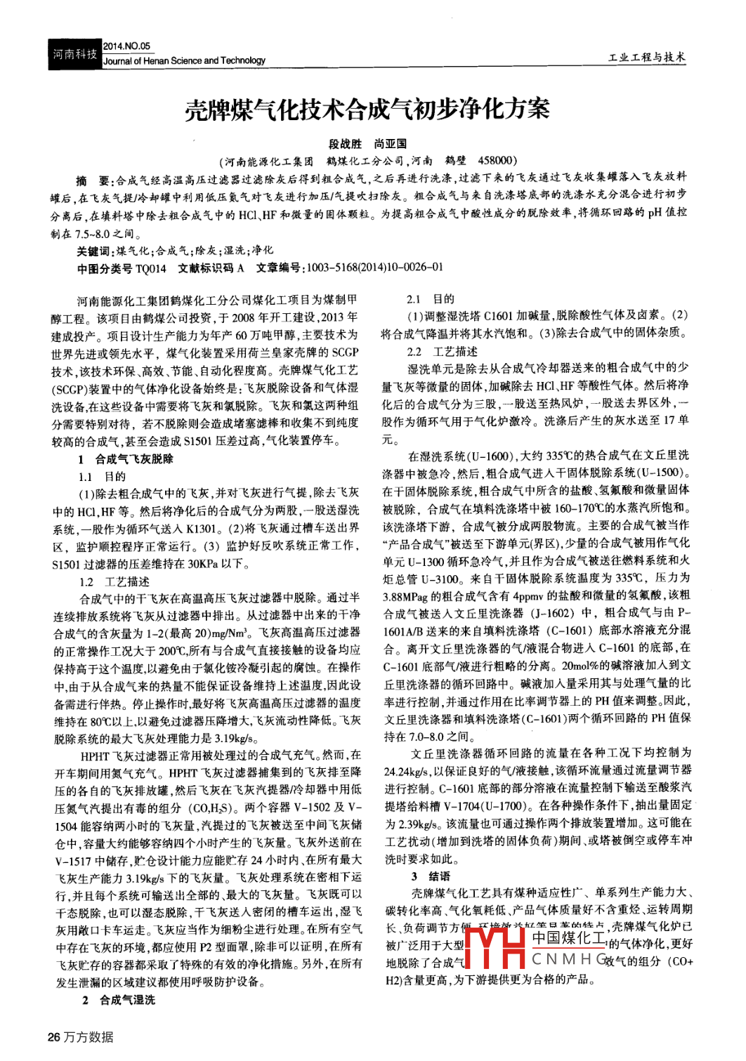 2014.NO.05河南科技Journal of Henan Science and Technology工業(yè)工程與技術(shù)殼牌煤氣化技術(shù)合成氣初步凈化方案段戰(zhàn)勝尚亞國(guó)(河南能源化工集團(tuán)鶴煤化工分公司,河南 鶴壁458000)摘要:合成氣經(jīng)高溫高壓過濾器過濾除灰后得到粗合成氣,之后再進(jìn)行洗滌,過濾下來的飛灰通過飛灰收集罐落入飛灰放料罐后,在飛灰氣提冷卻罐中利用低壓氮?dú)鈱?duì)飛灰進(jìn)行加壓/氣提吹掃除灰。粗合成氣與來自洗滌塔底部的洗滌水充分混合進(jìn)行初步分離后,在填料塔中除去粗合成氣中的HCl、HF和微量的固體顆粒。為提高粗合成氣中酸性成分的脫除效率,將循環(huán)回路的pH值控制在7.5~8.0之間。關(guān)鍵詞:煤氣化;合成氣;除灰;濕洗;凈化中圖分類號(hào)TQ014文獻(xiàn)標(biāo)識(shí)碼 A文章編號(hào) : 1003-5168(2014)10-0026-01河南能源化工集團(tuán)鶴煤化工分公司煤化工項(xiàng)目為煤制甲2.1 目的醇工程。該項(xiàng)目由鶴煤公司投資,于2008年開工建設(shè),2013年(1)調(diào)整濕洗塔C1601加堿量,脫除酸性氣體及鹵素。(2)建成投產(chǎn)。項(xiàng)目設(shè)計(jì)生產(chǎn)能力為年產(chǎn)60萬噸甲醇,主要技術(shù)為將合成氣降溫并將其水汽飽和。(3)除去合成氣中的固體雜質(zhì)。世界先進(jìn)或領(lǐng)先水平,煤氣化裝置采用荷蘭皇家殼牌的SCGP2.2 工藝描述技術(shù),該技術(shù)環(huán)保高效、節(jié)能、自動(dòng)化程度高。殼牌煤氣化工藝濕洗單元是除去從合成氣冷卻器送來的粗合成氣中的少(SCGP)裝置中的氣體凈化設(shè)備始終是:飛灰脫除設(shè)備和氣體濕量飛灰等微量的固體,加堿除去HCI、HF等酸性氣體。然后將凈洗設(shè)備,在這些設(shè)備中需要將飛灰和氯脫除。飛灰和氯這兩種組化后的合成氣分為三股,一股送至熱風(fēng)爐,-股送去界區(qū)外,一分需要特別對(duì)待,若不脫除則會(huì)造成堵塞濾棒和收集不到純度股作為循環(huán)氣用于氣化爐激冷。洗滌后產(chǎn)生的灰水送至17單較高的合成氣,甚至?xí)斐蒘1501壓差過高,氣化裝置停車。元1合成氣飛灰脫除在濕洗系統(tǒng)(U-1600),大約335C的熱合成氣在文丘里洗1.1 目的滌器中被急冷,然后,粗合成氣進(jìn)人干固體脫除系統(tǒng)(U-1500)。(1)除去粗合成氣中的飛灰,并對(duì)飛灰進(jìn)行氣提,除去飛灰在干固體脫除系統(tǒng),粗合成氣中所含的鹽酸氫氟酸和微量固體中的HCI,HF等。然后將凈化后的合成氣分為兩股,-股送濕洗被脫除, 合成氣在填料洗滌塔中被160-170C的水蒸汽所飽和。系統(tǒng),一-股作為循環(huán)氣送人K1301。 (2)將飛灰通過槽車送出界該洗滌塔下游,合成氣被分成兩股物流。主要的合成氣被當(dāng)作區(qū),監(jiān)護(hù)順控程序正常運(yùn)行。(3) 監(jiān)護(hù)好反吹系統(tǒng)正常工作,“產(chǎn)品合成氣”被送至下游單元(界區(qū)),少量的合成氣被用作氣化S1501過濾器的壓差維持在30KPa以下。單元U-1300循環(huán)急冷氣,并且作為合成氣被送往燃料系統(tǒng)和火1.2 工藝描述炬總管U-3100。來自干固體脫除系統(tǒng)溫度為335C,壓力為合成氣中的干飛灰在高溫高壓飛灰過濾器中脫除。通過半3.88MPag的粗合成氣含有4ppmv的鹽酸和微量的氫氟酸,該粗連續(xù)排放系統(tǒng)將飛灰從過濾器中排出。從過濾器中出來的干凈合成氣被送人文丘里洗滌器(J-1602) 中,粗合成氣與由P-合成氣的含灰量為1-2(最高20)mg/Nm'。飛灰高溫高壓過濾器1601A/B 送來的來自填料洗滌塔(C-1601) 底部水溶液充分混的正常操作工況大于2009C,所有與合成氣直接接觸的設(shè)備均應(yīng)合。離開文丘里洗滌器的氣液混合物進(jìn)入C-1601的底部,在保持高于這個(gè)溫度,以避免由于氯化銨冷凝引起的腐蝕。在操作C-1601 底部氣液進(jìn)行粗略的分離。20mol%的堿溶液加入到文中,由于從合成氣來的熱量不能保證設(shè)備維持上述溫度,因此設(shè)丘里洗滌 器的循環(huán)回路中。堿液加入量采用其與處理氣量的比備需進(jìn)行伴熱。停止操作時(shí),最好將飛灰高溫高壓過濾器的溫度率進(jìn)行控制,并通過作用在比率調(diào)節(jié) 器上的PH值來調(diào)整。因此,維持在80C以上.以避免過濾器壓降增大,飛灰流動(dòng)性降低。飛灰文丘里洗滌器和填料洗滌塔(C- 1601 )兩個(gè)循環(huán)回路的PH值保脫除系統(tǒng)的最大飛灰處理能力是3.19kg/s.持在7.0-8.0之間。HPHT飛灰過濾器正常用被處理過的合成氣充氣。然而,在文丘里洗滌器循環(huán)回路的流量在各種工況下均控制為開車期間用氮?dú)獬錃?。HPHT飛灰過濾器捕集到的飛灰排至降24.24kg/s,以保證良好的氣/液接觸,該循環(huán)流量通過流量調(diào)節(jié)器壓的各自的飛灰排放罐,然后飛灰在飛灰汽提器呤卻器中用低進(jìn)行控制。 C-1601底部的部分溶液在流量控制下輸送至酸漿汽壓氮?dú)馄岢鲇卸镜慕M分(CO,HS)。兩個(gè)容器V-1502及V-提塔給料槽V-1704(U-170)。在各種操作條件下,抽出量固定1504能容納兩小時(shí)的飛灰量,汽提過的飛灰被送至中間飛灰儲(chǔ)為2.39kg/s.該流量也可通過操作兩個(gè)排放裝置增加。這可能在倉(cāng)中,容量大約能夠容納四個(gè)小時(shí)產(chǎn)生的飛灰量。飛灰外送前在工藝擾動(dòng)(增加到洗塔的固體負(fù)荷)期間、或塔被倒空或停車沖V-1517中儲(chǔ)存,貯倉(cāng)設(shè)計(jì)能力應(yīng)能貯存24 小時(shí)內(nèi)、在所有最大