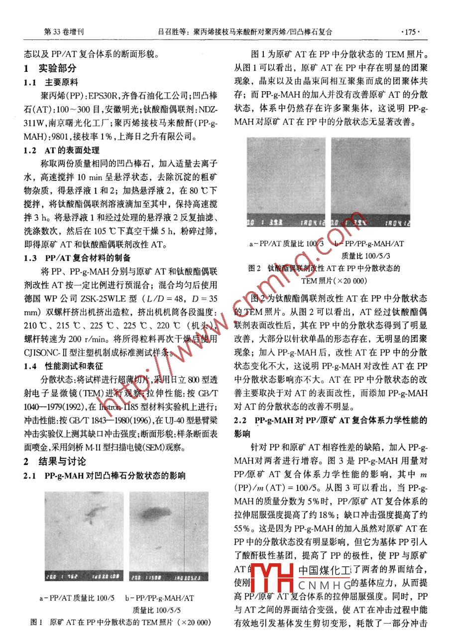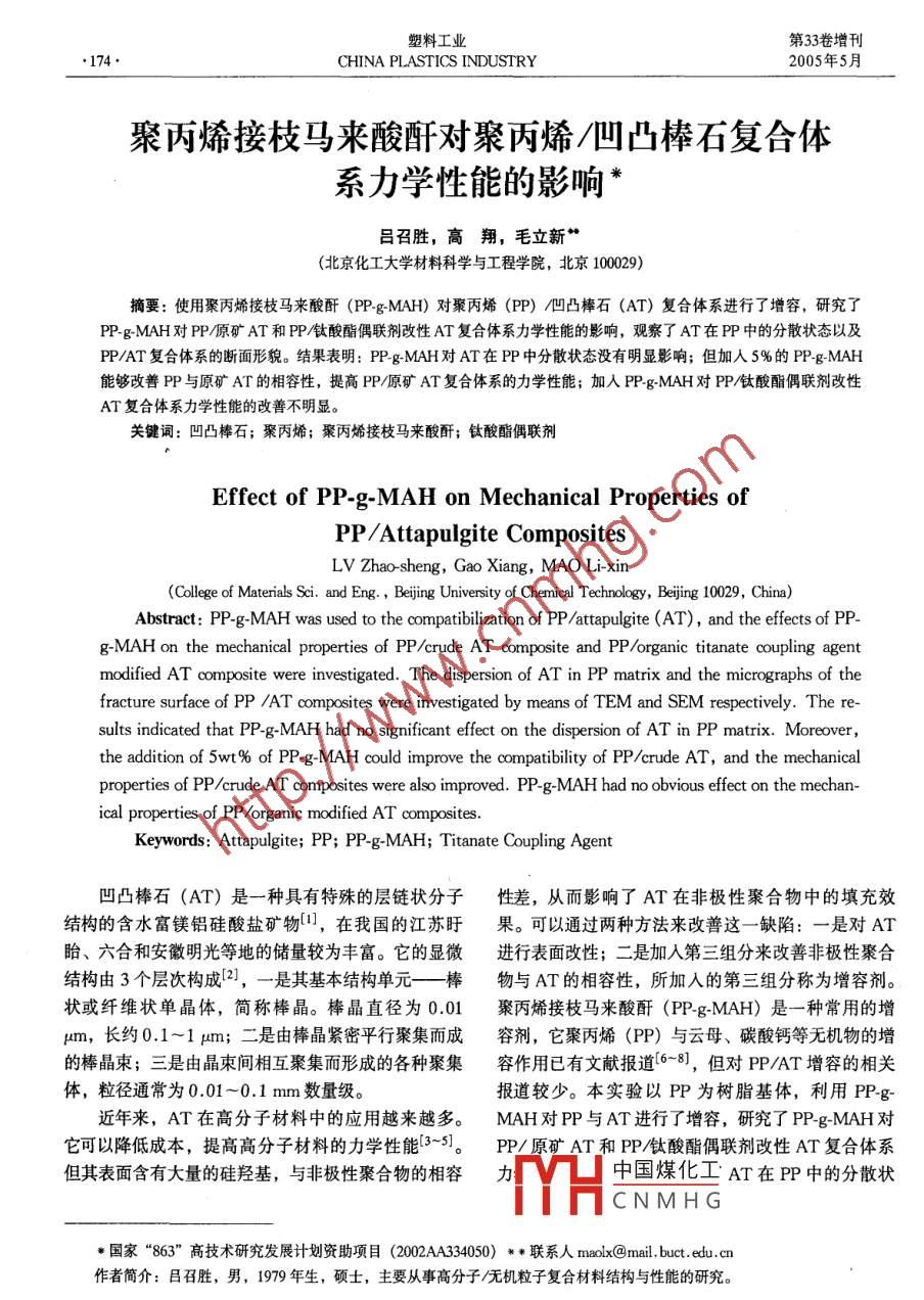 塑料工業(yè)第33卷增刊174CHINA PLASTICS INDUSTRY2005年5月聚丙烯接枝馬來酸酐對聚丙烯/凹凸棒石復(fù)合體系力學(xué)性能的影響*呂召勝,高翔,毛立新(北京化工大學(xué)材料科學(xué)與工程學(xué)院,北京100029)摘要:使用聚丙烯接枝馬來酸酐( PP-g-MAH)對聚丙烯(P)/凹凸棒石(AT)復(fù)合體系進(jìn)行了增容,研究了PP-g-MAH對PP原礦AT和PP鈦酸酯偶聯(lián)劑改性AT復(fù)合體系力學(xué)性能的影響,觀察了AT在PP中的分散狀態(tài)以及PPAT復(fù)合體系的斷面形貌。結(jié)果表明: PP-g-MAH對AT在PP中分散狀態(tài)沒有明顯影響;但加入5%的 PP-g-MAH能夠改善PP與原礦AT的相容性,提高PP原礦AT復(fù)合體系的力學(xué)性能;加人 PP-g-MAH對P/鈦酸酯偶聯(lián)劑改性AT復(fù)合體系力學(xué)性能的改善不明顯關(guān)鍵詞:凹凸棒石;聚丙烯;聚丙烯接枝馬來酸酐;鈦酸酯偶聯(lián)劑Effect of PP-g-MAH on Mechanical Properties ofPP/Attapulgite CompositesLV Zhao-sheng, Gao Xiang, MAO Li-xincollege of Materials Sci. and Eng, Beijing University of Chemical Technology, Beijing 10029, China)Abstract: PP-g-MAH was used to the compatibilization of PP/attapulgite(at), and the effects of PPg-MAH on the mechanical properties of PP/crude at composite and PP/organic titanate coupling agentmodified AT composite were investigated. The dispersion of AT in PP matrix and the micrographs of thefracture surface of PP /at composites were investigated by means of TEM and SEM respectively. Thesults indicated that PP-g- MAH had no significant effect on the dispersion of AT in PP matrix. Moreoverthe addition of 5wt% of PP-g-MAH could improve the compatibility of PP/crude at, and the mechanicalproperties of PP/crude aT composites were also improved. PP-g-MAH had no obvious effect on the mechan-ical properties of PP/organic modified AT compositesKeywords: Attapulgite; PP; PP-g-MAH; Titanate Coupling Agent凹凸棒石(AT)是一種具有特殊的層鏈狀分子性差,從而影響了AT在非極性聚合物中的填充效結(jié)構(gòu)的含水富鎂鋁硅酸鹽礦物(,在我國的江蘇盱果??梢酝ㄟ^兩種方法來改善這一缺陷:一是對AT眙、六合和安徽明光等地的儲量較為豐富。它的顯微進(jìn)行表面改性;二是加入第三組分來改善非極性聚合結(jié)構(gòu)由3個層次構(gòu)成2),一是其基本結(jié)構(gòu)單元——棒物與AT的相容性,所加入的第三組分稱為增容劑。狀或纖維狀單晶體,簡稱棒晶。棒晶直徑為0.01聚丙烯接枝馬來酸酐(PP-gMAH)是一種常用的增ym,長約0.1-1pm;二是由棒晶緊密平行聚集而成容劑,它聚丙烯(PP)與云母、碳酸鈣等無機(jī)物的增的棒晶束;三是由晶束間相互聚集而形成的各種聚集容作用已有文獻(xiàn)報道6~8],但對PPAT增容的相關(guān)體,粒徑通常為0.01~0.1mm數(shù)量級。報道較少。本實驗以PP為樹脂基體,利用PPg近年來,AT在高分子材料中的應(yīng)用越來越多。MAH對PP與AT進(jìn)行了增容,研究了 PP-g-MAH對它可以降低成本,提高高分子材料的力學(xué)性能3-5。PP/原礦AT和PP鈦酸酯偶聯(lián)劑改性AT復(fù)合體系但其表面含有大量的硅羥基,與非極性聚合物的相容力中國煤化工AT在PP中的分散狀CNMHG·國家“863”高技術(shù)研究發(fā)展計劃資助項目(2002AA334050)**聯(lián)系人maolx@mail,buct.edu.cn作者簡介:呂召勝,男,1979年生,碩士,主要從事高分子無機(jī)粒子復(fù)合材料結(jié)構(gòu)與性能的研究。第33卷增刊呂召勝等:聚丙烯接枝馬來酸酐對聚丙烯凹凸棒石復(fù)合175態(tài)以及PPAT復(fù)合體系的斷面形貌。圖1為原礦AT在PP中分散狀態(tài)的TEM照片1實驗部分從圖1可以看出,原礦AT在PP中存在明顯的團(tuán)聚1.1主要原料現(xiàn)象,晶束以及由晶束間相互聚集而成的團(tuán)聚體共聚丙烯(PP):EPS30R,齊魯石油化工公司;凹凸棒存;而 PP-g-MAH的加入并沒有改善原礦AT的分散石(AT):100~300目,安徽明光;鈦酸酯偶聯(lián)劑:NDZ狀態(tài),體系中仍然存在許多聚集體,這說明PPg311w,南京曙光化工廠;聚丙烯接枝馬來酸酐(PPg-MAH對原礦AT在PP中的分散狀態(tài)無顯著改善。MAH):9801,接枝率1%,上海日之升有限公司。12AT的表面處理稱取兩份質(zhì)量相同的凹凸棒石,加入適量去離子水,高速攪拌10min呈懸浮狀態(tài),去除沉淀的粗礦物雜質(zhì),得懸浮液1和2;加熱懸浮液2,在80℃下攪拌,將鈦酸酯偶聯(lián)劑溶液滴加至其中,保持高速攪拌3h。將懸浮液1和經(jīng)過處理的懸浮液2反復(fù)抽濾01FROY I洗滌數(shù)次,然后在105℃下真空干燥5h,粉碎過篩,即得原礦AT和鈦酸酯偶聯(lián)劑改性AT。a-PP/AT質(zhì)量比100/3b- PP/PP-g-MAH/AT13PP/AT復(fù)合材料的制備質(zhì)量比100/5/3將PP、 PP-g-MAH分別與原礦AT和鈦酸酯偶聯(lián)圖2鈦酸酯偶聯(lián)劑改性AT在PP中分散狀態(tài)的劑改性AT按一定比例進(jìn)行預(yù)混合;混合均勻后使用TEM照片(×20000德國WP公司ZSK25WLE型(L/D=48,D=35圖2為鈦酸酯偶聯(lián)劑改性AT在PP中分散狀態(tài)mm)雙螺桿擠出機(jī)擠出造粒,擠出機(jī)機(jī)筒各段溫度:的TEM照片。從圖2可以看出,AT經(jīng)過鈦酸酯偶210℃、215℃、225℃、225℃、20℃(機(jī)頭),聯(lián)劑表面改性后,其在PP中的分散狀態(tài)得到了明顯螺桿轉(zhuǎn)速為200r/min。將所得粒料再次干燥后使用改善,大部分以針狀單晶的形態(tài)存在,無明顯的團(tuán)聚CJISONCⅡ型注塑機(jī)制成標(biāo)準(zhǔn)測試樣條?,F(xiàn)象;加入 PP-g-MAH后,改性AT在PP中的分散14性能測試和表征狀態(tài)變化不大,這說明 PP-g-MAH對改性AT在PP分散狀態(tài)將試樣進(jìn)行超薄切