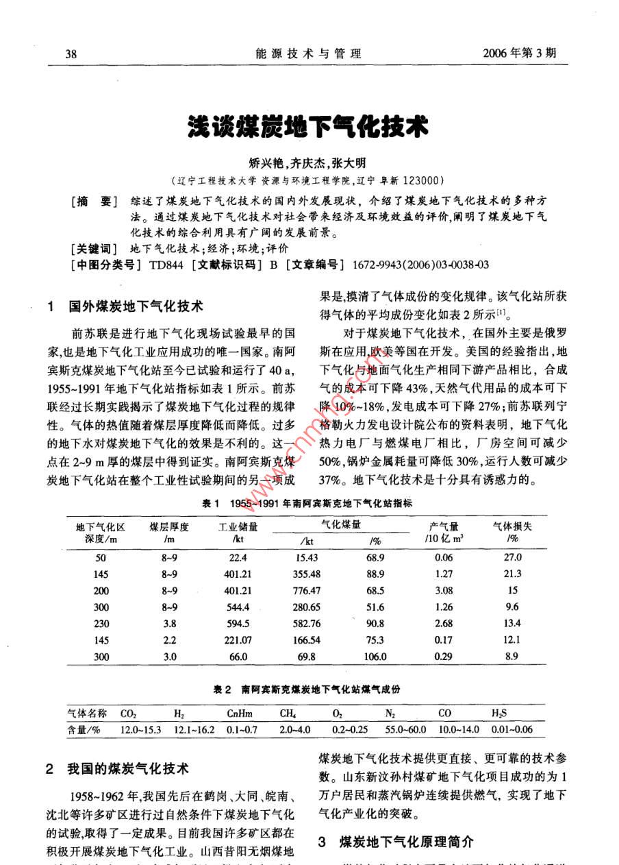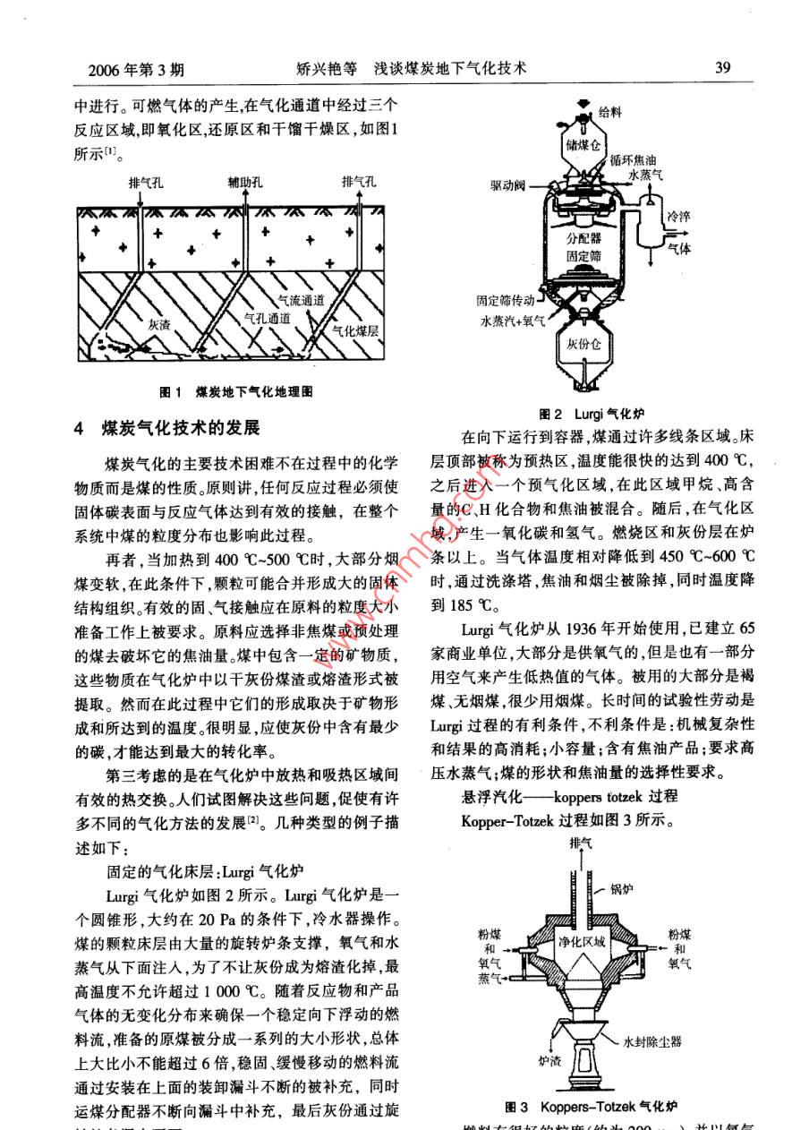 38能源技術(shù)與管理2006年第3期淺談煤炭地下氣化技術(shù)矯興艷,齊慶杰,張大明(遼寧工程技術(shù)大學資源與環(huán)境工程學院,遼寧阜新123000)[摘要]綜述了煤炭地下氣化技術(shù)的國內(nèi)外發(fā)展現(xiàn)狀,介紹了煤炭地下氣化技術(shù)的多種方法。通過煤炭地下氣化技術(shù)對社會帶來經(jīng)濟及環(huán)境效益的評價,闡明了煤炭地下氣化技術(shù)的綜合利用具有廣闊的發(fā)展前景。[關(guān)鍵詞]地下 氣化技術(shù);經(jīng)濟;環(huán)境;評價[中圖分類號] TD844 [文獻標識碼] B [文章編號] 1672-9943(2006 )03-0038-03果是,摸清了氣體成份的變化規(guī)律。該氣化站所獲1國外煤炭地下氣化技術(shù)得氣體的平均成份變化如表2所示"。前蘇聯(lián)是進行地下氣化現(xiàn)場試驗最早的國對于煤炭地下氣化技術(shù),在國外主要是俄羅家,也是地下氣化工業(yè)應用成功的唯- -國家。南阿斯在應用,歐美等國在開發(fā)。美國的經(jīng)驗指出,地賓斯克煤炭地下氣化站至今已試驗和運行了40 a,下氣化與地面氣化生產(chǎn)相同下游產(chǎn)品相比,合成1955~1991年地下氣化站指標如表1所示。前蘇氣的成本可下降43%,天然氣代用品的成本可下聯(lián)經(jīng)過長期實踐揭示了煤炭地下氣化過程的規(guī)律降10%~18% ,發(fā)電成本可下降27%;前蘇聯(lián)列寧性。氣體的熱值隨著煤層厚度降低而降低。過多格勒火力發(fā)電設計院公布的資料表明,地下氣化的地下水對煤炭地下氣化的效果是不利的。這一熱力電廠與燃煤電廠相比,廠房空間可減少點在2~9 m厚的煤層中得到證實。南阿賓斯克煤50%,鍋爐金屬耗量可降低30%,運行人數(shù)可減少炭地下氣化站在整個工業(yè)性試驗期間的另一項成37%。地下氣化技術(shù)是十分具有誘惑力的。表1 1955-1991年南阿賓斯克地下氣化站指標地下氣化區(qū)煤層厚度工業(yè)儲量氣化煤量產(chǎn)氣量氣體損失深度/m/mkt/kt%/10億m2195(8~922.415.4368.90.0627.0145401.21355.4888.91.2721.3200776.4768.53.01300544.4280.6551.6.269.62303.8594.5582.7690.82.6813.42.2221.07166.5475.30.1712.166.069.8106.00.298.9表2南阿賓斯克煤炭地下氣化站煤氣成份.氣體名稱CO2H2CnHmCHD2NCOHS含量/%12.0-15.3 12.1-16.2 0.1-0.72.0-4.00.2~0.2555.0-60.0 10.0-14.0 0.01-0.06煤炭地下氣化技術(shù)提供更直接、更可靠的技術(shù)參2我國的煤炭氣化技術(shù)數(shù)。山東新汶孫村煤礦地下氣化項目成功的為11958~1962年,我國先后在鶴崗、大同、皖南、萬戶居民和蒸汽鍋爐連續(xù)提供燃氣,實現(xiàn)了地下沈北等許多礦區(qū)進行過自然條件下煤炭地下氣化氣化產(chǎn)業(yè)化的突破。的試驗,取得了一-定成果。目前我國許多礦區(qū)都在3煤炭地下氣化原理簡介積極開展煤炭地下氣化工業(yè)。山西昔陽無煙煤地2006年第3期矯興艷等淺談煤炭地 下氣化技術(shù)39中進行。可燃氣體的產(chǎn)生,在氣化通道中經(jīng)過三個給料反應區(qū)域,即氧化區(qū),還原區(qū)和干餾千燥區(qū),如圖1儲煤倉所示"。! 循環(huán)焦油水蒸氣排氣孔輔助孔驅(qū)動閥一A不不瓜公公公瓜瓜瓜冷淬+分配器固定篩氣流通道固定篩傳動灰渣,氣孔通道水蒸汽+氧氣'氣化煤層灰份倉圖1煤炭地下氣化地理圖圖2 Lurgi 氣化爐4煤炭氣化技術(shù)的發(fā)展在向下運行到容器,煤通過許多線條區(qū)域。床煤炭氣化的主要技術(shù)困難不在過程中的化學層頂部被稱為預熱區(qū),溫度能很快的達到400C,物質(zhì)而是煤的性質(zhì)。原則講,任何反應過程必須使之后進入一個預氣化區(qū)域,在此區(qū)域甲烷、高含固體碳表面與反應氣體達到有效的接觸,在整個量的C、H化合物和焦油被混合。隨后,在氣化區(qū)系統(tǒng)中煤的粒度分布也影響此過程。域,產(chǎn)生- -氧化碳和氫氣。燃燒區(qū)和灰份層在爐再者,當加熱到400 C~500 C時,大部分煙條以上。當氣體溫度相對降低到450C-600C煤變軟,在此條件下,顆??赡芎喜⑿纬纱蟮墓腆w時,通過洗滌塔,焦油和煙塵被除掉,同時溫度降結(jié)構(gòu)組織。有效的固,氣接觸應在原料的粒度大小到185 C。準備工作上被要求。原料應選擇非焦煤或預處理Lurgi氣化爐從1936年開始使用,已建立65的煤去破壞它的焦油量。煤中包含一定的礦物質(zhì),家商業(yè)單位,大部分是供氧氣的,但是也有一部分這些物質(zhì)在氣化爐中以干灰份煤渣或熔渣形式被用空氣來產(chǎn)生低熱值的氣體。被用的大部分是褐提取。然而在此過程中它們的形成取決于礦物形煤、無煙煤,很少用煙煤。長時間的試驗性勞動是成和所達到的溫度。很明顯,應使灰份中含有最少Lurgi過程的有利條件,不利條件是:機械復雜性的碳,才能達到最大的轉(zhuǎn)化率。和結(jié)果的高消耗;小容量;含有焦油產(chǎn)品;要求高第三考慮的是在氣化爐中放熱和吸熱區(qū)域間壓水蒸氣;煤的形狀和焦油量的選擇性要求。有效的熱交換。人們試圖解決這些問題,促使有許懸浮汽化一koppers totzek過程多不同的氣化方法的發(fā)展口。幾種類型的例子描Kopper -Totzek過程如圖3所示。述如下:氣固定的氣化床層:Lurgi氣化爐Lurgi氣化爐如圖2所示。Lurgi 氣化爐是一-鍋爐個圓錐形,大約在20Pa的條件下,冷水器操作。煤的顆粒床層由大量的旋轉(zhuǎn)爐條支撐,氧氣和水粉煤凈化區(qū)城蒸氣從下面注入,為了不讓灰份成為熔渣化掉,最氧氣高溫度不允許超過1 000 C。隨著反應物和產(chǎn)品蒸氣氣