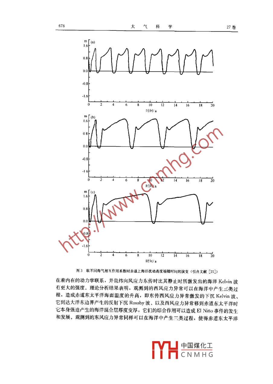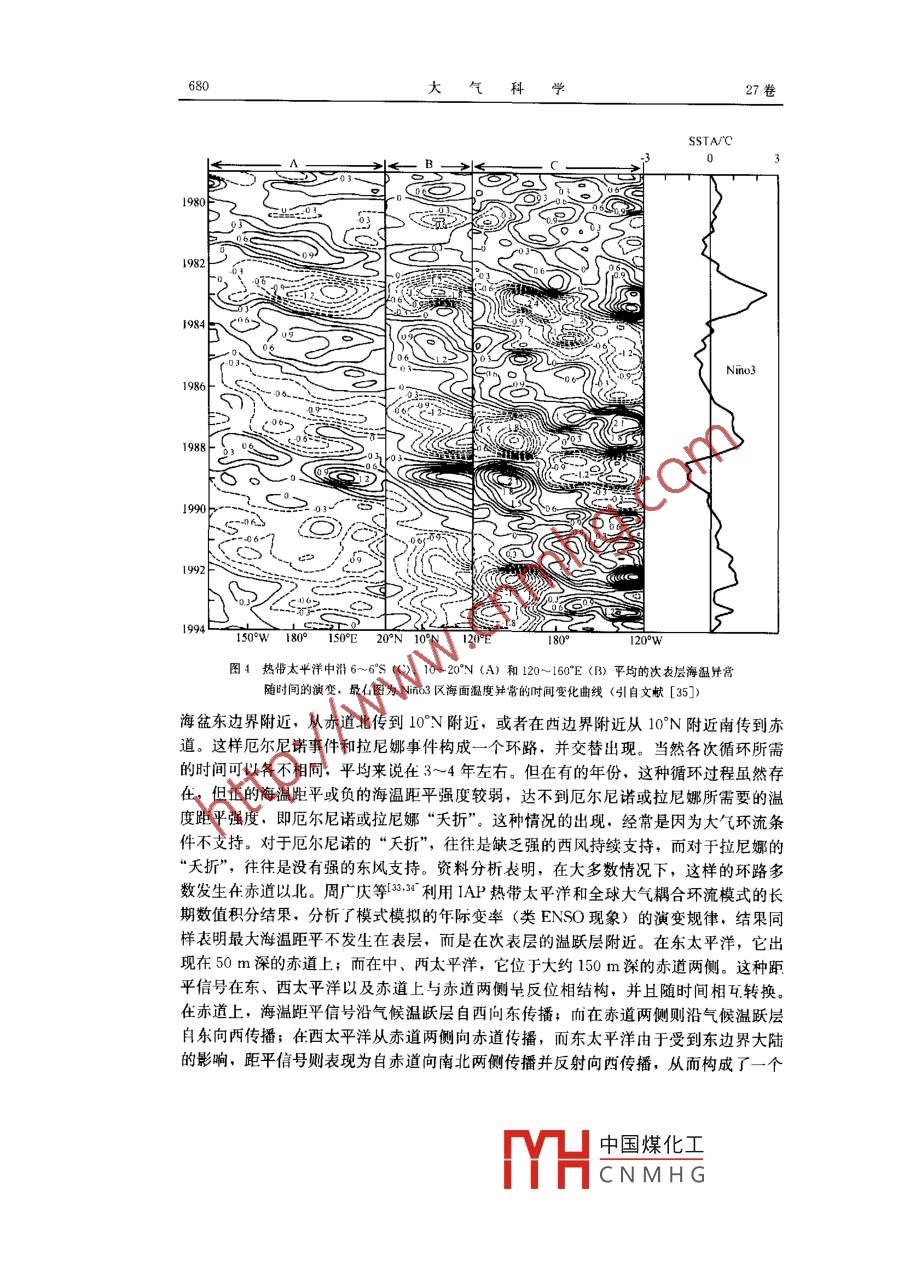 第27卷第4期大氣科學Vol 27 No 4年7月Chinese Journal of Atmospheric SciencesJuly 2003ENSO動力學與預測張人禾])周廣慶2)巢紀平3)1)(中國氣象科學研究院,北京l0081)2)(中國科學院大氣物理研究所,北京10029P4 A3)(國家海洋局海汗洋環(huán)境預報中心,北京10081)摘要發(fā)生在熱帶太平洋地區(qū)的ENSO現(xiàn)象是海氣相互作用的集中表現(xiàn),是年際氣候變化中的最強信號。由于它的發(fā)生會在全球許多地區(qū)引起嚴重的氣候異常,極大地影響著這些地區(qū)的工農業(yè)生產和人民生活,因此,對ENSO的機理及其預測的研究一直是大氣海洋界的個熱點研究課題。中國科學院大氣物理研究所在ENsO的機理及其預測等方面進行了大量的研究,取得了許多研究成果。作者將對中國科學院大氣物理研究所在這方面的一些研究成果進行回顧和介紹關鍵詞:海一氣相互作用;FNSO;預測引言在熱帶太平洋上,氣候平均狀態(tài)下,大洋西部存在著全球海洋表面海水溫度最高的大范圍暖水,但在大洋東部的秘魯和厄瓜多爾沿岸以及沿赤道的狹窄區(qū)域內,存在著海面溫度(SST)的低值區(qū),SST要比熱帶西太平洋區(qū)域低幾度。熱帶太平洋SsT的這種分布特征具有明顯的年際變化,最顯著的表現(xiàn)就是所謂的E1Nino現(xiàn)象,這時赤道中東太平洋的表面冷海水強烈增暖,并且持續(xù)的時間可達一年左右1。研究表明引,發(fā)生在熱帶大氣中的南方濤動( Southern oscillation)現(xiàn)象與厄爾尼諾現(xiàn)象有著內在的聯(lián)系,是與海洋中的厄爾尼諾現(xiàn)象相對應在熱帶大氣中發(fā)生的異?,F(xiàn)象。這種熱帶大氣一海洋耦合系統(tǒng)的緩慢振蕩現(xiàn)象稱之為ENSO發(fā)生在熱帶太平洋地區(qū)的ENSO現(xiàn)象是年際氣候變化中的最強信號。ENSO現(xiàn)象雖然發(fā)生在熱帶,但許多觀測和數(shù)值模擬研究都表明,它會在全球范圍內引起嚴重的氣候異常,在世界許多地區(qū)造成嚴重的旱澇和高低溫災害,極大地影響著這些地區(qū)的工農業(yè)生產和人民生活。因此,近20年來ENSO一直是短期氣候變化方面的一個研究焦點(如 CLIVAR)。關于ENSO機制的大量研究成果,使我們對ENSO動力學的認識有了很大的進展7,而為期10年的TOGA(熱帶海洋和全球大氣)計劃的實施,已使監(jiān)測和預報ENSO成為現(xiàn)實。本文將著重討論近20年來中國科學院大氣物理研究所( IAP/CAS)對ENSO機理和ENSO預測的一些研究成果。200301·20收到,2003-03-20收到修改稿國家自然科學基金資助項目40225012和40005007共同資助中國煤化工CNMHG4期張人不等:ENSO動力學與預測6752熱帶海氣耦合系統(tǒng)的不穩(wěn)定性在ENSO發(fā)生發(fā)展中的作用Sickness最早提出了ENSO是由于熱帶太平洋地區(qū)海一氣相互作用所引起的假說。 Philander等在ST的變化正比于海洋混合層厚度的假定(局地熱力平衡近似)下,發(fā)現(xiàn)海一氣相互作用使得海—氣耦合系統(tǒng)中的擾動變?yōu)椴环€(wěn)定并且向東傳播。Yamagata從理論上分析了這種耦合不穩(wěn)定性,指出東傳不穩(wěn)定擾動的產生是由于海氣相互作用使得海洋 Kelvin波變?yōu)椴环€(wěn)定。Hist引入了完整的線性熱力學方程,同時包括了平流和斜溫層厚度局地變化的蟛響,指出海洋中熱力學過程的形式對所導致的海氣耦合系統(tǒng)的不穩(wěn)定類型具有重要作用。當熱力學方程中局地熱力平衡近似起主要作用時,向東傳的 Kelvin波是不穩(wěn)定的;當固定平均溫度梯度并減小控制局地熱力平衡近似的參數(shù)時,耦合模式中不穩(wěn)定模的結構從類似于 Kelvin波轉變?yōu)轭愃朴赗ossby波在上述研究中,把ENSO現(xiàn)象中向東傳的不穩(wěn)定擾動歸結為不穩(wěn)定 Kelvin波的作用。但是, Kelvin波的發(fā)生不僅要求的條件很嚴,即擾動的徑向速度必須為零,同時,觀測表明ENSO現(xiàn)象向東傳的速度也比 Kelvin波慢。巢紀平等2)和張人禾等1:1采用流場和壓力場之間的高階平衡近似,過濾掉大氣和海洋中的 Kelvin波,在局地熱力平衡近似下討論了熱帶海氣耦合系統(tǒng)中大氣 Rossby波和海洋 Rossby波的的相互作用。理論分析結果(圖1)指出,熱帶大氣和海洋中的赤道 Rossby波相互耦合后,不僅可以產生向西傳的不穩(wěn)定耦合波,在一定條件下也可以產生一類不同于 Kelvin波向東傳的不穩(wěn)定耦合波,指出了把熱帶海氣耦合系統(tǒng)中向東傳的擾動歸結為 Kelvin波這種理論的片面性。數(shù)值試驗結果也證實了理論分析結果的正確性。以上的討論表明,不同的研究得到了不同的結果。實際上, Hirst采用的是原始0.100.00005圖1(a)求解海氣耦合模式得出的特征根實部(實線)及徑向模為偶數(shù)時大氣(斷線)和海洋(虛線)中的特征根分布;(b)不穩(wěn)定模os和c的虛部(引自文獻3])中國煤化工CNMHG676大氣科學27卷運功方程,在大氣和海洋中同時存在著重力慣性波、混合 Rossby重力慣性波、赤道Kelvin波和 Rossby波等自由波,采用差分方法或髙階截斷模式的方法所得到的結果很難看清楚耦合后的擾動究竟由哪些自由波占主導地位。為了清楚地分析哪些自由波動在熱帶海氣耦合系統(tǒng)的不穩(wěn)定擾動中起主導作用,張人禾1,1在赤道平面上取長波近似的條件下,討論了在熱帶海氣耦合系統(tǒng)中取不同徑向模時耕合波的性質,即分別討論了在局地熱力平衡近似下大氣和海洋 Kelvin波的相互作用、大氣 Rossby波和海洋Kelvin波的相互作用、大氣