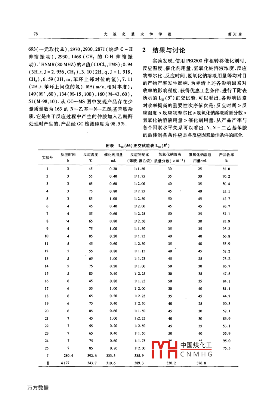 第31卷第1期,連交通Vol.31 No.12010年2月JO'RNAL 0F DAI.IAN JIAOTTONG UINIVERSITYFeb. 2010文章編號:1673- 9590( 2010)01-0077-04聚乙二醇500相轉(zhuǎn)移催化合成N,N-二乙基苯胺田慶偉(大連交通大學(xué)環(huán)境科學(xué)與工程學(xué)院,遼寧大連116028)摘要:用聚乙二醇 500作相轉(zhuǎn)移催化劑,在常壓下由苯胺和澳乙烷合成N.N-二乙基苯胺,研究了多種反應(yīng)因素對目的產(chǎn)物產(chǎn)率的影響,提出常壓催化合成目的產(chǎn)物的最佳工藝條件是:苯胺和溴乙烷的摩爾比為1:1.75 ,催化劑用量0.60 g.在45 mL 30 x I0 : 2的氫氧化鈉溶液中,反應(yīng)溫度75C ,常壓反應(yīng)7h,產(chǎn)品收率95.0%.關(guān)鍵詞:聚乙二醇;相轉(zhuǎn)移催化;N,N-二乙基苯胺中圖分類號:TQ246.3文獻(xiàn)標(biāo)識碼:A0引言1.2 實(shí)驗(yàn)方法N,N-二乙基苯胺是制備優(yōu)良染料、藥物和在裝有電動攪拌溫度計(jì)、回流冷凝管的500 mL彩色顯影劑的重要中間體,用途廣泛".傳統(tǒng)合四頸燒瓶中,加入11 mL(0. 12 mol)苯胺和15. 75 mL成方法是將定量的苯胺、氯乙烷壓倒裝有液堿的(0.21 mol)澳乙烷,0.60 g(1.2x10-3 mol)聚乙高壓釜中,夾套蒸氣升溫到120C ,壓力為1.2 MPa二醇500 ,45 mL質(zhì)量分?jǐn)?shù)30 x 10-2的氫氧化鈉溶時(shí),停汽.其后由于反應(yīng)熱產(chǎn)生,溫度可升到215~液,加熱控制反應(yīng)瓶溫度為75C,常壓下攪拌反230C ,壓力達(dá)4.5 ~5.5 MPa,反應(yīng)3 h,出料用水應(yīng)7 h,冷卻至室溫,將反應(yīng)液倒入分液漏斗中,靜汽蒸餾.得粗品,加苯二甲酸酐酯化,再進(jìn)行一次置分層.將油.水兩層分離.水層用30mL乙醚分蒸餾得成品,產(chǎn)品收率在85%以上2).近年來,常三次萃取,萃取液與油層混合,用無水硫酸鎂干燥壓相轉(zhuǎn)移催化合成N,N一二乙基苯胺的方法(-5] 3 h,過濾,蒸出乙醚.用等體積的乙酸酐處理剩余引起人們關(guān)注.在此基礎(chǔ)上,本文提出用聚乙二醇物并保持過夜,以除去游離的仲胺.加入過量500( PEG500)作相轉(zhuǎn)移催化劑,在氫氧化鈉溶液10%的鹽酸洗滌至酸性(pH=1 ~2),分出乙酰存在下,使苯胺和溴乙烷作用,合成了N,N-二N- -乙基苯胺,用25%氫氧化鈉溶液調(diào)pH為11 ~乙基苯胺,研究了多種反應(yīng)因素對目的產(chǎn)物產(chǎn)率12,靜置分層,分離油、水兩層水層用30 mL乙醚萃的影響,提出了最佳工藝條件,產(chǎn)品產(chǎn)率為95%.取兩次.將萃取液與油層混合,用無水硫酸鎂干燥1實(shí)驗(yàn)方法3 h,蒸去乙醚后,減壓蒸餾,收集沸點(diǎn)62 ~66C/400 Pa時(shí)的餾分,得N,N一二乙基苯胺14.63 g, 收率1.1測試儀 器和試劑Perkin-Elmer 1730型傅里葉變換紅外光譜95.0%.儀,美國PE公司;PFT-NMR Bruker AC-80型核磁1.3產(chǎn)品分析共振譜儀,美國Bruker公司;日立AC-80型質(zhì)譜將減壓蒸餾得到的產(chǎn)品分別通過儀,日本日立公司;島津GC-16型氣相色譜儀,日IR,' HNMR ,GC-MS光譜鑒定,證實(shí)是N,N-二乙本島津公司. .基苯胺,IR值(cm-'):1 598,1 573,1 507,1 449苯胺、氫氧化鈉、乙酸酐均為AR;溴乙烷、(芳環(huán),C-C骨架振動) ,3 025(芳環(huán),C-H伸縮PEG500均為CP.振動),1 355,1 266(芳環(huán), C-N伸縮振動) ,746,中國煤化工收稿日期:2009-04-20CNMHG作者簡介:田慶偉( 1963-),男,副教授,碩士,主要從事精細(xì)化子麗和梁科中間體時(shí)研咒E-mail:qwian63@ hotmail. com.78大連交通大學(xué)學(xué)報(bào)第31卷693(-元取代苯) ,2970, 2930,2871(烷烴C-H2結(jié)果 與討論伸縮振動),2930, 1468(CH2的C-H伸縮振.動)." HNMR(80 MHZ)的8值(CDCI,TMS) :0.94實(shí)驗(yàn)發(fā)現(xiàn),使用PEG500作相轉(zhuǎn)移催化劑時(shí),(3H,t,J =2.9s6, CH,),3.10(2H,q,.J=1. 918,反應(yīng)溫度、催化劑用量、氫氧化鈉溶液濃度、反應(yīng)CH2),6. 59(3H,m,苯環(huán)上鄰對位的氫),7.11物摩爾比、反應(yīng)時(shí)間、氫氧化鈉溶液用量等均對目(2H,t,苯環(huán)上間位的氫). MS( m/z,相對豐度):的產(chǎn)物產(chǎn)率發(fā)生影響.為弄清上述各影響因素對149(M" ,60),134( M. I5,100), 160(M-43,60),收率的影響程度,獲得優(yōu)惠工藝條件,進(jìn)行了附表51(M-98,10).從GC- -MS圖中發(fā)現(xiàn)產(chǎn)品存在少所示的L2s(5*)正交試驗(yàn).可以看出,各影響因素量質(zhì)量數(shù)為163的N-乙基- _N- -乙?;桨冯s對收率提高的重要性次序依次是:反應(yīng)時(shí)間>反質(zhì).它是由于反應(yīng)過程中產(chǎn)生的仲胺加人乙酰酐應(yīng)溫度>反應(yīng)物摩爾比>氫氧化鈉溶液質(zhì)量分?jǐn)?shù)>處理時(shí)產(chǎn)生的,產(chǎn)品經(jīng)CC檢測純度為98.5%.氫氧化鈉溶液用量>催化劑用量.從產(chǎn)品產(chǎn)率與各個(gè)因素水平關(guān)系可以看出,N,N-二乙基苯胺的最佳制備條件應(yīng)是各反應(yīng)因素最佳條件的綜合,附表L(56)正交試驗(yàn)表 L2(5*)實(shí)驗(yàn)號反應(yīng)時(shí)間反應(yīng)溫度 催化利用量 反應(yīng)物配比氯氧化鈉溶液氫氧化鈉溶液產(chǎn)品收率hm(苯股:澳乙燒)質(zhì)量分?jǐn)?shù)(x10-2)用量/mL%450.201:1.50302:82.05s0.401:1.7570.260.601:2.003550.4750.801:2.2544035.1851.001:2. s0s042.786.7sc87.11:2.503C83.93:93.21066.855.912s51:1.1552.21:1.72573.21:1.005086. 747.584.100.244.71950.320852.121225S53.123247:95.0中國煤化工75.5280.4392.6333335.9 ,YHCNMHG4 177343.7310.6 .389.3330.2376.8第1期田慶偉:聚乙二醇500相轉(zhuǎn)移催化合成N,N-二乙基苯胺.79附表Lx(56)正交試驗(yàn)表 L2g(5*)(縷)反應(yīng)時(shí)間反應(yīng)溫度催化劑用量反應(yīng)物配比氫氧化鈉溶液氫氧化鈉溶液產(chǎn)品收率實(shí)驗(yàn)號muL(苯胺: