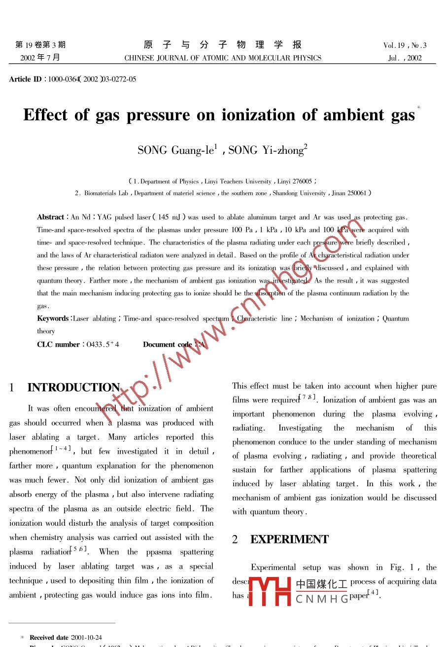 第19卷第3期原子與分子物理學(xué)報Vol.19,N.3002年7月CHINESE JOURNAL OF ATOMIC AND MOLECULAR PHYSICS2002Article Il:1000036(2002)3027205Effect of gas pressure on ionization of ambient gasSONG Guang-le, song Yi-zhong(l. Department of Physics Linyi Teachers University Linyi 2760052. Biomaterials Lab, Department of materiel science the southen zone, Shandong University Jinan 250061Abstract: An Nd: YAG pulsed laser( 145 m] )was used to ablate aluminum target and Ar was used as protecting gasTime-and space-resolved spectra of the plasmas under pressure 100 Pa, 1 kPa, 10 kPa and 100 kPa were acquired withtime-and space-resolved technique. The characteristics of the plasma radiating under each pressure were briefly describedand the laws of Ar characteristical radiaton were analyzed in detail. Based on the profile of Ar characteristical radiation underthese pressure the relation between protecting gas pressure and its ionization was briefly discussed and explained withquantum theory. Farther more the mechanism of ambient gas ionization was investigated. As the result, it was suggestedthat the main mechanism inducing protecting gas to ionize should be the absorption of the plasma continuum radiation by theKeywords: Laser ablating Time-and space-resolved spectrum Characteristic line Mechanism of ionization; QuantumCLC number :0433. 54Document code:: AINTRODUCTIONThis effect must be taken into account when higher purefilms were required 78. lonization of ambient gas was anIt was often encountered that ionization of ambientimportant phenomenon during the plasma evolvingas should occurred when a plasma was produced withradiating. Investigating the mechanism oflaser ablating a target. Many articles reported thisphenomenon conduce to the under standing of mechanismphenomenorfI-43, but few investigated it in detuil of plasma evolving radiating and provide theoreticalfarthequantum explanation for the plsustain for farther applications of plasma spatteringwas much fewer. Not only did ionization of ambient gasinduced by laser ablating target. In this work, theabsorb energy of the plasma, but also intervene radiating mechanism of ambient gas ionization would be discussedpetra of the plasma as an outside electric field. Thewith quantum theoryionization would disturb the analysis of target compositionwhen chemistry analysis was carried out assisted with the 2 EXPERIMeNtplasma radiations 6].When theinduced by laser ablating target was as a specialExperimental setup was shown in Fig. 1, thetechnique used to depositing thin film the ionization of desmbient protecting gas would induce gas ions into film. hasTH中國煤化工 process of acquiring dataCNMHGpape! 4a Received date 22001-10-24ang-le( 1962-)MaleRizhao city Shandong province associate professor, Department of Physics Linyi Teachers第19卷第3期SONG Guang-le et al : Effect of gas pressure on ionization of ambient gas2733 RESULTS AND DISCUSSIONesultsNd: YAG LASERLaser beamdiodeYIME DELAY SETOSCILLOSCOPEFASTGATEPULSE SETPRERINTERL:SPECTROMETEHR·320gas inCONTROLDETECTORSYSTEMPUMPPLOTTERFig 1 Schematic diagram of the experimental setup10ns30ns70ns400sons110ns130ns170ns200ns220ns250ns300ns200Ah390420390420390420390420390420中國煤化工Fig. 2 Time-resolved emission spectra of the plasmas obtof the surfaceunder pressure 100 Pa, laser pulse energy 145YHaCN MH gme to eachspectrum had been marked in it, respectivelyThe radiating spectra of the plasma were shown in kPa, 100 kPa were shown in Fig 3. Here only those withFig. 2, which were acquired with ambient gas pressure setdiating signal were given outupt100數(shù)據(jù) e obtained under pressure1kPa,:10274原子與分子物理學(xué)報2002年3.2 AnalysisAr+ started after 30 ns delayed and died away after 300As shown in Fig. 2, continuum radiation of the ns delayed or so. At whole radiating stage of the plasmaplasma was quite strong after Ins delayed. Within 30 ns the radiation of ions was much weaker than that offter laser beam reaching the surface of target, the plasma continuum. After 100 ns delayed radiation of aluminumradiation mainly consisted of continuum radiation. Afterhad been quite strongetion30 ns delayed, the radiation of aluminum, atom Ar, ion kept stabilization, and continuum radiation went onArt appeared. scale for the spectra had been given in ourdeclining. Within 220 ns delayed, characteristic radiatiorelative works 9] all characteristic radiation addedgot gradually stronger and became main radiation of thecontinuum radiation, and they began lagging the latter plasma. After 220ns delayed, radiation of aluminum30 ns or so. With delayed time increasing, the began to decline continuum got weaker farther more butcharacteristic radiation became stronger and stronger,onthe first declined slower than the latter. After 350 nsthe contrary the continuum got weaker and weakerdelayedoIseWithin 90 ns delaved, the characteristic radiation was aluminum decayed slower so that it was still strong aftermuch weaker than continuum The radiation of r and500 ns delyedLMMi WVWavelength(nm)(a)10 kP(b)1 kPa(c)100 kPaFig 3 Time-resolved emission spectra bearing Ar* characteristic emission, obtained at z=0. 1 mm in front of the suface,er pulse energy 145 mJ/pulse in Ar, the delayed time to each spectrum had been marked in it, respectively,under pressure3. 4 Discussionndicated that there were lots of Art, and that Ar,aseen from Fig. 2 it was easily to be found out thatambient gas deeply absorbed the energy of the plasmaere was a broad dent adding to continuum on almostFrom Fig. b), under pressure 1 kPa, there were lots ofspectrum. The d elines of Ar+ too. These characteristic lines were clearabsorbing spectrum which derived from aluminum sharp but weaker. This indicated that there were manyresonantly absorbed continuum radiation 10 JArt, and that the absorption of plasma by Ar was3. 4.1 Radiating lines of ionslighter, From Fig 3(c), under pressure 100 kPa,thereAt the stage of Ar radiating, there w