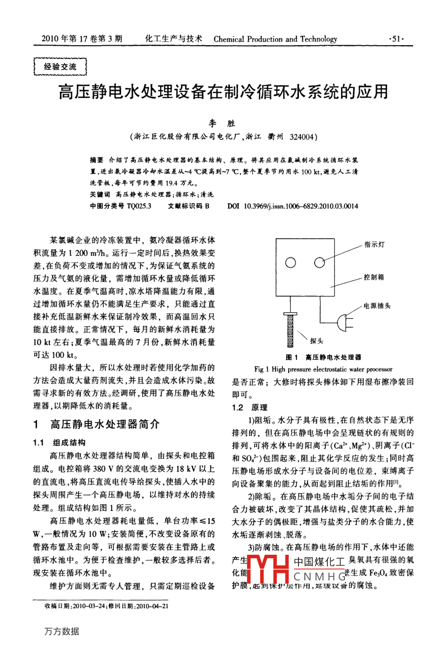 2010年第17卷第3期化工生產(chǎn)與技術(shù) Chemical Production and Technology51經(jīng)驗(yàn)交流高壓靜電水處理設(shè)備在制冷循環(huán)水系統(tǒng)的應(yīng)用李勝(浙江巨化股份有限公司電化廠,浙江衢州324004)摘要介紹了高壓靜電水處理器的基本結(jié)構(gòu)、原理。將其應(yīng)用在氯堿制冷系統(tǒng)循環(huán)水裝置,進(jìn)出氯冷凝器冷卻水溫差從~4℃提高到~7℃,整個(gè)夏季節(jié)約用水100kt,避免人工清洗管板,每年可節(jié)約費(fèi)用19.4萬元。關(guān)鍵詞高壓靜電水處理器;循環(huán)水;清洗中圖分類號(hào)TQ0253文獻(xiàn)標(biāo)識(shí)碼BDoI10.3969jisn.10066829.2010030014某氯堿企業(yè)的冷凍裝置中,氨冷凝器循環(huán)水體指示燈積流量為1200mh。運(yùn)行一定時(shí)間后,換熱效果變差,在負(fù)荷不變或增加的情況下,為保證氣氨系統(tǒng)的壓力及氣氨的液化量,需增加循環(huán)水量或降低循環(huán)控制箱水溫度。在夏季氣溫高時(shí),涼水塔降溫能力有限,通過增加循環(huán)水量仍不能滿足生產(chǎn)要求,只能通過直電源插頭接補(bǔ)充低溫新鮮水來保證制冷效果,而高溫回水只能直接排放。正常情況下,每月的新鮮水消耗量為10kt左右;夏季氣溫最高的7月份,新鮮水消耗量探頭可達(dá)100kt圖1高壓靜電水處理器因排水量大,所以水處理時(shí)若使用化學(xué)加藥的Fig 1 High pressure electrostatic water processor方法會(huì)造成大量藥劑流失,并且會(huì)造成水體污染故是否正常;大修時(shí)將探頭棒體卸下用濕布擦凈裝回需尋求新的有效方法。經(jīng)調(diào)研,使用了高壓靜電水處理器,以期降低水的消耗量。1.2原理1高壓靜電水處理器簡介1)阻垢。水分子具有極性,在自然狀態(tài)下是無序排列的,但在高壓靜電場中會(huì)呈現(xiàn)鏈狀的有規(guī)則的1.1組成結(jié)構(gòu)排列,可將水體中的陽離子(Ca2、Mg2+)、陰離子(l高壓靜電水處理器結(jié)構(gòu)簡單,由探頭和電控箱和SO2)包圍起來阻止其化學(xué)反應(yīng)的發(fā)生;同時(shí)高組成。電控箱將380V的交流電變換為18kⅤ以上壓靜電場形成水分子與設(shè)備間的電位差,束縛離子的直流電,將高壓直流電傳導(dǎo)給探頭,使插入水中的向設(shè)備聚集的能力,從而起到阻止結(jié)垢的作用。探頭周圍產(chǎn)生一個(gè)高壓靜電場,以維持對水的持續(xù)2)除垢。在高壓靜電場中水垢分子間的電子結(jié)處理。組成結(jié)構(gòu)如圖1所示合力被破壞,改變了其晶體結(jié)構(gòu),促使其疏松,并加高壓靜電水處理器耗電量低,單臺(tái)功率≤15大水分子的偶極距增強(qiáng)與鹽類分子的水合能力,使W,一般情況為10W;安裝簡便,不改變設(shè)備原有的水垢逐漸剝蝕、脫落。管路布置及走向等,可根據(jù)需要安裝在主管路上或3防腐蝕。在高壓靜電場的作用下,水體中還能循環(huán)水池中。為便于檢查維護(hù),一般較多選擇后者。產(chǎn)生V中國煤化工臭氧具有很強(qiáng)的氧現(xiàn)安裝在循環(huán)水池中。化CNMHG生成FeQO4致密保維護(hù)方面則無需專人管理,只需定期巡檢設(shè)備護(hù)膜,起到悚爐層壇作用,延駿以奮的腐蝕。收稿日期:201003-24;修回日期:201004-2152李勝高壓靜電水處理設(shè)備在制冷循環(huán)水系統(tǒng)的應(yīng)用經(jīng)驗(yàn)交流4)殺菌。在高壓靜電場的作用下,水體生成的臭℃,說明氨冷凝器換熱效率得到了提高。按每下降1氧還具有很強(qiáng)的殺滅微生物的作用;還改變了水中℃冰機(jī)耗電量下降31%計(jì)算,氨系統(tǒng)冰機(jī)全年用電衍生的細(xì)菌和藻類的生物場,抑制其代謝。量約為64MWh,每年可節(jié)約電費(fèi)89萬元。2應(yīng)用效果2007年7月份消耗水量為103.6kt,200年7月僅為359k,同比下降了67.7kt(653%)。整個(gè)夏在每年的大修時(shí)拆開氨冷凝器檢查時(shí),可以發(fā)季至少可節(jié)約用水100kt,可節(jié)約費(fèi)用75萬元現(xiàn)水側(cè)管程結(jié)垢嚴(yán)重,一般須請專業(yè)清洗公司進(jìn)行使用高壓靜電水處理器后,可節(jié)約氨冷凝器的清洗。而安裝了高壓靜電處理器2年后拆氨冷凝器清洗費(fèi)用,按每臺(tái)每年1萬元計(jì),共3臺(tái),可節(jié)約清檢查,檢査管板及管程均無結(jié)垢,說明阻垢效果良洗費(fèi)3萬元好。圖2是安裝高壓靜電處理器前后氨冷凝器管板3項(xiàng)合計(jì),每年可節(jié)約費(fèi)用194萬元。結(jié)垢情況對比照片3結(jié)論高壓靜電水處理器在循環(huán)水的裝置上阻垢除垢效果明顯,提高了設(shè)備的換熱效果,節(jié)約了水資源,而且不產(chǎn)生污染排放物,同時(shí)設(shè)備屬免維護(hù)型不需類似加藥裝置一樣配備加藥泵及貯槽等,僅消耗少量的電能,運(yùn)行成本管理成本低,可在循環(huán)水系a.應(yīng)用前b.應(yīng)用后統(tǒng)中推廣使用。圖2氨冷凝器管板應(yīng)用高壓靜電水處理前后結(jié)垢情況對比參考文獻(xiàn)[黃竹陸柱.離子棒靜電水處理器性能研究化學(xué)清洗tatic water treatmen1998.14(1):1-從歷史數(shù)據(jù)看高壓靜電水處理器投用前進(jìn)出(2張偉民劉元章霍廷樣等制冷系統(tǒng)—一原理、運(yùn)行、維修氨冷凝器冷卻水溫差在4℃,而投用后溫差在-7]北京字航出版社,1988248,!!!!!!,!,鬥!!(上接第48頁)報(bào),2007,28(6):1143-11[13]LI B David, A F Ismail. Influence of the thermastabilization [16]Michael S Strana, Hans Agarwal John Pedrick, et al Templat