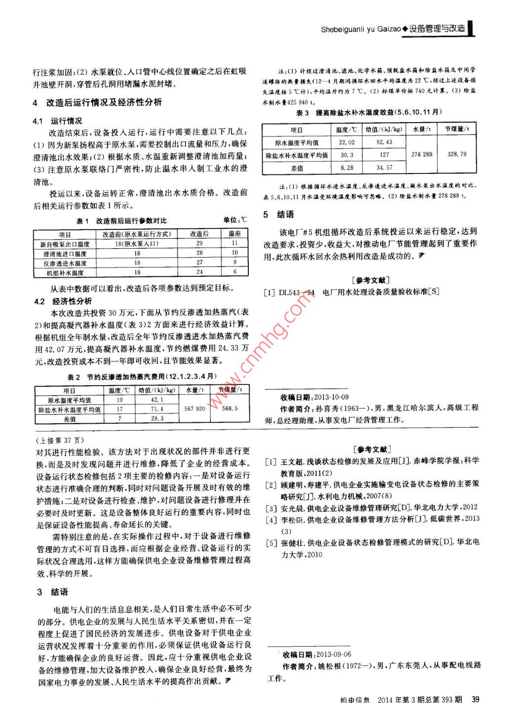設備管理與改造 ◆Shebeiguanli yu Gaizao開式循環(huán)機組循環(huán)水回水余熱利用實踐孫喜秀李東威許良(太倉港協(xié)鑫發(fā)電有限公司,江蘇蘇州215433)摘要:概述了火力發(fā)電廠 循環(huán)水回水余熱利用改造提出的背景.并從方案確定、設備選型方案實施等方面對改造進行了詳細介紹,最后分析了改造后的運行情況及經(jīng)濟性,對同類型機組循環(huán)水回水余熱利用有借鑒意義。關鍵詞:循環(huán)機組;循環(huán)水回水;余熱利用0引言至#7、# 8機組化學原水供水門后,泵進出口管路上各安裝手動當前火電企業(yè)積極進行“節(jié)能降耗、降本增利”,除了實施隔離門1個,3號原水泵加裝旁路,并安裝隔離門。節(jié)能改造外,廢水廢熱利用也逐漸被重視。南方電廠循環(huán)水一對比以上2種方案,方案1存在以下弊端:接管距離遠,施般都采用開式循環(huán),循環(huán)水經(jīng)過凝汽器換熱后排走,攜帶的熱工費用高,將可能影響到原水取水壓頭、循環(huán)水回水虹吸和膠量也被帶走。某電廠通過充分論證后決定利用循環(huán)水回水作球系統(tǒng)正常投運,并且必須單側隔離凝汽器或機組停機方能施為化學原水回收廢熱,這樣既可以提高凝汽器補水溫度,同時工。因此,從安全性、經(jīng)濟性、施工難易度考慮,最終選擇方案2。還可在冬季停運化學反滲透加熱器,節(jié)省加熱蒸汽。2.3 設備選型1改造前概況考慮到虹吸井水位受長江潮位影響很大,且循環(huán)水回水為(1)某電廠因為機組發(fā)電同時還對外供熱,機組補水量較微負壓,要求新購買的自吸泵具備-一定的吸程,并且在揚程上大,補水溫度的高低對機組經(jīng)濟性有一定影響。應該略高于原來的原水泵(改造后新泵替代原水泵運行),流量(2)為確保改造效果和收益率,先在3期#5機組循環(huán)水系參照原水泵選取。統(tǒng)進行試點改造,3期化水系統(tǒng)安裝有3臺原水泵,分別對應33改造方案的實 施臺600t/h機械加速澄清池,原水泵進出口裝有聯(lián)絡門,可更改3.1 工期安排原水泵和澄清池的對應關系?;瘜W制水情況:除鹽水150 m/h,煤沖洗水80m2/h,硫脫300m'/h,工業(yè)水350m?/h。因為取水位置在虹吸井,在機組運行中即可進行改造,工(3)循環(huán)水采用開式循環(huán),水源為長江水,在汽機房外設置期為設備到貨后20天,提前進行自吸泵基礎制作和澆灌、虹吸井,將循環(huán)水回水排入長江。3期循環(huán)水溫度變化情況:1- -12月進水溫度18.4 C,出水溫度27.7 C,平均溫差為32 機務部分施工9.3C.可以看出,循環(huán)水回水溫度全年滿足反滲透進水溫度(1)為降低新泵安裝后的沿程阻力損失,在化學綜合泵房要求。3號原水泵進出口母管間加裝旁路,安裝手動蝶閥2只,并安裝壓力表和溫度表,監(jiān)控溫降和壓降情況。(2)為防止新安裝水2改造方 案確定和設備選型泵破壞虹吸井的虹吸而導致循環(huán)水回水不暢,在虹吸井通大氣2.1改造前 系統(tǒng)運行方式池處安裝350WFB AD自吸泵,同時為減少吸入口損失,在確3期原水泵進水管有2根,分別為3期原水取水管和4期保管道及附件布置長度前提下,新安裝水泵盡可能靠近虹吸原水取水管,3期原水取水管在1號原水泵側,4期原水取水管井。(3)自吸泵人口管道通過池壁開孔向下布置,在池頂安裝在3號原水泵側。4期原水取水管為長期停用狀態(tài)。固定吊架承受人口管道重量,出人口均安裝手動隔離門,出口原水泵運行方式:1.2.3號原水泵分別對應1、2.3號澄清安裝壓力表和溫度表,監(jiān)測循環(huán)水回收溫度。(4) 根據(jù)長江潮池,一般為2座澄清池運行,1座澄清池備用。1 號澄清池只可汐表制定施工計劃,開洞前水泵必須先就位,同時人口閥門安制備工業(yè)水消防水,2、3號澄清池可制備工業(yè)水、消防水和化裝完畢,開洞完成后用臨時堵板封堵,待下次低潮位時再進行學制水用水。為防止供冷卻用的工業(yè)水.煤沖洗水溫度升高,管道穿裝。為確保在潮位上漲前完成入口管道安裝,法蘭焊接改造僅將循環(huán)水回水用作化學制除鹽水用水,循環(huán)水回水輸送好后穿管,穿管結束后直接連接泵人口門法蘭。(5) 自吸泵出至2、3號澄清池。口管道沿泵出口中心線布置,采用地埋方式就近接入#7、#8機2.2改造方案確定組供原水管,出口管道按照地埋管道標準進行防腐。(6)自吸根據(jù)電廠的實際情況,提出了2套改造方案。泵泵體注水管道從循環(huán)水進水管道上取水,安裝隔離閥1只。方案1:從#5機組B側凝汽器循環(huán)水出水門前取水,為確3.3電氣部分施工保水泵進口壓頭,取水位置盡可能靠近收球網(wǎng)簡體,取消3號(1)自吸泵電源取自3期380 V水處理段。(2) 在自吸泵原水泵,新安裝1臺自吸泵。泵出口就近接引到虹吸井邊上的附近安裝自吸泵就地控制柜,控制柜內安裝空氣開關、交流接循環(huán)水管原水取水門后,并加裝1個手動隔離門。觸器熱繼電器。(3)自吸泵具備就地/遠方控制功能,控制電方案2:從#5機組虹吸井前池取水,在虹吸井邊布置1臺纜接至化學控制室。自吸泵在虹吸井池壁上開孔,人口管道通過此孔向下布置,自3.4土建部分施工吸泵采用露天布置方式,電機上部加裝防雨單。出口管道接引(1)水泵基礎制作、養(yǎng)護:由于松土層較厚,要求對基礎進3:Shebeiguanli yu Gaizao◆設備管理與改造行注漿加固;(2)水泵就位、人口管中心線位置確定之后在虹吸注:(1)計經(jīng)過澄清池、濾池