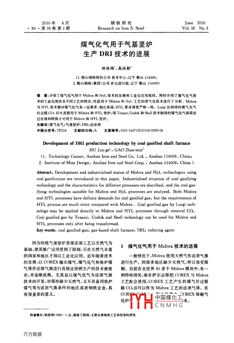 2010年6 月鋼鐵研究June 2010●50●第38卷第3期Research on Iron &. SteelVol. 38 No, 3煤氣化氣用于氣基豎爐生產(chǎn)DRI技術(shù)的進(jìn)展胡俊鴿' ,高戰(zhàn)敏?(1.鞍山鋼鐵股份公司技術(shù)中心,遼寧鞍山114009;2.鞍山鋼鐵<集團(tuán))公司礦山設(shè)計(jì)院,遼寧鞍山114009)摘要:介紹了煤氣化氣用于Midrex和HyL技術(shù)的發(fā)展和工業(yè)化應(yīng)用現(xiàn)狀。同時(shí)介紹了煤氣化氣技術(shù)的工業(yè)化現(xiàn)狀及不同工藝的特點(diǎn),對適用于Midrex和Hyl.工藝的煤氣化技術(shù)進(jìn)行了分析。Midrex與HYL技術(shù)都對煤氣化氣有一-定要求.相比來說,HYL要求得更嚴(yán)格-些。Lurgi 法制得的煤氣化氣經(jīng)過脫Ch后可直接用于Midrex和HYL豎爐;用Texaco.Undok和Shell技術(shù)制得的煤氣化氣都需經(jīng)過處理和轉(zhuǎn)換才可用于Midrex和HYL豎爐。關(guān)鍵詞:煤氣化氣;氣基豎爐;DRI;還原劑中圈分類號:TF554文獻(xiàn)標(biāo)識碼:A文章編號:1001-1447(2010)03-0050-04Development of DRI production technology by coal gasified shaft furnaceHU Jun-ge' , GAO Zhan-min2(1. Technology Center, Anshan lron and Steel Co. Ltd. ,Anshan 114009, China;2. Institute of Mine Design, Anshan Iron and Steel Corp. , Anshan 114009, China )Abstract: Development and industrialized status of Midrex and HyL technologies usingcoal gasification are introduced in this paper. Industrialized situation of coal gasifyingtechnology and the characteristics for different processes are discribed, and the coal gas-ifying technologies suitable for Midrex and HyL processes are analyzed. Both Midrexand HYL processes have definite demands for coal gasified gas, but the requirements ofHYL process are much strict compared with Midrex . Coal gasified gas by Lurgi tech-nology may be applied directly to Midrex and HYL processes through removal CO2. .Coal gasified gas by Texaco, Undok and Shell technology can be used for Midrex andHYL processes only after being transformed,Key words: coal gasified gas; gas based shaft furnace; DRI; reducing agent因?yàn)閭鹘y(tǒng)氣基豎爐直接還原工藝以天然氣為1煤氣化氣用于 Midrex技術(shù)的進(jìn)展基礎(chǔ),使其推廣應(yīng)用受到了限制,只在天然氣豐富的國家和地區(qū)才得以工業(yè)化應(yīng)用。近年隨著技術(shù)-般情況下,Midrex使用天然氣作還原氣源的發(fā)展,以COREX輸出煤氣、煤氣化氣和焦?fàn)t煤進(jìn)行生產(chǎn)。因很多地區(qū)缺少天然氣,所以很受限氣等作還原氣源進(jìn)行直接還原鐵生產(chǎn)的技術(shù)被提制。目前在全世界60多個(gè)Midrex模塊中,有一出,并逐漸成熟。尤其是以煤氣化氣為還原氣源例特殊情況,南非薩爾達(dá)那把COREX與Midrex技術(shù)的開發(fā),對那些缺少天然氣,又不具備用焦?fàn)t工藝配合使用,COREX工藝產(chǎn)生的煤氣經(jīng)過脫煤氣等為還原氣源條件的地區(qū)或者鋼鐵企業(yè),具除CO2后可以作為Midrex工藝的還原氣體。在有很重要的意義。COF中國煤化]FXOREX熔融氣化爐=e水。:TY^HCNMHG作者筒介:胡俊鴿(1966- ),女.高級工程師.主要從事煉鐵工藝和設(shè)備的研究.第3期胡俊鴿,等:煤氣化氣用于氣基豎爐生產(chǎn)DR1技術(shù)的進(jìn)展●51●近年來,由于對DRI的需要,使用煤氣化器比設(shè)計(jì)為0.5~4.0。如果煤氣化技術(shù)能產(chǎn)生符合與Midrex連接的概念被提了出來。煤氣化裝置要求的氣體,就不需要轉(zhuǎn)換裝置來改變氣體成分;的主要目的是產(chǎn)生Midrex工藝所需要的還原氣如果q(H2 )太低,則需要進(jìn)行氣體轉(zhuǎn)換。體。還原氣體主要參數(shù)包括H2與CO的總體積南非薩爾達(dá)那的COREX與Midrex配合裝分?jǐn)?shù)p(H2)/q(CO)比、p(H2 + CO)/q(H2O+置中,COREX輸出氣體的φ( H2 )/q(CO)和COr)之比等。為了高效生產(chǎn)DRI, Midrex工藝φ(H2 +C0)/q(H2O+CO2)之比都較低,見表1.要求氣體中H2與CO的總體積分?jǐn)?shù)大于90 %,因此,必須選擇CO2去除裝置,南非COREX/φ(H2 +CO)/q(H2O+CO2)之比至少為10。一Midrex配合裝置中選用了VPSA 來提高輸出氣般情況下,Midrex生產(chǎn)廠都把φ( H2 )/q(CO)之體的質(zhì)量。表1 Corex 工藝輸出煤氣的成分q(H2)/q(CO)φ(H2+CO)/q(C0)/%q(H2)/%q(CO2)/% q(Nz + H2O>/% q(CH.)/%φ(H2O+00))0. 5~243~4512~2230~321~61~2南非薩爾達(dá)那的COREX爐每生產(chǎn)1 t鐵水傳統(tǒng)HYLM T藝中使用天然氣,天然氣在重產(chǎn)生熱值為7 350 kJ/m3 (p(C0+ H2)>65 %)的整器中裂解通常需添加水蒸汽。為獲得φ(H2)輸出氣體2000 m',在去除CO2之后,只有在較高的還原氣體,需要脫除CO2。HYLM工藝的q(H2 +C0)≥90 %時(shí),輸出煤氣才能用來生產(chǎn)直1個(gè)主要優(yōu)點(diǎn)是還原氣體的產(chǎn)生和直接還原部分接還原鐵。薩爾達(dá)那廠Midrex 裝置的作業(yè)率約是獨(dú)立的,在選擇還原氣體方面具有極大的靈活為90%,年產(chǎn)DRI量為75萬t,DRI金屬化率約性。目前的HYL.M技術(shù)可選擇氫氣.傳統(tǒng)的重整為92 % ,w(C)約為1.6 %。氣體、煤的氣化氣體焦?fàn)t煤氣、碳?xì)浠衔餁怏w、2煤氣化氣用于希爾(HYL)直接還原工COREX排出氣體等作還原氣源。HYL叮工藝對還原氣的要求如下:q(H2)在74.1 %以上,藝的進(jìn)展φ(H2)/q(CO)之比為5.7,p(H2 +CO)/q(H2O2.1 HYLI工藝使用煤氣化氣+CO2)之比為18. 53(見表2)。表2 HYLM 工藝使用Coh脫除裝置后所用氣體的參數(shù)重整氣/還原氣/H2)/p(C0)/p(CH4)/ q(CO2)/q(H2O)/ qp(N2)/中0%(m'.t-')(m2.Fi)%560~4801 700~1 80074.113.07.03.31.41.2二2.2 使用煤氣化氣的HYL ZR和HYL在ENERGIRON反應(yīng)豎爐內(nèi)部,會發(fā)生一ENERGIRON工藝些部分氧化和重整反應(