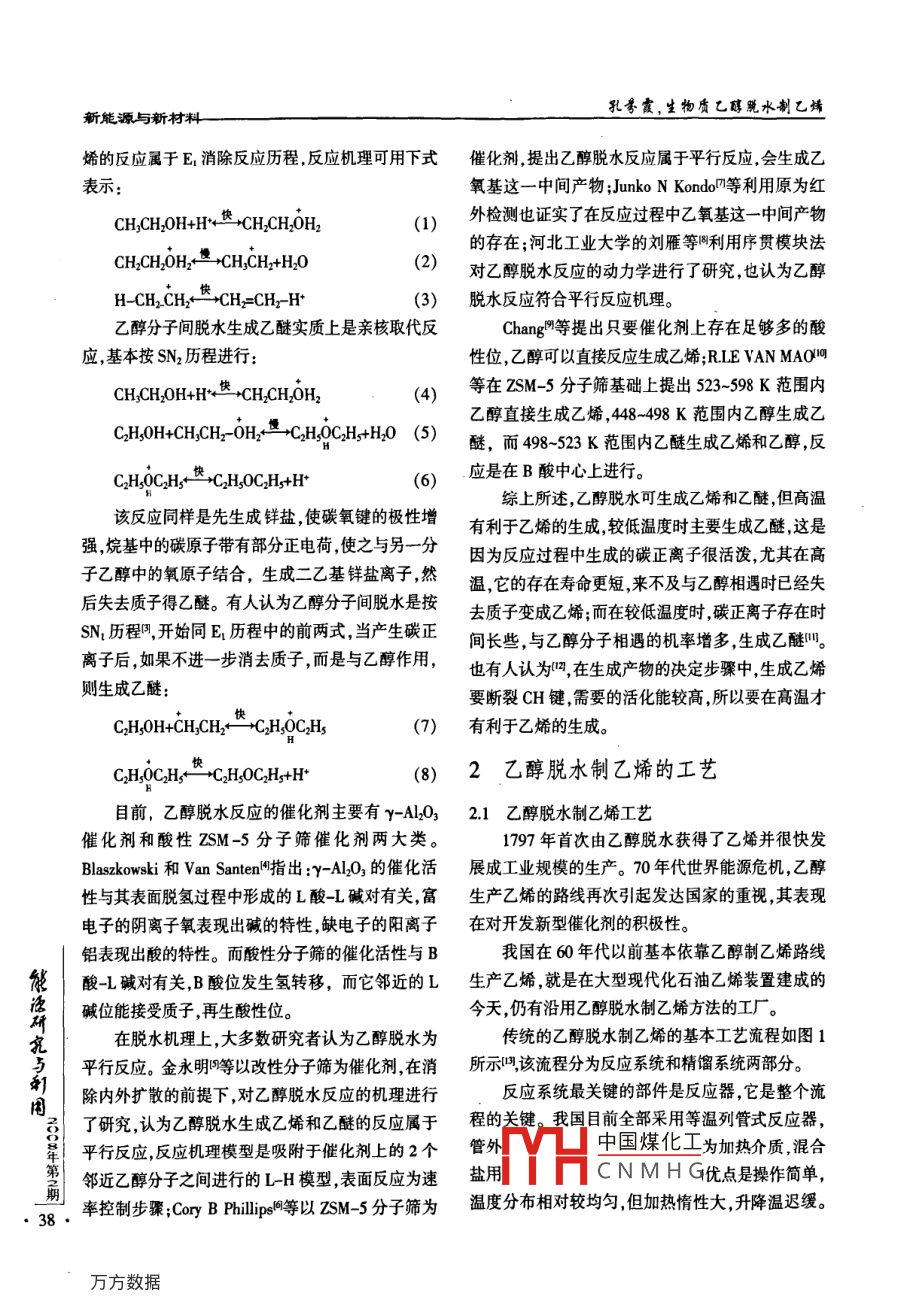 新能源與新材料生物質匕醇脫水制乙烯孔芬霞肖睿(東南大學能源與環(huán)境學院江蘇南京210006摘要:介紹了生物質乙醇脫水制乙烯的發(fā)展現(xiàn)狀,并與石油裂解制乙烯進行了比較,闡述了其突出的優(yōu)點。同時對生物質乙醇脫水制乙烯的反應動力學機理、國內外常用的反應器和主要工藝進行了闡述。最后指出了目前存在的問題,如原料來源、工藝和設備的改進、新型催化劑的研制等。關鍵詞:生物質乙醇;催化劑;反應機理;反應器工藝Abstract: The development condition of biomass ethanol dehydrating to produce ethyleneintroduced, giving a comparison with petroleum cracking to ethylene; its outstanding advantagealso discussed. At the same time, the reaction kinetic mechanism, the commonly used reactor andprocess at home and abroad are in discussion. At last, this paper points out the problems at presentsuch as raw material source, the improvement of process and equipment, the problem of research onnew catalysts, et al.Key words biomass ethanol; catalysts; reaction mechanism; reactor and process中圖分類號:TK019文獻標志碼:A文章編號:1001-5523(200802-0037-04目前有75%的石油化工產(chǎn)品由乙烯生產(chǎn),乙烯可避免對石油資源的依賴。對貧油或無油國家及地產(chǎn)量已成為衡量一個國家石油化工工業(yè)發(fā)展水平區(qū),尤其對以農(nóng)業(yè)為主的國家十分重要。的標志。目前國家已明確將生物乙醇脫水制乙烯列(2)石油貯量隨著開采量的增加和開采時間的人“863計劃”生物和現(xiàn)代農(nóng)業(yè)領域的“生物能源技延長,逐漸減少要考慮將來生產(chǎn)乙烯原料的長久來術開發(fā)與產(chǎn)業(yè)化”項目指南中。生物質乙醇指以生源問題物質為原料通過發(fā)酵制得的乙醇川,生物質原料包(3)用生物質乙醇作原料脫水制乙烯投資少建括玉米高粱、小麥、大麥、甘蔗、甜菜和土豆等含糖設周期短收效快,工藝簡單技術要求不高。類和淀粉的農(nóng)作物,此外城市垃圾、甘蔗渣、小樹(4)生物質乙醇催化脫水制乙烯純度高,產(chǎn)品單干、木片等纖維質原料也可用來生產(chǎn)生物燃料乙純。如果不要求聚合乙烯則可不必分離直接使用醇。生物乙醇濃度較低,通常僅為10%(質量分數(shù))(乙烯純度一般可達98%)。左右。發(fā)酵液中還含有許多其他雜質,如甲醇、乙酸、甘油等,通過蒸餾將乙醇產(chǎn)物分離純化需要消有極大的好處。耗很大的能量。乙烯可以由乙醇脫水得到因此將能次研究與(5)利用生物質乙醇作為替代原料對改善環(huán)境對低濃度的生物乙醇不經(jīng)過嚴格的分離純化,而是一1乙醇脫水的動力學研究步催化脫水制乙烯可以作為生物質產(chǎn)業(yè)的一個重要發(fā)展方向。中國煤化工間脫水和分子內脫水兩程和分子間脫生物質乙醇脫水制乙烯有其突出的優(yōu)點CNMHG水(1)原料乙醇主要來源于農(nóng)副產(chǎn)品的發(fā)酵這樣乙醇在酸催化作用下,發(fā)生分子內脫水生成乙,37,孔霞,生物質乙醇脫水制乙烯新能源與新材料烯的反應屬于E1消除反應歷程,反應機理可用下式催化劑提出乙醇脫水反應屬于平行反應,會生成乙氧基這一中間產(chǎn)物; Junko N Kondo(等利用原為紅CHJCH:OH+Hv快八 CHiCH,OH2(1)外檢測也證實了在反應過程中乙氧基這一中間產(chǎn)物的存在;河北工業(yè)大學的劉雁等利用序貫模塊法CH2CH2OH2++CH3 CHr+H,0(2)對乙醇脫水反應的動力學進行了研究,也認為乙醇H-CH, CH2++CH=CHr-H*(3)脫水反應符合平行反應機理乙醇分子間脫水生成乙醚實質上是親核取代反Chang等提出只要催化劑上存在足夠多的酸應,基本按SN2歷程進行:性位,乙醇可以直接反應生成乙烯;RLEⅤ AN MAOCHJCH2OH+H*++CHCH,OH2(4)等在ZSM5分子師基礎上提出52398K范圍內乙醇直接生成乙烯,448-498K范圍內乙醇生成乙CH,OH+CH,CHr-OH2+C2HSOC2H,+H,0 (5)醚,而498-523K范圍內乙醚生成乙烯和乙醇,反CHSOC++CHSOCH+H(6)應是在B酸中心上進行。綜上所述,乙醇脫水可生成乙烯和乙醚但高溫該反應同樣是先生成鐸鹽,使碳氧鍵的極性增有利于乙烯的生成,較低溫度時主要生成乙醚,這是強,烷基中的碳原子帶有部分正電荷使之與另一分因為反應過程中生成的碳正離子很活潑尤其在高子乙醇中的氧原子結合,生成二乙基鏵鹽離子,然溫,它的存在壽命更短,來不及與乙醇相遇時已經(jīng)失后失去質子得乙醚。有人認為乙醇分子間脫水是按去質子變成乙烯:而在較低溫度時碳正離子存在時SN歷程明,開始同E1歷程中的前兩式,當產(chǎn)生碳正間長些,與乙醇分子相遇的機率增多生成乙醚。離子后如果不進一步消去質子而是與乙醇作用,也有人認為嗎,在生成產(chǎn)物的決定步驟中生成乙烯則生成乙醚要斷裂CH鍵需要的活化能較高所以要在高溫才CH3OH+CHCH,++C2HSOC Hs(7)有利于乙烯的生成。CHOC2H一C2HOC2H+H(8)2乙醇脫水制乙烯的工藝目前,乙醇脫水反應的催化劑主要有γ-Al4O32.1乙醇脫水制乙烯工藝催化劑和酸性ZSM-5分子篩催化劑兩大類1797年首次由乙醇脫水獲得了乙烯并很快發(fā)Blaszkowski和 Van Santen指出:γ-AlO3的催化活展成工業(yè)規(guī)模的生產(chǎn)。70年代世界能源危機,乙醇性與其表面脫氫過程中形成的L酸L堿對有關,富生產(chǎn)乙烯的路線再次引起發(fā)達國家的重視,其表現(xiàn)電子的陰離子氧表現(xiàn)出堿的特性缺電子的陽離子在對開發(fā)新型催化劑的積極性。鋁表現(xiàn)出酸的特性。而酸性分子篩的催化活性與B我國在60年代以前
