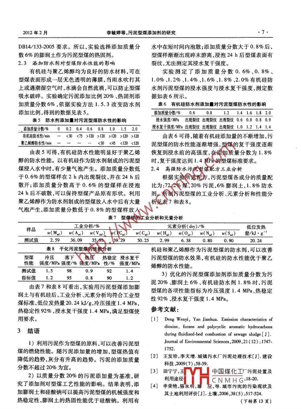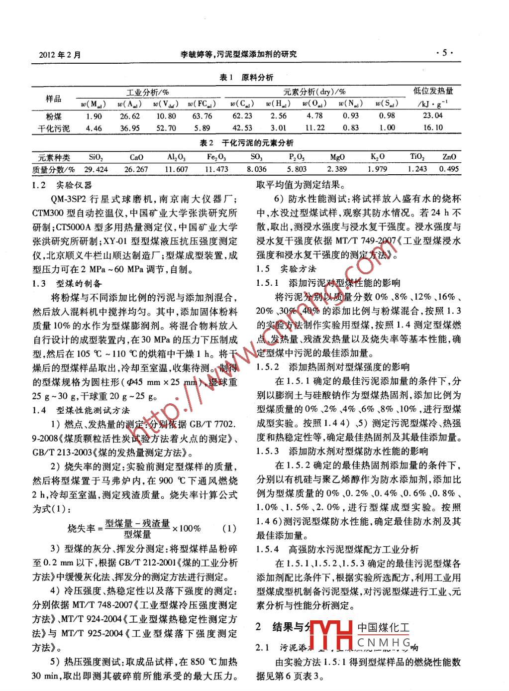 第32卷第1期山.西化工Vol.32 No.12012年2月SHANXI CHEMICAL INDUSTRYFeb.2012科研與開(kāi)發(fā),污泥型煤添加劑的研究,李毓婷,郭彥霞,程芳琴(山西大學(xué)資源與環(huán)境工程研究所,山西 太原030006)摘要:污泥具有一定的熱值和黏結(jié)性。以污泥與粉煤為原料,采用膨潤(rùn)土與硅酸鈉為熱固劑,有機(jī)硅與聚乙烯醇為防水劑,制備工藝性能優(yōu)良的型煤。實(shí)驗(yàn)考察了污泥量、熱固劑與防水劑的種類及添加比例。結(jié)果表明,型煤的灰分和揮發(fā)分隨污泥量的增加而升高,發(fā)熱量降低;熱固劑與防水劑的添加使型煤的熱壓強(qiáng)度與防水性明顯提高;各因素優(yōu)化的工藝參數(shù)為污泥質(zhì)量分?jǐn)?shù)20%、膨潤(rùn)土熱固劑質(zhì)量分?jǐn)?shù)6%、有機(jī)硅防水劑質(zhì)量分?jǐn)?shù)1. 8%時(shí),型煤抗壓強(qiáng)度1.4 MPa,熱穩(wěn)定性92% ,發(fā)熱量20.24 kJ/g,浸水復(fù)干強(qiáng)度1. 4 MPa。測(cè)試值均符合山西省型煤地方標(biāo)準(zhǔn)DB14/133-2005<太原市鍋爐用潔凈型煤》的各項(xiàng)指標(biāo)要求。關(guān)鍵詞:型煤;污泥;添加劑;工藝性能中圖分類號(hào):X703 ;TQ536文獻(xiàn)標(biāo)識(shí)碼:A文章編號(hào):1004-7050(2012)01-0004-04引言成型后的污泥型煤存在冷、熱強(qiáng)度低,防水防潮性能隨著污水處理量的增加,污泥的排放量日益增差等問(wèn)題,容易導(dǎo)致型煤在運(yùn)輸和儲(chǔ)存中發(fā)生破碎多。2009年,我國(guó)每天產(chǎn)生濕污泥近10萬(wàn)t。到和遇水分散,因此使污泥型煤的工業(yè)應(yīng)用受到限制。2010年底,我國(guó)每天產(chǎn)生濕污泥達(dá)到17.5萬(wàn)t。污本文以粉煤和污泥作為主要原料,常溫條件下泥的大量排放不僅占用了大量的土地,而且污染了加壓成型,考察污泥用量、添加劑種類與比例等對(duì)污泥型煤工藝性能的影響,以便開(kāi)發(fā)高強(qiáng)、防水、易燃土壤、水體和大氣(13] ,嚴(yán)重威脅生態(tài)環(huán)境。由于污泥中含有30% ~40%的可燃物質(zhì),干燥等性能優(yōu)良的污泥型煤,提高污泥的資源化用量。后可產(chǎn)生15 kJ/g~21 kJ/g的熱能,而且污泥有一1實(shí)驗(yàn)部分定的黏結(jié)性能,因此將污泥與粉煤復(fù)配可制成污泥.1 實(shí)驗(yàn)材料型煤'41。張大康等[5]利用高含水率污泥10%與煤1.1.1原料來(lái)源泥和原煤混配,制成中空或不規(guī)則污泥型煤;董平粉煤:以山西陽(yáng)泉煤為原料,煤粉碎后顆粒粒度等[6]利用干化污泥添加量20% ~ 30%制備型煤,并為3 mm以下。通過(guò)正交實(shí)驗(yàn)考察了成型壓力、干化污泥含水率及干化污泥:取自于山西省太原市楊家堡污水處理添加比例對(duì)型煤抗壓強(qiáng)度的影響。這些研究雖然部廠的脫水污泥。污泥處理工藝為中溫厭氧消化法。污分已進(jìn)行了中試,但主要集中在污泥脫水與成型條泥經(jīng)自然干燥1周后粉碎至1 mm以下,備用。件的研究上。由于污泥的黏結(jié)性能有限,容易吸水,添加劑:膨潤(rùn)土,硅酸鈉,有機(jī)硅防水劑,聚乙烯收稿日期:2011-10-19享。添加劑均選用工業(yè)試劑?;痦?xiàng)目:國(guó)家科技支撐項(xiàng)目(2007BAB24B01 ) ,太原市大學(xué)生創(chuàng)新1.1.2創(chuàng)業(yè)項(xiàng)1(00115152)。中國(guó)煤化工粉焊分析和元素分析見(jiàn)作者簡(jiǎn)介:李毓婷,女,1990年出生,山西大學(xué)在讀碩士研究生。研第5頁(yè)表1HCNMHG究方向:固體廢棄物處理。2012年2月李毓婷等,污泥型煤添加劑的研究.5.表1原料分析工業(yè)分析/%元素分析( dry)/%低位發(fā)熱量樣品w(M_)_ w(Aw) w(Var)__ w(FC.) w(C.) w(Hg)_ w(O) w(N_) w(SJ)/kJ. g-'粉煤1. 9026. 6210. 8063. 7662.232. 564.780.930.9823.04干化污泥4.4636.95 52. 705.8942.533.0111.220.831.0016. 10表2于化污泥的元素分析元素種類iO2CaOAl2O3Fe2O3P2O,MgOK2OTiO2ZnO質(zhì)量分?jǐn)?shù)/% 29.42426.2671. 60711. 4738. 0365. 8032. 3891. 9791.243 0. 495.1.2實(shí)驗(yàn)儀器取平均值為測(cè)定結(jié)果。QM-3SP2行星式球磨機(jī),南京南大儀器廠;6)防水性能測(cè)試:將試祥放人盛有水的燒杯CTM300型自動(dòng)控溫儀,中國(guó)礦業(yè)大學(xué)張洪研究所中,水沒(méi)過(guò)型煤試樣,觀察其防水情況。若24h不研制;CT5000A型多用熱量測(cè)定儀,中國(guó)礦業(yè)大學(xué)散,取出,測(cè)浸水強(qiáng)度與浸水復(fù)干強(qiáng)度。浸水強(qiáng)度與張洪研究所研制;XY-01型型煤液壓抗壓強(qiáng)度測(cè)定浸水復(fù)干強(qiáng)度依據(jù)MT/T 749 -2007《工業(yè)型煤浸水儀,北京順義牛欄山順達(dá)制造廠;型煤成型裝置,成強(qiáng)度和浸水復(fù)干強(qiáng)度的測(cè)定方法》。型壓力可在2 MPa ~60 MPa調(diào)節(jié),自制。1.5 實(shí)驗(yàn)方法1.3 型煤的制備1.5.1添加污泥對(duì)型煤性能的影響將粉煤與不同添加比例的污泥與添加劑混合,將污泥分別以質(zhì)量分?jǐn)?shù)0%.8%、12%、16%、然后放人混料機(jī)中攪拌均勻。其中,添加固體粉料20%、30%、40%的添加比例與粉煤混合,按照1.3質(zhì)量10%的水作為型煤膨潤(rùn)劑。將混合物料放人的實(shí)驗(yàn)方法制作實(shí)驗(yàn)用型煤,按照1.4測(cè)定型煤燃自行設(shè)計(jì)的成型裝置內(nèi),在30 MPa的壓力下壓制成點(diǎn)發(fā)熱量殘?jiān)l(fā)熱量以及燒失率等基本性能,確型,然后在105 C ~110 C的烘箱中干燥1 h。將干定型煤中污泥的最佳添加量。燥后的型煤樣品取出,冷卻至室溫,收集待測(cè)。制得1.5.2添加